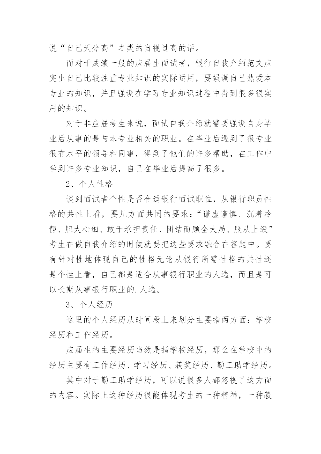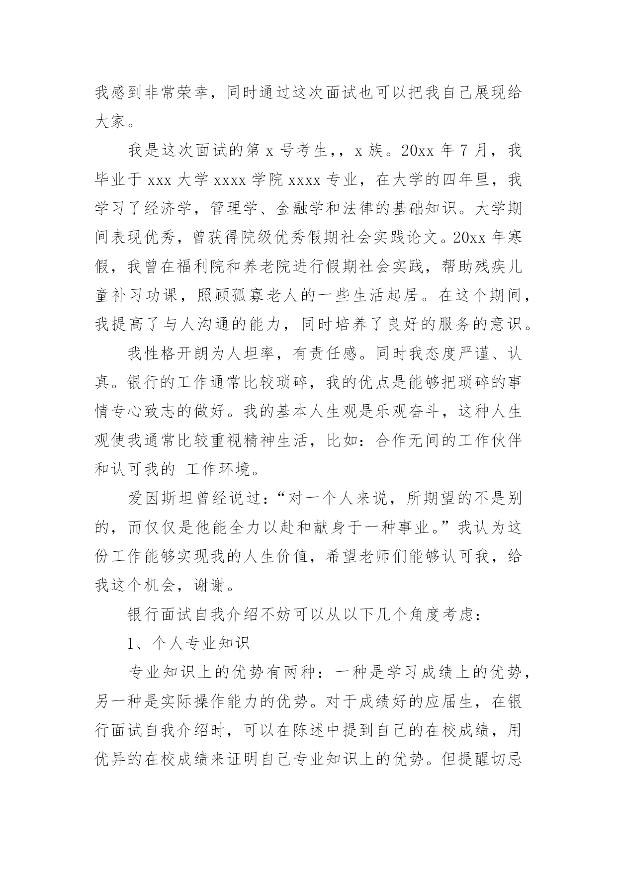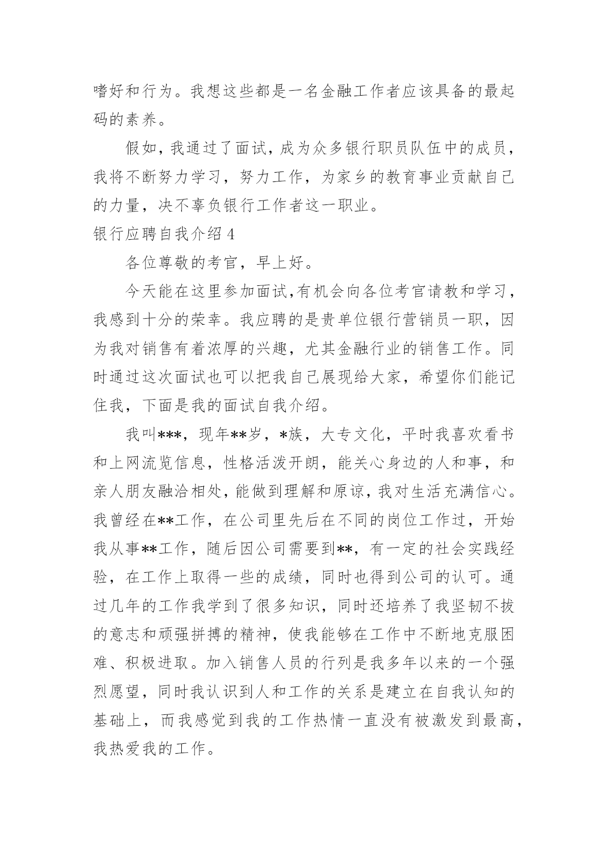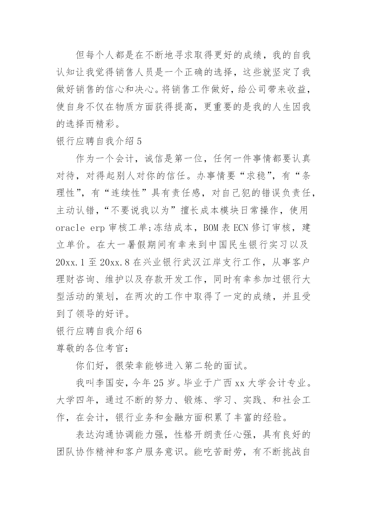 银行应聘自我介绍银行应聘自我介绍当我们在一个陌生场合中,常常需要我们进行自我介绍,用自我介绍往往可以向他人介绍自己。相信许多人会觉得自我介绍很难写吧,下面是小编为大家整理的银行应聘自我介绍,仅供参考,希望能够帮助到大家。银行应聘自我介绍1通过考试,今天,我以本岗位笔试第x的成绩进入了面试。对我来说,这次工作机会显得尤为珍贵。我叫xxx,今年27岁。xxxx年7月我从xx学院xx系毕业。由于xx原因,使我与“太阳底下最光辉的职业”失之交臂。幸好,当时xxx(原因),经人介绍,我在xxx单位有了xx的工作经历。回想起那段时光真是既甜蜜又美好,虽然工资很低,但听着别人对我工作的赞美,看着那一双双充满信任的眼睛,我心里充满报幸福与甜蜜。我原想,即使不能转正,只要单位需要,就是当一辈子临时工我也心甘情愿。今天,我想通过此次考试重新走上工作岗位的愿望是那样迫切!我家共有三姊妹,两个姐姐在外打工,为了照顾已上了年纪的父母,我一直留在他们身边。我曾开过铺子,先是经营工艺品,后又经营服装。但不论生意做得如何得心应手,当一名银行职员终是我心向往之并愿倾尽毕生心血去追求的事业。我曾多次参加考试,但都由于各种原因而未能实现梦想,但我暗下决心,只要有机会,我就一直考下去,直到理想实现为止。银行应聘自我介绍2尊敬的领导:您好!首先感谢您在百忙之中抽出宝贵的时间来阅读这封自荐信。我叫,怀着对贵银行的尊重与向往,我真挚地写了这封自荐信,向您展示一个完全真实的我。大学以来,我一直刻苦学习,勤奋钻研。经过老师的精心培养和个人努力,我系统地掌握了法律学科的专业知识,获得了全国大学生英语知识竞赛一等奖、国家助学金以(大一新生自我介绍)及学院励志奖学金。在专科毕业的同时也顺利地拿到了辽宁大学自考本科文凭。应聘银行的自我介绍应聘银行的自我介绍。理论联系实践是很重要的。在校期间我积极参加社团活动,寒暑假参加了xx团市委组织的扶贫家教活动并获得了家长们的好评,接受了xx日报社的采访与报道。大二时,凭借着自身对金融方面知识的爱好与学习,经过学校老师的推荐,我从上海浦东发展银行xx分行的兼职招聘中脱颖而出,进行了为期整整一年的兼职工作。兼职结束后我又顺利地通过了广东发展银行xx分行的招聘考试(点钞5分钟18把,计算器5分钟6道题),顺利地成为了渤海支行营业部的全柜员。8月——8月被xx团市委调往XX市纪律检查委员会监察局执法监察室(学校推荐优秀毕业生,xx团市委确定为支援北三市大学生志愿者)。希望贵银行能给我一个发展的平台,我会好好珍惜它,为实现自己的人生价值而奋斗,最重要的是为贵银行事业的发展增砖添瓦。以下是我个人能力与工作教育背景的综合简介:良好教育背景:将于20xx年7月获得xx大学经贸学院国际金融专业经济学学士学位。连续三年获学校优秀大学生综合奖学金,综合排名列专业前5%(共200人)。金融行业工作经验:在瑞典银行上海办事处兼职,中国银行国际结算部实习以及在中国出口商品交易会外事办公室任助理,从事客户接待,国际结算业务操作和会务操作等工作,对金融,贸易等行业有了较深了解。较强的沟通策划能力:在校期间担任班长,学生党支部书记,策划组织了系列应聘银行的自我介绍来自班会和晚会,组织XX市残疾人展能中心校园义卖活动和暑期大学生志愿者三下乡服务,较多地进行对外沟通联系,项目策划,人员管理和任务分配等工作,培养团队意识和社会责任感。我希望凭借自身所具有的工作实践经历和知识技能,以及自身的刻苦,进取精神,为贵公司的未来发展贡献力量。最后,祝贵银行事业欣欣向荣、业绩蒸蒸日上,也祝您身体健健康康、万事如意!银行应聘自我介绍3我叫***,今年27岁。****年7月我从**学院**系毕业。由于**原因,使我与“太阳底下最光辉的职业”失之交臂。幸好,当时***(原因),经人介绍,我在***单位有了**的工作经历。回想起那段时光真是既甜蜜又美好,虽然工资很低,但听着别人对我工作的赞美,看着那一双双充满信任的眼睛,我心里充满报幸福与甜蜜。我原想,即使不能转正,只要单位需要,就是当一辈子临时工我也心甘情愿。今天,我想通过此次考试重新走上工作岗位的愿望是那样迫切!我家共有三姊妹,两个姐姐在外打工,为了照顾已上了年纪的父母,我一直留在他们身边。我曾开过铺子,先是经营工艺品,后又经营服装。但不论生意做得如何得心应手,当一名银行职员终是我心向往之并愿倾尽毕生心血去追求的事业。我曾多次参加考试,但都由于各种原因而未能实现梦想,但我暗下决心,只要有机会,我就一直考下去,直到理想实现为止。如今的我,历经生活的考验,比起我的竞争对手在年龄上我已不再有优势,但是我比他们更多了一份对工作的责任心、耐心和对单位的诚心,更多了一份成熟和自信。银行职员这个职业是神圣而伟大的,他要求我不仅要有丰富的专业知识,还要有高尚的情