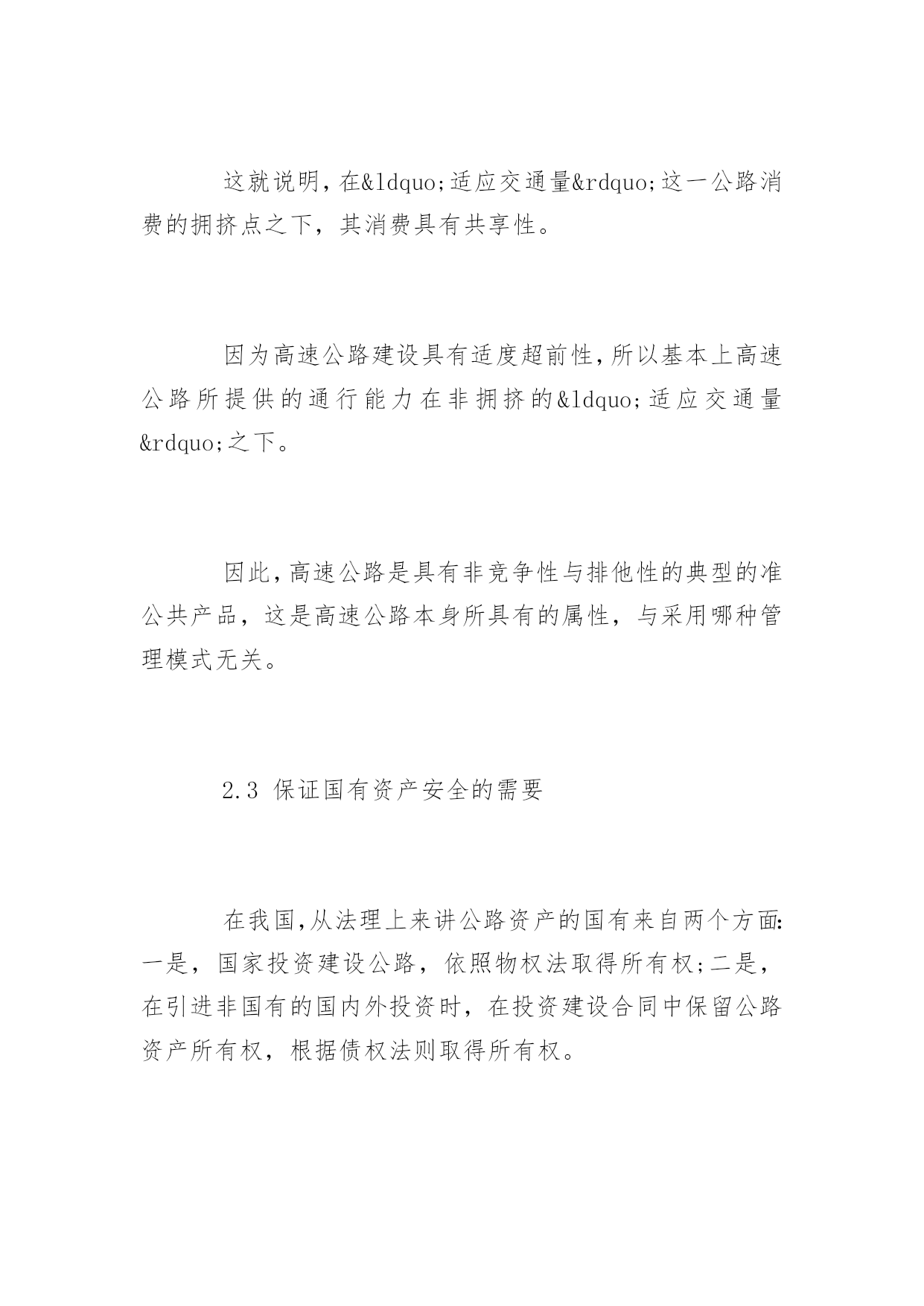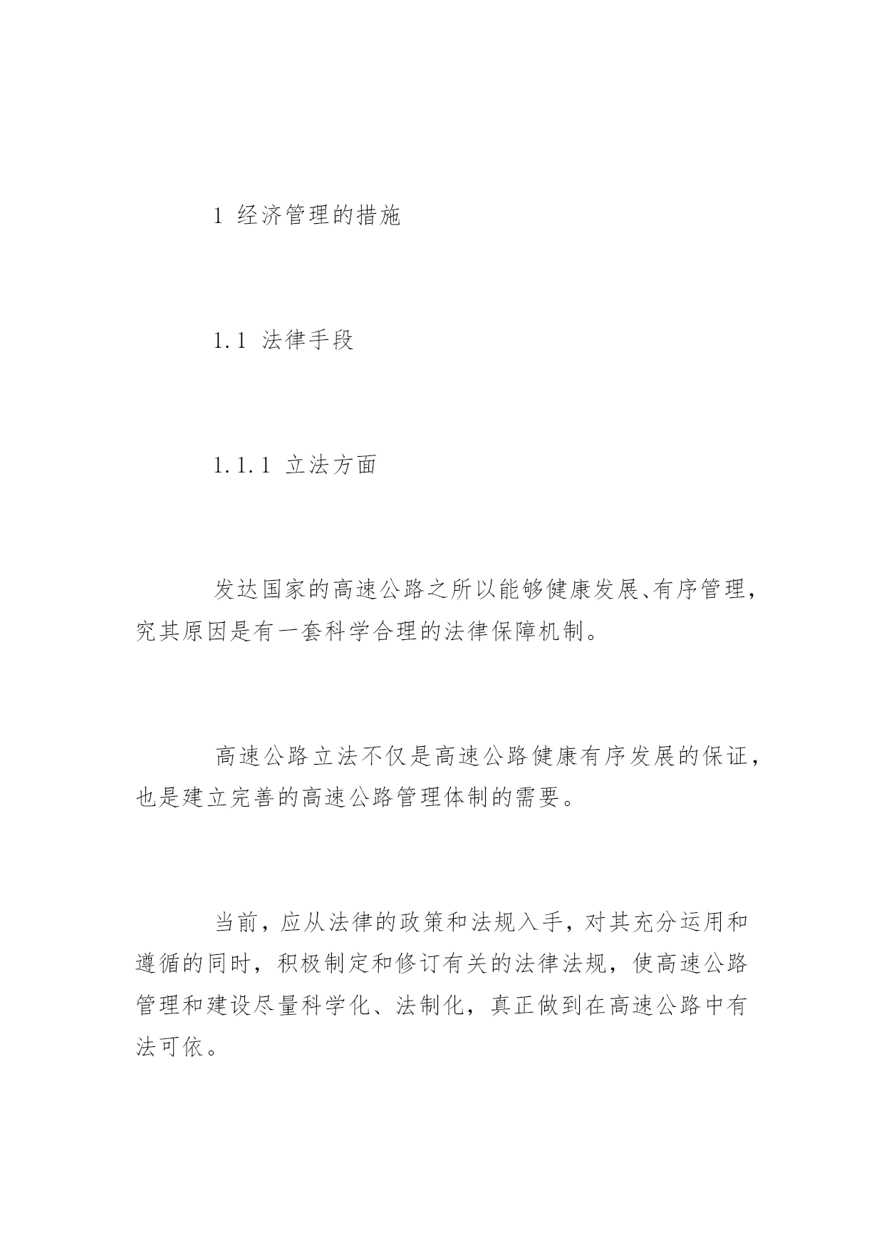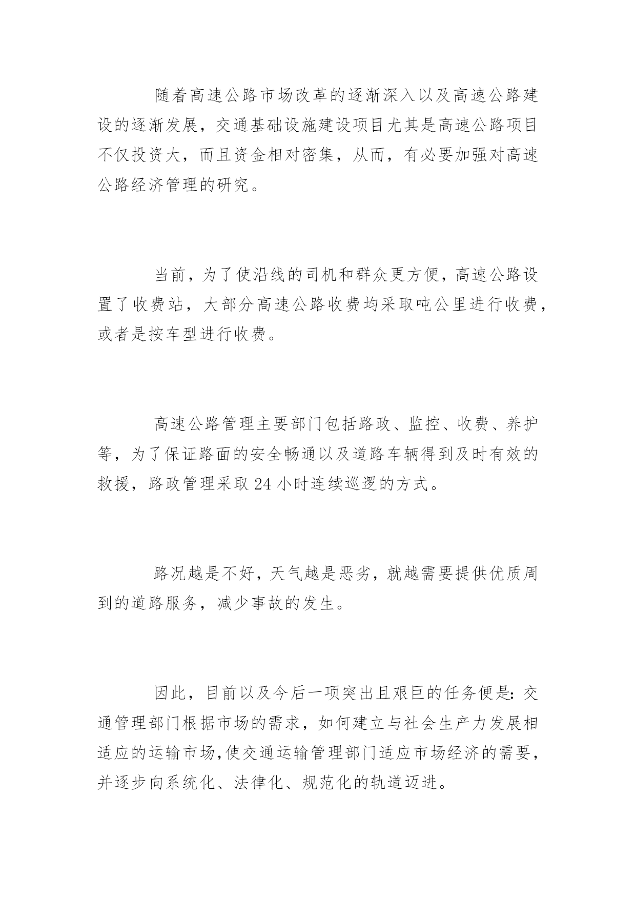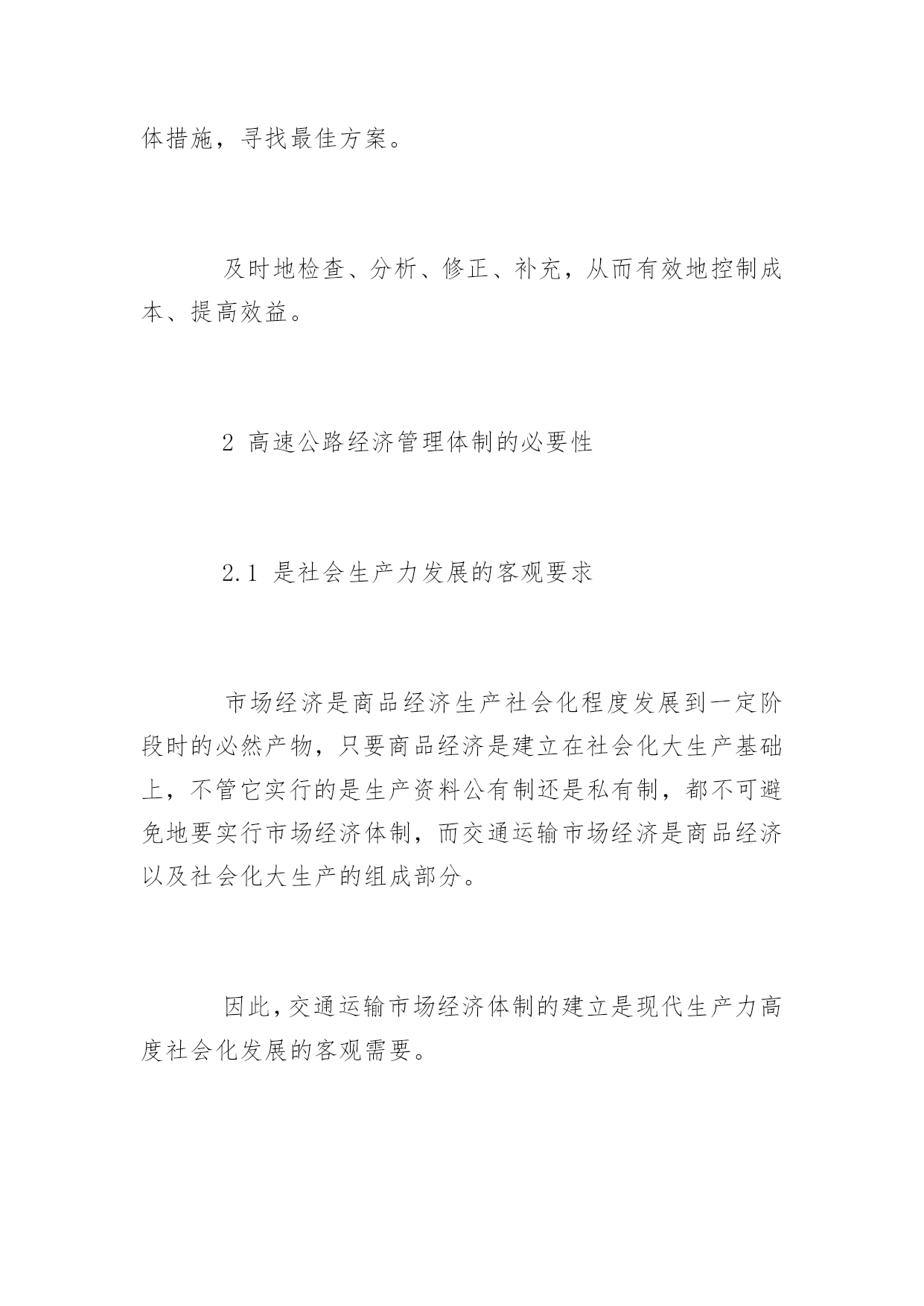 高速公路经济管理的探讨高速公路经济管理的探讨高速公路经济管理的探讨是小编为大家带来的论文范文,欢迎阅读。【摘要】近年来,我国交通运输迅速发展,政府投入大量财力物力,改善交通状况,并取得了显著的效果。高速公路建设作为交通运输建设的重要内容也受到了政府以及相关部门的高度重视。本文主要针对高速公路经济管理的措施以及高速公路经济管理体制的必要性进行论述。【关键词】高速公路;经济管理;措施随着高速公路市场改革的逐渐深入以及高速公路建设的逐渐发展,交通基础设施建设项目尤其是高速公路项目不仅投资大,而且资金相对密集,从而,有必要加强对高速公路经济管理的研究。当前,为了使沿线的司机和群众更方便,高速公路设置了收费站,大部分高速公路收费均采取吨公里进行收费,或者是按车型进行收费。高速公路管理主要部门包括路政、监控、收费、养护等,为了保证路面的安全畅通以及道路车辆得到及时有效的救援,路政管理采取24小时连续巡逻的方式。路况越是不好,天气越是恶劣,就越需要提供优质周到的道路服务,减少事故的发生。因此,目前以及今后一项突出且艰巨的任务便是:交通管理部门根据市场的需求,如何建立与社会生产力发展相适应的运输市场,使交通运输管理部门适应市场经济的需要,并逐步向系统化、法律化、规范化的轨道迈进。1经济管理的措施1.1法律手段1.1.1立法方面发达国家的高速公路之所以能够健康发展、有序管理,究其原因是有一套科学合理的法律保障机制。高速公路立法不仅是高速公路健康有序发展的保证,也是建立完善的高速公路管理体制的需要。当前,应从法律的政策和法规入手,对其充分运用和遵循的同时,积极制定和修订有关的法律法规,使高速公路管理和建设尽量科学化、法制化,真正做到在高速公路中有法可依。1.1.2执法方面高速公路经济管理中的执法问题是管理体制改革的一个重点。目前,高速公路执法效率低下、主体繁多,应进一步明确交通部门以及公安部门的职责分工,对高速公路管理模式进行统一,真正做到高效、统一、精简的高速公路管理体制。实际工作中,应进行综合执法、统一调度,整合管理资源,运用各种力量,培养随机应变的能力。同时,为了维护高速公路安全,提高路政执法效率,减少交通事故,还须有完善的管理信息系统以及先进的管理设施。1.2经济与行政手段依据高速公路自然垄断的条件以及现在所面临的需求特点,目前由少数企业垄断经营相对更有效果。一般情况,从经济角度看,在此时引入竞争并不合理。在这种条件下,需由政府出面,对市场进行干预,让企业独家垄断,赋予企业特定的垄断经营权。可是,这样可能会出现消费者利益受损、资源配置效率不高的现象。因此,由于高速公路的自然垄断,在社会福利与企业利益之间政府经常取舍两难。面对这样选择困境,较可行的方式是允许企业垄断经营某一条高速公路,但与此同时,应对其进行有效治理,治理的方式是以特许经营为特征的微观规制。1.3加强成本的管理及控制1.3.1公路施工项目成本费用的预测与计划在公路施工项目开工前,必须进行科学的分析,预测出完成公路工程项目所需要的总成本,把它作为目标考核与进行计划成本控制的依据。对每一个公路项目施工,都应精心预测,避免造成失误。项目部人员应在项目开工前,选好科学的施工方案,制定该项目的成本计划,选定合理的材料供应商。公路工程项目费用计划应包括工程成本计划以及项目管理费用计划。在施工中严格审批,有效地控制支出。1.3.2公路工程成本费用的控制与核算在项目施工的过程中,要依照成本计划进行严格控制和核算,主要包括对人工费用的控制,生产资料费用的控制以及现场管理费用的控制。例如,材料费用控制应该做到:合理确定材料的数量、价格;规范工地材料领用的相关工作;至于相对紧缺的材料,为了避免占用资金,间接地扩大成本,供应时应依照随用随进、略有库存的原则。1.3.3公路施工成本费用的分析与考核公路施工完成后,应对预算成本与实际成本进行比较,对成本计划完成环节中各个部门进行有效总结,找到成本升降的主客观因素,不断积累经验,制定下一步降低成本的具体措施,寻找最佳方案。及时地检查、分析、修正、补充,从而有效地控制成本、提高效益。2高速公路经济管理体制的必要性2.1是社会生产力发展的客观要求市场经济是商品经济生产社会化程度发展到一定阶段时的必然产物,只要商品经济是建立在社会化大生产基础上,不管它实行的是生产资料公有制还是私有制,都不可避免地要实行市场经济体制,而交通运输市场经济是商品经济以及社会化大生产的组成部分。因此,交通运输市场经济体制的建立是现代生产力高度社会化发展的客观需要。2.2保障公众出行利益的需要在高速公路管理中,由于高速公路自身具有公益性、网络性、外部性等属性,政府扮演着公众出行利益的捍卫者角