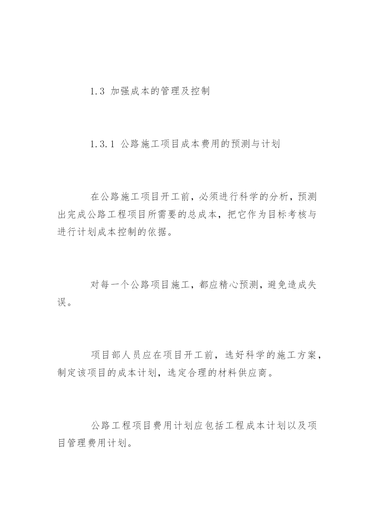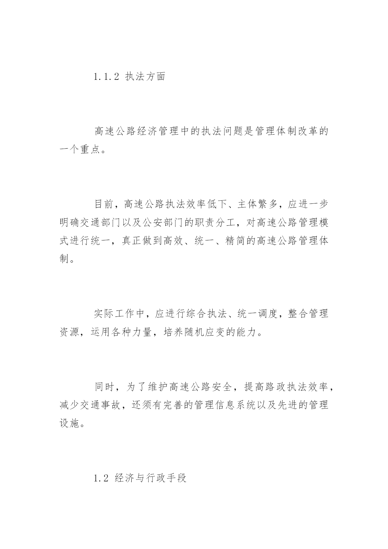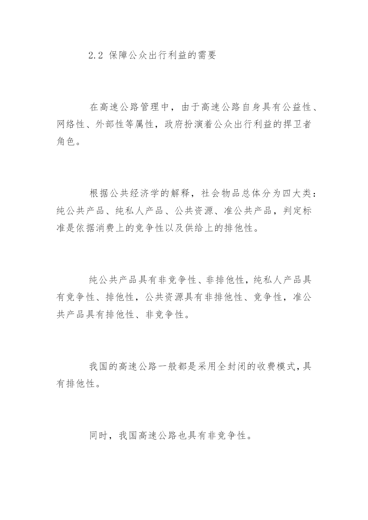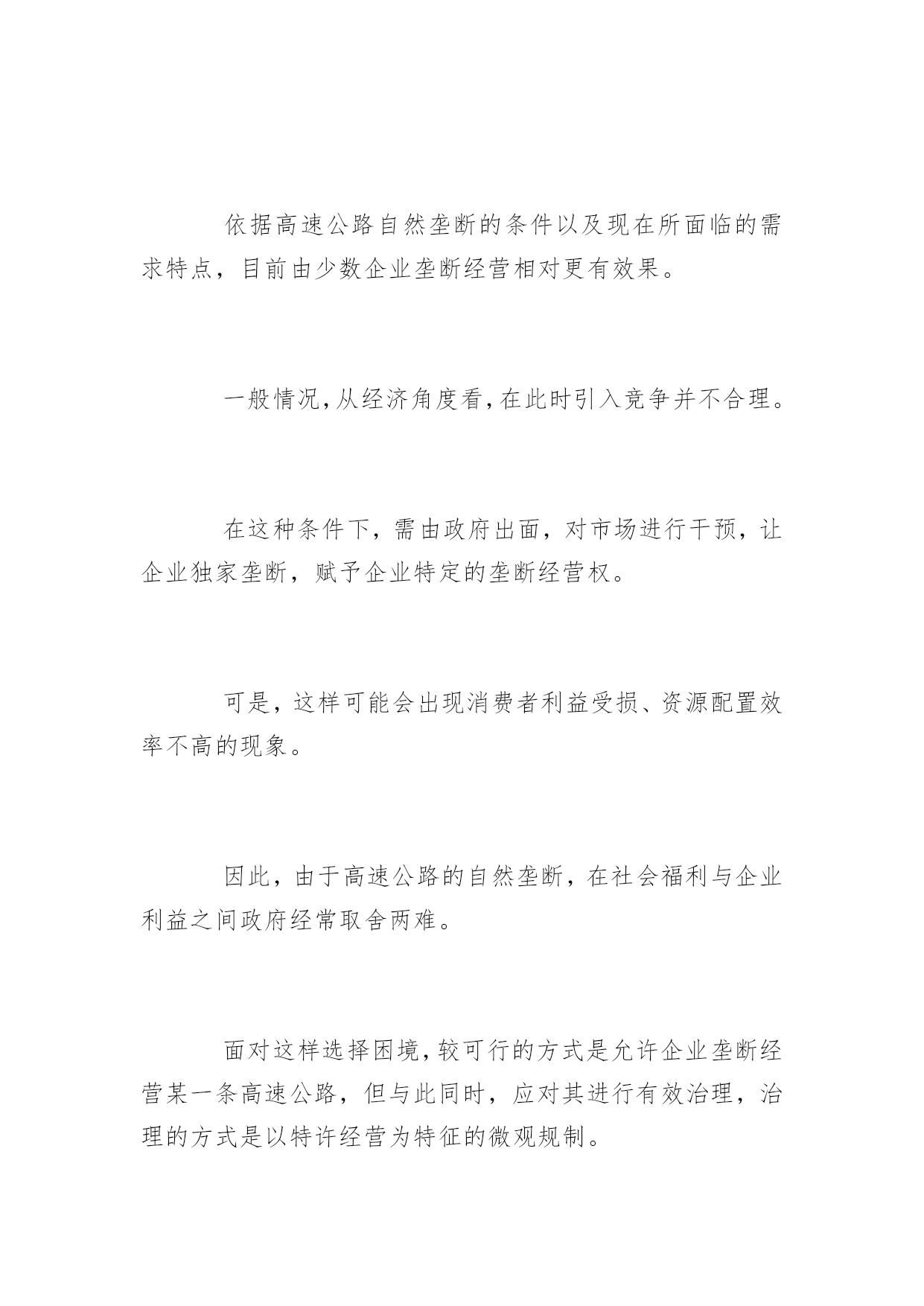 高速公路经济管理的探讨高速公路经济管理的探讨高速公路经济管理的探讨是小编为大家带来的论文范文,欢迎阅读。【摘要】近年来,我国交通运输迅速发展,政府投入大量财力物力,改善交通状况,并取得了显著的效果。高速公路建设作为交通运输建设的重要内容也受到了政府以及相关部门的高度重视。本文主要针对高速公路经济管理的措施以及高速公路经济管理体制的必要性进行论述。【关键词】高速公路;经济管理;措施随着高速公路市场改革的逐渐深入以及高速公路建设的逐渐发展,交通基础设施建设项目尤其是高速公路项目不仅投资大,而且资金相对密集,从而,有必要加强对高速公路经济管理的研究。当前,为了使沿线的司机和群众更方便,高速公路设置了收费站,大部分高速公路收费均采取吨公里进行收费,或者是按车型进行收费。高速公路管理主要部门包括路政、监控、收费、养护等,为了保证路面的安全畅通以及道路车辆得到及时有效的救援,路政管理采取24小时连续巡逻的方式。路况越是不好,天气越是恶劣,就越需要提供优质周到的道路服务,减少事故的发生。因此,目前以及今后一项突出且艰巨的任务便是:交通管理部门根据市场的需求,如何建立与社会生产力发展相适应的运输市场,使交通运输管理部门适应市场经济的需要,并逐步向系统化、法律化、规范化的轨道迈进。1经济管理的措施1.1法律手段1.1.1立法方面发达国家的高速公路之所以能够健康发展、有序管理,究其原因是有一套科学合理的法律保障机制。高速公路立法不仅是高速公路健康有序发展的保证,也是建立完善的高速公路管理体制的需要。当前,应从法律的政策和法规入手,对其充分运用和遵循的同时,积极制定和修订有关的法律法规,使高速公路管理和建设尽量科学化、法制化,真正做到在高速公路中有法可依。1.1.2执法方面高速公路经济管理中的执法问题是管理体制改革的一个重点。目前,高速公路执法效率低下、主体繁多,应进一步明确交通部门以及公安部门的职责分工,对高速公路管理模式进行统一,真正做到高效、统一、精简的高速公路管理体制。实际工作中,应进行综合执法、统一调度,整合管理资源,运用各种力量,培养随机应变的能力。同时,为了维护高速公路安全,提高路政执法效率,减少交通事故,还须有完善的管理信息系统以及先进的管理设施。1.2经济与行政手段依据高速公路自然垄断的条件以及现在所面临的需求特点,目前由少数企业垄断经营相对更有效果。一般情况,从经济角度看,在此时引入竞争并不合理。在这种条件下,需由政府出面,对市场进行干预,让企业独家垄断,赋予企业特定的垄断经营权。可是,这样可能会出现消费者利益受损、资源配置效率不高的现象。因此,由于高速公路的自然垄断,在社会福利与企业利益之间政府经常取舍两难。面对这样选择困境,较可行的方式是允许企业垄断经营某一条高速公路,但与此同时,应对其进行有效治理,治理的方式是以特许经营为特征的微观规制。1.3加强成本的管理及控制1.3.1公路施工项目成本费用的预测与计划在公路施工项目开工前,必须进行科学的分析,预测出完成公路工程项目所需要的总成本,把它作为目标考核与进行计划成本控制的依据。对每一个公路项目施工,都应精心预测,避免造成失误。项目部人员应在项目开工前,选好科学的施工方案,制定该项目的成本计划,选定合理的材料供应商。公路工程项目费用计划应包括工程成本计划以及项目管理费用计划。在施工中严格审批,有效地控制支出。1.3.2公路工程成本费用的控制与核算在项目施工的过程中,要依照成本计划进行严格控制和核算,主要包括对人工费用的控制,生产资料费用的控制以及现场管理费用的控制。例如,材料费用控制应该做到:合理确定材料的数量、价格;规范工地材料领用的相关工作;至于相对紧缺的材料,为了避免占用资金,间接地扩大成本,供应时应依照随用随进、略有库存的原则。1.3.3公路施工成本费用的分析与考核公路施工完成后,应对预算成本与实际成本进行比较,对成本计划完成环节中各个部门进行有效总结,找到成本升降的主客观因素,不断积累经验,制定下一步降低成本的具体措施,寻找最佳方案。及时地检查、分析、修正、补充,从而有效地控制成本、提高效益。2高速公路经济管理体制的必要性2.1是社会生产力发展的客观要求市场经济是商品经济生产社会化程度发展到一定阶段时的必然产物,只要商品经济是建立在社会化大生产基础上,不管它实行的是生产资料公有制还是私有制,都不可避免地要实行市场经济体制,而交通运输市场经济是商品经济以及社会化大生产的组成部分。因此,交通运输市场经济体制的建立是现代生产力高度社会化发展的客观需要。2.2保障公众出行利益的需要在高速公路管理中,由于高速公路自身具有公益性、网络性、外部性等属性,政府扮演着公众出行利益的捍卫者角