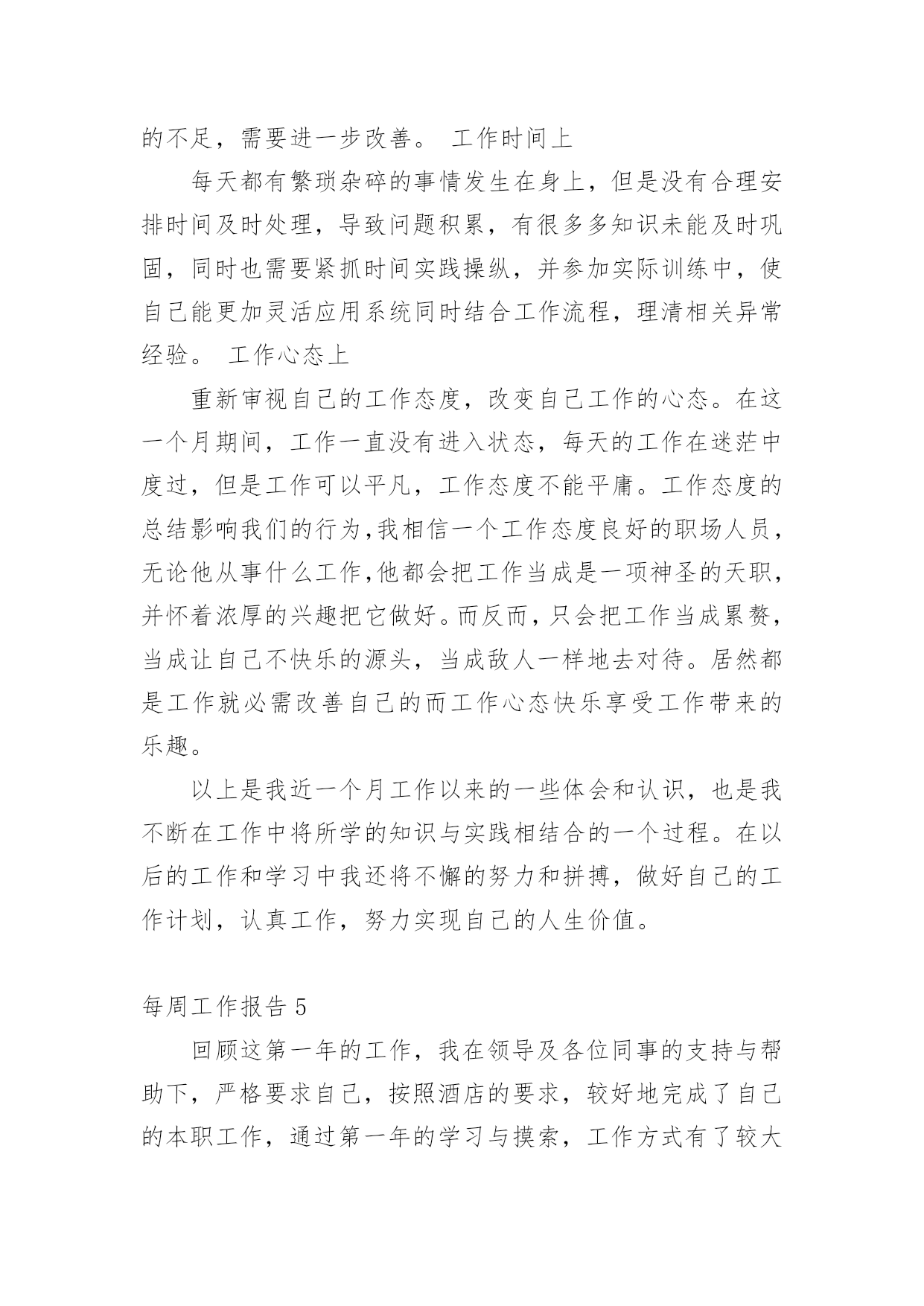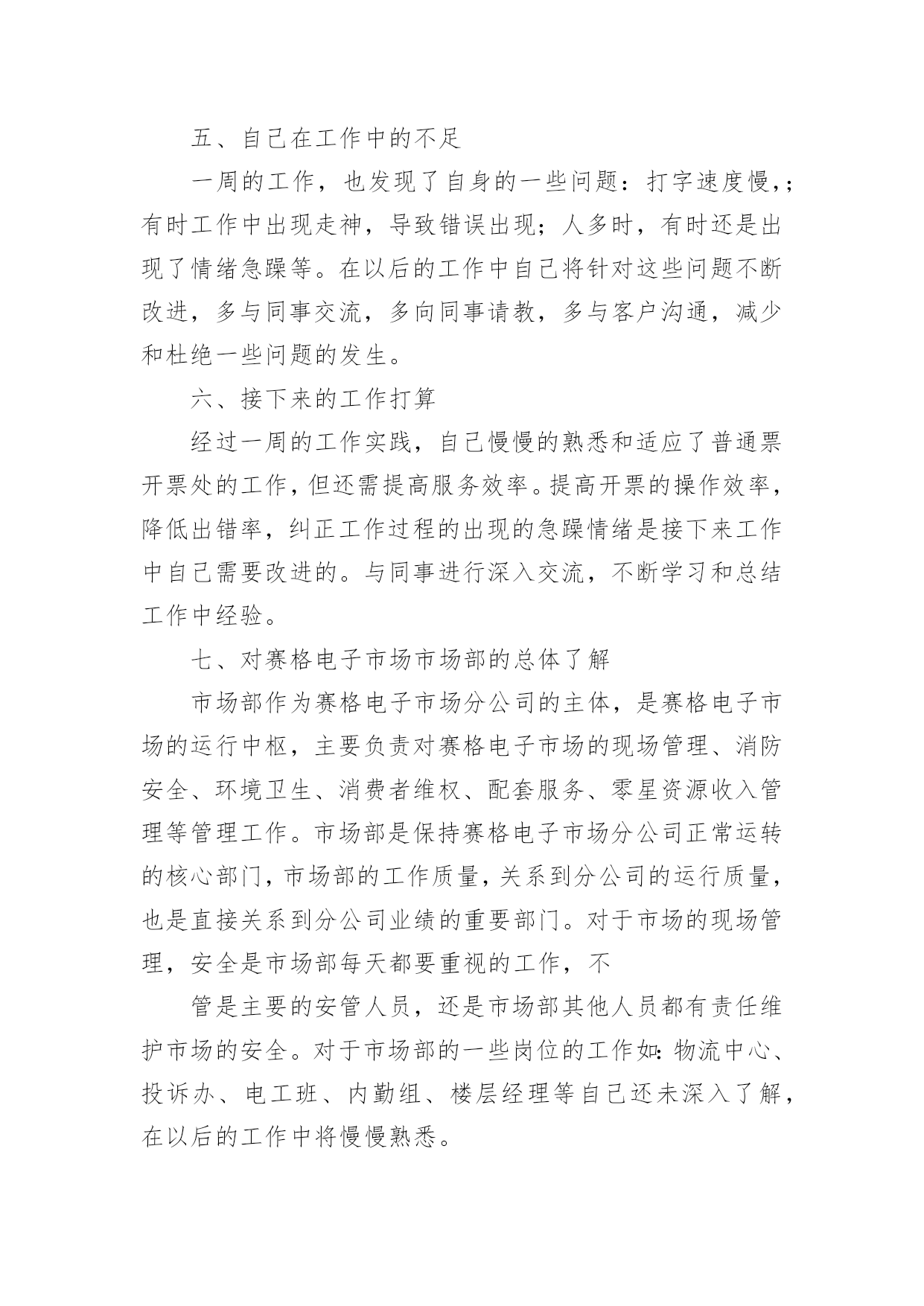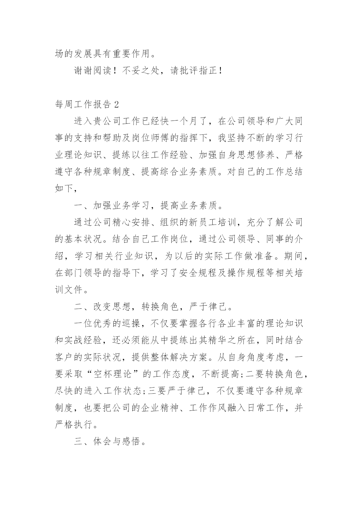 每周工作报告我们眼下的社会,大家逐渐认识到报告的重要性,通常情况下,报告的内容含量大、篇幅较长。在写之前,可以先参考范文,以下是小编精心整理的每周工作报告,供大家参考借鉴,希望可以帮助到有需要的朋友。每周工作报告1一、工作的总体感受一周的工作总体感觉是很充实,每天都是那么忙碌,虽然总是重复做着同样的工作,但还是从这样不断重复的工作中明白了耐心、细心、克制情绪的重要。这是像我这种刚毕业的年轻人最缺少的东西,也是工作中最宝贵的东西。每天只要开始了工作,就会有络绎不绝的应聘者来参加面试,形形色色的应聘者对面试做出的反应和表现让我从多个角度观察每个人的综合素质,这也是最能考验自己专业素养的时候,总是提醒自己一个一个来,一步一步来,少出错误,尽求专业化,旁边同事的工作也给了自己支持,我们是在一起完成工作,不是自己一个人,更重要的是,我的主管从一点一滴的在给我帮助,耐心的指导我完成一项又一项的繁琐的工作,在这里,我十分的感谢我的主管,孟向前。刚开始,由于不熟练和对一些商品的不了解,自己工作的速度很慢,有时还手忙脚乱。经过一周的工作,对电脑的一些操作和对产品一些信息的了解逐渐加深,工作的效率也有了一定的提高。为了能迅速熟练掌握相关技巧就得多练习,多遇到一些问题,就会多改进,多进步。一周的工作没有想象中的枯燥乏味,每天都会遇到新的问题,要向主管和同事请教问题,当然也会给自己带来思考。二、工作环境的感受对于公司的工作环境,自己还是满意的,拥有宽敞明亮的办公场所,有一排排整齐的办公用具,宽松的工作氛围让自己感到舒畅,这也是自己最想要得到的,能够发挥出自己的能力。刚来的第一天,热心的主管帮我引见了公司的一些领导,他们让我有一种亲切感,都给了我一些鼓励,希望以后能从他们的身上得到一些指点,对工作的,对人生的。有时工作紧张,我们总能找到轻松的话题让气氛变得轻松起来,让我们的距离越来越近。三、工作岗位的认识目前,自己所在的工作岗位是综合管理部人力资源专员,岗位最需要的是耐心和细心,能够处理好自己的情绪,能够在重复的工作中调整自己。对于系统的操作要熟练,对一些产品信息要有一定的了解,不断提高服务效率和服务质量。四、对工作的观察通过一周的招聘工作,根据自己的观察,就应该把自己的本职工作做好,尽快熟练办公工具操作技能,熟悉解决一些执行问题的流程,提高工作效率,在工作中端正自己的工作态度,保持热情。利用服务在第一线的机会,培养自己细心、耐心的心理素质,促进与不同商户之间沟通能力的提高。五、自己在工作中的不足一周的工作,也发现了自身的一些问题:打字速度慢,;有时工作中出现走神,导致错误出现;人多时,有时还是出现了情绪急躁等。在以后的工作中自己将针对这些问题不断改进,多与同事交流,多向同事请教,多与客户沟通,减少和杜绝一些问题的发生。六、接下来的工作打算经过一周的工作实践,自己慢慢的熟悉和适应了普通票开票处的工作,但还需提高服务效率。提高开票的操作效率,降低出错率,纠正工作过程的出现的急躁情绪是接下来工作中自己需要改进的。与同事进行深入交流,不断学习和总结工作中经验。七、对赛格电子市场市场部的总体了解市场部作为赛格电子市场分公司的主体,是赛格电子市场的运行中枢,主要负责对赛格电子市场的现场管理、消防安全、环境卫生、消费者维权、配套服务、零星资源收入管理等管理工作。市场部是保持赛格电子市场分公司正常运转的核心部门,市场部的工作质量,关系到分公司的运行质量,也是直接关系到分公司业绩的重要部门。对于市场的现场管理,安全是市场部每天都要重视的工作,不管是主要的安管人员,还是市场部其他人员都有责任维护市场的安全。对于市场部的一些岗位的工作如:物流中心、投诉办、电工班、内勤组、楼层经理等自己还未深入了解,在以后的工作中将慢慢熟悉。八、赛格电子市场分公司总体观察。赛格电子市场分公司作为深圳赛格股份有限公司的主要控股投资企业,赛格电子市场的经营状况直接影响到赛格股份的发展。赛格电子市场作为深圳早期发展起来的电子市场,对于深圳,对于中国,乃至整个亚洲都有一定的影响力。赛格电子市场分公司作为一个电子市场的管理者,主要的顾客就是商户,商户的经营状况直接体现了赛格的服务质量。由于中国IT市场的扩大,许多类似赛格的电子市场也加入到竞争的行列中,使得赛格的市场份额相对缩小。更甚的是,最近几年中国电子商务市场的发展,使得实体电子市场面临巨大的挑战。太平洋电脑网、IT世界网、中关村在线、天极网等一大批网络电子服务平台相继出现,不断削弱了像赛格电子市场这样的实体市场。现在赛格电子市场的模式就像现在的一些购物商场,里面有很多商户,卖着不同价格的商品,不同档次品牌的商品都有。随着市场的发展,一些商场转变了自身的发展定位,在深圳地区,万象城、益田广场、还有最近才开业的京基,都向高档购物场所靠近,他们要