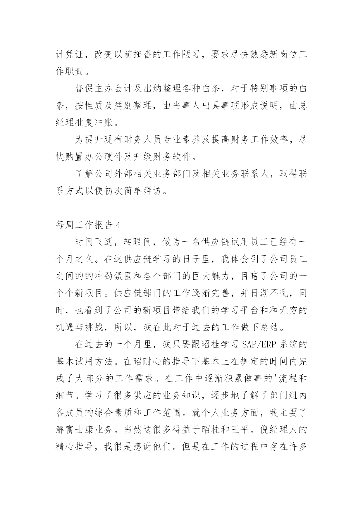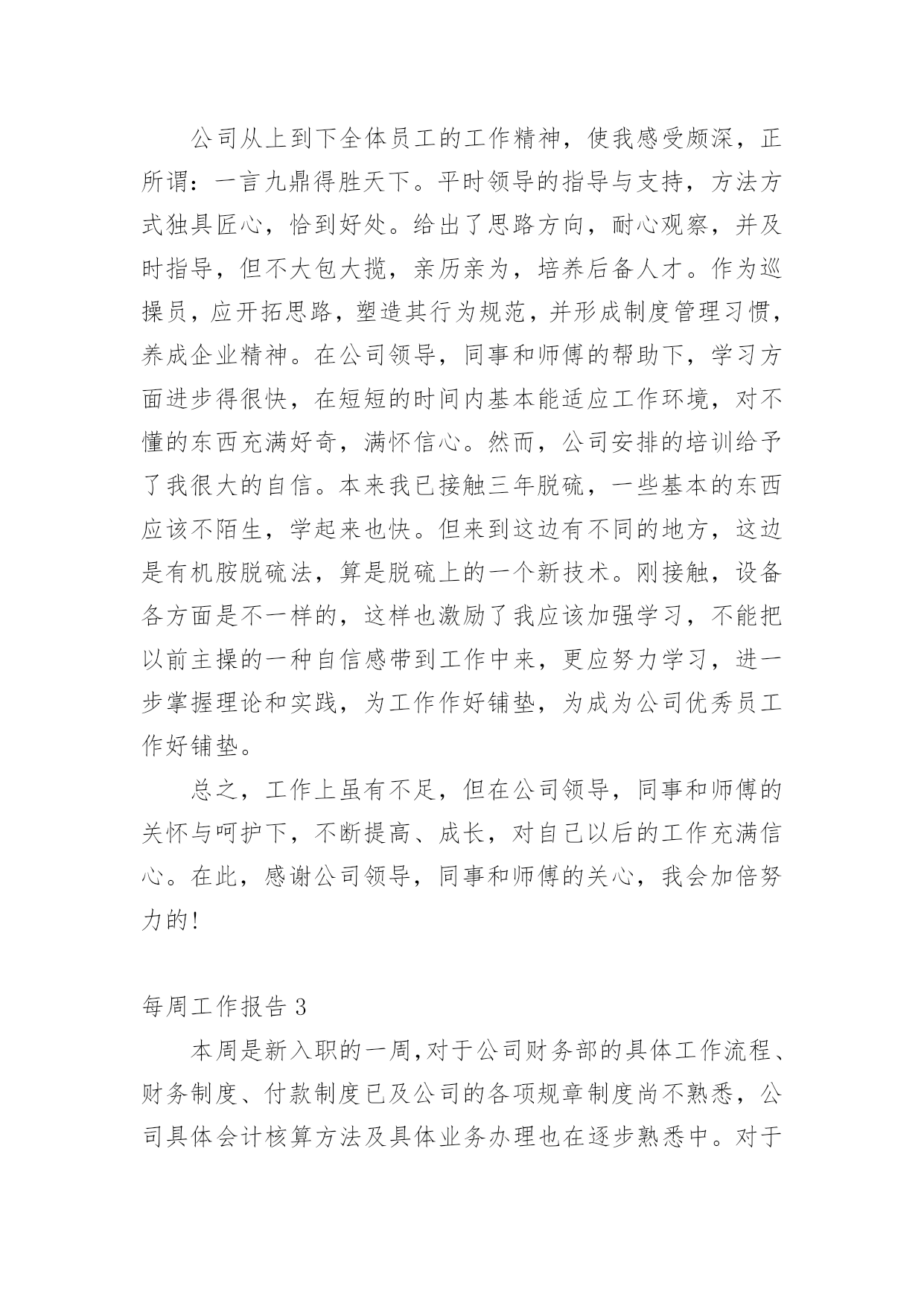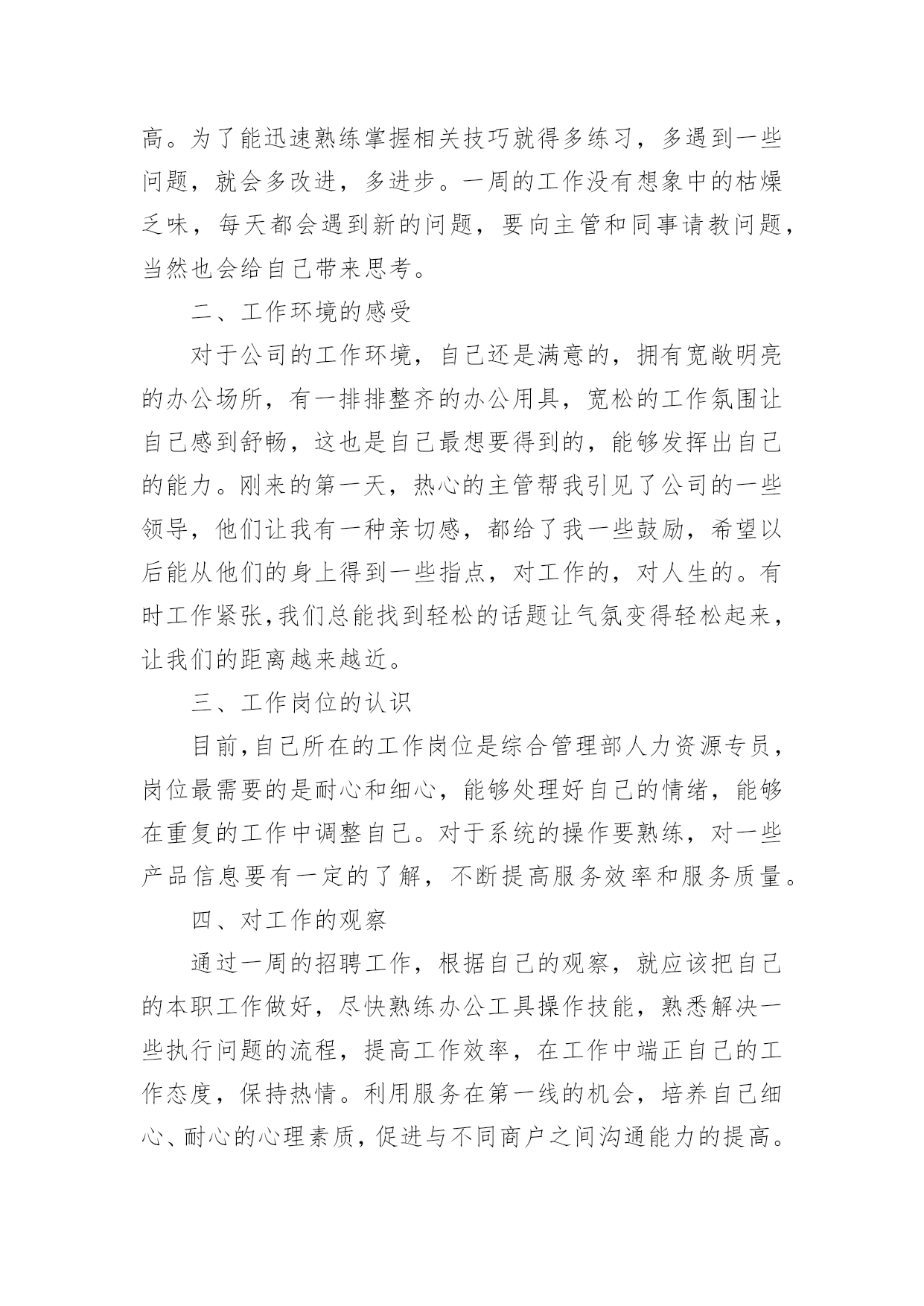 每周工作报告我们眼下的社会,大家逐渐认识到报告的重要性,通常情况下,报告的内容含量大、篇幅较长。在写之前,可以先参考范文,以下是小编精心整理的每周工作报告,供大家参考借鉴,希望可以帮助到有需要的朋友。每周工作报告1一、工作的总体感受一周的工作总体感觉是很充实,每天都是那么忙碌,虽然总是重复做着同样的工作,但还是从这样不断重复的工作中明白了耐心、细心、克制情绪的重要。这是像我这种刚毕业的年轻人最缺少的东西,也是工作中最宝贵的东西。每天只要开始了工作,就会有络绎不绝的应聘者来参加面试,形形色色的应聘者对面试做出的反应和表现让我从多个角度观察每个人的综合素质,这也是最能考验自己专业素养的时候,总是提醒自己一个一个来,一步一步来,少出错误,尽求专业化,旁边同事的工作也给了自己支持,我们是在一起完成工作,不是自己一个人,更重要的是,我的主管从一点一滴的在给我帮助,耐心的指导我完成一项又一项的繁琐的工作,在这里,我十分的感谢我的主管,孟向前。刚开始,由于不熟练和对一些商品的不了解,自己工作的速度很慢,有时还手忙脚乱。经过一周的工作,对电脑的一些操作和对产品一些信息的了解逐渐加深,工作的效率也有了一定的提高。为了能迅速熟练掌握相关技巧就得多练习,多遇到一些问题,就会多改进,多进步。一周的工作没有想象中的枯燥乏味,每天都会遇到新的问题,要向主管和同事请教问题,当然也会给自己带来思考。二、工作环境的感受对于公司的工作环境,自己还是满意的,拥有宽敞明亮的办公场所,有一排排整齐的办公用具,宽松的工作氛围让自己感到舒畅,这也是自己最想要得到的,能够发挥出自己的能力。刚来的第一天,热心的主管帮我引见了公司的一些领导,他们让我有一种亲切感,都给了我一些鼓励,希望以后能从他们的身上得到一些指点,对工作的,对人生的。有时工作紧张,我们总能找到轻松的话题让气氛变得轻松起来,让我们的距离越来越近。三、工作岗位的认识目前,自己所在的工作岗位是综合管理部人力资源专员,岗位最需要的是耐心和细心,能够处理好自己的情绪,能够在重复的工作中调整自己。对于系统的操作要熟练,对一些产品信息要有一定的了解,不断提高服务效率和服务质量。四、对工作的观察通过一周的招聘工作,根据自己的观察,就应该把自己的本职工作做好,尽快熟练办公工具操作技能,熟悉解决一些执行问题的流程,提高工作效率,在工作中端正自己的工作态度,保持热情。利用服务在第一线的机会,培养自己细心、耐心的心理素质,促进与不同商户之间沟通能力的提高。五、自己在工作中的不足一周的工作,也发现了自身的一些问题:打字速度慢,;有时工作中出现走神,导致错误出现;人多时,有时还是出现了情绪急躁等。在以后的工作中自己将针对这些问题不断改进,多与同事交流,多向同事请教,多与客户沟通,减少和杜绝一些问题的发生。六、接下来的工作打算经过一周的工作实践,自己慢慢的熟悉和适应了普通票开票处的工作,但还需提高服务效率。提高开票的操作效率,降低出错率,纠正工作过程的出现的急躁情绪是接下来工作中自己需要改进的。与同事进行深入交流,不断学习和总结工作中经验。七、对赛格电子市场市场部的总体了解市场部作为赛格电子市场分公司的主体,是赛格电子市场的运行中枢,主要负责对赛格电子市场的现场管理、消防安全、环境卫生、消费者维权、配套服务、零星资源收入管理等管理工作。市场部是保持赛格电子市场分公司正常运转的核心部门,市场部的工作质量,关系到分公司的运行质量,也是直接关系到分公司业绩的重要部门。对于市场的现场管理,安全是市场部每天都要重视的工作,不管是主要的安管人员,还是市场部其他人员都有责任维护市场的安全。对于市场部的一些岗位的工作如:物流中心、投诉办、电工班、内勤组、楼层经理等自己还未深入了解,在以后的工作中将慢慢熟悉。八、赛格电子市场分公司总体观察。赛格电子市场分公司作为深圳赛格股份有限公司的主要控股投资企业,赛格电子市场的经营状况直接影响到赛格股份的发展。赛格电子市场作为深圳早期发展起来的电子市场,对于深圳,对于中国,乃至整个亚洲都有一定的影响力。赛格电子市场分公司作为一个电子市场的管理者,主要的顾客就是商户,商户的经营状况直接体现了赛格的服务质量。由于中国IT市场的扩大,许多类似赛格的电子市场也加入到竞争的行列中,使得赛格的市场份额相对缩小。更甚的是,最近几年中国电子商务市场的发展,使得实体电子市场面临巨大的挑战。太平洋电脑网、IT世界网、中关村在线、天极网等一大批网络电子服务平台相继出现,不断削弱了像赛格电子市场这样的实体市场。现在赛格电子市场的模式就像现在的一些购物商场,里面有很多商户,卖着不同价格的商品,不同档次品牌的商品都有。随着市场的发展,一些商场转变了自身的发展定位,在深圳地区,万象城、益田广场、还有最近才开业的京基,都向高档购物场所靠近,他们要