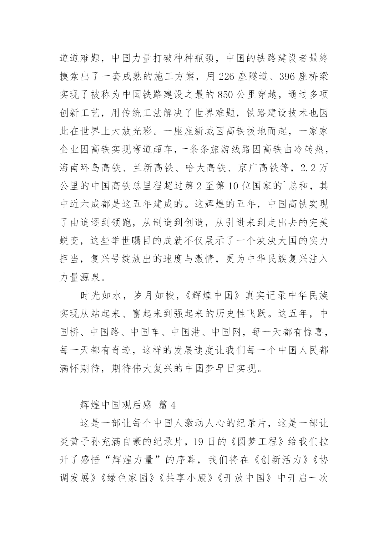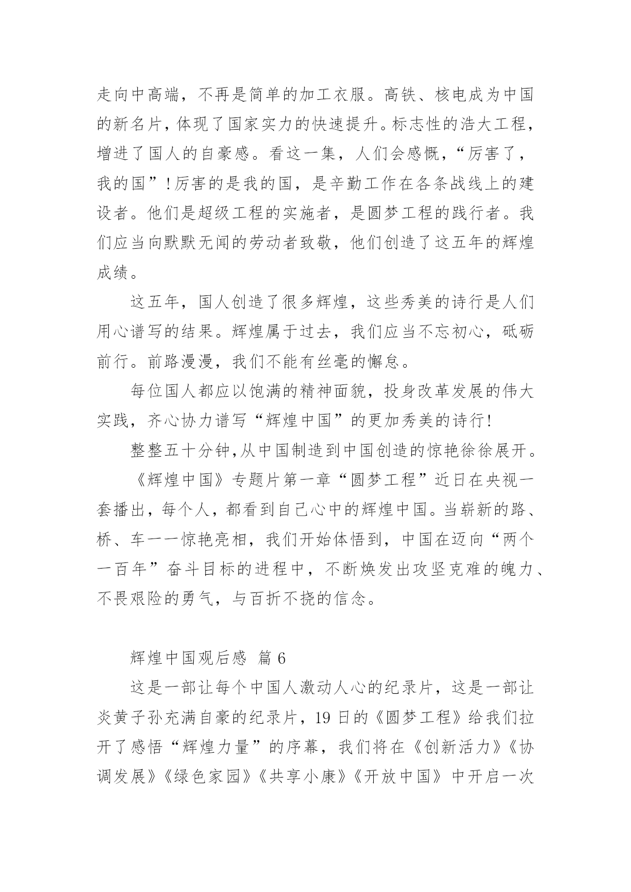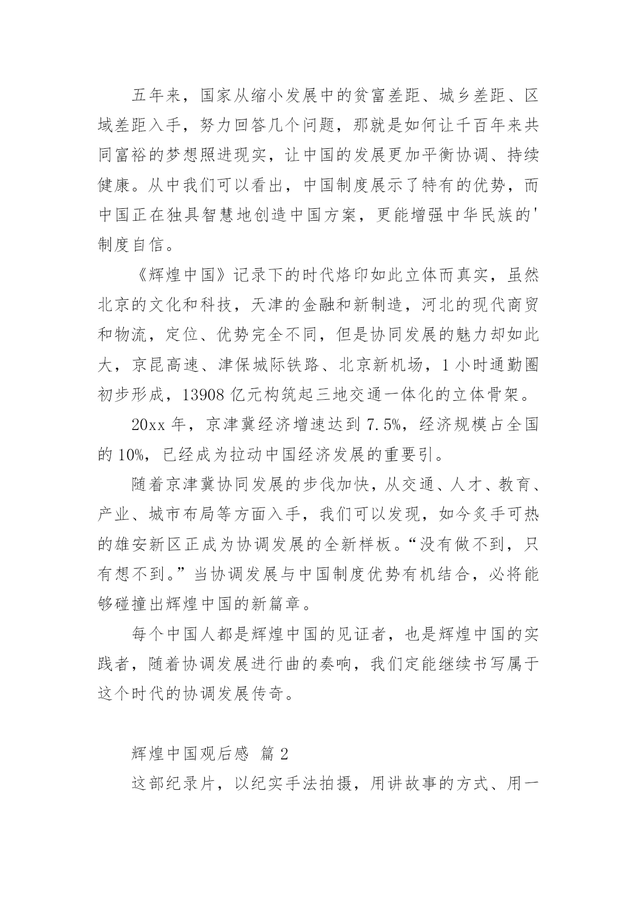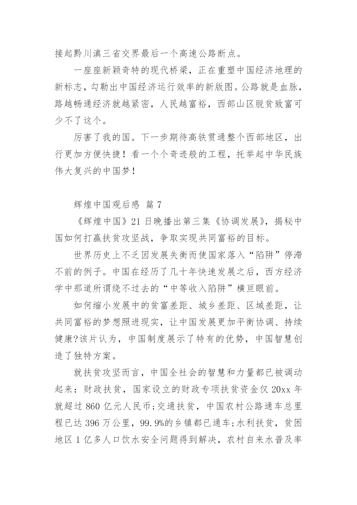 辉煌中国观后感在观赏了后,心中感慨万千,不禁为作品所深深折服,这次观看让你有什么体会呢?观后感的表达方式灵活多样,基本属于议论范畴,但写法不同于一般议论文,因为它必须是在观看后的基础上发感想。是不是无从下笔、没有头绪?以下是小编精心整理的辉煌中国观后感,欢迎阅读,希望大家能够喜欢。辉煌中国观后感篇19月21日晚,电视台播出六集电视纪录片《辉煌中国》第三集《协调发展》。在中国这片广袤的土地上,我们可以从摄影师的记录中,看到天梯上孩子们的笑容,扶贫干部的汗与泪,姑苏小镇城乡统筹的奇迹,“闽宁模式”东西部牵手的成功跨越,一个个特色小镇、中心城市、城市群的兴起。而长江经济带,京津冀一体化,以及萦绕着千年大计、国家大事的雄安新区,《辉煌中国》正给我们展现了国家协调发展的宏大叙事。这是辉煌中国五年来的发展变化,从一个个小人物的奋斗历程中,我们可以看到,国家正在为东南西北中的协调发展努力,正在向一体化、一元化发展迈进。中国经历了几十年快速发展之后,西方经济学中那道所谓绕不过去的“中等收入陷阱”横亘在眼前。如何避免国家落入“陷阱”而停滞不前,中国正在用实际行动应对这些发展中遇到的难题。五年来,国家从缩小发展中的贫富差距、城乡差距、区域差距入手,努力回答几个问题,那就是如何让千百年来共同富裕的梦想照进现实,让中国的发展更加平衡协调、持续健康。从中我们可以看出,中国制度展示了特有的优势,而中国正在独具智慧地创造中国方案,更能增强中华民族的'制度自信。《辉煌中国》记录下的时代烙印如此立体而真实,虽然北京的文化和科技,天津的金融和新制造,河北的现代商贸和物流,定位、优势完全不同,但是协同发展的魅力却如此大,京昆高速、津保城际铁路、北京新机场,1小时通勤圈初步形成,13908亿元构筑起三地交通一体化的立体骨架。20xx年,京津冀经济增速达到7.5%,经济规模占全国的10%,已经成为拉动中国经济发展的重要引。随着京津冀协同发展的步伐加快,从交通、人才、教育、产业、城市布局等方面入手,我们可以发现,如今炙手可热的雄安新区正成为协调发展的全新样板。“没有做不到,只有想不到。”当协调发展与中国制度优势有机结合,必将能够碰撞出辉煌中国的新篇章。每个中国人都是辉煌中国的见证者,也是辉煌中国的实践者,随着协调发展进行曲的奏响,我们定能继续书写属于这个时代的协调发展传奇。辉煌中国观后感篇2这部纪录片,以纪实手法拍摄,用讲故事的方式、用一系列数据来展示成就。这是和前面播出的几部片子的最大区别。我们从上千个成就案例中,精选了65个故事、250个成就点位、采访了108个人物,还呈现了200组国家成就数据,使这部片子非常接地气、非常好看电视纪录片。在审片过程中,各方也都给予很高的评价,普遍认为让人耳目一新,引人入胜。创新是一个民族进步的灵魂,是国家兴旺发达的不竭动力。科技创新是现代化的发动机,是一个国家进步和发展最重要的因素之一。是的,如果没有“创新”和“科技”,那么中国也不会如此强大,我们也不会如此幸福。,苏州工业园区以“一天创造1个亿的GDP,一天上缴1260万元人的财政收入,一天引进4000万美元”的'实力,赢得了“国内开发速度最快、竞争力最强的开发区之一”的评价。起,实施“产业升级”“科技跨越”“服务业倍增”三大行动计划,是园区21世纪的大手笔。又提出“生态优化行动计划”。四大行动计划成为领跑园区前行的“四辆马车”。,“十四岁”的园区实现GDP1001.52亿元,地方一般预算收入95.08亿元,分别比开发之初增长了近100倍和300余倍,人均GDP接近德国平均水平。从以上几个例子也可以看出“创新”和“科技”对中国的重要性和严重性。所以我们应该努力学习,长大把自己的“创新”和“科技”献给祖国,使中国更加繁荣昌盛,使人民更加幸福和谐。一组组数据,一福福图片,见证了中华民族的伟大复兴,是一个国家和民族在新时期激情拼搏的印记,是无数普通百姓品味喜悦拥抱幸福的刻,是中国实现跨越式发展的生动证明。我们要努力,努力学习,努力工作,把自己力所能及的力量奉献给祖国,使祖国更加强大。辉煌中国观后感篇3中国路、中国桥、中国港口、中国网昨晚,电视纪录片《辉煌中国》首集《圆梦工程》在央视播出,通过港珠澳大桥、胡麻岭隧道、郑万铁路、复兴号、上海洋山港自动化码头、中国移动互联网等一个个超级工程,讲述了五年来中国基础设施建设的一张张大网。看着电视纪录片中一个个令世界瞩目的圆梦工程铺展宏图,中国人民无不为之骄傲。自豪。首集《圆梦工程》既展示了中国装备制造开拓创新的精神,又体现了我国日益完善的基础设施配套。五年过去了,13多亿中国人民收到了一份满意的答卷,在这优异的成绩单中,人们找到更多的获得感、安全感、幸福感。《辉煌中国》中大气磅礴、纵横交错的交通网络,让中国奔跑起来。兰渝铁路的建设构想早在一百多
