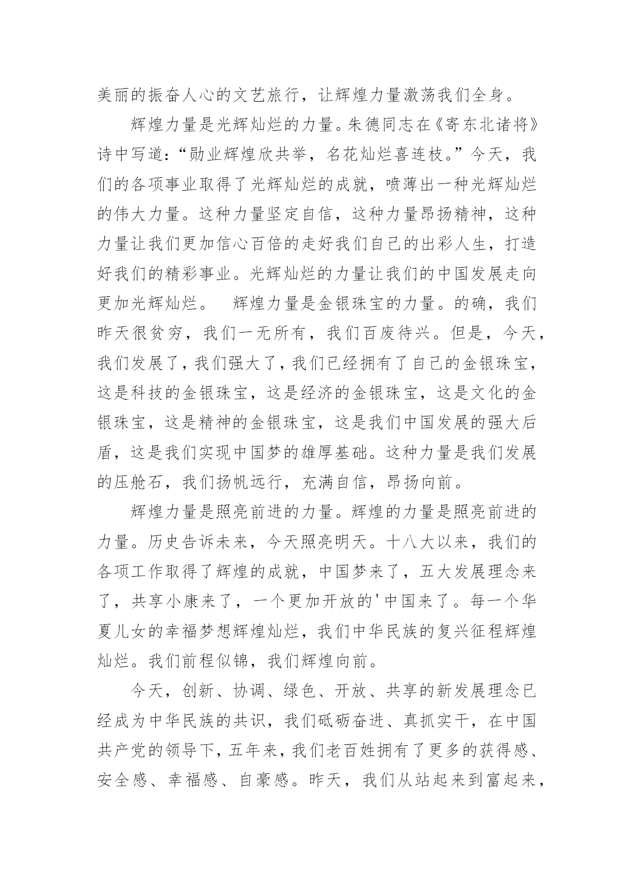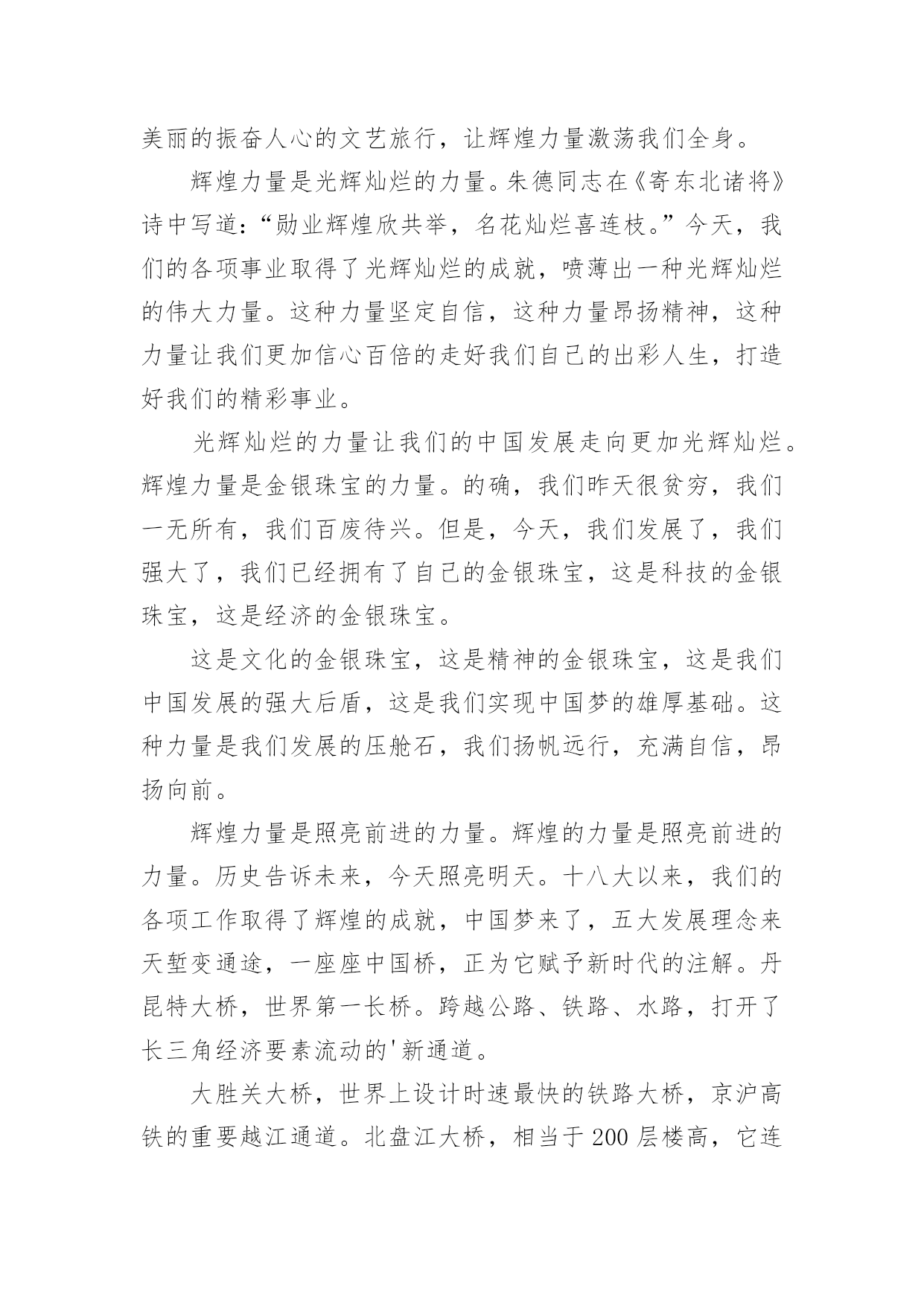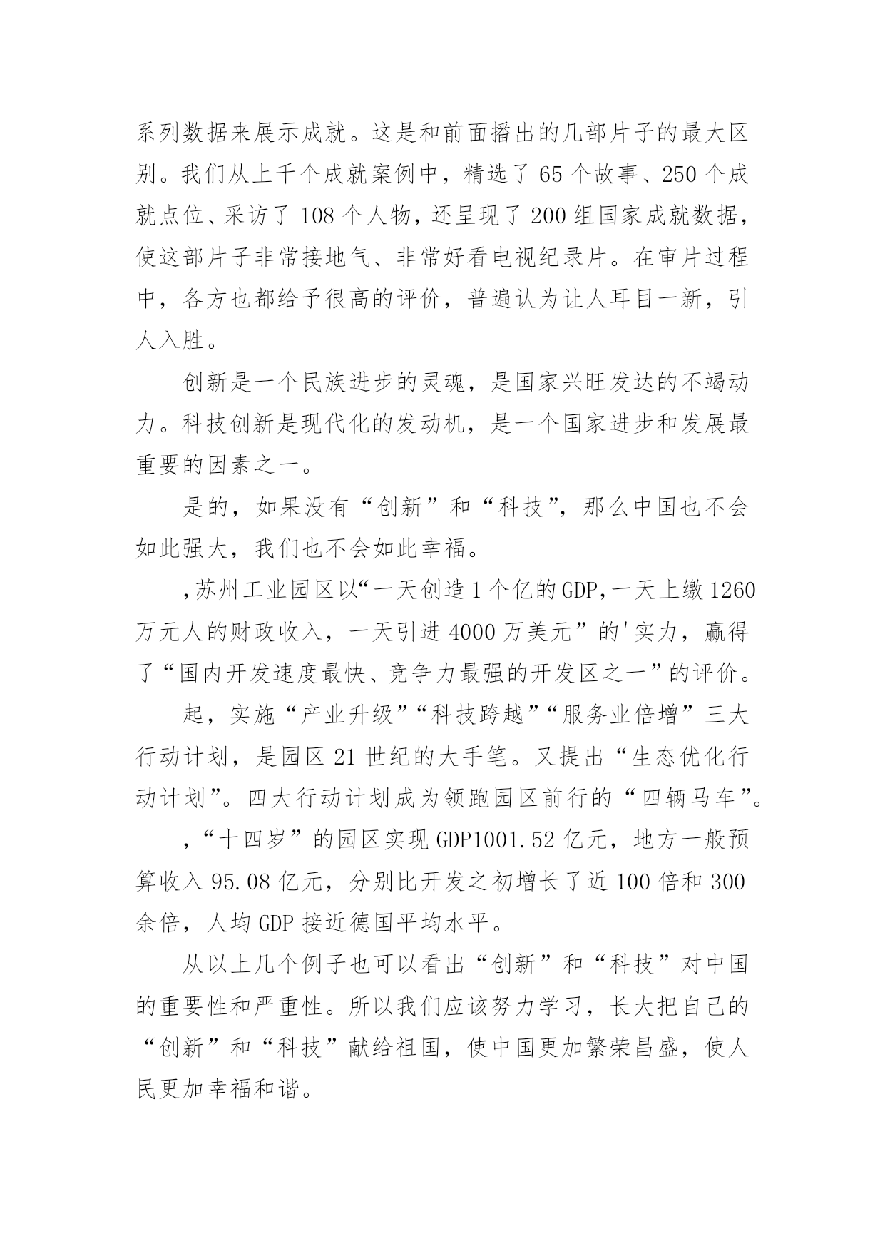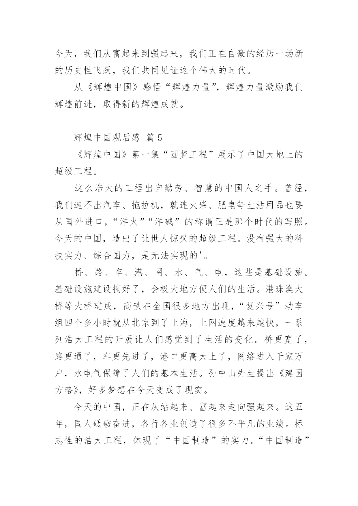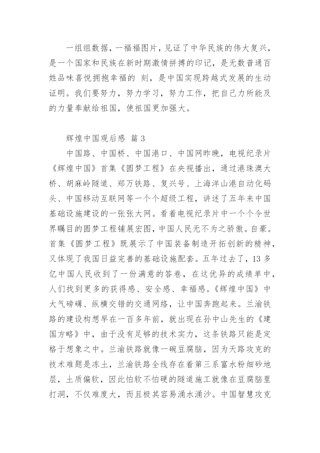 辉煌中国观后感在观赏了后,心中感慨万千,不禁为作品所深深折服,这次观看让你有什么体会呢?观后感的表达方式灵活多样,基本属于议论范畴,但写法不同于一般议论文,因为它必须是在观看后的基础上发感想。是不是无从下笔、没有头绪?以下是小编精心整理的辉煌中国观后感,欢迎阅读,希望大家能够喜欢。辉煌中国观后感篇19月21日晚,电视台播出六集电视纪录片《辉煌中国》第三集《协调发展》。在中国这片广袤的土地上,我们可以从摄影师的记录中,看到天梯上孩子们的笑容,扶贫干部的汗与泪,姑苏小镇城乡统筹的奇迹,“闽宁模式”东西部牵手的成功跨越,一个个特色小镇、中心城市、城市群的兴起。而长江经济带,京津冀一体化,以及萦绕着千年大计、国家大事的雄安新区,《辉煌中国》正给我们展现了国家协调发展的宏大叙事。这是辉煌中国五年来的发展变化,从一个个小人物的奋斗历程中,我们可以看到,国家正在为东南西北中的协调发展努力,正在向一体化、一元化发展迈进。中国经历了几十年快速发展之后,西方经济学中那道所谓绕不过去的“中等收入陷阱”横亘在眼前。如何避免国家落入“陷阱”而停滞不前,中国正在用实际行动应对这些发展中遇到的难题。五年来,国家从缩小发展中的贫富差距、城乡差距、区域差距入手,努力回答几个问题,那就是如何让千百年来共同富裕的梦想照进现实,让中国的发展更加平衡协调、持续健康。从中我们可以看出,中国制度展示了特有的优势,而中国正在独具智慧地创造中国方案,更能增强中华民族的'制度自信。《辉煌中国》记录下的时代烙印如此立体而真实,虽然北京的文化和科技,天津的金融和新制造,河北的现代商贸和物流,定位、优势完全不同,但是协同发展的魅力却如此大,京昆高速、津保城际铁路、北京新机场,1小时通勤圈初步形成,13908亿元构筑起三地交通一体化的立体骨架。20xx年,京津冀经济增速达到7.5%,经济规模占全国的10%,已经成为拉动中国经济发展的重要引。随着京津冀协同发展的步伐加快,从交通、人才、教育、产业、城市布局等方面入手,我们可以发现,如今炙手可热的雄安新区正成为协调发展的全新样板。“没有做不到,只有想不到。”当协调发展与中国制度优势有机结合,必将能够碰撞出辉煌中国的新篇章。每个中国人都是辉煌中国的见证者,也是辉煌中国的实践者,随着协调发展进行曲的奏响,我们定能继续书写属于这个时代的协调发展传奇。辉煌中国观后感篇2这部纪录片,以纪实手法拍摄,用讲故事的方式、用一系列数据来展示成就。这是和前面播出的几部片子的最大区别。我们从上千个成就案例中,精选了65个故事、250个成就点位、采访了108个人物,还呈现了200组国家成就数据,使这部片子非常接地气、非常好看电视纪录片。在审片过程中,各方也都给予很高的评价,普遍认为让人耳目一新,引人入胜。创新是一个民族进步的灵魂,是国家兴旺发达的不竭动力。科技创新是现代化的发动机,是一个国家进步和发展最重要的因素之一。是的,如果没有“创新”和“科技”,那么中国也不会如此强大,我们也不会如此幸福。,苏州工业园区以“一天创造1个亿的GDP,一天上缴1260万元人的财政收入,一天引进4000万美元”的'实力,赢得了“国内开发速度最快、竞争力最强的开发区之一”的评价。起,实施“产业升级”“科技跨越”“服务业倍增”三大行动计划,是园区21世纪的大手笔。又提出“生态优化行动计划”。四大行动计划成为领跑园区前行的“四辆马车”。,“十四岁”的园区实现GDP1001.52亿元,地方一般预算收入95.08亿元,分别比开发之初增长了近100倍和300余倍,人均GDP接近德国平均水平。从以上几个例子也可以看出“创新”和“科技”对中国的重要性和严重性。所以我们应该努力学习,长大把自己的“创新”和“科技”献给祖国,使中国更加繁荣昌盛,使人民更加幸福和谐。一组组数据,一福福图片,见证了中华民族的伟大复兴,是一个国家和民族在新时期激情拼搏的印记,是无数普通百姓品味喜悦拥抱幸福的刻,是中国实现跨越式发展的生动证明。我们要努力,努力学习,努力工作,把自己力所能及的力量奉献给祖国,使祖国更加强大。辉煌中国观后感篇3中国路、中国桥、中国港口、中国网昨晚,电视纪录片《辉煌中国》首集《圆梦工程》在央视播出,通过港珠澳大桥、胡麻岭隧道、郑万铁路、复兴号、上海洋山港自动化码头、中国移动互联网等一个个超级工程,讲述了五年来中国基础设施建设的一张张大网。看着电视纪录片中一个个令世界瞩目的圆梦工程铺展宏图,中国人民无不为之骄傲。自豪。首集《圆梦工程》既展示了中国装备制造开拓创新的精神,又体现了我国日益完善的基础设施配套。五年过去了,13多亿中国人民收到了一份满意的答卷,在这优异的成绩单中,人们找到更多的获得感、安全感、幸福感。《辉煌中国》中大气磅礴、纵横交错的交通网络,让中国奔跑起来。兰渝铁路的建设构想早在一百多