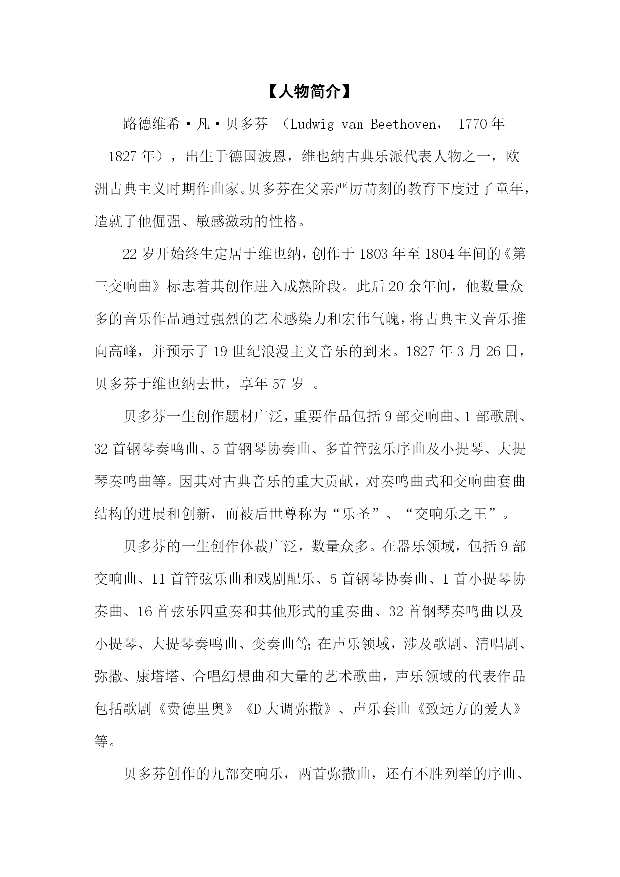 【人物简介】路德维希·凡·贝多芬(LudwigvanBeethoven,1770年—1827年),出生于德国波恩,维也纳古典乐派代表人物之一,欧洲古典主义时期作曲家。贝多芬在父亲严厉苛刻的教育下度过了童年,造就了他倔强、敏感激动的性格。22岁开始终生定居于维也纳,创作于1803年至1804年间的《第三交响曲》标志着其创作进入成熟阶段。此后20余年间,他数量众多的音乐作品通过强烈的艺术感染力和宏伟气魄,将古典主义音乐推向高峰,并预示了19世纪浪漫主义音乐的到来。1827年3月26日,贝多芬于维也纳去世,享年