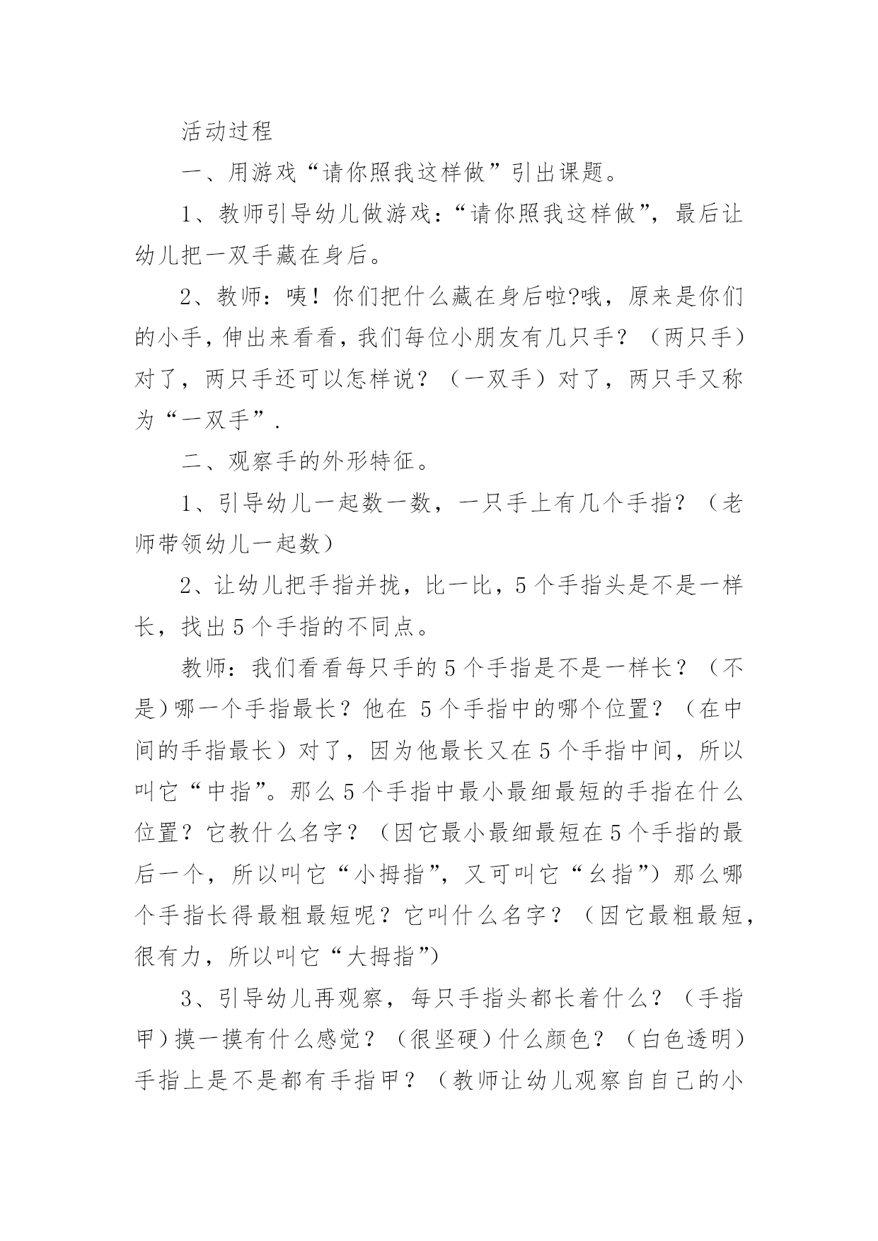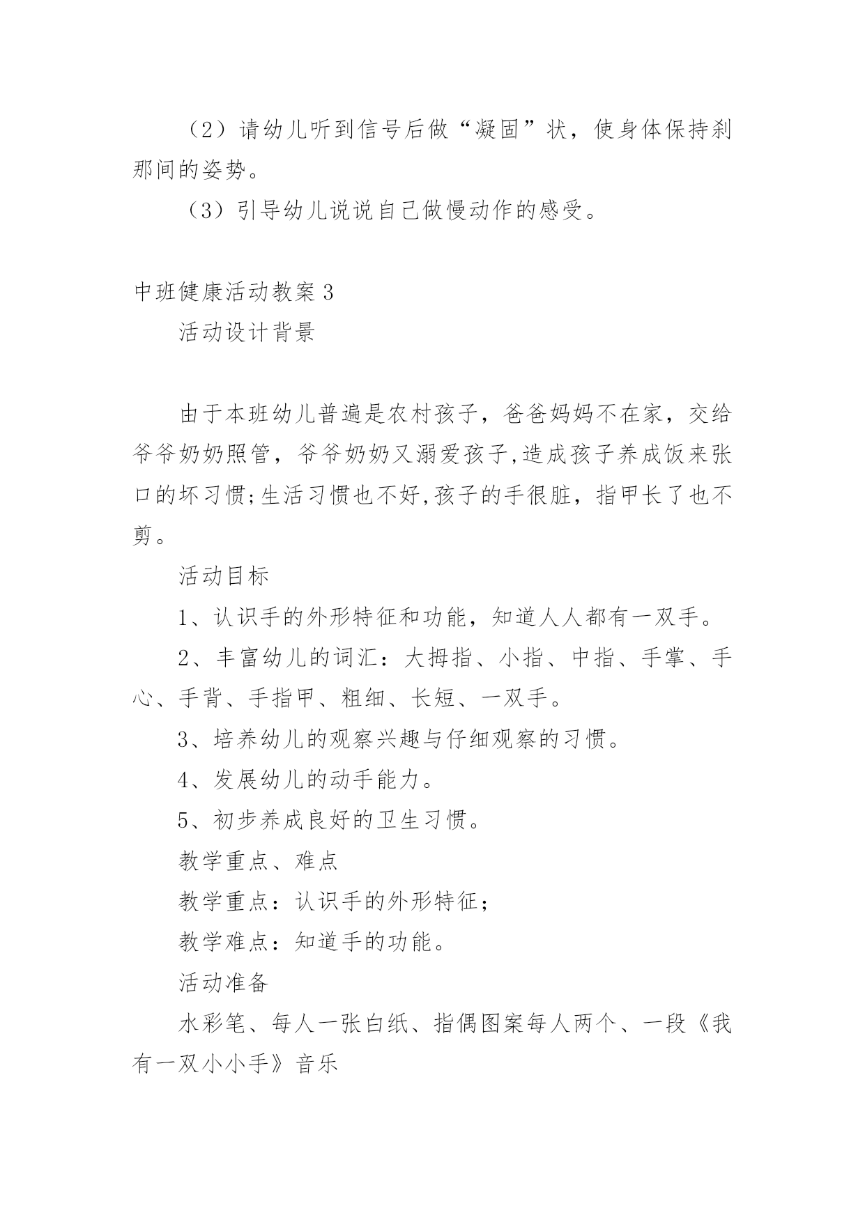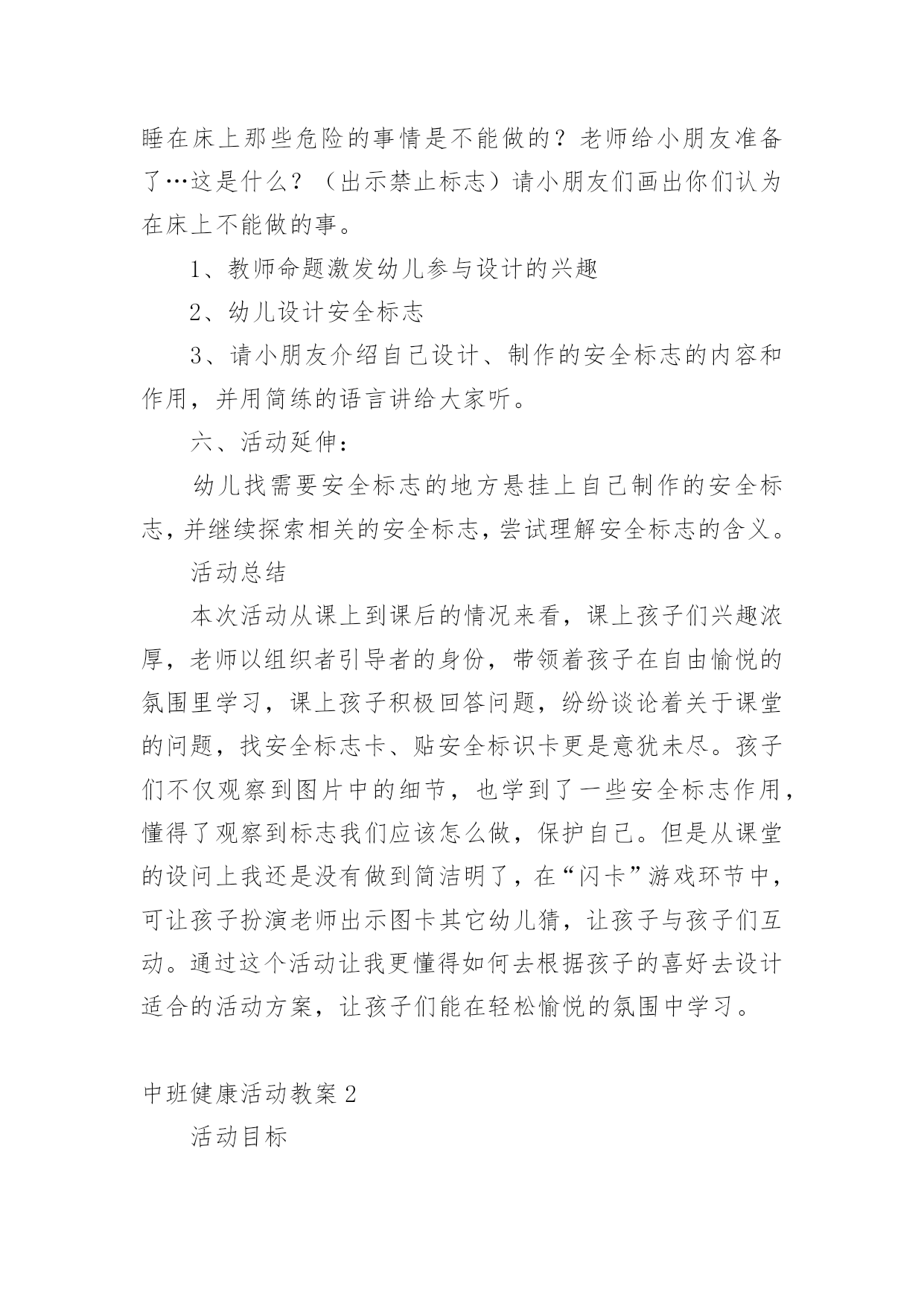 中班健康活动教案作为一名老师,就有可能用到教案,借助教案可以有效提升自己的教学能力。怎样写教案才更能起到其作用呢?以下是小编精心整理的中班健康活动教案,希望对大家有所帮助。中班健康活动教案1活动目标1、认识禁止吸烟、禁止奔跑、禁止攀爬、禁止倚靠、禁止触摸等常见的安全标志。2、能正确的在相应的位置或场地使用相应的安全标志。3、尝试根据老师的要求设计相应的安全标志。重点难点重点:认识禁止吸烟、禁止奔跑、禁止攀爬、禁止倚靠、禁止触摸等常见的安全标志难点:能正确的在相应的位置或场地使用相应的安全标志。活动准备1、多媒体课件。2、准备一个安全标志相关的"安全小故事。3、禁止吸烟、禁止触摸、禁止攀爬、禁止奔跑、禁止翻越五种安全标识一样6份。4、画纸、水彩笔。活动过程一、认识禁止吸烟、禁止奔跑、禁止攀爬标志1、禁止标志吸烟今天小兔和爸爸一起来到了学校,看,一进学校大厅,它看到了什么?有一个什么标志?(禁止吸烟)这是什么标志?你是从哪里看出来是禁止吸烟的标志?(引导幼儿观察图片细节)为什么要有这个标志?这个安全标志有什么用?告诉我们应该怎样做?如果没有这些标志在此吸烟会发生什么事?(鼓励幼儿结合生活经验展开想象、互相讨论)2、禁止奔跑标志小兔走到学校楼梯,发现每一个楼梯拐角处都有一个相同的标志(说完再出示PPT),说说这是你看到了什么标志?(如果孩子不会,就用动作引导幼儿)这个标志告诉了我们什么?得出结论:知道看到贴有这样标志的地方都不能奔跑。3、禁止攀爬标志小兔继续走,来到了楼道,它又看到了什么标志?(禁止攀爬)这是什么标志?你是怎么知道是不能爬(禁止攀爬)?遇到看到这个标志应该怎么做?得出结论:知道看到贴有这样标志的地方都不能攀爬。二、理解禁止标志的涵义,找到其相同点。1、刚才我们认识了三个标志,一起来回忆一下,小兔走进学校看到了?说出后贴出标志.........我们来看看它们都小朋友们仔细看看折三个标志有什么相同的地方?2、三个标志有什么不同的'地方?.3、小结:这三个标志都是禁止标志,都是红色的,圆形的,中间画了一条斜线是告诉我们不能做图中的事情。三、认识禁止触摸、禁止倚靠标志除了这些安全标志,老师还有一些标志,小朋友们来看一看、说一说它们是什么标志?表示什么意思?依次出示禁止倚靠、禁止触摸的标志卡。你知道这是什么标志吗?哪些地方是不能倚靠的?为什么XXX不能倚靠?这是什么标志?(禁止触摸)你为什么说这是禁止触摸喃?哪些地方是不能触摸的?为什么?四、贴安全标志:(每组六名幼儿共用一份材料随机六张安全标志卡)在教室贴上相应的安全标志(分组限时粘贴)1、你们都认识了这些安全标志,知道了用途,请你们看看我们的教室里哪些地方需要这些安全标志呢?想一想。2、将你自己手中的安全标志贴在合适的地方。(幼儿分组贴上安全标志)3、幼儿介绍自己贴的安全标志。你贴的是什么标志?把安全标志贴在这里是提醒大家什么?为什么要贴在这里?4、小结:我们一定要按安全标志上的要求行动,才能让自己或者他人远离危险。五、设计安全标志:(小朋友在床上禁止做什么事情)班上有很多小朋友在午睡时总是做一些危险的事?午睡在床上那些危险的事情是不能做的?老师给小朋友准备了…这是什么?(出示禁止标志)请小朋友们画出你们认为在床上不能做的事。1、教师命题激发幼儿参与设计的兴趣2、幼儿设计安全标志3、请小朋友介绍自己设计、制作的安全标志的内容和作用,并用简练的语言讲给大家听。六、活动延伸:幼儿找需要安全标志的地方悬挂上自己制作的安全标志,并继续探索相关的安全标志,尝试理解安全标志的含义。活动总结本次活动从课上到课后的情况来看,课上孩子们兴趣浓厚,老师以组织者引导者的身份,带领着孩子在自由愉悦的氛围里学习,课上孩子积极回答问题,纷纷谈论着关于课堂的问题,找安全标志卡、贴安全标识卡更是意犹未尽。孩子们不仅观察到图片中的细节,也学到了一些安全标志作用,懂得了观察到标志我们应该怎么做,保护自己。但是从课堂的设问上我还是没有做到简洁明了,在“闪卡”游戏环节中,可让孩子扮演老师出示图卡其它幼儿猜,让孩子与孩子们互动。通过这个活动让我更懂得如何去根据孩子的喜好去设计适合的活动方案,让孩子们能在轻松愉悦的氛围中学习。中班健康活动教案2活动目标1、能想像、设计一系列慢动作。2、培养身体控制能力。活动准备1、一处较宽阔的场地。2、一段卓别林电影的快镜头录像,一段跑步冲刺时的慢镜头录像。活动过程1、观看录像。(1)观看卓别林的`快镜头动作,说说他的动作与我们平时做的动作有什么不同。(2)观看跑步冲刺的,慢镜头动作,说说它与快速跑动时的动作有什么不同。2、模仿跑步动作,(1)引导幼儿想像跑步时的样子。(2)请幼儿用慢动作表现跑步的样子。(3)请幼儿尽自己所能,用最慢的动作表现自己到终点处冲刺时的样子,还可加上用