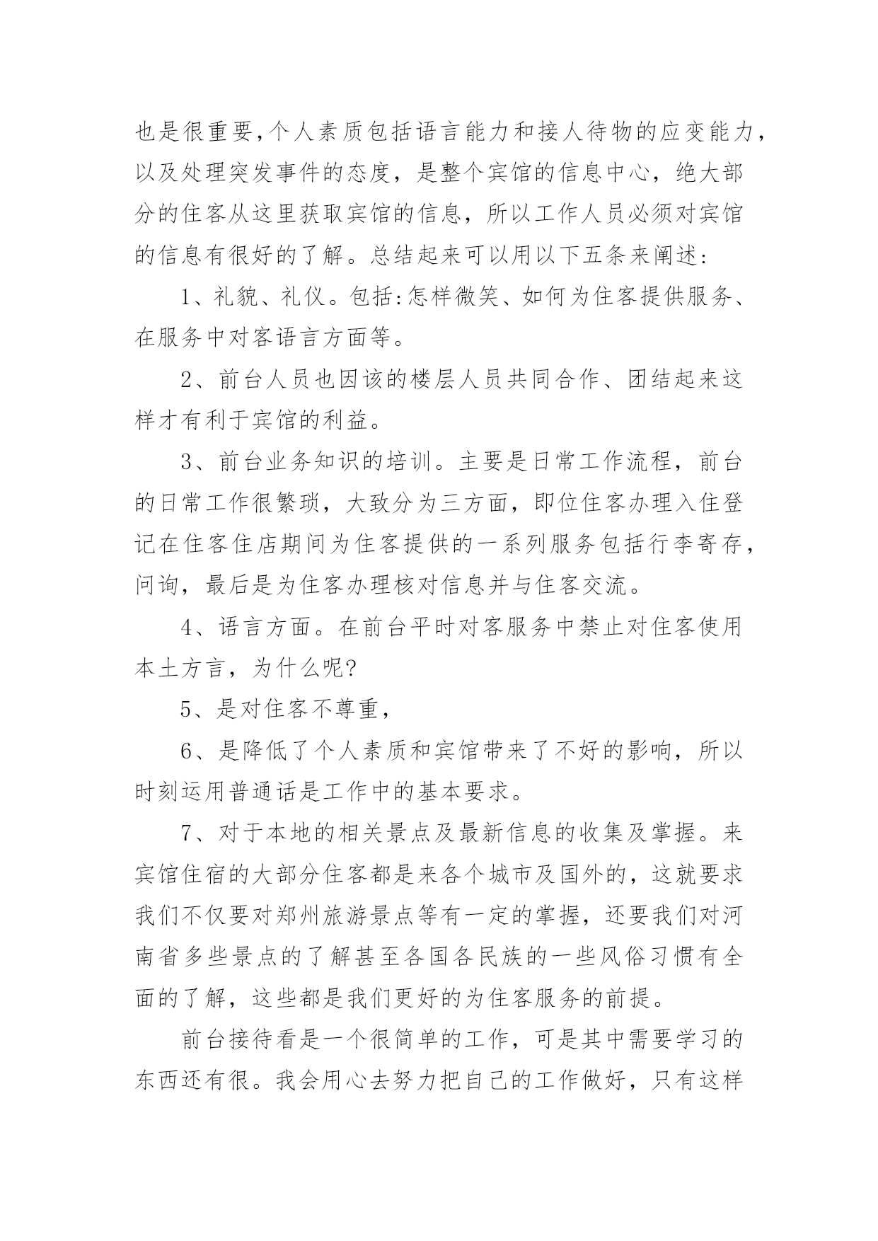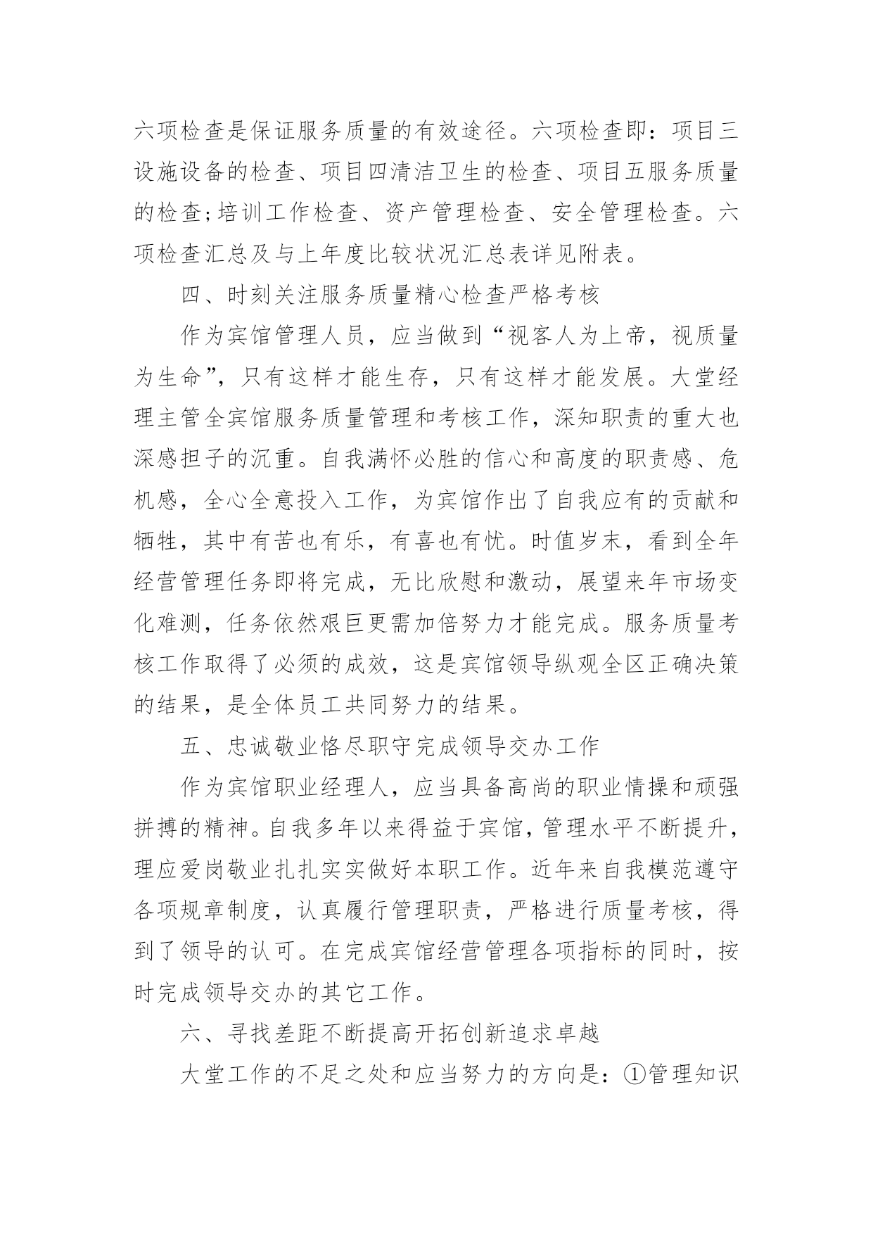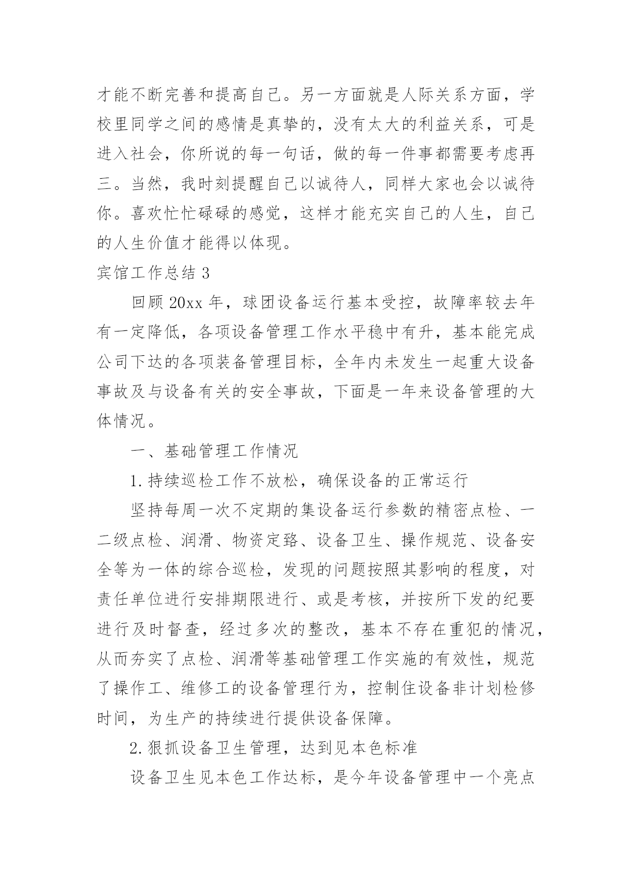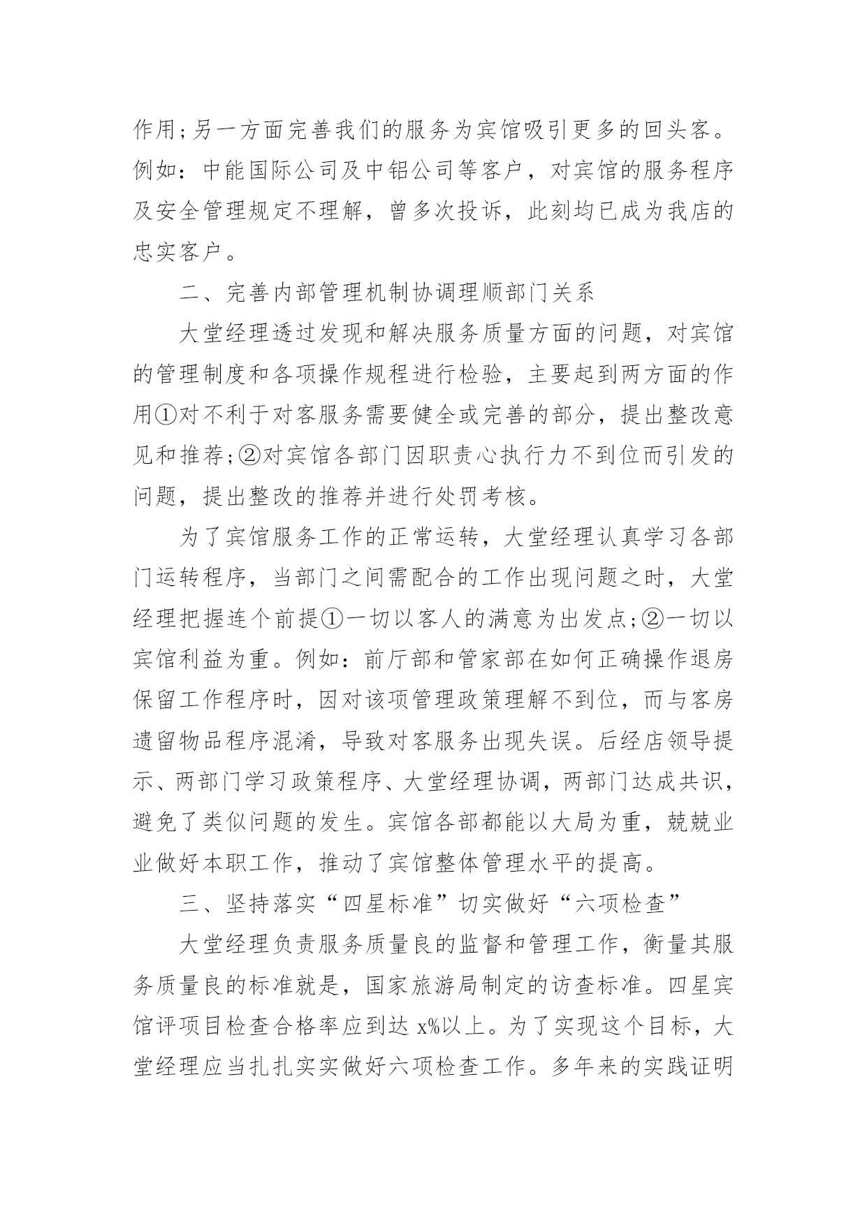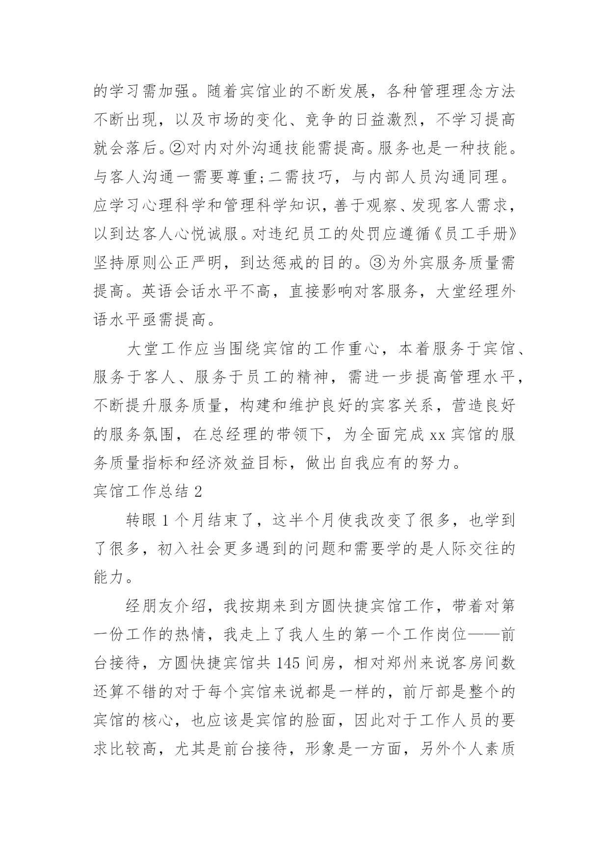 宾馆工作总结宾馆工作总结总结是把一定阶段内的有关情况分析研究,做出有指导性结论的书面材料,它可以促使我们思考,让我们好好写一份总结吧。总结怎么写才能发挥它的作用呢?下面是小编精心整理的宾馆工作总结,仅供参考,大家一起来看看吧。宾馆工作总结1一、维护良好宾客关系妥善处理客人投诉尊敬并尊重客人,不单是一种单纯的表面上的毕恭毕敬,它应当是一种出自内心的敬重,行动只是其自然的流露。只有如此,才会想尽办法去做好服务,即使是一些纯属个人的偏好或习惯,只要于尊重客人不利,也会认真地去改掉。只有做到了这一点,才会自然地尊重客人。对客人一向持续着谦敬的态度,也会由此赢得客人的尊敬。在工作中树立了三个理念即①顾客理念:“一切以顾客为关注焦点,也就是以服务好顾客为最终目的。②细节理念:细节决定成败,宾馆服务说到底就是细节服务,做好每一个工作细节,宾馆管理系统、服务系统就会顺畅运转。③文化理念:让顾客享受一种高品质的、独特的、终身难忘的消费(住店、用餐)体验,让员工在和谐、健康的企业氛围中工作和学习。透过妥善处理客人投诉,一方面发现整改自身问题起到教育培训员工的作用;另一方面完善我们的服务为宾馆吸引更多的回头客。例如:中能国际公司及中铝公司等客户,对宾馆的服务程序及安全管理规定不理解,曾多次投诉,此刻均已成为我店的忠实客户。二、完善内部管理机制协调理顺部门关系大堂经理透过发现和解决服务质量方面的问题,对宾馆的管理制度和各项操作规程进行检验,主要起到两方面的作用①对不利于对客服务需要健全或完善的部分,提出整改意见和推荐;②对宾馆各部门因职责心执行力不到位而引发的问题,提出整改的推荐并进行处罚考核。为了宾馆服务工作的正常运转,大堂经理认真学习各部门运转程序,当部门之间需配合的工作出现问题之时,大堂经理把握连个前提①一切以客人的满意为出发点;②一切以宾馆利益为重。例如:前厅部和管家部在如何正确操作退房保留工作程序时,因对该项管理政策理解不到位,而与客房遗留物品程序混淆,导致对客服务出现失误。后经店领导提示、两部门学习政策程序、大堂经理协调,两部门达成共识,避免了类似问题的发生。宾馆各部都能以大局为重,兢兢业业做好本职工作,推动了宾馆整体管理水平的提高。三、坚持落实“四星标准”切实做好“六项检查”大堂经理负责服务质量良的监督和管理工作,衡量其服务质量良的标准就是,国家旅游局制定的访查标准。四星宾馆评项目检查合格率应到达x%以上。为了实现这个目标,大堂经理应当扎扎实实做好六项检查工作。多年来的实践证明六项检查是保证服务质量的有效途径。六项检查即:项目三设施设备的检查、项目四清洁卫生的检查、项目五服务质量的检查;培训工作检查、资产管理检查、安全管理检查。六项检查汇总及与上年度比较状况汇总表详见附表。四、时刻关注服务质量精心检查严格考核作为宾馆管理人员,应当做到“视客人为上帝,视质量为生命”,只有这样才能生存,只有这样才能发展。大堂经理主管全宾馆服务质量管理和考核工作,深知职责的重大也深感担子的沉重。自我满怀必胜的信心和高度的职责感、危机感,全心全意投入工作,为宾馆作出了自我应有的贡献和牺牲,其中有苦也有乐,有喜也有忧。时值岁末,看到全年经营管理任务即将完成,无比欣慰和激动,展望来年市场变化难测,任务依然艰巨更需加倍努力才能完成。服务质量考核工作取得了必须的成效,这是宾馆领导纵观全区正确决策的结果,是全体员工共同努力的结果。五、忠诚敬业恪尽职守完成领导交办工作作为宾馆职业经理人,应当具备高尚的职业情操和顽强拼搏的精神。自我多年以来得益于宾馆,管理水平不断提升,理应爱岗敬业扎扎实实做好本职工作。近年来自我模范遵守各项规章制度,认真履行管理职责,严格进行质量考核,得到了领导的认可。在完成宾馆经营管理各项指标的同时,按时完成领导交办的其它工作。六、寻找差距不断提高开拓创新追求卓越大堂工作的不足之处和应当努力的方向是:①管理知识的学习需加强。随着宾馆业的不断发展,各种管理理念方法不断出现,以及市场的变化、竞争的日益激烈,不学习提高就会落后。②对内对外沟通技能需提高。服务也是一种技能。与客人沟通一需要尊重;二需技巧,与内部人员沟通同理。应学习心理科学和管理科学知识,善于观察、发现客人需求,以到达客人心悦诚服。对违纪员工的处罚应遵循《员工手册》坚持原则公正严明,到达惩戒的目的。③为外宾服务质量需提高。英语会话水平不高,直接影响对客服务,大堂经理外语水平亟需提高。大堂工作应当围绕宾馆的工作重心,本着服务于宾馆、服务于客人、服务于员工的精神,需进一步提高管理水平,不断提升服务质量,构建和维护良好的宾客关系,营造良好的服务氛围,在总经理的带领下,为全面完成xx宾馆的服务质量指标和经济效益目标,做出自我应有的努力。宾馆工作总结2转眼1个月结束了,这半个月使我改变了很多,也学到了很