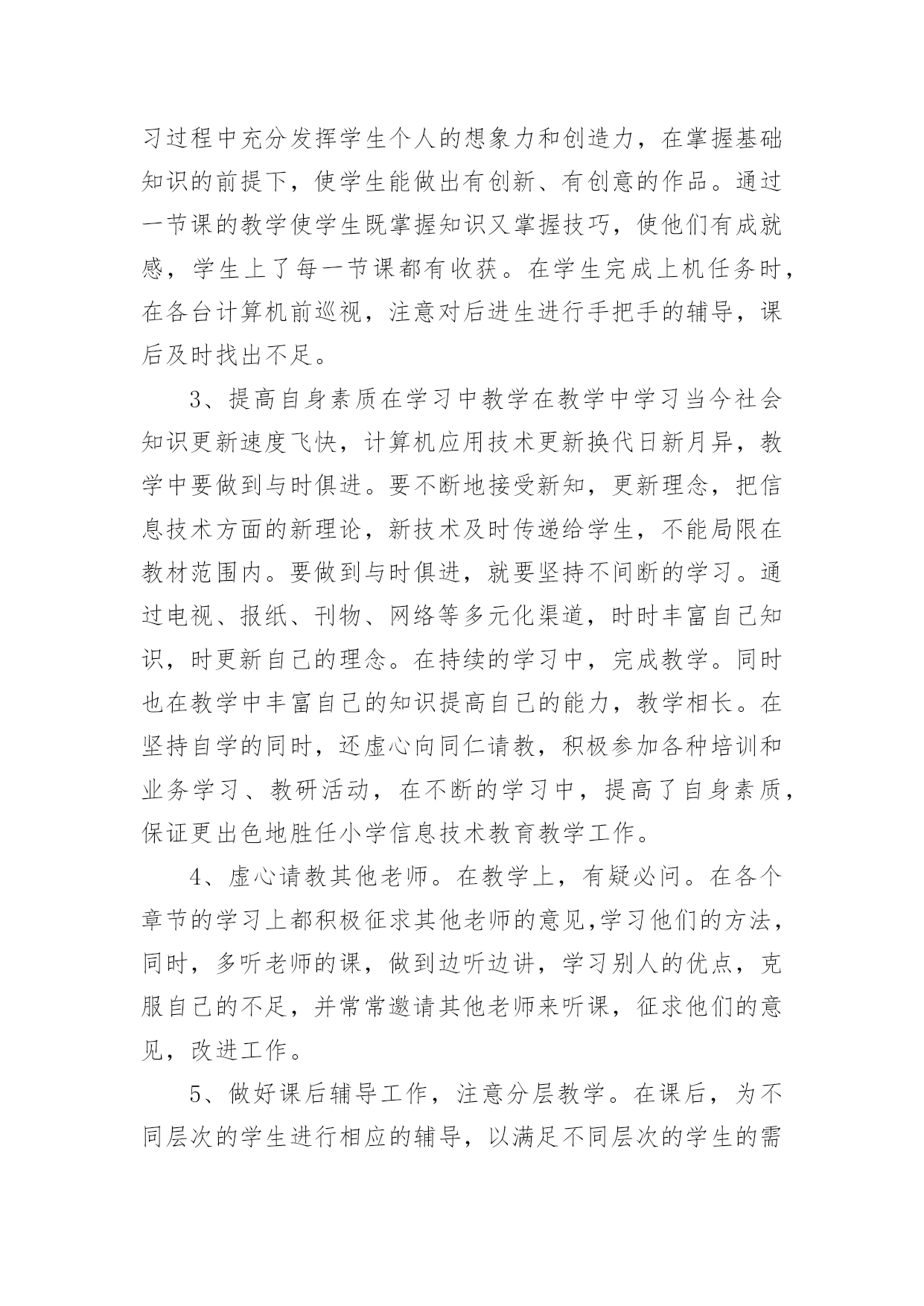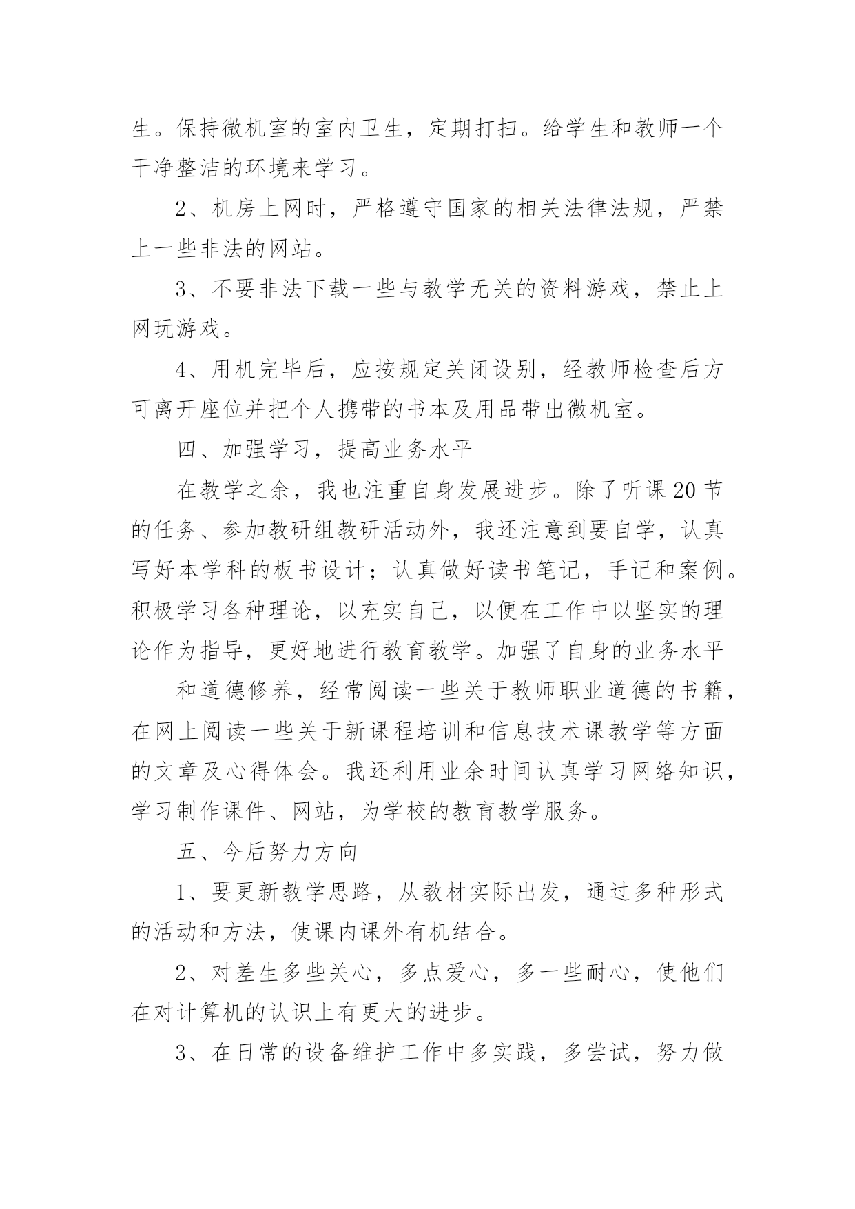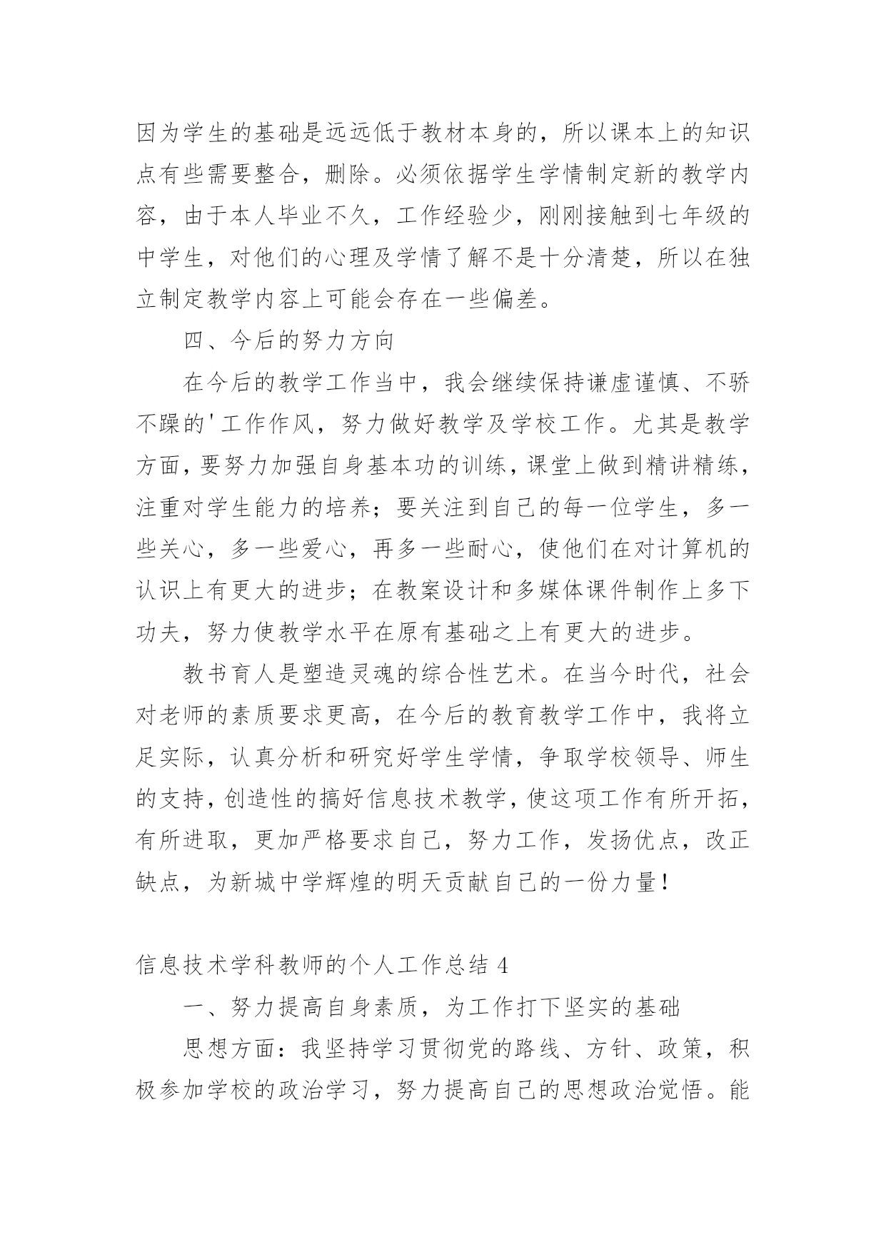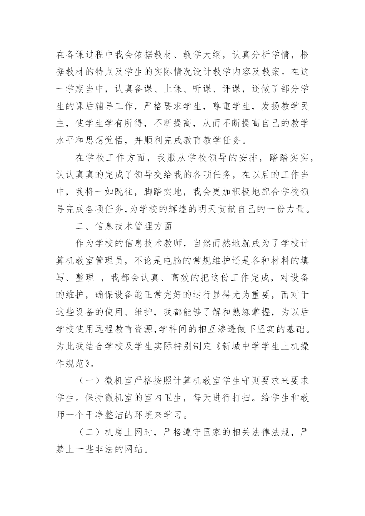 信息技术学科教师的个人工作总结信息技术学科教师的个人工作总结(精选5篇)时间过得真快,一段时间的工作已经告一段落了,回顾这段时间的工作,理论知识和业务水平都得到了很大提高,需要认真地为此写一份工作总结。那么要如何写呢?下面是小编为大家收集的信息技术学科教师的个人工作总结(精选5篇),欢迎大家分享。信息技术学科教师的个人工作总结120xx年秋季学期信息技术教师工作总结本学期在学校的领导下,并结合我校的实际情况开展了信息技术教育、教学工作。学期临近结束,回顾一学期以来的工作,不论是工作中还是自身的业务水平都得到了逐步的提高,充实了许多,也得到了许多,现总结如下:一、教学方面开学初我制定了自己的教学工作计划,认真备好20xx年级的课,上好课,为更好地完成教学工作任务做好准备。上好每节课对于老师,对于学生都是很关键的。确实,这个学期我真的做到了这一点,通过一年的学习,学生能够按照课程标准完成了教学任务。当然还有少数学生掌握程度并不理想,这点在今后的教学当中是我必须要去努力攻克的难点。在基本课程的学习之余,有的学生学会了一些软件的安装,帮助教师进行电脑的简单维护,用计算机来解决一些其它学科学习中遇到的问题。二、师德渗透方面教师的一切活动不仅以各种有目的、有计划的教育措施影响学生,而且也以自己全部的个性心理品质影响着学生的心灵。因此在工作中我能按照《中小学教师职业道德规范》严格要求自己,为人师表,严格执行师德规范,有高度的事业心、责任心、爱岗敬业,重视对每个学生的全面素质和良好个性的培养。信息技术学科有本身的特点,学生上课时要经常动手操作,这就难免有些学生不能听从老师的指挥,容易造成课堂秩序的混乱,所以在教学中我对学生提出严格的要求,而且我自己也以身作则,让学生们心服口服。在严要求的同时,我又对他们充满关爱与耐心,指导他们的学习并对他们进行集体主义的教育,并要求他们时刻谨记爱护学校的公共财物,自觉爱护微机设备,这样在我的课堂上形成了良好的教学秩序,也是保障良好的教学效果的前提。三、信息技术管理方面作为学校的信息技术教师,自然而然地就成为了学校计算机教室管理员,不论是电脑的常规维护还是各种材料的填写、整理,我都会认真、高效的把这份工作完成,对设备的维护,确保设备能正常完好的运行显得尤为重要,而对于这些设备的使用、维护,我都能够了解和熟练掌握,为以后学校使用远程教育资源,学科间的相互渗透做下坚实的基础。1、微机室严格按照计算机教师学生守则要求来要求学生。保持微机室的室内卫生,定期打扫。给学生和教师一个干净整洁的环境来学习。2、机房上网时,严格遵守国家的相关法律法规,严禁上一些非法的网站。3、不要非法下载一些与教学无关的资料游戏,禁止上网玩游戏。4、用机完毕后,应按规定关闭设别,经教师检查后方可离开座位并把个人携带的书本及用品带出微机室。四、加强学习,提高业务水平在教学之余,我也注重自身发展进步。除了听课20节的任务、参加教研组教研活动外,我还注意到要自学,认真写好本学科的板书设计;认真做好读书笔记,手记和案例。积极学习各种理论,以充实自己,以便在工作中以坚实的理论作为指导,更好地进行教育教学。加强了自身的业务水平和道德修养,经常阅读一些关于教师职业道德的书籍,在网上阅读一些关于新课程培训和信息技术课教学等方面的文章及心得体会。我还利用业余时间认真学习网络知识,学习制作课件、网站,为学校的教育教学服务。五、今后努力方向1、要更新教学思路,从教材实际出发,通过多种形式的活动和方法,使课内课外有机结合。2、对差生多些关心,多点爱心,多一些耐心,使他们在对计算机的认识上有更大的进步。3、在日常的设备维护工作中多实践,多尝试,努力做到每一次的实践都能有所收获并充分利用好互联网资源。经过本学期的教学实践,我深深地感到,社会在发展,时代在前进,学生的特点和问题也在发生着不断的变化。作为教育工作者,必须以高度的敏感性和自觉性,踏实工作,服务于教,努力为学校的发展贡献自己的一份力量,胜利地完成我校的信息技术教学工作。信息技术学科教师的个人工作总结2信息技术教学工作总结本学期即将结束,回顾本学期的教育教学工作,本人能够努力工作,认真学习,有辛勤的耕耘,有收获的喜悦,,现总结如下:本学期,我担任学校的四、五年级信息技术教学。我从各方面严格要求自己,积极向老教师请教,结合本校的实际条件和学生的实际情况,勤勤恳恳,兢兢业业,使教学工作有计划,有组织,有步骤地开展。1、备课,开学初,根据学校要求,认真写好教学计划,提前备好课,写好教案。平时做到周前备课。备课时认真钻研教材,学习好《小学信息技术课程指导纲要》,虚心向其他教师学习、请教。力求吃透教材,找准重点、难点。2、上课,上好课的前提是做好课前准备,不打无准备之仗,尤其本学科主要课程都要上机完成,因此每节课前都要认