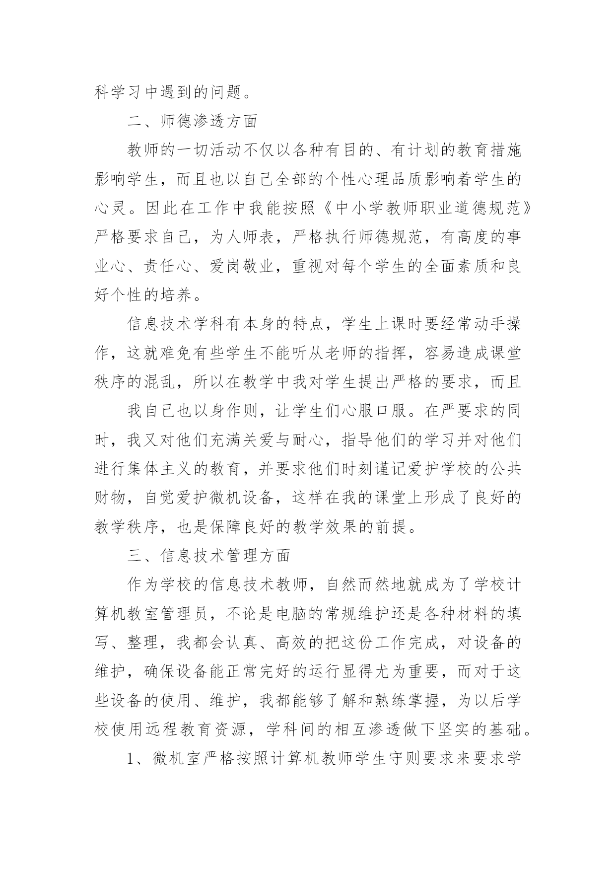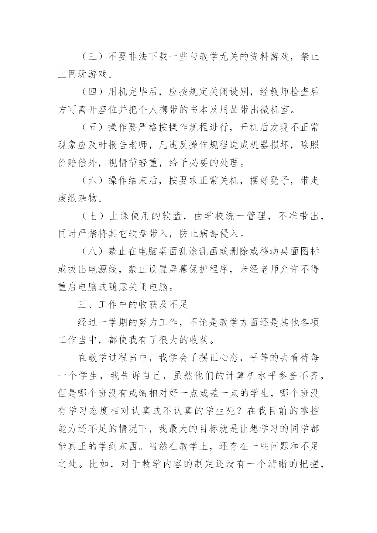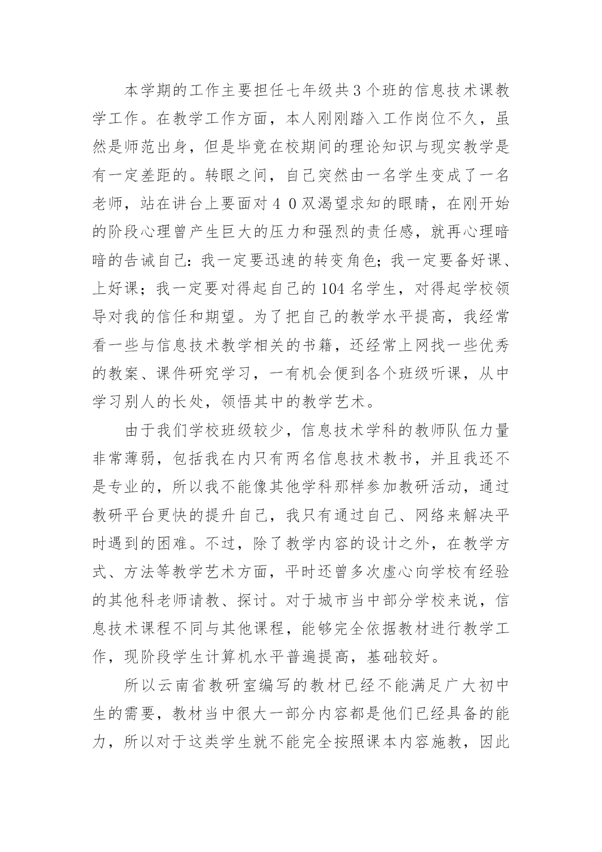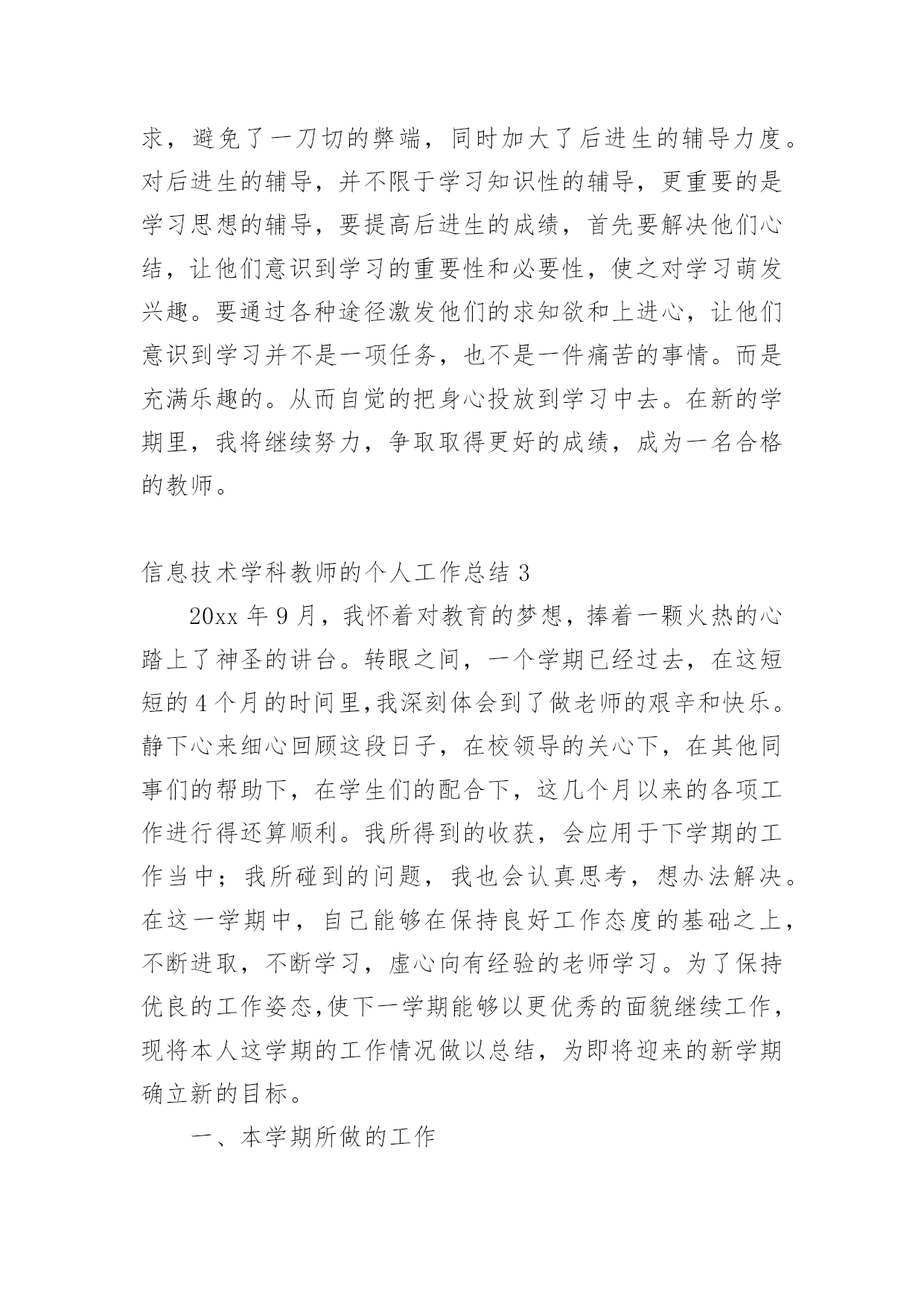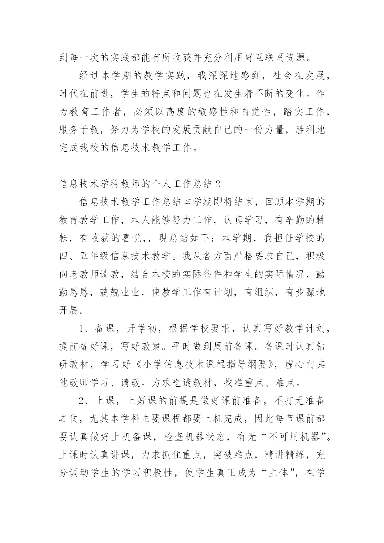 信息技术学科教师的个人工作总结信息技术学科教师的个人工作总结(精选5篇)时间过得真快,一段时间的工作已经告一段落了,回顾这段时间的工作,理论知识和业务水平都得到了很大提高,需要认真地为此写一份工作总结。那么要如何写呢?下面是小编为大家收集的信息技术学科教师的个人工作总结(精选5篇),欢迎大家分享。信息技术学科教师的个人工作总结120xx年秋季学期信息技术教师工作总结本学期在学校的领导下,并结合我校的实际情况开展了信息技术教育、教学工作。学期临近结束,回顾一学期以来的工作,不论是工作中还是自身的业务水平都得到了逐步的提高,充实了许多,也得到了许多,现总结如下:一、教学方面开学初我制定了自己的教学工作计划,认真备好20xx年级的课,上好课,为更好地完成教学工作任务做好准备。上好每节课对于老师,对于学生都是很关键的。确实,这个学期我真的做到了这一点,通过一年的学习,学生能够按照课程标准完成了教学任务。当然还有少数学生掌握程度并不理想,这点在今后的教学当中是我必须要去努力攻克的难点。在基本课程的学习之余,有的学生学会了一些软件的安装,帮助教师进行电脑的简单维护,用计算机来解决一些其它学科学习中遇到的问题。二、师德渗透方面教师的一切活动不仅以各种有目的、有计划的教育措施影响学生,而且也以自己全部的个性心理品质影响着学生的心灵。因此在工作中我能按照《中小学教师职业道德规范》严格要求自己,为人师表,严格执行师德规范,有高度的事业心、责任心、爱岗敬业,重视对每个学生的全面素质和良好个性的培养。信息技术学科有本身的特点,学生上课时要经常动手操作,这就难免有些学生不能听从老师的指挥,容易造成课堂秩序的混乱,所以在教学中我对学生提出严格的要求,而且我自己也以身作则,让学生们心服口服。在严要求的同时,我又对他们充满关爱与耐心,指导他们的学习并对他们进行集体主义的教育,并要求他们时刻谨记爱护学校的公共财物,自觉爱护微机设备,这样在我的课堂上形成了良好的教学秩序,也是保障良好的教学效果的前提。三、信息技术管理方面作为学校的信息技术教师,自然而然地就成为了学校计算机教室管理员,不论是电脑的常规维护还是各种材料的填写、整理,我都会认真、高效的把这份工作完成,对设备的维护,确保设备能正常完好的运行显得尤为重要,而对于这些设备的使用、维护,我都能够了解和熟练掌握,为以后学校使用远程教育资源,学科间的相互渗透做下坚实的基础。1、微机室严格按照计算机教师学生守则要求来要求学生。保持微机室的室内卫生,定期打扫。给学生和教师一个干净整洁的环境来学习。2、机房上网时,严格遵守国家的相关法律法规,严禁上一些非法的网站。3、不要非法下载一些与教学无关的资料游戏,禁止上网玩游戏。4、用机完毕后,应按规定关闭设别,经教师检查后方可离开座位并把个人携带的书本及用品带出微机室。四、加强学习,提高业务水平在教学之余,我也注重自身发展进步。除了听课20节的任务、参加教研组教研活动外,我还注意到要自学,认真写好本学科的板书设计;认真做好读书笔记,手记和案例。积极学习各种理论,以充实自己,以便在工作中以坚实的理论作为指导,更好地进行教育教学。加强了自身的业务水平和道德修养,经常阅读一些关于教师职业道德的书籍,在网上阅读一些关于新课程培训和信息技术课教学等方面的文章及心得体会。我还利用业余时间认真学习网络知识,学习制作课件、网站,为学校的教育教学服务。五、今后努力方向1、要更新教学思路,从教材实际出发,通过多种形式的活动和方法,使课内课外有机结合。2、对差生多些关心,多点爱心,多一些耐心,使他们在对计算机的认识上有更大的进步。3、在日常的设备维护工作中多实践,多尝试,努力做到每一次的实践都能有所收获并充分利用好互联网资源。经过本学期的教学实践,我深深地感到,社会在发展,时代在前进,学生的特点和问题也在发生着不断的变化。作为教育工作者,必须以高度的敏感性和自觉性,踏实工作,服务于教,努力为学校的发展贡献自己的一份力量,胜利地完成我校的信息技术教学工作。信息技术学科教师的个人工作总结2信息技术教学工作总结本学期即将结束,回顾本学期的教育教学工作,本人能够努力工作,认真学习,有辛勤的耕耘,有收获的喜悦,,现总结如下:本学期,我担任学校的四、五年级信息技术教学。我从各方面严格要求自己,积极向老教师请教,结合本校的实际条件和学生的实际情况,勤勤恳恳,兢兢业业,使教学工作有计划,有组织,有步骤地开展。1、备课,开学初,根据学校要求,认真写好教学计划,提前备好课,写好教案。平时做到周前备课。备课时认真钻研教材,学习好《小学信息技术课程指导纲要》,虚心向其他教师学习、请教。力求吃透教材,找准重点、难点。2、上课,上好课的前提是做好课前准备,不打无准备之仗,尤其本学科主要课程都要上机完成,因此每节课前都要认
