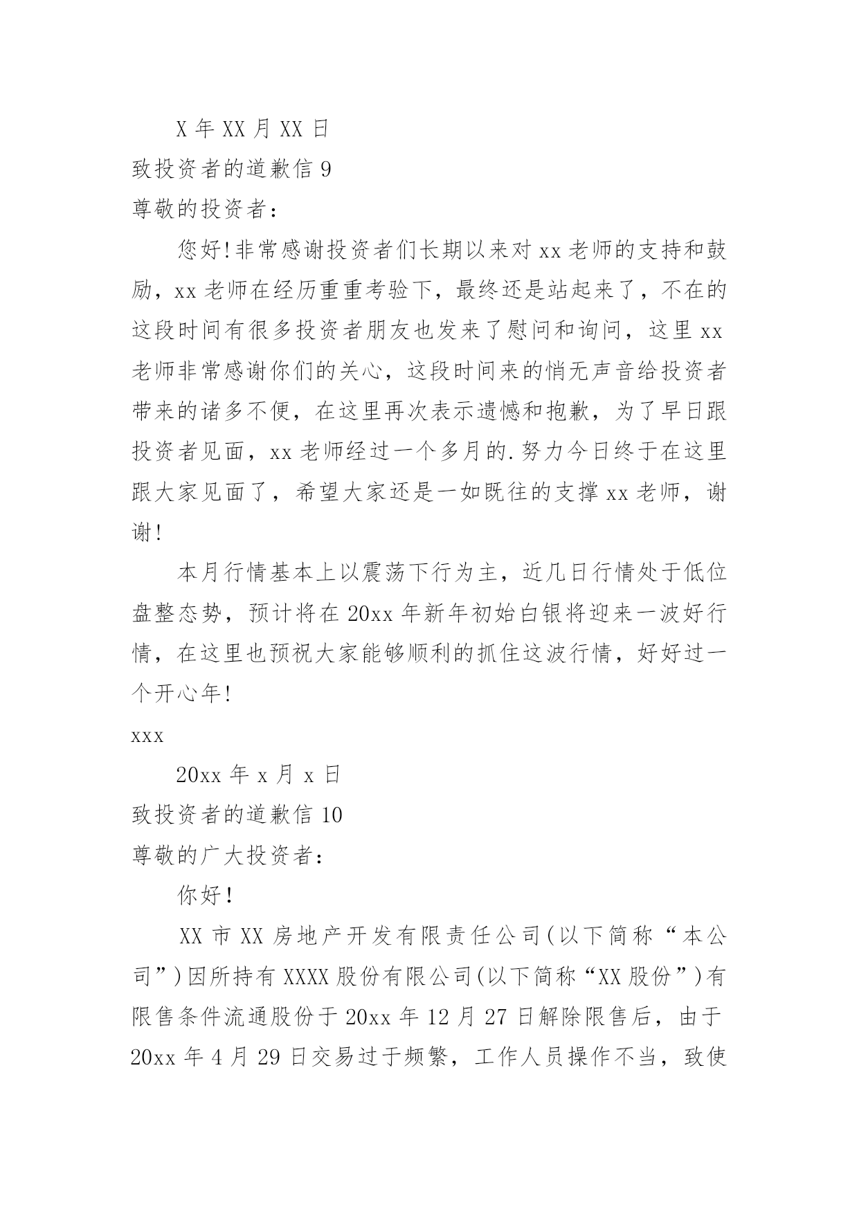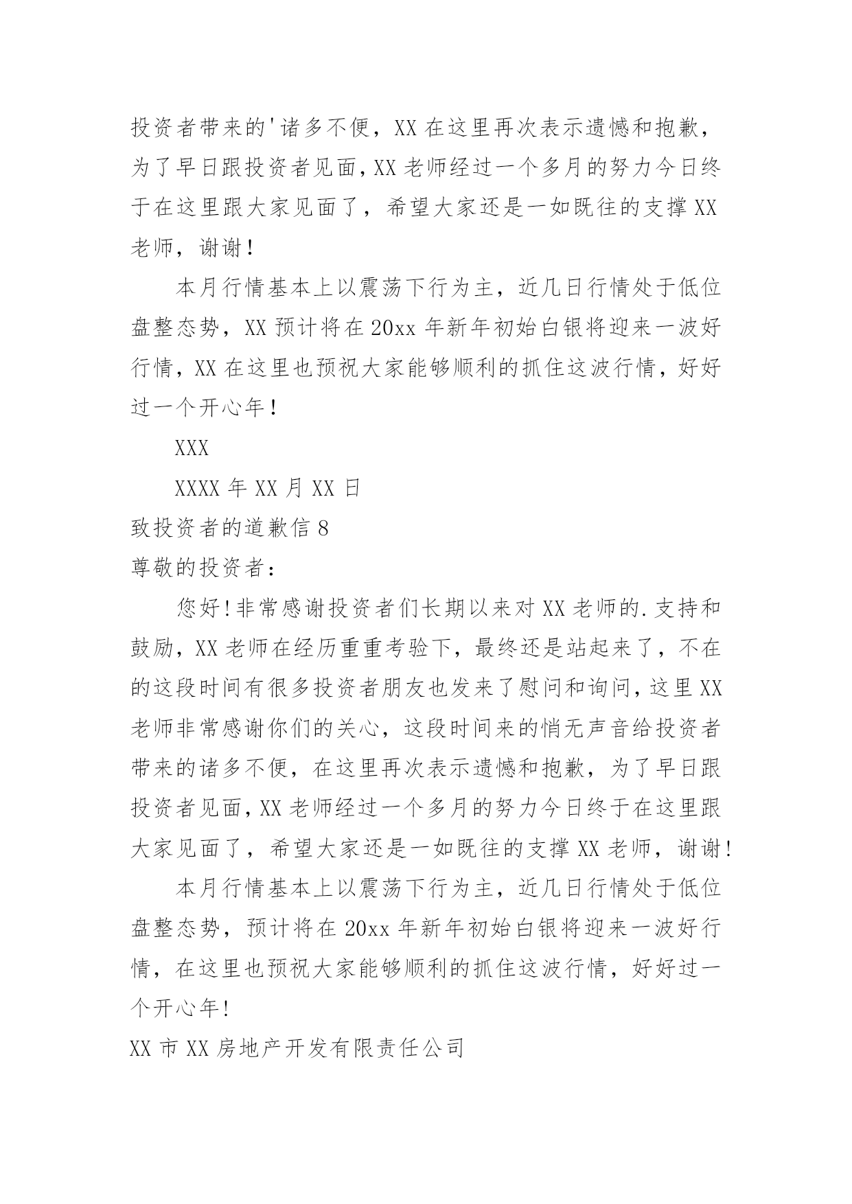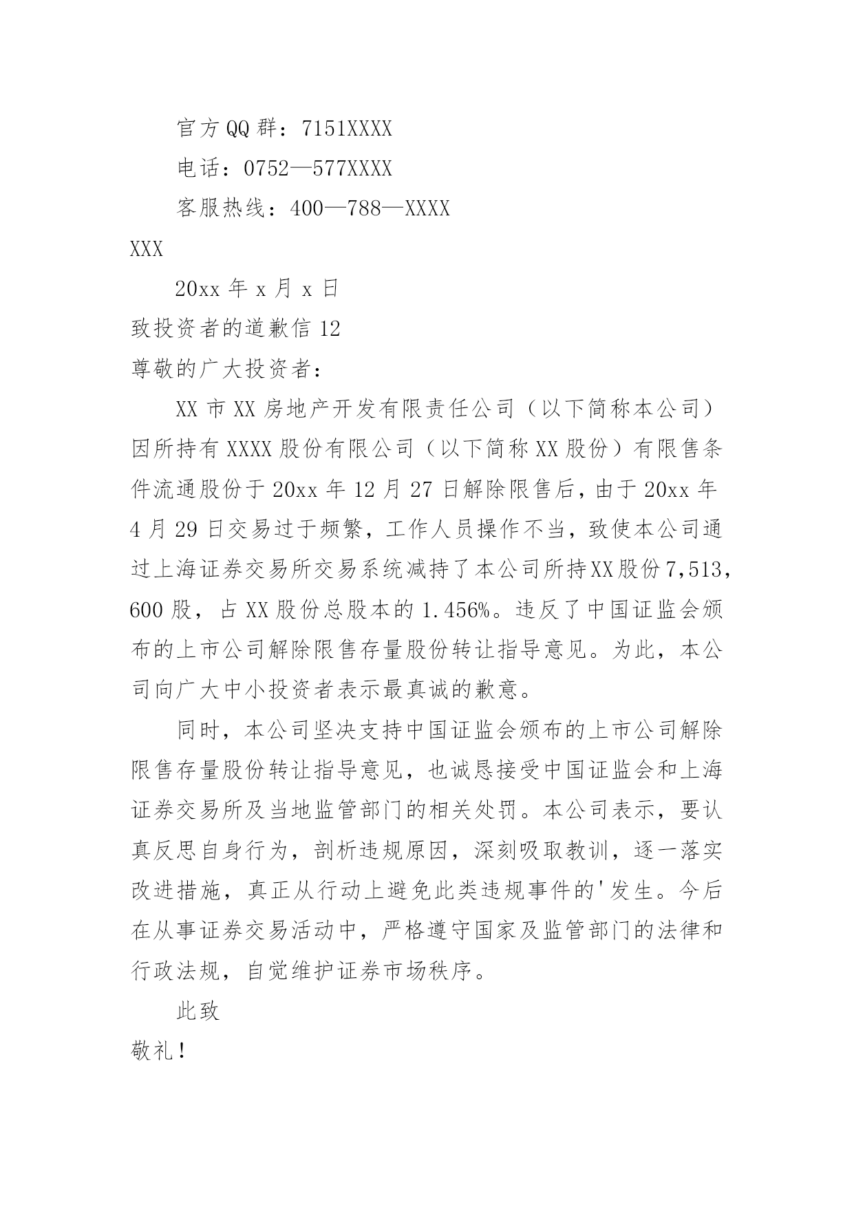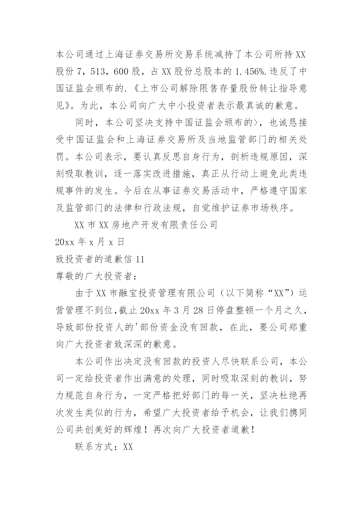 致投资者的道歉信致投资者的道歉信(15篇)在我们平凡的日常里,越来越多地方需要用到道歉信,道歉信可以帮助我们表示遗憾和歉意,表明愿意补救的愿望,提出建议或安排。那么,怎么去写道歉信呢?以下是小编整理的致投资者的道歉信,希望对大家有所帮助。致投资者的道歉信1尊敬的投资者:您好!非常感谢投资者们长期以来对XX老师的支持和鼓励,XX老师在经历重重考验下,最终还是站起来了,不在的这段时间有很多投资者朋友也发来了慰问和询问,这里XX老师非常感谢你们的关心,这段时间来的悄无声音给投资者带来的诸多不便,在这里再次表示遗憾和抱歉,为了早日跟投资者见面,XX老师经过一个多月的'努力今日终于在这里跟大家见面了,希望大家还是一如既往的支撑XX老师,谢谢!本月行情基本上以震荡下行为主,近几日行情处于低位盘整态势,预计将在20xx年新年初始白银将迎来一波好行情,在这里也预祝大家能够顺利的抓住这波行情,好好过一个开心年!xxx20xx年xx月xx日致投资者的道歉信2尊敬的各位投资人:大家好,近一段时间,由于我司高层管理人员对于公司的规划部署不够严谨细致,互联网金融专业经验缺乏,加上公司近段时间发展步伐过快,运营成本不断增高,造成目前资金周转碰到困难,影响了部分投资人的投资活动和收益,给各位投资人带来了担忧和困扰,对此,我司深表歉意!为解决目前我司发展遇到的问题,我司已聘请职业经理人,严格控制公司运营支出,丰富拓展公司赢利手段,对公司的规章制度、运营管理、发展规划等方面进行全方位的整改革新,目前为止,公司已有多个项目同步开展,成本得到有效控制,公司的运营正在逐步走向正轨。下一步,为感谢投资者对我司的信任,表示我司的诚意和歉意,一方面,我司会按程序完成投资人的`资金发放,保证投资人的固有资金并给予相应的经济补偿;同时,我司会发挥自身在项目筛选和管控上的优势,发布一系列短期盈利、回报丰厚的优质项目回馈给投资者。自众筹界创立,从当初三个人的小公司到目前几十名员工的集团化企业,创业道路困难重重,但我们从不畏惧挑战,更不会选择逃避,请投资人相信我们,给与我们一定的时间,有了你们的支持和鼓励,我们一定会走的更远!XX(上海)投资管理有限公司20xx年6月15日致投资者的道歉信3尊敬的广大投资者XX市XX房地产开发有限责任公司(以下简称“本公司”)因所持有XXXX股份有限公司(以下简称“XX股份”)有限售条件流通股份于20xx年12月27日解除限售后,由于20xx年4月29日交易过于频繁,工作人员操作不当,致使本公司通过上海证券交易所交易系统减持了本公司所持XX股份7,513,600股,占XX股份总股本的1。456%。违反了中国证监会颁布的'>。为此,本公司向广大中小投资者表示最真诚的歉意。同时,本公司坚决支持中国证监会颁布的>,也诚恳接受中国证监会和上海证券交易所及当地监管部门的相关处罚。本公司表示,要认真反思自身行为,剖析违规原因,深刻吸取教训,逐一落实改进措施,真正从行动上避免此类违规事件的发生。今后在从事证券交易活动中,严格遵守国家及监管部门的法律和行政法规,自觉维护证券市场秩序。此致XX市XX房地产开发有限责任公司二OXX年五月九日致投资者的道歉信4尊敬的广大投资者:由于XX市融宝投资管理有限公司(以下简称“XX”)运营管理不到位,截止20xx年3月28日停盘整顿一个月之久,导致部份投资人的部份资金没有回款,在此,要公司郑重向广大投资者致深深的歉意。本公司作出决定没有回款的投资人尽快联系公司,本公司一定给投资者作出满意的处理,同时吸取深刻的教训,努力规范自身行为,一定严格把好部门的`每一关,坚决杜绝再次发生类似的行为,希望广大投资者给予机会,让我们携同公司共创美好的辉煌!再次向广大投资者道歉!联系方式:XX官方QQ群:7151XXXX电话:0752-577XXXX客服热线:400-788-XXXXXXX20xx年x月x日致投资者的道歉信5尊敬的投资者:您好!非常感谢投资者们长期以来对XX老师的支持和鼓励,XX老师在经历重重考验下,最终还是站起来了,XX不在的`这段时间有很多投资者朋友也发来了慰问和询问,这里XX老师非常感谢你们的关心,这段时间来的悄无声音给投资者带来的诸多不便,XX在这里再次表示遗憾和抱歉,为了早日跟投资者见面,XX老师经过一个多月的努力今日终于在这里跟大家见面了,希望大家还是一如既往的支撑XX老师,谢谢!本月行情基本上以震荡下行为主,近几日行情处于低位盘整态势,XX预计将在20xx年新年初始白银将迎来一波好行情,XX在这里也预祝大家能够顺利的抓住这波行情,好好过一个开心年!xx20xx年x月x日致投资者的道歉信6尊敬的广大投资者:由于xx市融宝投资管理有限公司(以下简称“xx”)运营管理不到位,截止xx年3月28日停盘整顿一个月之久,导致