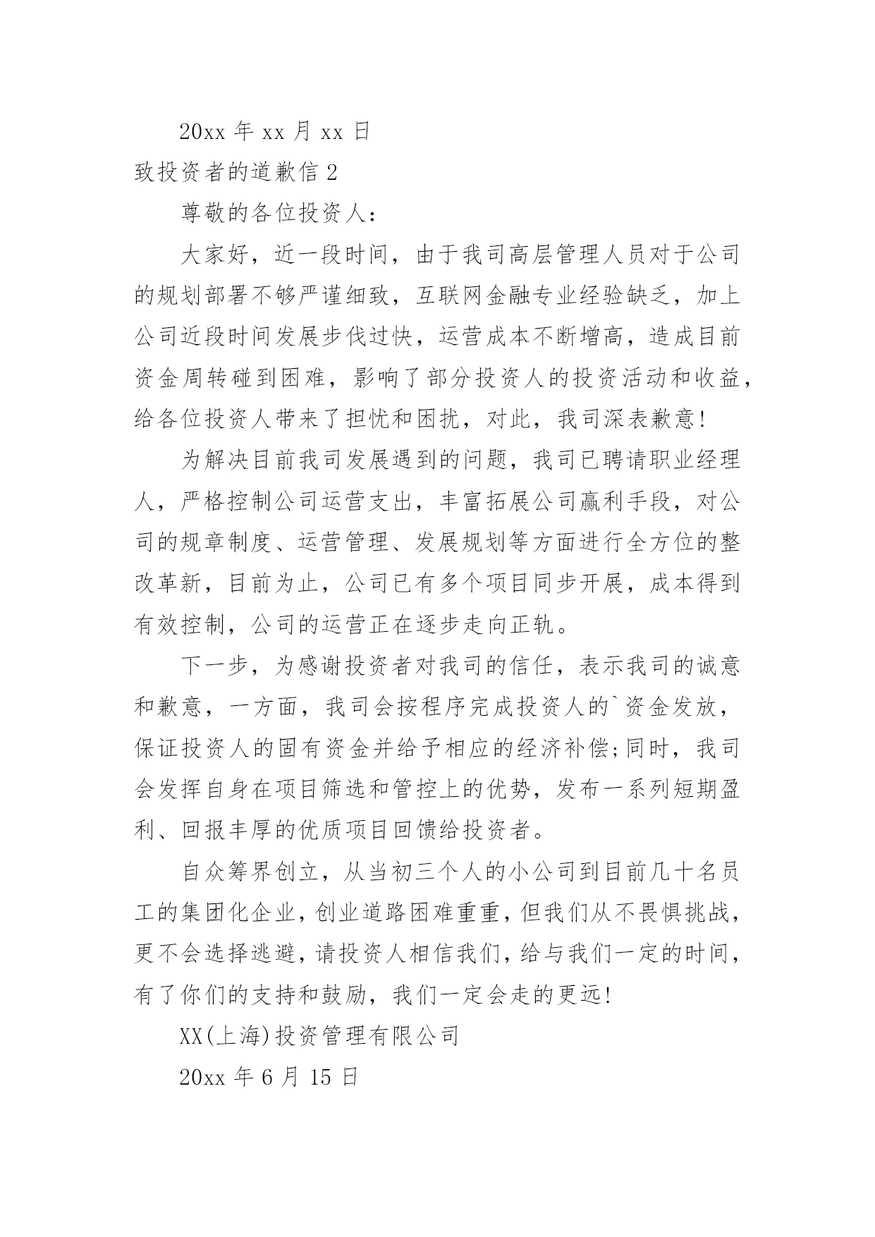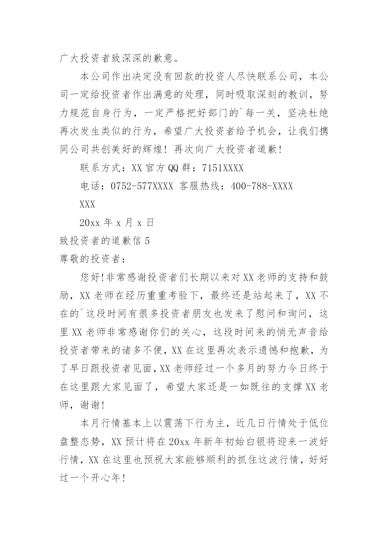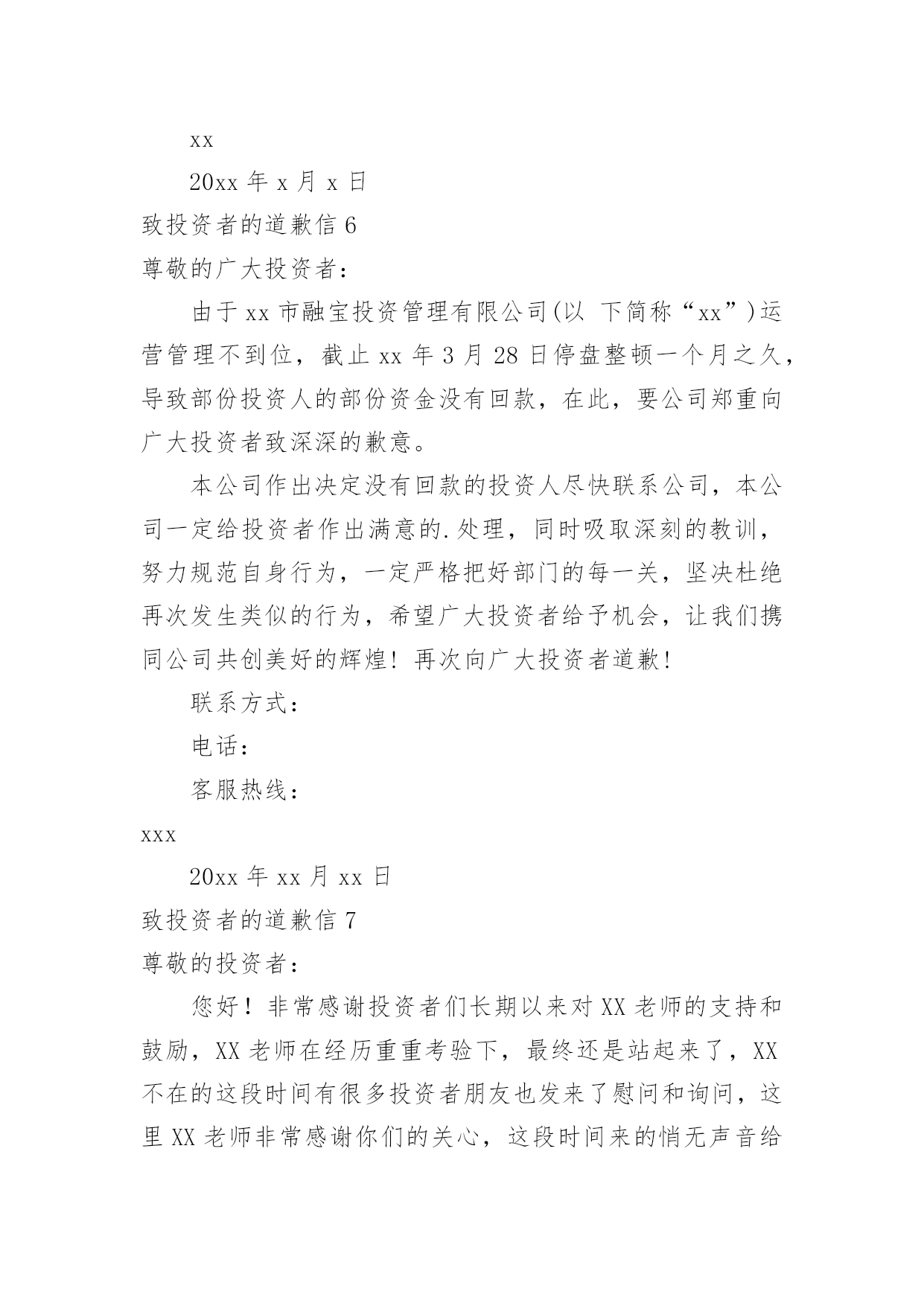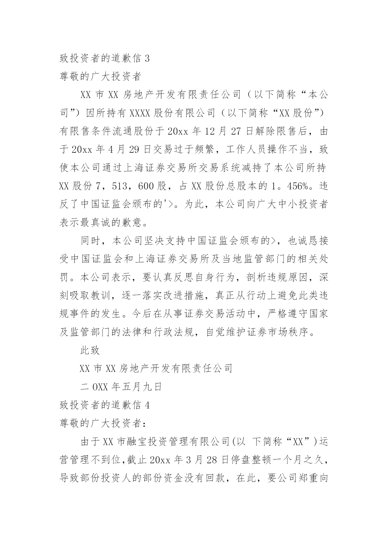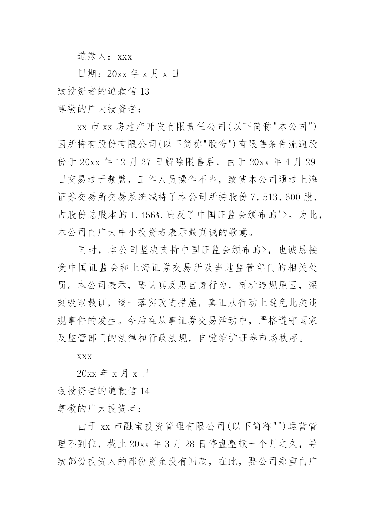 致投资者的道歉信致投资者的道歉信(15篇)在我们平凡的日常里,越来越多地方需要用到道歉信,道歉信可以帮助我们表示遗憾和歉意,表明愿意补救的愿望,提出建议或安排。那么,怎么去写道歉信呢?以下是小编整理的致投资者的道歉信,希望对大家有所帮助。致投资者的道歉信1尊敬的投资者:您好!非常感谢投资者们长期以来对XX老师的支持和鼓励,XX老师在经历重重考验下,最终还是站起来了,不在的这段时间有很多投资者朋友也发来了慰问和询问,这里XX老师非常感谢你们的关心,这段时间来的悄无声音给投资者带来的诸多不便,在这里再次表示遗憾和抱歉,为了早日跟投资者见面,XX老师经过一个多月的'努力今日终于在这里跟大家见面了,希望大家还是一如既往的支撑XX老师,谢谢!本月行情基本上以震荡下行为主,近几日行情处于低位盘整态势,预计将在20xx年新年初始白银将迎来一波好行情,在这里也预祝大家能够顺利的抓住这波行情,好好过一个开心年!xxx20xx年xx月xx日致投资者的道歉信2尊敬的各位投资人:大家好,近一段时间,由于我司高层管理人员对于公司的规划部署不够严谨细致,互联网金融专业经验缺乏,加上公司近段时间发展步伐过快,运营成本不断增高,造成目前资金周转碰到困难,影响了部分投资人的投资活动和收益,给各位投资人带来了担忧和困扰,对此,我司深表歉意!为解决目前我司发展遇到的问题,我司已聘请职业经理人,严格控制公司运营支出,丰富拓展公司赢利手段,对公司的规章制度、运营管理、发展规划等方面进行全方位的整改革新,目前为止,公司已有多个项目同步开展,成本得到有效控制,公司的运营正在逐步走向正轨。下一步,为感谢投资者对我司的信任,表示我司的诚意和歉意,一方面,我司会按程序完成投资人的`资金发放,保证投资人的固有资金并给予相应的经济补偿;同时,我司会发挥自身在项目筛选和管控上的优势,发布一系列短期盈利、回报丰厚的优质项目回馈给投资者。自众筹界创立,从当初三个人的小公司到目前几十名员工的集团化企业,创业道路困难重重,但我们从不畏惧挑战,更不会选择逃避,请投资人相信我们,给与我们一定的时间,有了你们的支持和鼓励,我们一定会走的更远!XX(上海)投资管理有限公司20xx年6月15日致投资者的道歉信3尊敬的广大投资者XX市XX房地产开发有限责任公司(以下简称“本公司”)因所持有XXXX股份有限公司(以下简称“XX股份”)有限售条件流通股份于20xx年12月27日解除限售后,由于20xx年4月29日交易过于频繁,工作人员操作不当,致使本公司通过上海证券交易所交易系统减持了本公司所持XX股份7,513,600股,占XX股份总股本的1。456%。违反了中国证监会颁布的'>。为此,本公司向广大中小投资者表示最真诚的歉意。同时,本公司坚决支持中国证监会颁布的>,也诚恳接受中国证监会和上海证券交易所及当地监管部门的相关处罚。本公司表示,要认真反思自身行为,剖析违规原因,深刻吸取教训,逐一落实改进措施,真正从行动上避免此类违规事件的发生。今后在从事证券交易活动中,严格遵守国家及监管部门的法律和行政法规,自觉维护证券市场秩序。此致XX市XX房地产开发有限责任公司二OXX年五月九日致投资者的道歉信4尊敬的广大投资者:由于XX市融宝投资管理有限公司(以下简称“XX”)运营管理不到位,截止20xx年3月28日停盘整顿一个月之久,导致部份投资人的部份资金没有回款,在此,要公司郑重向广大投资者致深深的歉意。本公司作出决定没有回款的投资人尽快联系公司,本公司一定给投资者作出满意的处理,同时吸取深刻的教训,努力规范自身行为,一定严格把好部门的`每一关,坚决杜绝再次发生类似的行为,希望广大投资者给予机会,让我们携同公司共创美好的辉煌!再次向广大投资者道歉!联系方式:XX官方QQ群:7151XXXX电话:0752-577XXXX客服热线:400-788-XXXXXXX20xx年x月x日致投资者的道歉信5尊敬的投资者:您好!非常感谢投资者们长期以来对XX老师的支持和鼓励,XX老师在经历重重考验下,最终还是站起来了,XX不在的`这段时间有很多投资者朋友也发来了慰问和询问,这里XX老师非常感谢你们的关心,这段时间来的悄无声音给投资者带来的诸多不便,XX在这里再次表示遗憾和抱歉,为了早日跟投资者见面,XX老师经过一个多月的努力今日终于在这里跟大家见面了,希望大家还是一如既往的支撑XX老师,谢谢!本月行情基本上以震荡下行为主,近几日行情处于低位盘整态势,XX预计将在20xx年新年初始白银将迎来一波好行情,XX在这里也预祝大家能够顺利的抓住这波行情,好好过一个开心年!xx20xx年x月x日致投资者的道歉信6尊敬的广大投资者:由于xx市融宝投资管理有限公司(以下简称“xx”)运营管理不到位,截止xx年3月28日停盘整顿一个月之久,导致