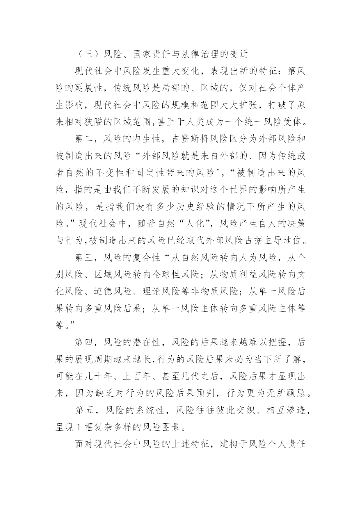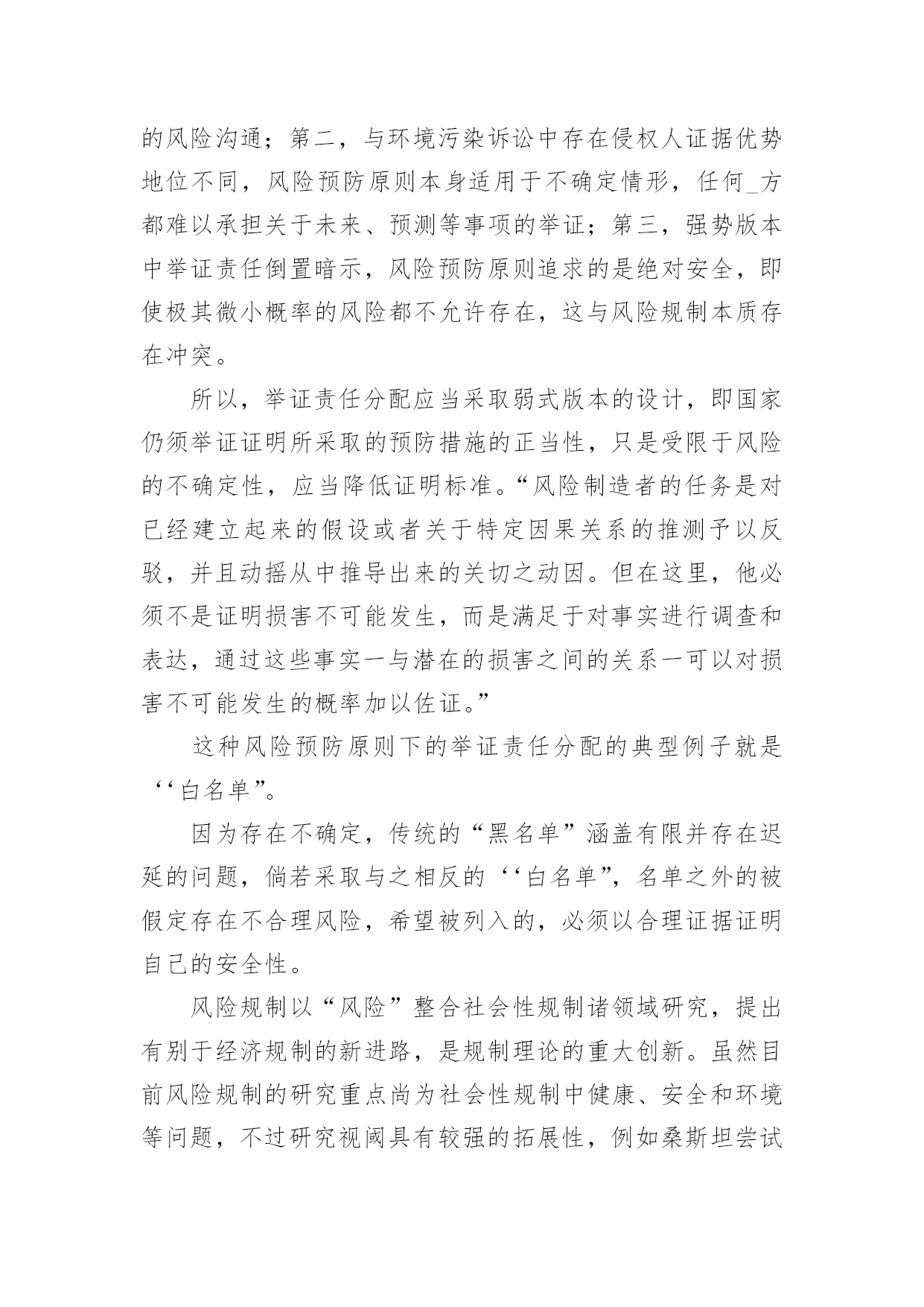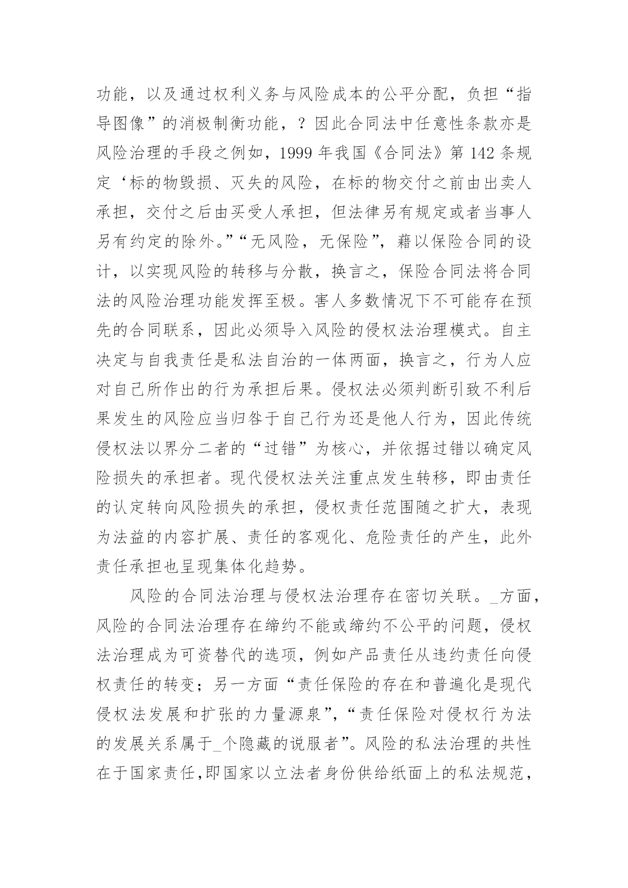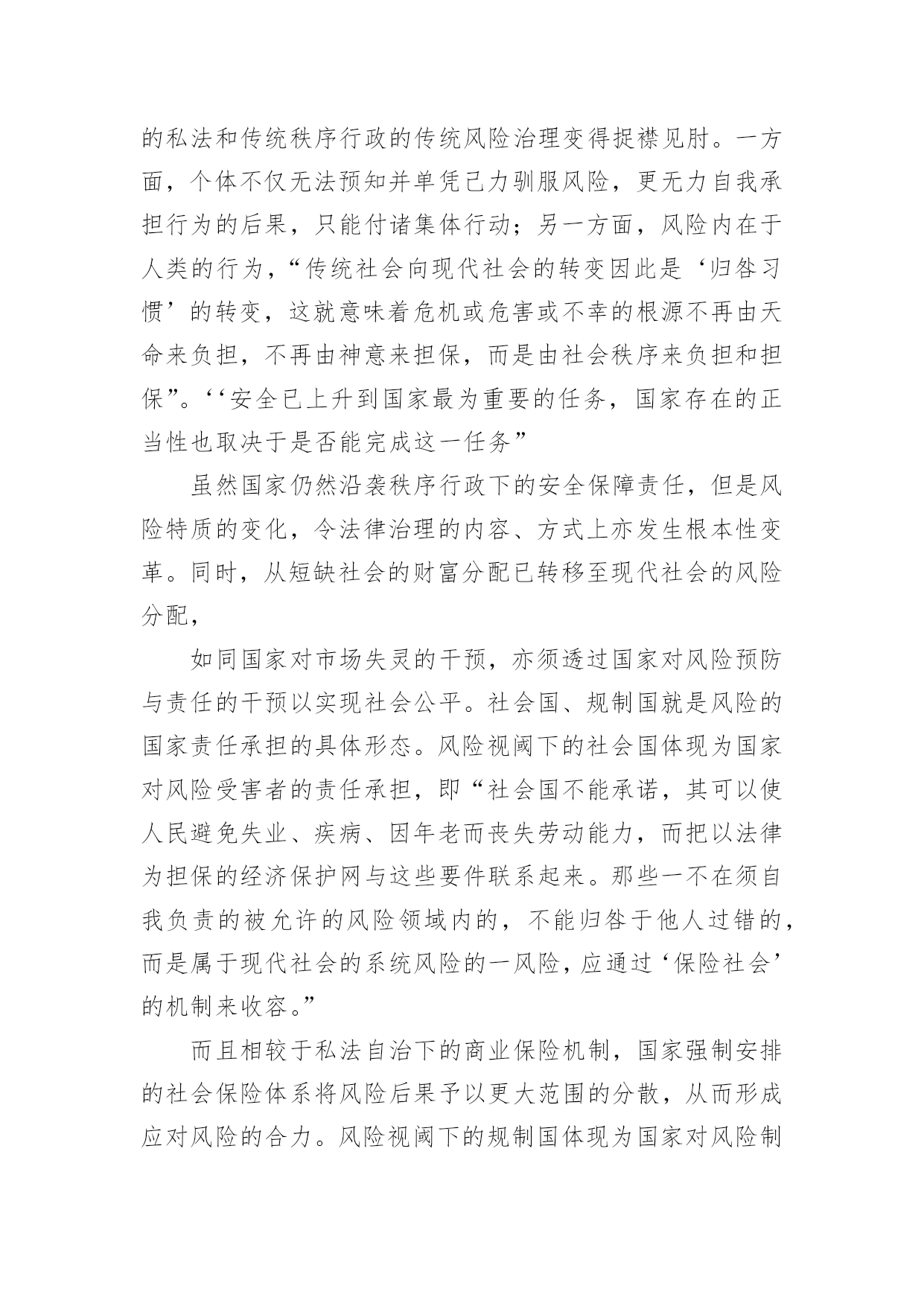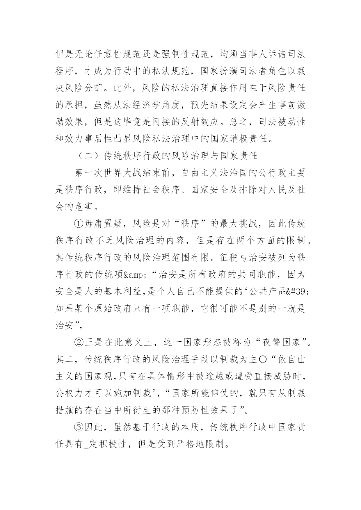 论经济法的风险规制范式论文―、风险的法律治理与国家责任人生而自由,无往不在风险之中。风险作为法律治理的对象既无处不在又无时不在,但是在不同法域视阈与时空中转变,法律对风险议题的审视角度、关注程度、治理方式亦大不相同,并意蕴着国家对风险责任承担的差异性。(―)风险的私法治理与国家消极责任风险的私法治理主要为合同法和侵权法两种模式。私法的基石是私法自治,“它的经济意义可以上溯亚当史密斯的国富论,伦理内涵则又源于康德理性哲学中的自由意志。私法自治使私人成为法律关系的主要形成者,正如法律关系所要创造和维系的经济关系。”“私法自治之意义,在于法律给个人提供一种法律上的权力手段,并以此实现个人的意思。这即是说,私法自治给个人提供一种受法律保护的自由,使个人获得自主决定(Sellbstbestimmung)的可能性”。私法自治中的自主决定应包括对自身遭遇风险的处分,例如风险自担或以约定方式转让风险。但是,私法自治的理论预设是人的完全理性,即人具有相关风险的知识和能力,能够收集、掌握必要的风险信息,对各种备选方案予以比较、衡量,作出符合自身偏好的选择,甚至与他人达成安排风险的协议。但是,人既不可能预见_切风险,亦不能透过条款将未来的风险予以巨细靡遗地规定。合同法中任意性条款具有节约交易成本、提高裁判的可预见性及提供交易的选择等积极辅助功能,以及通过权利义务与风险成本的公平分配,负担“指导图像”的消极制衡功能,?因此合同法中任意性条款亦是风险治理的手段之例如,1999年我国《合同法》第142条规定‘标的物毁损、灭失的风险,在标的物交付之前由出卖人承担,交付之后由买受人承担,但法律另有规定或者当事人另有约定的除外。”“无风险,无保险”,藉以保险合同的设计,以实现风险的转移与分散,换言之,保险合同法将合同法的风险治理功能发挥至极。害人多数情况下不可能存在预先的合同联系,因此必须导入风险的侵权法治理模式。自主决定与自我责任是私法自治的一体两面,换言之,行为人应对自己所作出的行为承担后果。侵权法必须判断引致不利后果发生的风险应当归咎于自己行为还是他人行为,因此传统侵权法以界分二者的“过错”为核心,并依据过错以确定风险损失的承担者。现代侵权法关注重点发生转移,即由责任的认定转向风险损失的承担,侵权责任范围随之扩大,表现为法益的内容扩展、责任的客观化、危险责任的产生,此外责任承担也呈现集体化趋势。风险的合同法治理与侵权法治理存在密切关联。_方面,风险的合同法治理存在缔约不能或缔约不公平的问题,侵权法治理成为可资替代的选项,例如产品责任从违约责任向侵权责任的转变;另一方面“责任保险的存在和普遍化是现代侵权法发展和扩张的力量源泉”,“责任保险对侵权行为法的发展关系属于_个隐藏的说服者”。风险的私法治理的共性在于国家责任,即国家以立法者身份供给纸面上的私法规范,但是无论任意性规范还是强制性规范,均须当事人诉诸司法程序,才成为行动中的私法规范,国家扮演司法者角色以裁决风险分配。此外,风险的私法治理直接作用在于风险责任的承担,虽然从法经济学角度,预先结果设定会产生事前激励效果,但是这毕竟是间接的反射效应。总之,司法被动性和效力事后性凸显风险私法治理中的国家消极责任。(二)传统秩序行政的风险治理与国家责任第一次世界大战结束前,自由主义法治国的公行政主要是秩序行政,即维持社会秩序、国家安全及排除对人民及社会的危害。①毋庸置疑,风险是对“秩序”的最大挑战,因此传统秩序行政不乏风险治理的内容,但是存在两个方面的限制。其传统秩序行政的风险治理范围有限。征税与治安被列为秩序行政的传统项&“治安是所有政府的共同职能,因为安全是人的基本利益,是个人自己不能提供的‘公共产品'如果某个原始政府只有一项职能,它很可能不是别的一就是治安”,②正是在此意义上,这一国家形态被称为“夜警国家”。其二,传统秩序行政的风险治理手段以制裁为主〇“依自由主义的国家观,只有在具体情形中被逾越或遭受直接威胁时,公权力才可以施加制裁’,“国家所能仰仗的,就只有从制裁措施的存在当中所衍生的那种预防性效果了”。③因此,虽然基于行政的本质,传统秩序行政中国家责任具有_定积极性,但是受到严格地限制。(三)风险、国家责任与法律治理的变迁现代社会中风险发生重大变化,表现出新的特征:第风险的延展性,传统风险是局部的、区域的,仅对社会个体产生影响,现代社会中风险的规模和范围大大扩张,打破了原来相对狭隘的区域范围,甚至于人类成为一个统一风险受体。第二,风险的内生性,吉登斯将风险区分为外部风险和被制造出来的风险“外部风险就是来自外部的、因为传统或者自然的不变性和固定性带来的风险’,“被制造出来的风险,指的是由我们不断发展的知识对这个世界的影响所产生的风险,是指我们没有多少历史经验的情况下所产生的风险。”现代社