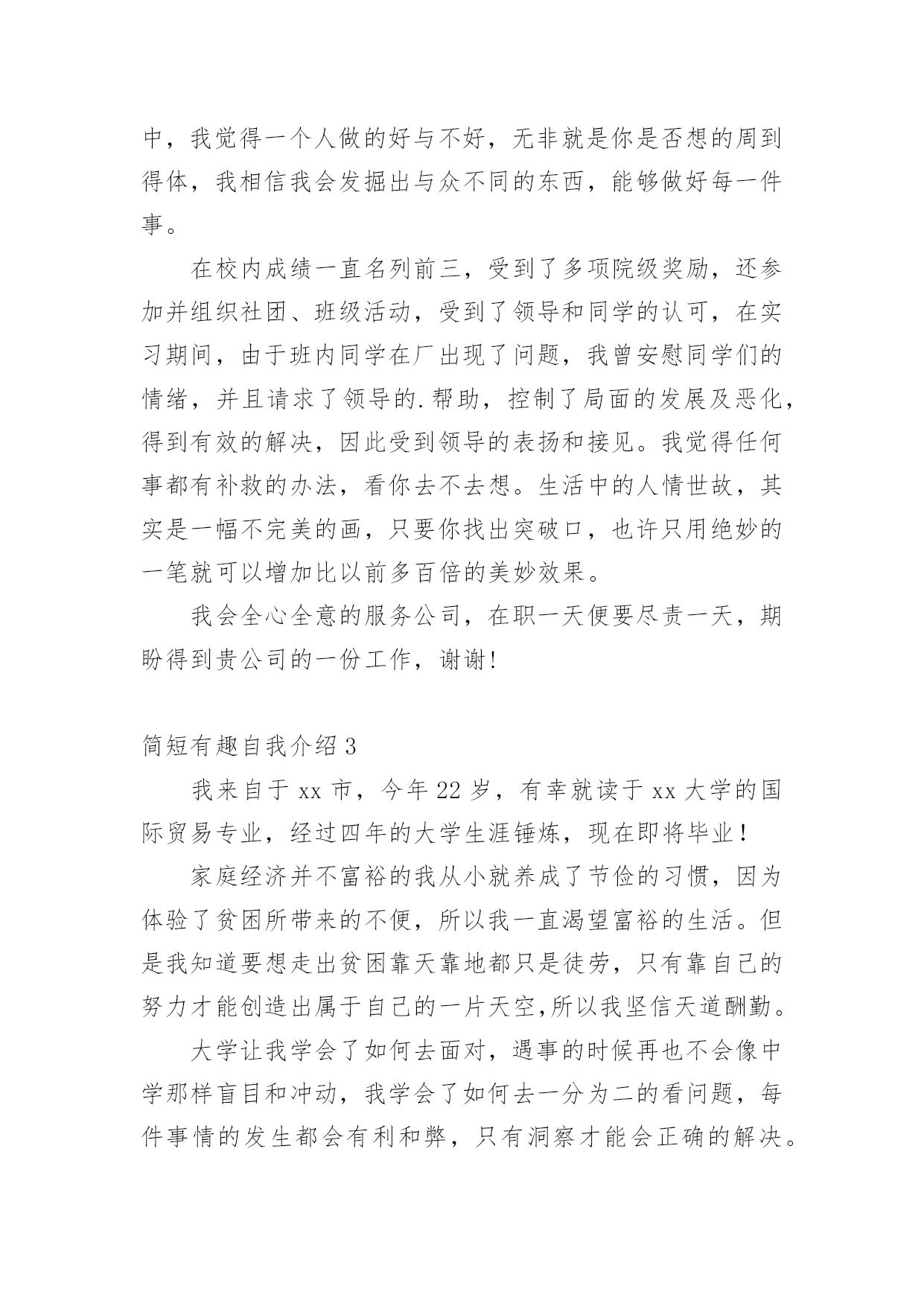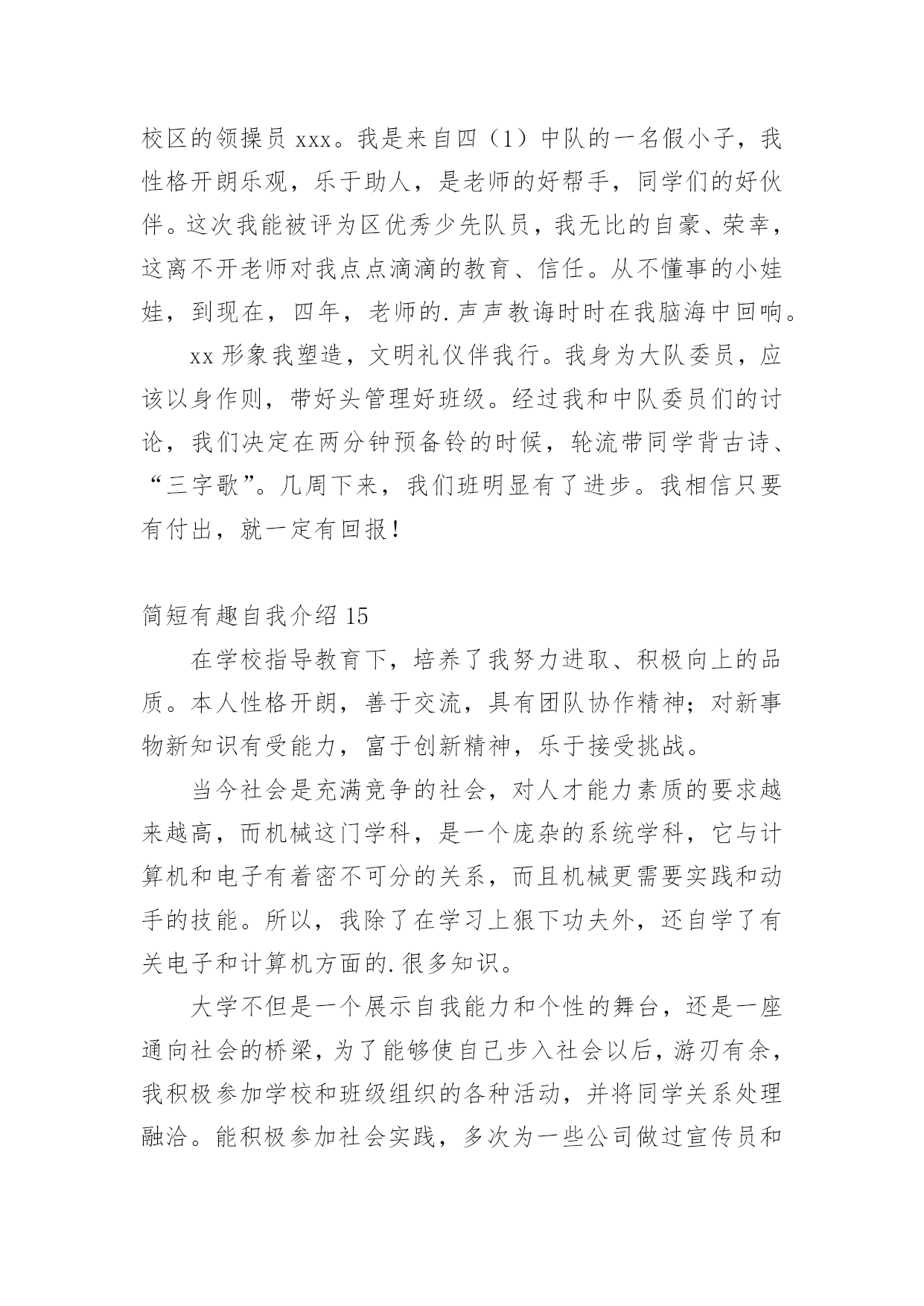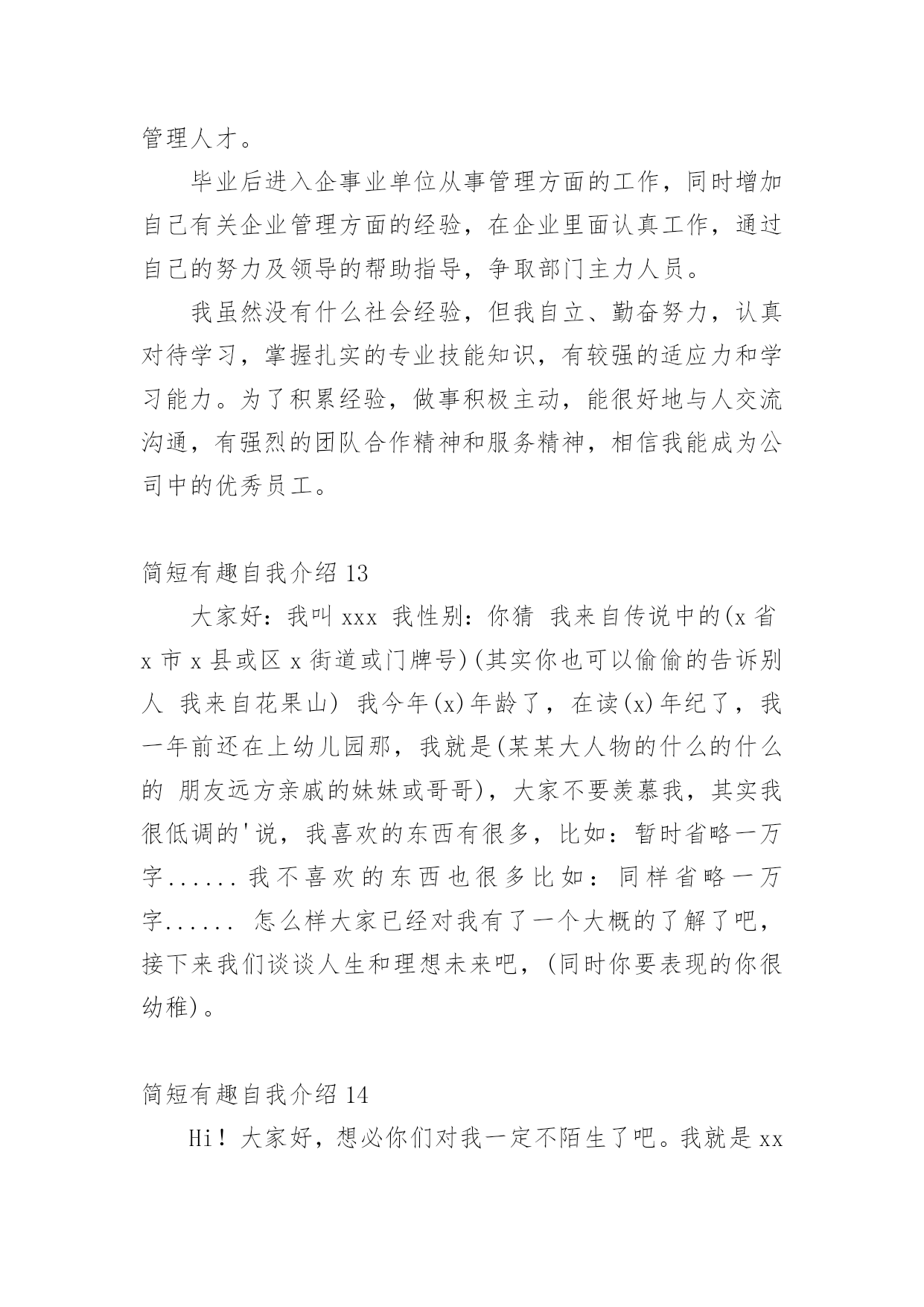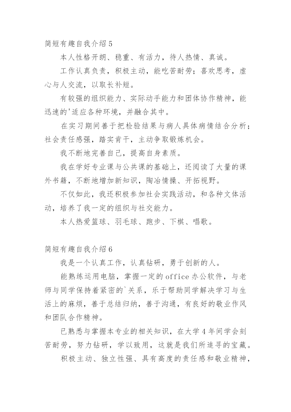 简短有趣自我介绍当来到一个新环境中,我们时常会需要作自我介绍,通过自我介绍可以得到他人的认可。相信大家又在为写自我介绍犯愁了吧!下面是小编为大家收集的简短有趣自我介绍,欢迎大家借鉴与参考,希望对大家有所帮助。简短有趣自我介绍1大家好,秋天来了,我也来了,我叫XX,很高兴能站在这里跟大家做个自我介绍;我很喜欢笑,妈说我出生的时候是笑着生出来的。为这事中科院的'找我好几回,非要给我做个全面检查。我没同意,我说除非你们的人当中有谁比我的眼睫毛张得好看,嘿嘿,大家注意到没有。我的眼睫毛很好看哦,不信?LOOK!如果现在你看不清楚,没有关系,下课了找我啊,我很愿意交朋友,因为我十分开朗,交到我这个朋友,免费让你看个够,赶快行动吧!谢谢!简短有趣自我介绍2我叫xxx,是xx学院机电工程系xx级数控技术x班的一名应届毕业生。我性格内外向,平时喜欢临摹一些风景和人物画,用CAD或PROE画一些生活中的物品,用PHOTOSHOP处理图像的效果,还喜欢看一些哲学性很强的故事类文章,在学习及生活中,我觉得一个人做的好与不好,无非就是你是否想的周到得体,我相信我会发掘出与众不同的东西,能够做好每一件事。在校内成绩一直名列前三,受到了多项院级奖励,还参加并组织社团、班级活动,受到了领导和同学的认可,在实习期间,由于班内同学在厂出现了问题,我曾安慰同学们的情绪,并且请求了领导的.帮助,控制了局面的发展及恶化,得到有效的解决,因此受到领导的表扬和接见。我觉得任何事都有补救的办法,看你去不去想。生活中的人情世故,其实是一幅不完美的画,只要你找出突破口,也许只用绝妙的一笔就可以增加比以前多百倍的美妙效果。我会全心全意的服务公司,在职一天便要尽责一天,期盼得到贵公司的一份工作,谢谢!简短有趣自我介绍3我来自于xx市,今年22岁,有幸就读于xx大学的国际贸易专业,经过四年的大学生涯锤炼,现在即将毕业!家庭经济并不富裕的我从小就养成了节俭的习惯,因为体验了贫困所带来的不便,所以我一直渴望富裕的生活。但是我知道要想走出贫困靠天靠地都只是徒劳,只有靠自己的努力才能创造出属于自己的一片天空,所以我坚信天道酬勤。大学让我学会了如何去面对,遇事的时候再也不会像中学那样盲目和冲动,我学会了如何去一分为二的看问题,每件事情的发生都会有利和弊,只有洞察才能会正确的解决。大学教育了我,也锻炼了我,它让我变得成熟,变的理智,教会了我如何去运筹帷幄。毕业在即,我也开始寻找适合自己的工作,在我看来工作不是为别人,而是为了自己,只有兢兢业业踏踏实实的干才能充分显示出自己的价值,才能回报社会。出自农村的`我不怕吃苦不怕累,因为我相信付出终会有回报。在以后的人生道路上我会一如既往的坚定自己的信念,不会放弃,做一个真真正正的自己。相信自己就是成功的开始,我想我一定会成为一个全新的我,也继续认真、踏实的走我自己的人生之路。简短有趣自我介绍4大家好:我叫xxx,你猜我来自传说中的(x省x市x县或区x街道或门牌号)(其实你也可以偷偷的告诉别人我来自花果山)。我今年xx年龄了,在读x年纪了,我一年前还在上幼儿园那,我就是(某某大人物的什么的什么的朋友远方亲戚的'妹妹或哥哥),大家不要羡慕我,其实我很低调的说,我喜欢的东西有很多,比如:暂时省略一万字。我不喜欢的东西也很多比如:同样省略一万字。怎么样大家已经对我有了一个大概的了解了吧,接下来我们谈谈人生和理想未来吧。(同时你要表现的你很幼稚)简短有趣自我介绍5本人性格开朗、稳重、有活力,待人热情、真诚。工作认真负责,积极主动,能吃苦耐劳;喜欢思考,虚心与人交流,以取长补短。有较强的组织能力、实际动手能力和团体协作精神,能迅速的'适应各种环境,并融合其中。在实习期间善于把检验结果与病人具体病情结合分析;社会责任感强,踏实肯干,主动争取锻炼机会。我不断地完善自己,提高自身素质。我在学好专业课与公共课的基础上,还阅读了大量的课外书籍,不断地增加新知识,陶冶情操、开拓视野。不仅如此,我还积极参加社会实践活动,和各种文体活动,培养了我一定的组织与社交能力。本人热爱篮球、羽毛球、跑步、下棋、唱歌。简短有趣自我介绍6我是一个认真工作,认真钻研,勇于创新的人。能熟练运用电脑,掌握一定的office办公软件,与老师与同学保持着紧密的`关系,乐于帮助同学解决学习与生活上的麻烦,善于总结归纳,善于沟通,有良好的敬业作风和团队合作精神。已熟悉与掌握本专业的相关知识,在大学4年间学会刻苦耐劳,努力钻研,学以致用,这就是我们所追寻的宝藏。积极主动、独立性强、具有高度的责任感和敬业精神,待人真诚、诚实守信、团结协作意识强,能够吃苦耐劳,勇于挑战新事物,具有一定的开拓创新能力,“踏实做事,诚实做人”是我为人处世的原则。简短有趣自我介绍7尊敬的领导:您好!我叫xxx,毕业于xx校园,xx