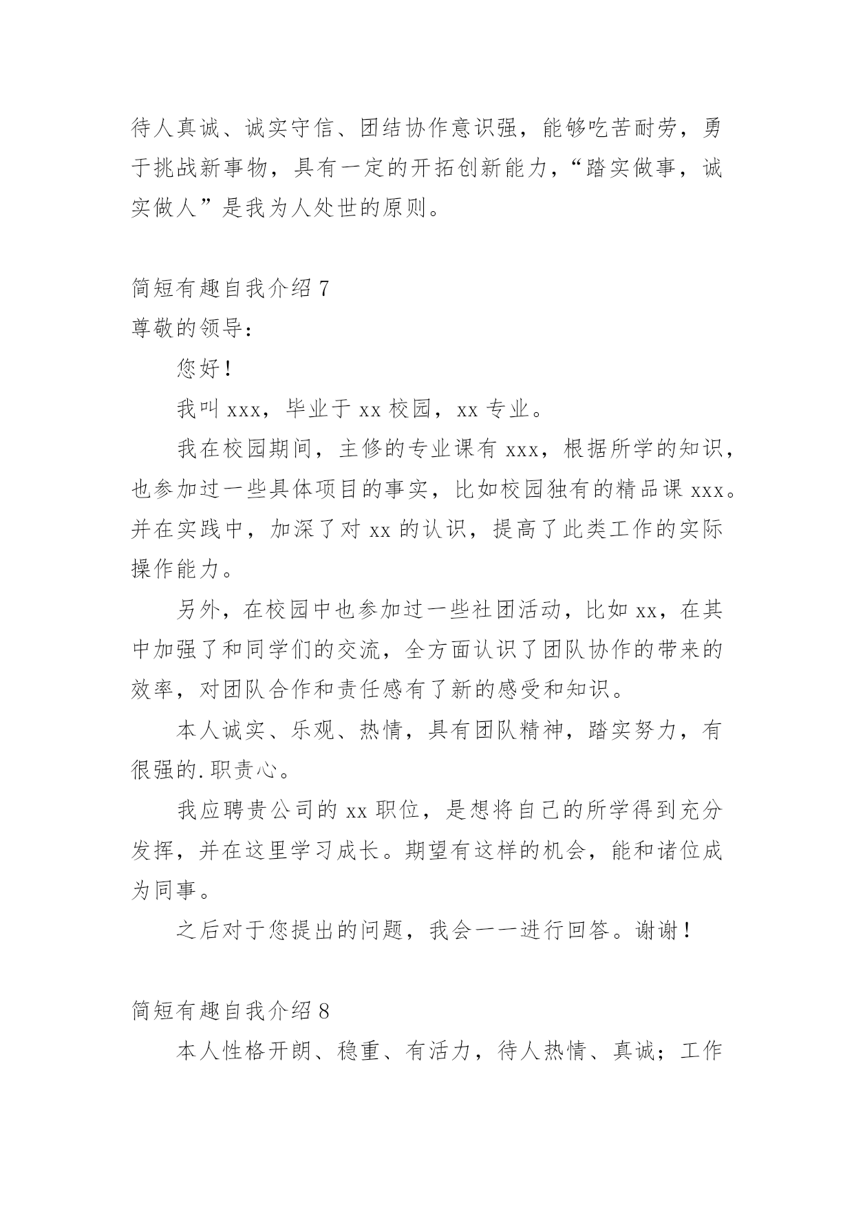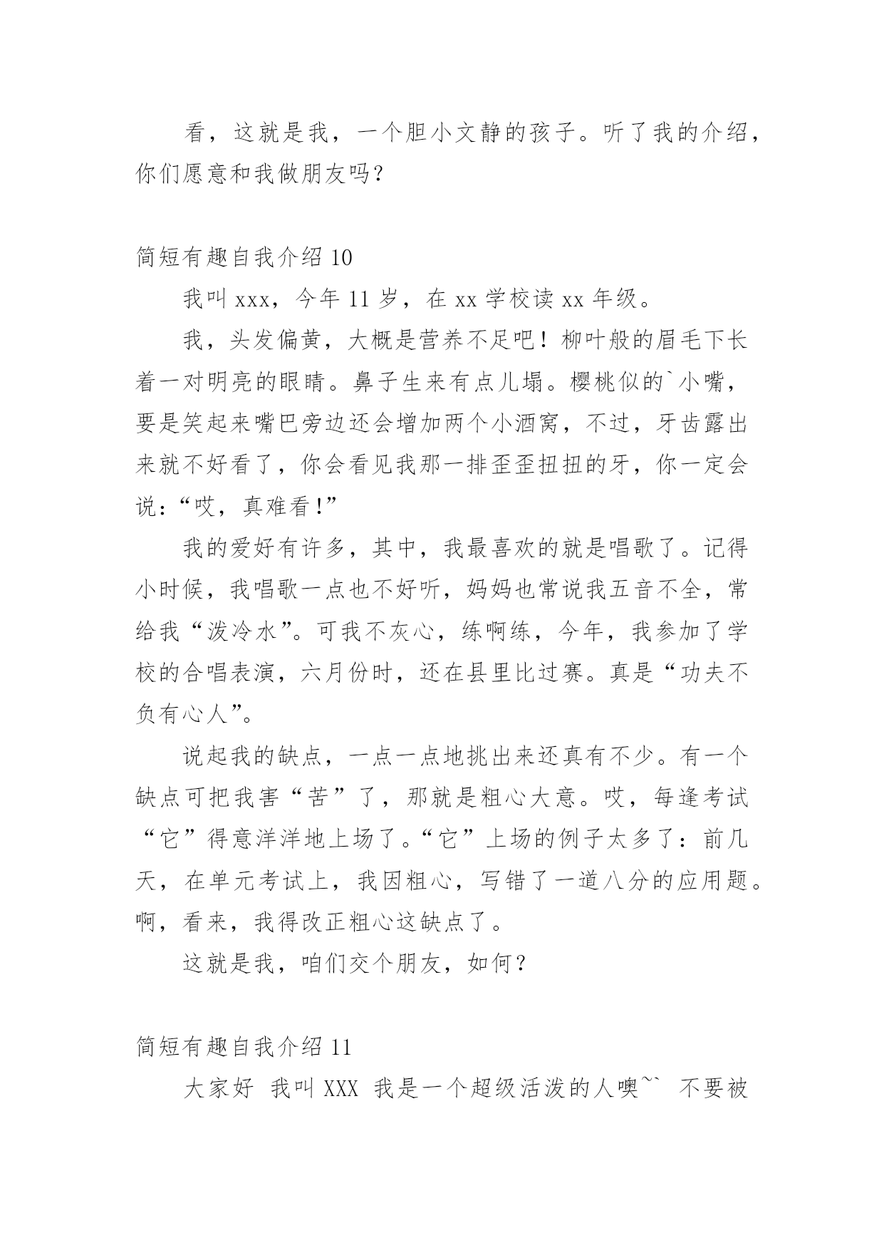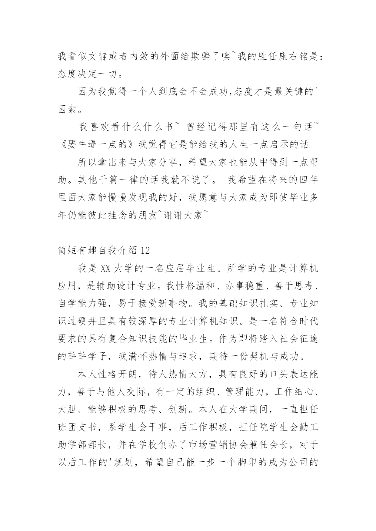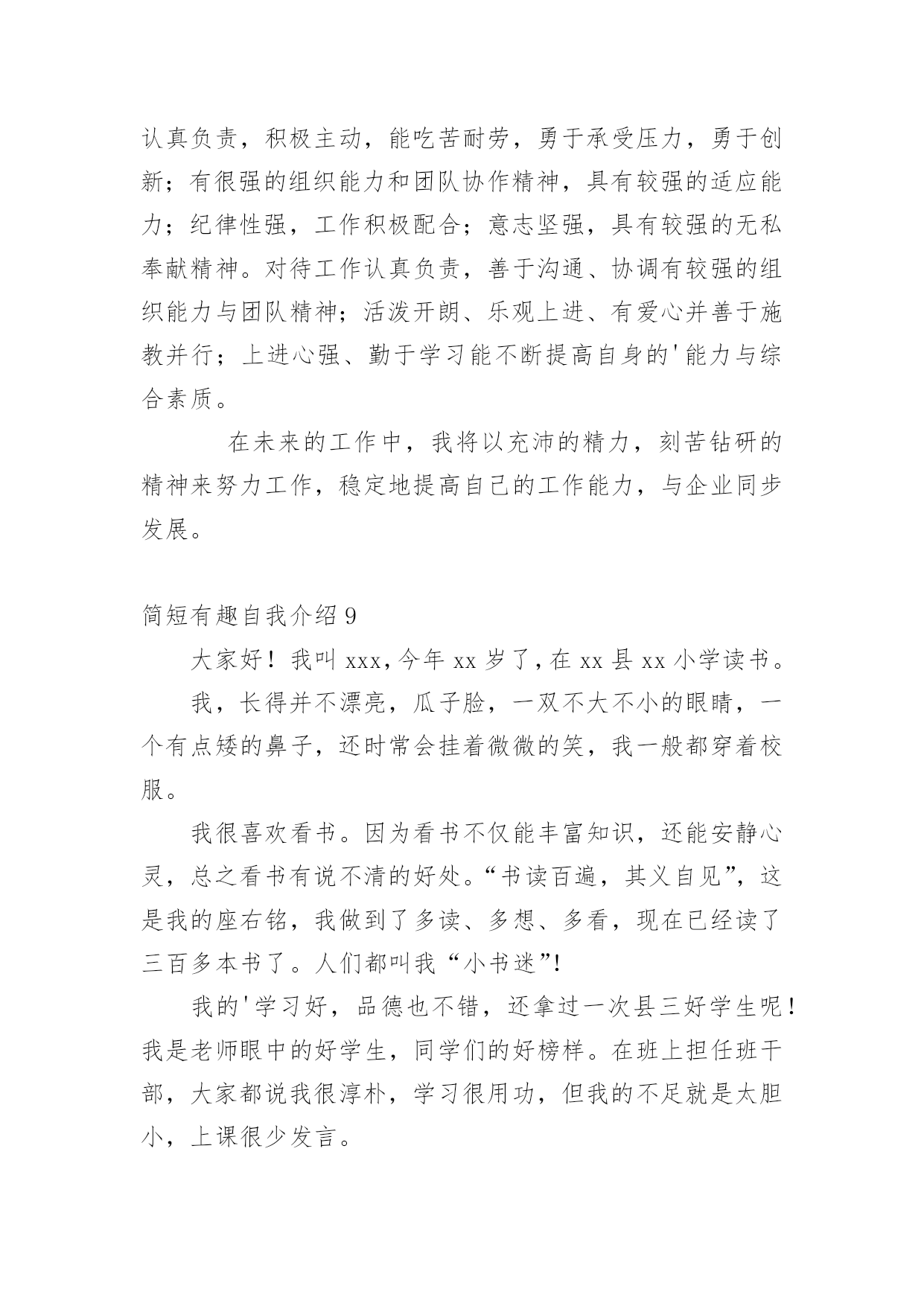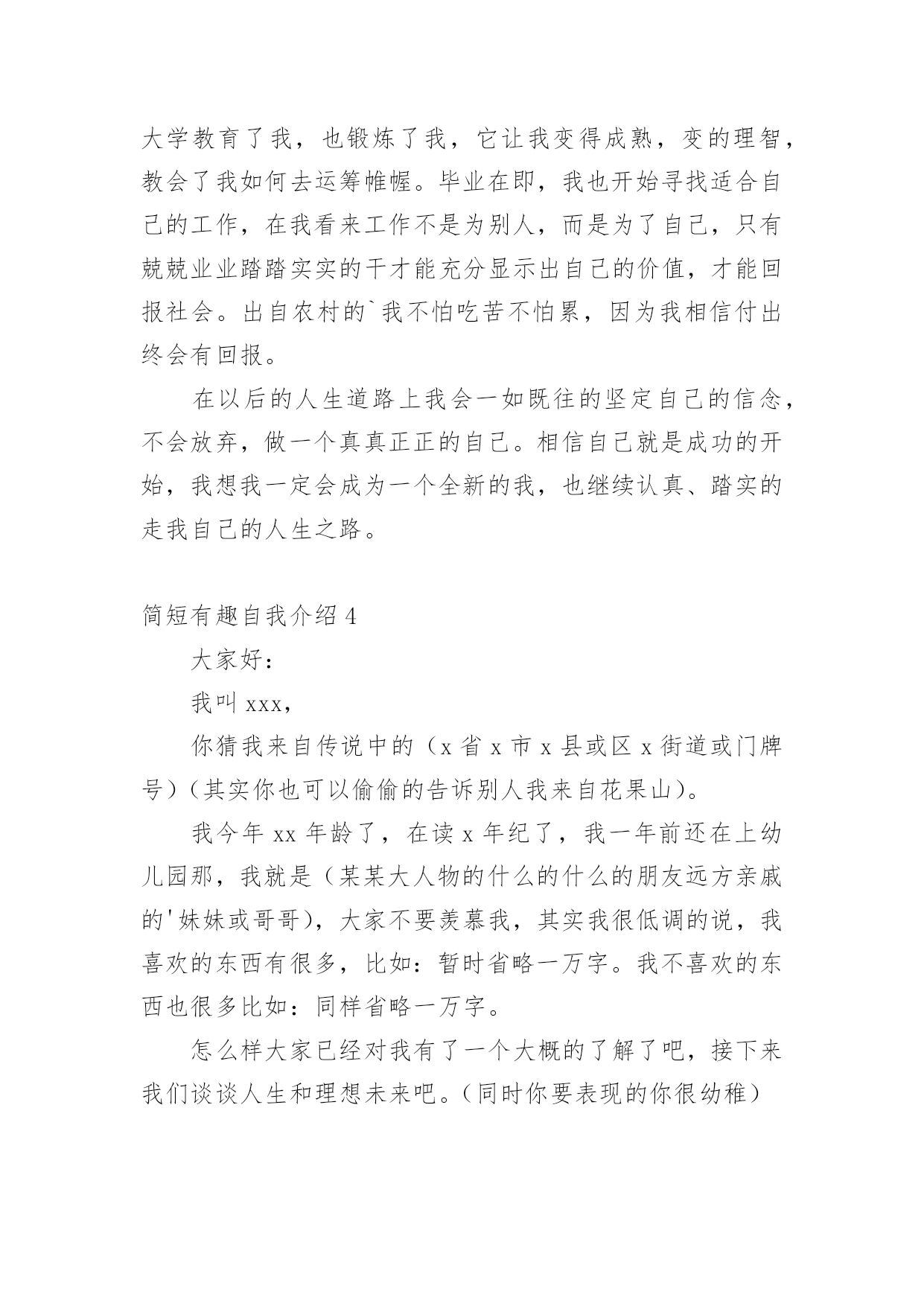 简短有趣自我介绍当来到一个新环境中,我们时常会需要作自我介绍,通过自我介绍可以得到他人的认可。相信大家又在为写自我介绍犯愁了吧!下面是小编为大家收集的简短有趣自我介绍,欢迎大家借鉴与参考,希望对大家有所帮助。简短有趣自我介绍1大家好,秋天来了,我也来了,我叫XX,很高兴能站在这里跟大家做个自我介绍;我很喜欢笑,妈说我出生的时候是笑着生出来的。为这事中科院的'找我好几回,非要给我做个全面检查。我没同意,我说除非你们的人当中有谁比我的眼睫毛张得好看,嘿嘿,大家注意到没有。我的眼睫毛很好看哦,不信?LOOK!如果现在你看不清楚,没有关系,下课了找我啊,我很愿意交朋友,因为我十分开朗,交到我这个朋友,免费让你看个够,赶快行动吧!谢谢!简短有趣自我介绍2我叫xxx,是xx学院机电工程系xx级数控技术x班的一名应届毕业生。我性格内外向,平时喜欢临摹一些风景和人物画,用CAD或PROE画一些生活中的物品,用PHOTOSHOP处理图像的效果,还喜欢看一些哲学性很强的故事类文章,在学习及生活中,我觉得一个人做的好与不好,无非就是你是否想的周到得体,我相信我会发掘出与众不同的东西,能够做好每一件事。在校内成绩一直名列前三,受到了多项院级奖励,还参加并组织社团、班级活动,受到了领导和同学的认可,在实习期间,由于班内同学在厂出现了问题,我曾安慰同学们的情绪,并且请求了领导的.帮助,控制了局面的发展及恶化,得到有效的解决,因此受到领导的表扬和接见。我觉得任何事都有补救的办法,看你去不去想。生活中的人情世故,其实是一幅不完美的画,只要你找出突破口,也许只用绝妙的一笔就可以增加比以前多百倍的美妙效果。我会全心全意的服务公司,在职一天便要尽责一天,期盼得到贵公司的一份工作,谢谢!简短有趣自我介绍3我来自于xx市,今年22岁,有幸就读于xx大学的国际贸易专业,经过四年的大学生涯锤炼,现在即将毕业!家庭经济并不富裕的我从小就养成了节俭的习惯,因为体验了贫困所带来的不便,所以我一直渴望富裕的生活。但是我知道要想走出贫困靠天靠地都只是徒劳,只有靠自己的努力才能创造出属于自己的一片天空,所以我坚信天道酬勤。大学让我学会了如何去面对,遇事的时候再也不会像中学那样盲目和冲动,我学会了如何去一分为二的看问题,每件事情的发生都会有利和弊,只有洞察才能会正确的解决。大学教育了我,也锻炼了我,它让我变得成熟,变的理智,教会了我如何去运筹帷幄。毕业在即,我也开始寻找适合自己的工作,在我看来工作不是为别人,而是为了自己,只有兢兢业业踏踏实实的干才能充分显示出自己的价值,才能回报社会。出自农村的`我不怕吃苦不怕累,因为我相信付出终会有回报。在以后的人生道路上我会一如既往的坚定自己的信念,不会放弃,做一个真真正正的自己。相信自己就是成功的开始,我想我一定会成为一个全新的我,也继续认真、踏实的走我自己的人生之路。简短有趣自我介绍4大家好:我叫xxx,你猜我来自传说中的(x省x市x县或区x街道或门牌号)(其实你也可以偷偷的告诉别人我来自花果山)。我今年xx年龄了,在读x年纪了,我一年前还在上幼儿园那,我就是(某某大人物的什么的什么的朋友远方亲戚的'妹妹或哥哥),大家不要羡慕我,其实我很低调的说,我喜欢的东西有很多,比如:暂时省略一万字。我不喜欢的东西也很多比如:同样省略一万字。怎么样大家已经对我有了一个大概的了解了吧,接下来我们谈谈人生和理想未来吧。(同时你要表现的你很幼稚)简短有趣自我介绍5本人性格开朗、稳重、有活力,待人热情、真诚。工作认真负责,积极主动,能吃苦耐劳;喜欢思考,虚心与人交流,以取长补短。有较强的组织能力、实际动手能力和团体协作精神,能迅速的'适应各种环境,并融合其中。在实习期间善于把检验结果与病人具体病情结合分析;社会责任感强,踏实肯干,主动争取锻炼机会。我不断地完善自己,提高自身素质。我在学好专业课与公共课的基础上,还阅读了大量的课外书籍,不断地增加新知识,陶冶情操、开拓视野。不仅如此,我还积极参加社会实践活动,和各种文体活动,培养了我一定的组织与社交能力。本人热爱篮球、羽毛球、跑步、下棋、唱歌。简短有趣自我介绍6我是一个认真工作,认真钻研,勇于创新的人。能熟练运用电脑,掌握一定的office办公软件,与老师与同学保持着紧密的`关系,乐于帮助同学解决学习与生活上的麻烦,善于总结归纳,善于沟通,有良好的敬业作风和团队合作精神。已熟悉与掌握本专业的相关知识,在大学4年间学会刻苦耐劳,努力钻研,学以致用,这就是我们所追寻的宝藏。积极主动、独立性强、具有高度的责任感和敬业精神,待人真诚、诚实守信、团结协作意识强,能够吃苦耐劳,勇于挑战新事物,具有一定的开拓创新能力,“踏实做事,诚实做人”是我为人处世的原则。简短有趣自我介绍7尊敬的领导:您好!我叫xxx,毕业于xx校园,xx