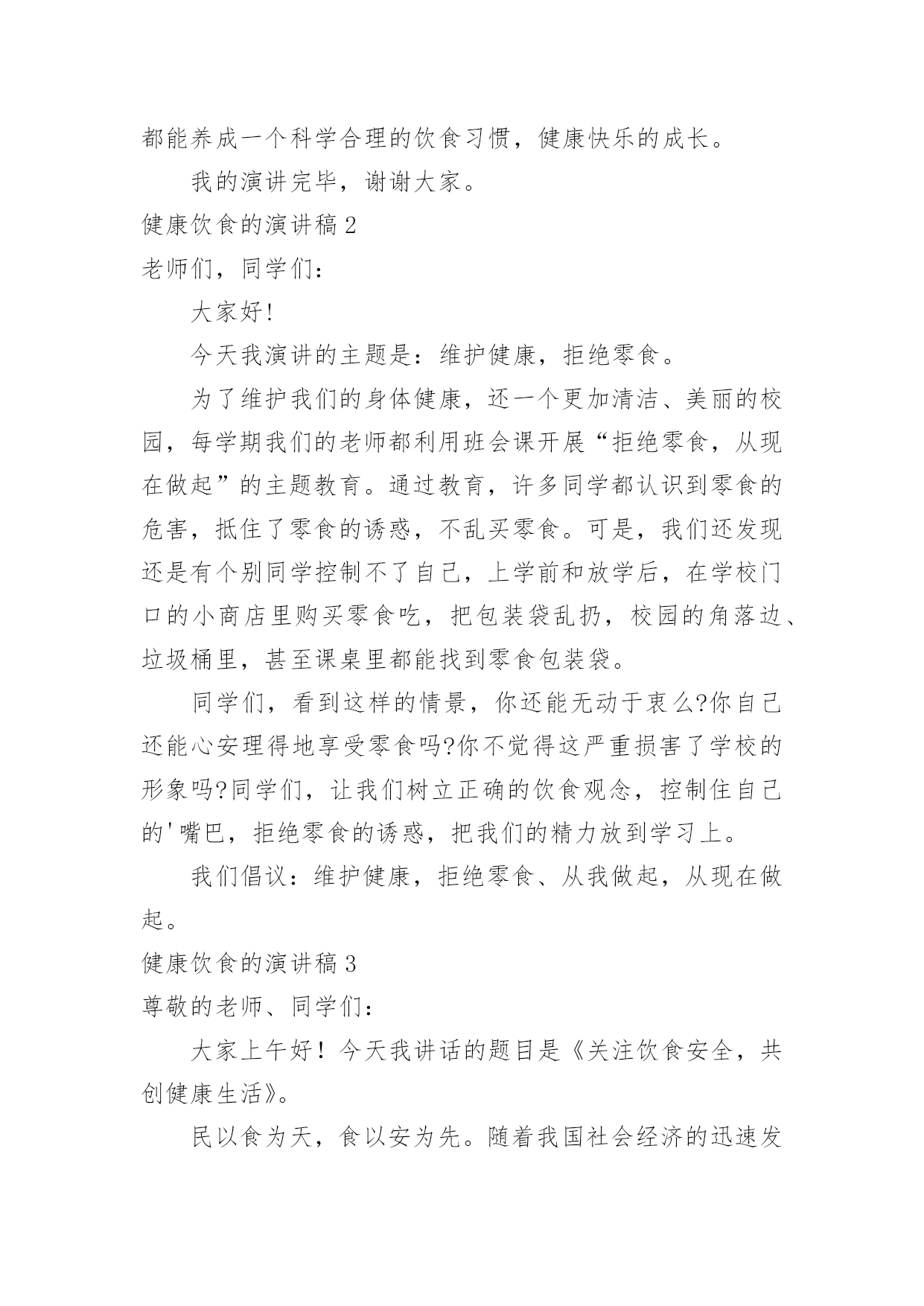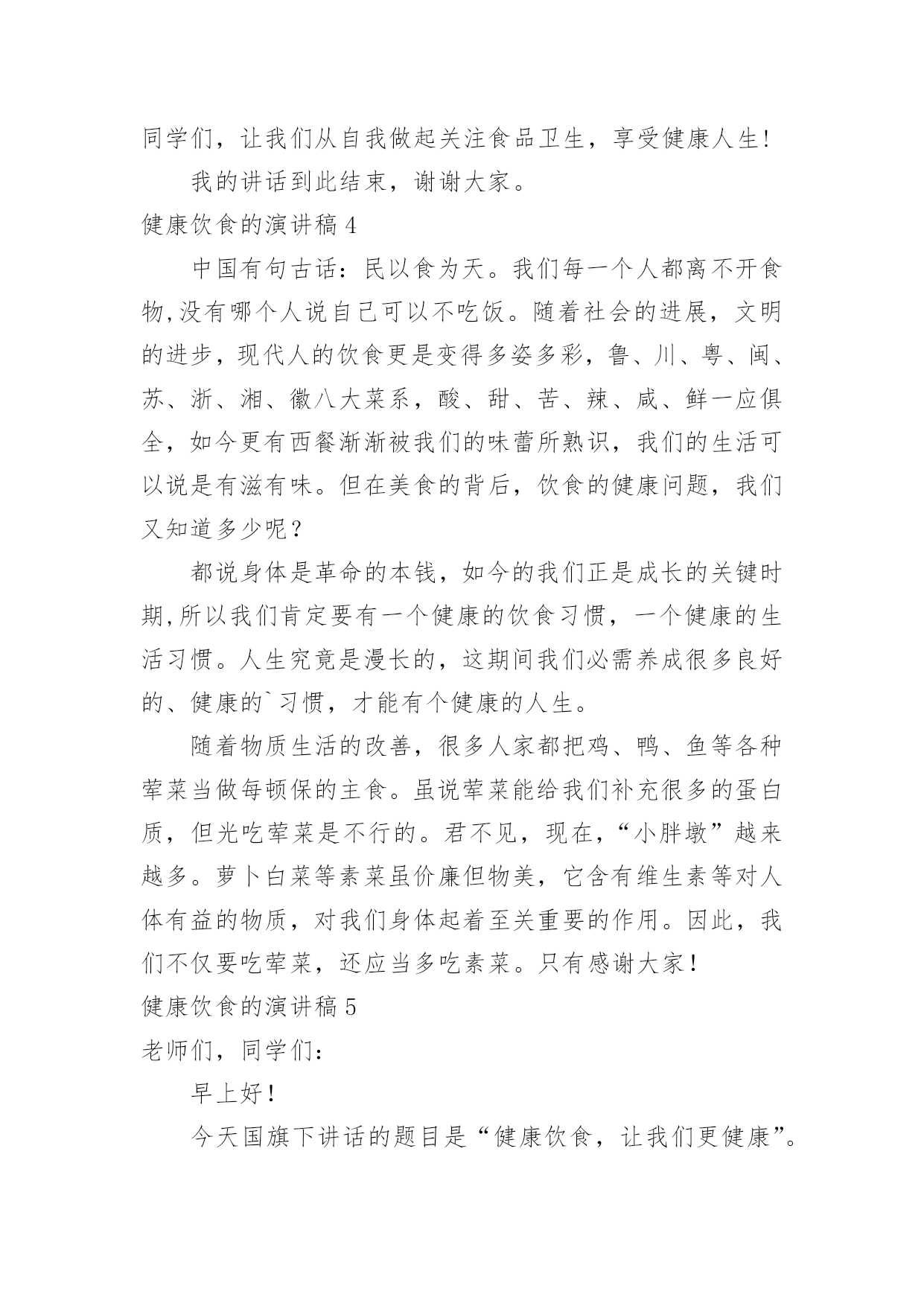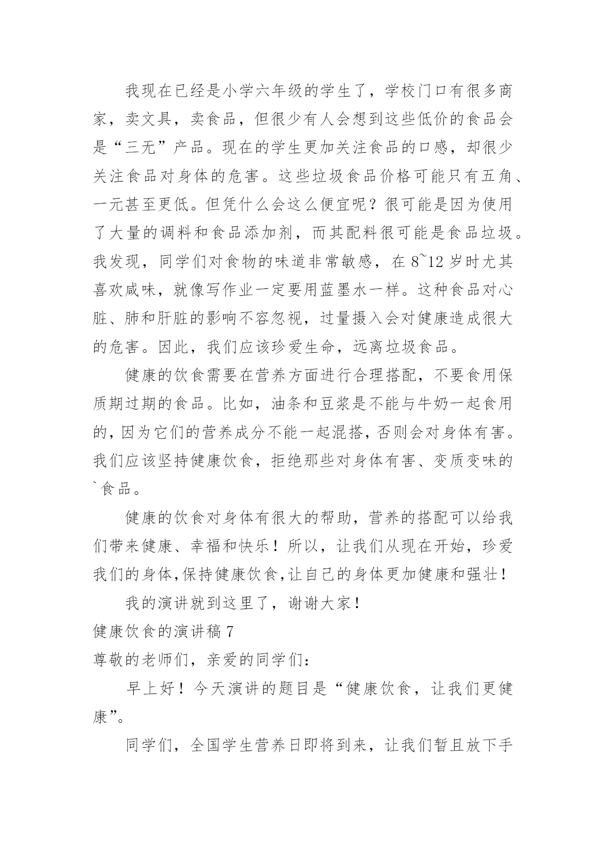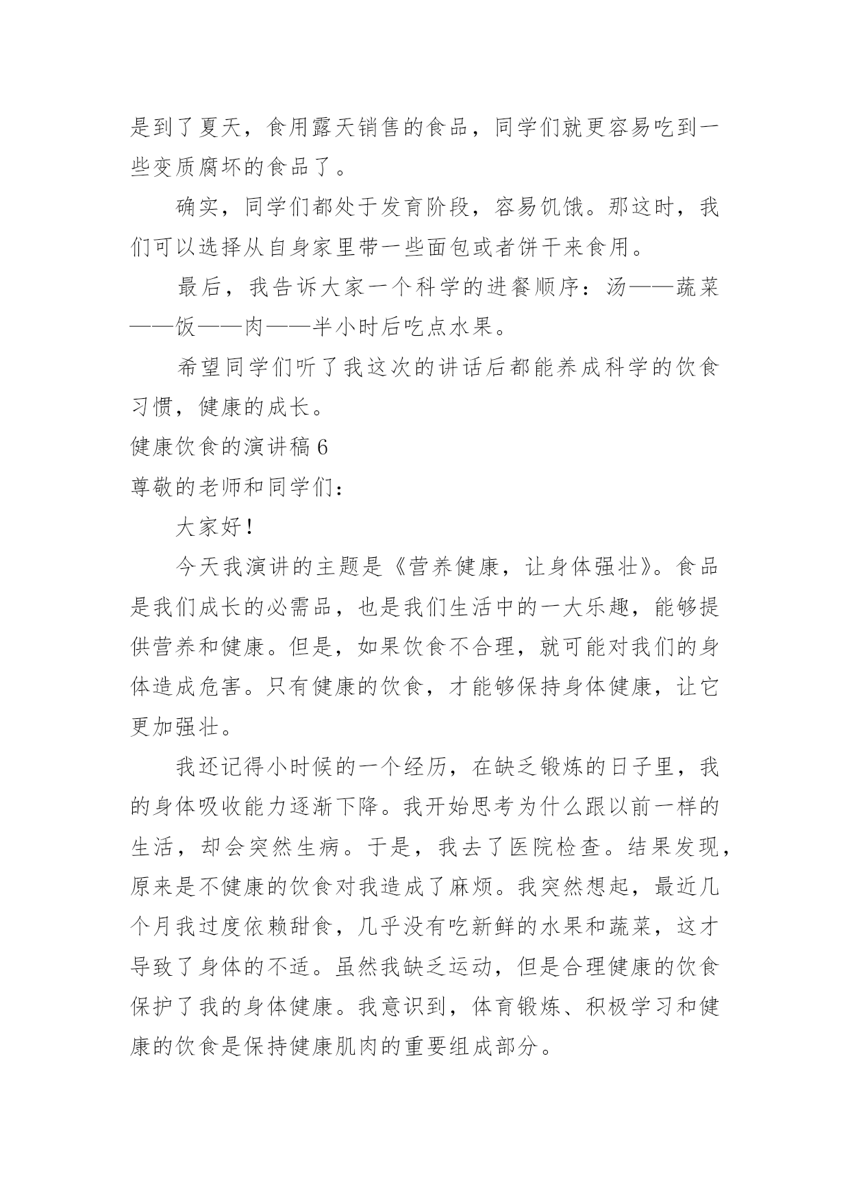健康饮食的演讲稿(热门)健康饮食的演讲稿15篇演讲稿可以起到整理演讲者的思路、提示演讲的内容、限定演讲的速度的作用。在充满活力,日益开放的今天,在很多情况下我们需要用到演讲稿,你知道演讲稿怎样才能写的好吗?下面是小编整理的健康饮食的演讲稿,希望对大家有所帮助。健康饮食的演讲稿1尊敬的老师们、同学们:大家好!今天我演讲的题目是《饮食与健康》,就让我来做大家健康饮食的指引者吧。大家都知道我们小学时期所处的这个阶段正是生长发育最关键的时期,因此为了我们身体,为了我们能够在学习生活中有一个健康的体魄来面对我们的学习以及以后得分生活,我们应该对自己的饮食起重视了,不要在自己不经意间而养成坏的饮食习惯,给自己的身体健康造成损伤。一个好的饮食习惯对于我们小学阶段来说显得尤为重要,小学正是一个思想启蒙的过程,每天我们都要接受很大的信息量,学习很多的知识,一个健康的饮食习惯不仅会给我们身体带来益处,也会给我们的学习带来帮助,但是如果养成了坏的饮食习惯那可就糟糕了,一个不好的饮食习惯影响的不仅仅是我们的学习,它也会间接的影响到我们的生活,所以饮食的健康是我们在小学阶段最值得关注的问题,它直接关系到了我们的成长,健康饮食,能够让我们更加健康快乐的成长。要养成一个健康而符合我们小学生的饮食习惯还得从自己入手,给自己制定一个标准的'饮食计划及其的重要,首先,也是最基本的,在生活中,我们不能养成挑食的和偏食的坏习惯,在日常生活中要做到什么都吃,特别是各种五谷杂粮,新鲜的水果,蔬菜等,通过饮食来摄入和维持身体新陈代谢需要正常的微量元素。但是,如果自己控制不了饮食习惯,出现偏食这些习惯时,就很容易引起营养的一个不平衡,会对身体造成很大的损失,还有的一些同学还存在经常不吃早餐的习惯,这个坏习惯很容易引发肠胃相关的疾病。在日常生活中,很多人在进餐的时候大家都喜欢选择自己喜欢吃的食物,例如有的同学喜欢吃肉,在每次点菜的时候就点大量的肉类食物,而很少吃蔬菜,还有的一些同学特别喜欢吃垃圾食品,例如小吃摊的油炸食品,以及各种小吃,这些食品的组成成分很复杂,这都是一些不好的习惯,它时刻在危害我们的身体健康。作为小学生,现在是我们生长发育最关键的时刻,我们应该自觉的养成一个健康又简单的饮食习惯,并且每天坚持自己的习惯,不吃小吃摊购买垃圾食品,自己对自己的成长负责,我希望大家在听完我关于饮食健康的演讲之后每个人都能养成一个科学合理的饮食习惯,健康快乐的成长。我的演讲完毕,谢谢大家。健康饮食的演讲稿2老师们,同学们:大家好!今天我演讲的主题是:维护健康,拒绝零食。为了维护我们的身体健康,还一个更加清洁、美丽的校园,每学期我们的老师都利用班会课开展“拒绝零食,从现在做起”的主题教育。通过教育,许多同学都认识到零食的危害,抵住了零食的诱惑,不乱买零食。可是,我们还发现还是有个别同学控制不了自己,上学前和放学后,在学校门口的小商店里购买零食吃,把包装袋乱扔,校园的角落边、垃圾桶里,甚至课桌里都能找到零食包装袋。同学们,看到这样的情景,你还能无动于衷么?你自己还能心安理得地享受零食吗?你不觉得这严重损害了学校的形象吗?同学们,让我们树立正确的饮食观念,控制住自己的'嘴巴,拒绝零食的诱惑,把我们的精力放到学习上。我们倡议:维护健康,拒绝零食、从我做起,从现在做起。健康饮食的演讲稿3尊敬的老师、同学们:大家上午好!今天我讲话的题目是《关注饮食安全,共创健康生活》。民以食为天,食以安为先。随着我国社会经济的迅速发展和人民生活水平的日益提升,人们对健康、对食品安全更加关注,“食品安全”已经成为关系到国民健康、社会稳定、经济发展、市场繁荣的重要因素。可近来我们有些同学放学后随意在校外路边摊点买东西吃,殊不知这是在拿健康甚至是生命在作赌注。路边摊点采用的都是“地沟油”、“泔水油”,里面包含很多致癌物质,不讲食品安全,哪怕是一块豆腐,一根豆芽,一包小小的盐,就能中断免疫系统的正常运行,让你病魔缠身,让生机勃勃的.生命处于危险中。健康,生命的保证。一旦我们失去了健康,也意味着即将失去宝贵的生命,生命不能重来一次,因此我们要时刻维护自身的健康,珍爱自身的生命,而生命的健康则应该从食品安全开始。据报道:20xx年XX月6日湖南省|涟源市|行知中学|高考补习学校|有3名学生在上课时出现恶心、呕吐症状,随后陆续有学生反映身体有不适现象。根据调查,初步认定是学生食用的早餐中有部分米粉变质,导致学生食用后出现身体不适。新闻报道中曾提及的南京“冠生园”事件,让人们望月饼而生畏;三亚的“毒咸鱼”,使我们谈“咸鱼”而色变;广东的“瘦肉精”事件,令我们望猪肉而怯步;号称生命杀手的“苏丹红”竟出现在我们最喜欢吃的辣味食品里;还有近来的染色馒头、毒豆芽、蒙牛毒牛奶等事件接二连三地发生,究竟要到什么时候才停止啊?或许你会认