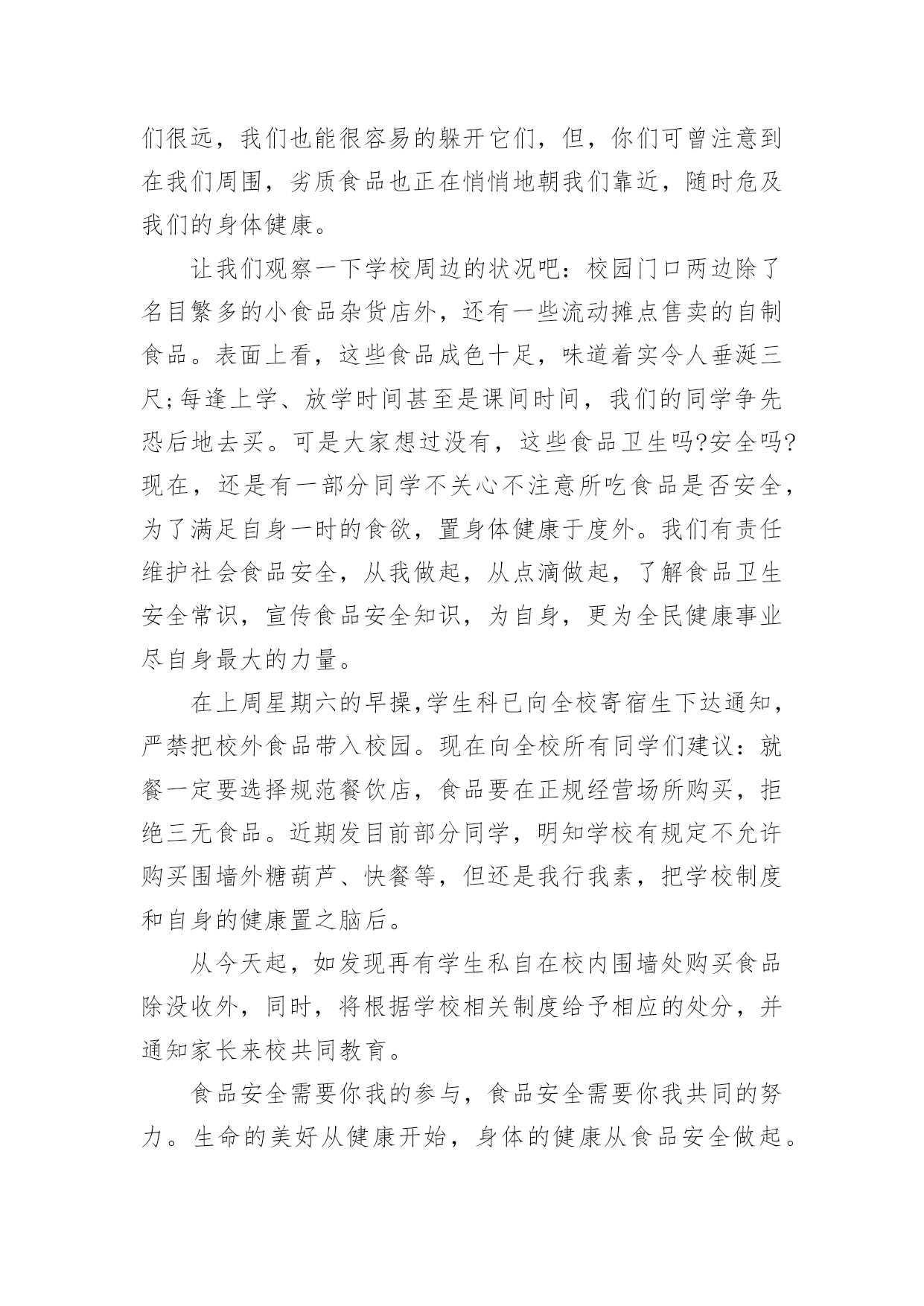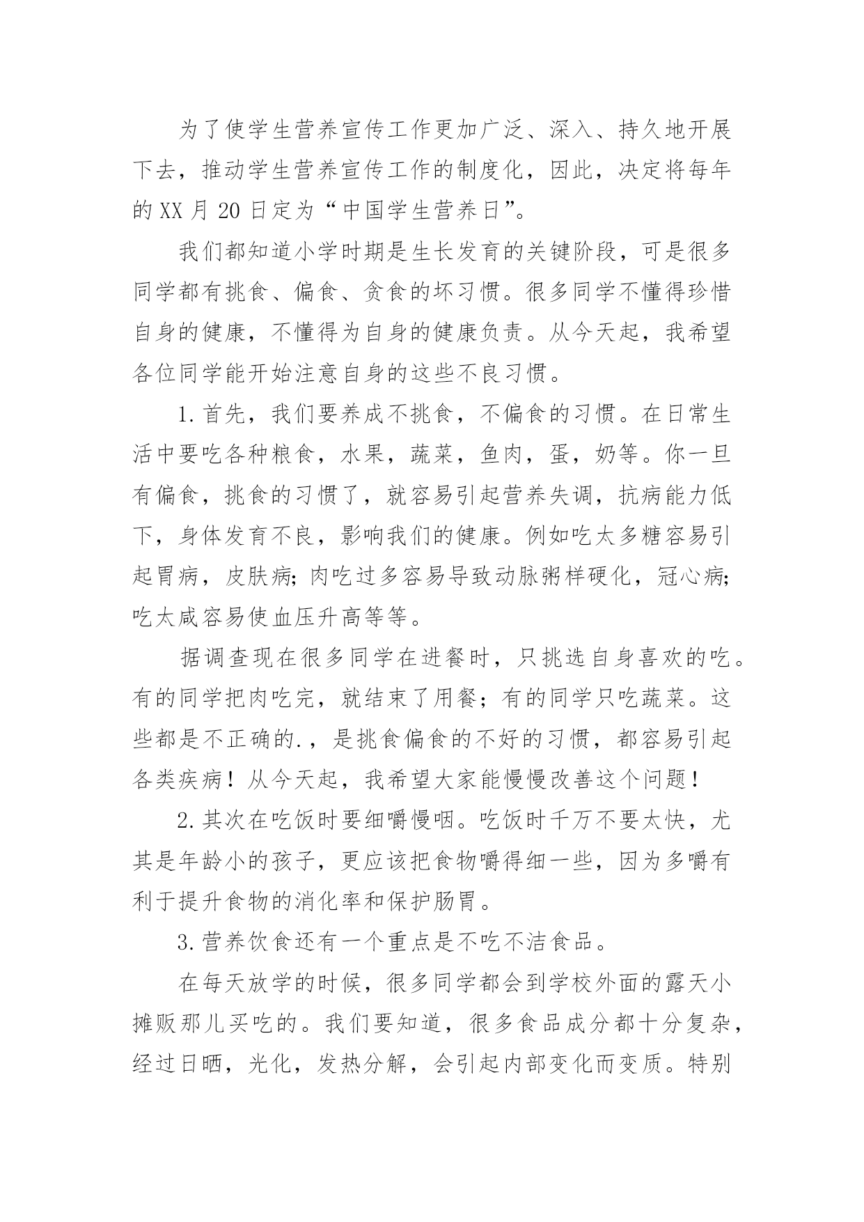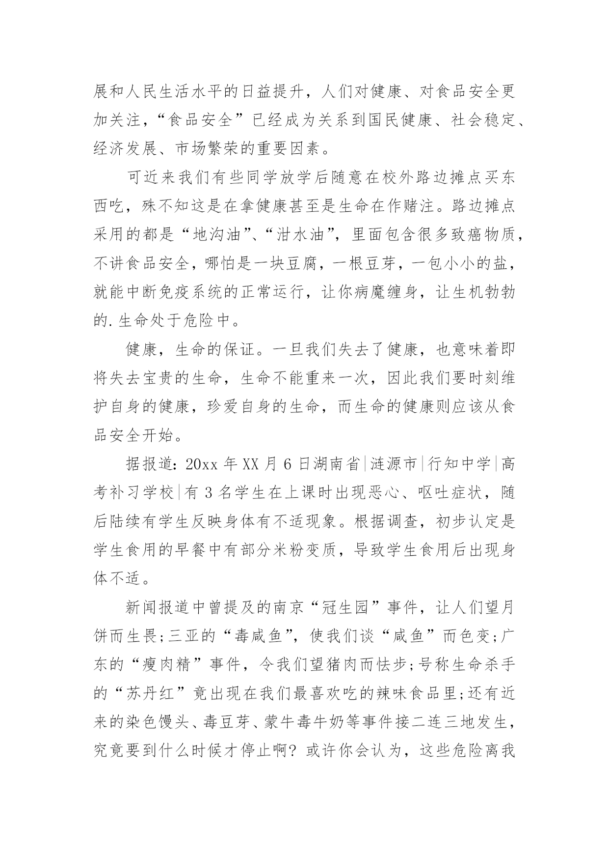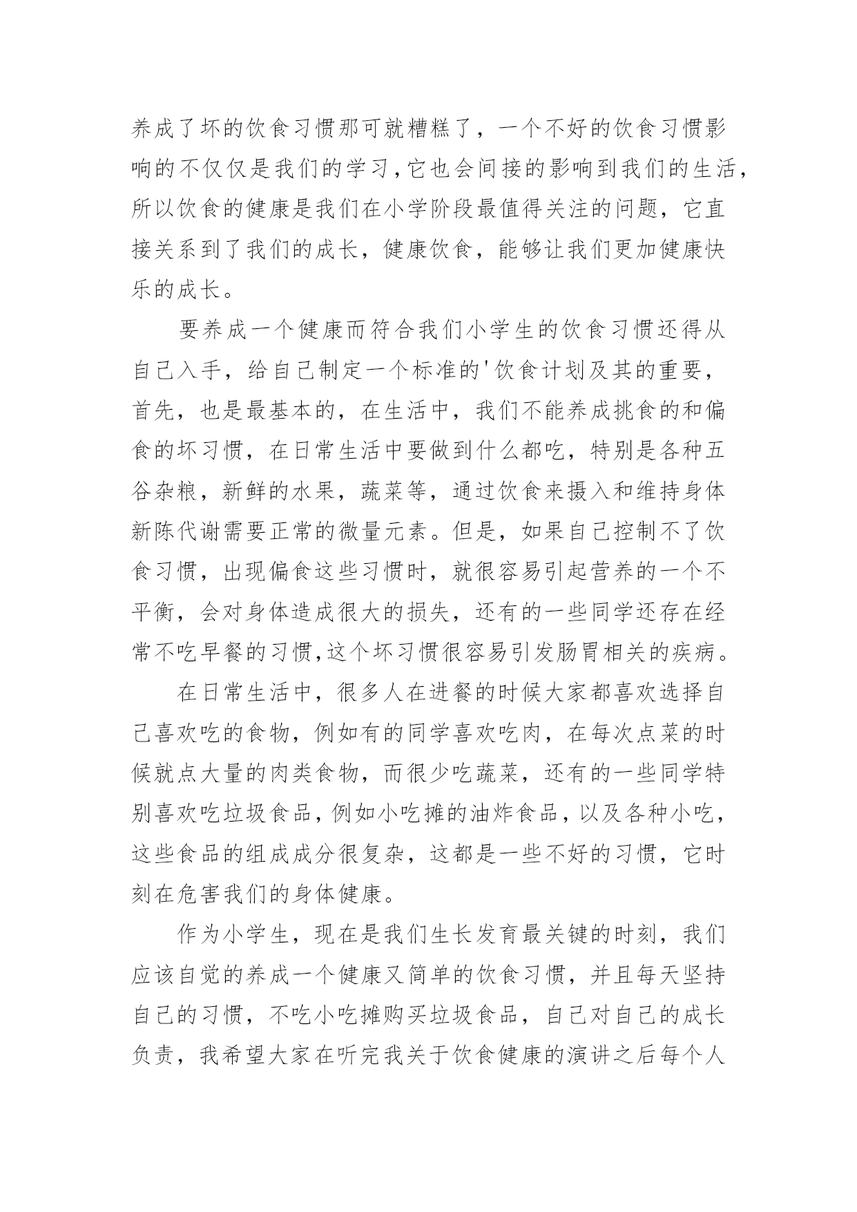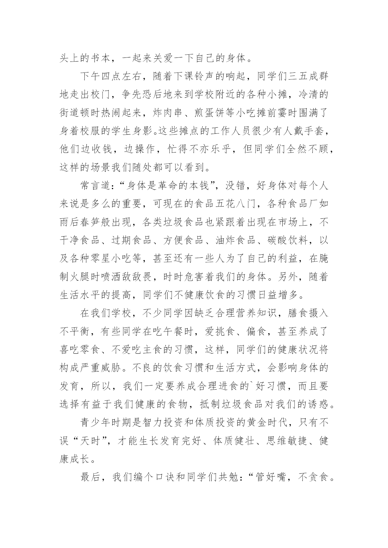 健康饮食的演讲稿(热门)健康饮食的演讲稿15篇演讲稿可以起到整理演讲者的思路、提示演讲的内容、限定演讲的速度的作用。在充满活力,日益开放的今天,在很多情况下我们需要用到演讲稿,你知道演讲稿怎样才能写的好吗?下面是小编整理的健康饮食的演讲稿,希望对大家有所帮助。健康饮食的演讲稿1尊敬的老师们、同学们:大家好!今天我演讲的题目是《饮食与健康》,就让我来做大家健康饮食的指引者吧。大家都知道我们小学时期所处的这个阶段正是生长发育最关键的时期,因此为了我们身体,为了我们能够在学习生活中有一个健康的体魄来面对我们的学习以及以后得分生活,我们应该对自己的饮食起重视了,不要在自己不经意间而养成坏的饮食习惯,给自己的身体健康造成损伤。一个好的饮食习惯对于我们小学阶段来说显得尤为重要,小学正是一个思想启蒙的过程,每天我们都要接受很大的信息量,学习很多的知识,一个健康的饮食习惯不仅会给我们身体带来益处,也会给我们的学习带来帮助,但是如果养成了坏的饮食习惯那可就糟糕了,一个不好的饮食习惯影响的不仅仅是我们的学习,它也会间接的影响到我们的生活,所以饮食的健康是我们在小学阶段最值得关注的问题,它直接关系到了我们的成长,健康饮食,能够让我们更加健康快乐的成长。要养成一个健康而符合我们小学生的饮食习惯还得从自己入手,给自己制定一个标准的'饮食计划及其的重要,首先,也是最基本的,在生活中,我们不能养成挑食的和偏食的坏习惯,在日常生活中要做到什么都吃,特别是各种五谷杂粮,新鲜的水果,蔬菜等,通过饮食来摄入和维持身体新陈代谢需要正常的微量元素。但是,如果自己控制不了饮食习惯,出现偏食这些习惯时,就很容易引起营养的一个不平衡,会对身体造成很大的损失,还有的一些同学还存在经常不吃早餐的习惯,这个坏习惯很容易引发肠胃相关的疾病。在日常生活中,很多人在进餐的时候大家都喜欢选择自己喜欢吃的食物,例如有的同学喜欢吃肉,在每次点菜的时候就点大量的肉类食物,而很少吃蔬菜,还有的一些同学特别喜欢吃垃圾食品,例如小吃摊的油炸食品,以及各种小吃,这些食品的组成成分很复杂,这都是一些不好的习惯,它时刻在危害我们的身体健康。作为小学生,现在是我们生长发育最关键的时刻,我们应该自觉的养成一个健康又简单的饮食习惯,并且每天坚持自己的习惯,不吃小吃摊购买垃圾食品,自己对自己的成长负责,我希望大家在听完我关于饮食健康的演讲之后每个人都能养成一个科学合理的饮食习惯,健康快乐的成长。我的演讲完毕,谢谢大家。健康饮食的演讲稿2老师们,同学们:大家好!今天我演讲的主题是:维护健康,拒绝零食。为了维护我们的身体健康,还一个更加清洁、美丽的校园,每学期我们的老师都利用班会课开展“拒绝零食,从现在做起”的主题教育。通过教育,许多同学都认识到零食的危害,抵住了零食的诱惑,不乱买零食。可是,我们还发现还是有个别同学控制不了自己,上学前和放学后,在学校门口的小商店里购买零食吃,把包装袋乱扔,校园的角落边、垃圾桶里,甚至课桌里都能找到零食包装袋。同学们,看到这样的情景,你还能无动于衷么?你自己还能心安理得地享受零食吗?你不觉得这严重损害了学校的形象吗?同学们,让我们树立正确的饮食观念,控制住自己的'嘴巴,拒绝零食的诱惑,把我们的精力放到学习上。我们倡议:维护健康,拒绝零食、从我做起,从现在做起。健康饮食的演讲稿3尊敬的老师、同学们:大家上午好!今天我讲话的题目是《关注饮食安全,共创健康生活》。民以食为天,食以安为先。随着我国社会经济的迅速发展和人民生活水平的日益提升,人们对健康、对食品安全更加关注,“食品安全”已经成为关系到国民健康、社会稳定、经济发展、市场繁荣的重要因素。可近来我们有些同学放学后随意在校外路边摊点买东西吃,殊不知这是在拿健康甚至是生命在作赌注。路边摊点采用的都是“地沟油”、“泔水油”,里面包含很多致癌物质,不讲食品安全,哪怕是一块豆腐,一根豆芽,一包小小的盐,就能中断免疫系统的正常运行,让你病魔缠身,让生机勃勃的.生命处于危险中。健康,生命的保证。一旦我们失去了健康,也意味着即将失去宝贵的生命,生命不能重来一次,因此我们要时刻维护自身的健康,珍爱自身的生命,而生命的健康则应该从食品安全开始。据报道:20xx年XX月6日湖南省|涟源市|行知中学|高考补习学校|有3名学生在上课时出现恶心、呕吐症状,随后陆续有学生反映身体有不适现象。根据调查,初步认定是学生食用的早餐中有部分米粉变质,导致学生食用后出现身体不适。新闻报道中曾提及的南京“冠生园”事件,让人们望月饼而生畏;三亚的“毒咸鱼”,使我们谈“咸鱼”而色变;广东的“瘦肉精”事件,令我们望猪肉而怯步;号称生命杀手的“苏丹红”竟出现在我们最喜欢吃的辣味食品里;还有近来的染色馒头、毒豆芽、蒙牛毒牛奶等事件接二连三地发生,究竟要到什么时候才停止啊?或许你会认