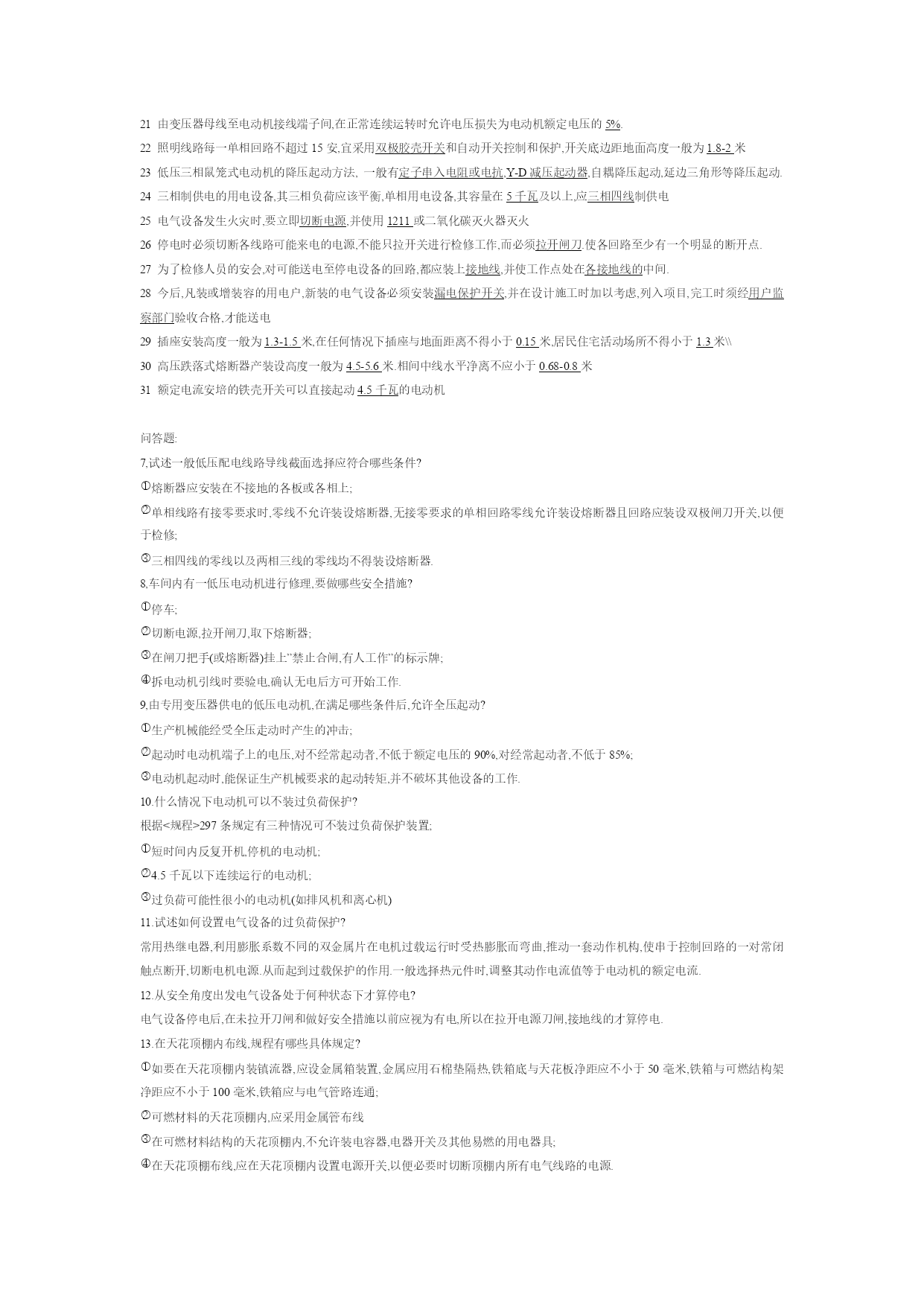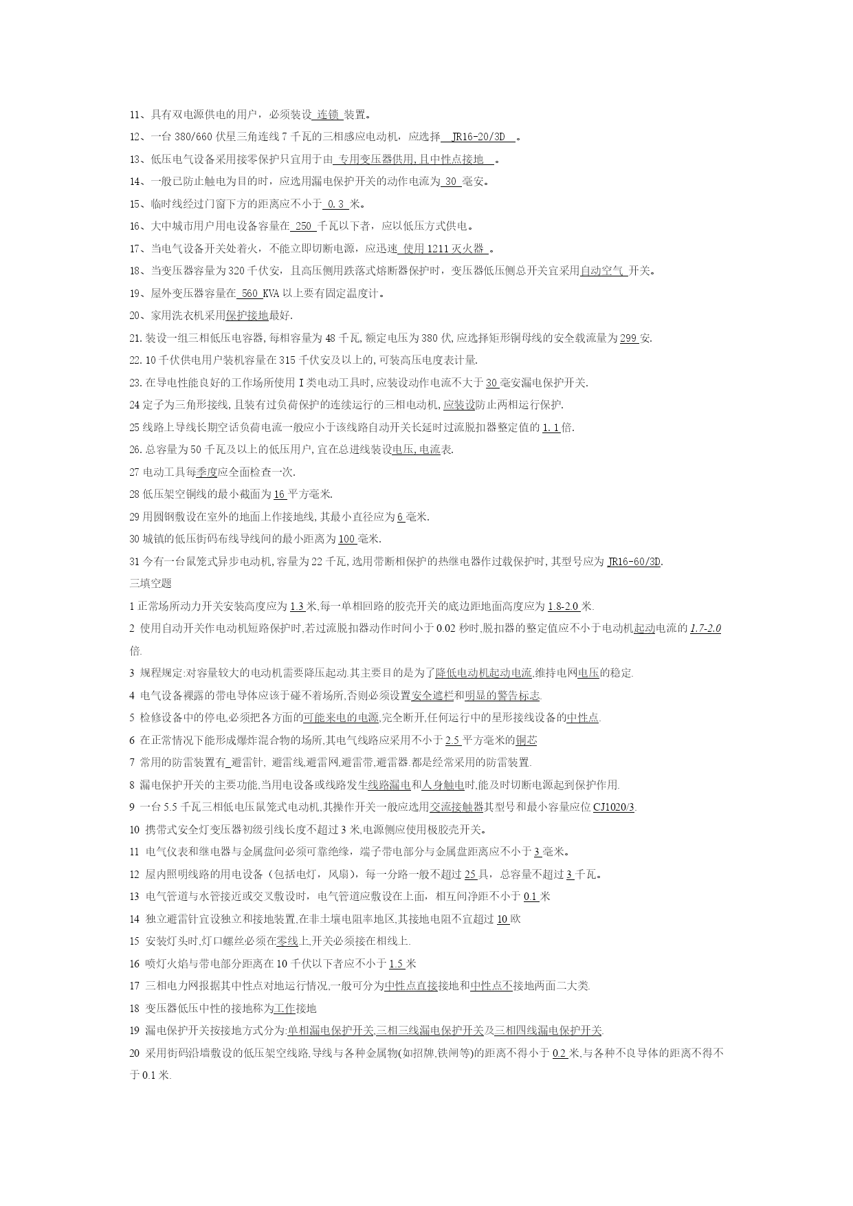 选择题:1、临时线使用期限为7天,最多不能超过3个月。(X)2、一切使用日光灯、水银灯等作光源的企业、机关、学校、事业单位应加装电容补偿,使功率因数达到0.85以上。(X)3、用电设备无接零要求的情况下,在三相四线总电源上,其零线可允许装设熔断器。(X)4、铁壳开关或一些组合开关在结构上加装了速断弹簧装置,其主要作用是有利于迅速熄灭电弧。(0)5、天花顶橱的布线不允许明敷或槽板敷设,而应使用金属线管或金属蛇皮管布线。(X)6、直敷布线一般不允许采用胶麻线,软线或裸导线。(0)7、规程规定可利用穿线钢管和电缆金属外皮作为接地线,同样金属蛇皮管也可以作为接地线。(X)8、在带电设备附近工作时,用金属卷尺测量时要特别小心。(x)9、带负载拉开动力配电箱的闸刀开关,应用力迅速拉开。(x)10、在接地装置的环境中,使用I类电动工具时,应将工具外壳接地与电源零线连接在一起插到插座零线孔作接零保护。(x)11、在单相回路上,装设了漏电保护开关后,电源侧可不需装设过流保护装置。(x)12、从安全角度出发,配电线路的停电必须首先拉开闸刀开关使线路上有一个明显的断开点,变压器和电压互感器必须首先拉开高压侧,后拉开低压侧。(x)13、动力线路上熔断器熔体的额定电流,应不小于被保护线路的负荷计算电流及该线路的安全额定电流。(0)14、电器设备发生火灾时,应立即使用1211或二氧化碳灭火器进行扑救,而不能使用水或泡末灭火器。(x)15、在有爆炸和火灾危险的场所,应尽量少用携带式、移动式的电气设备和局部照明灯具。(0)16、在动力线路上,自动开关长延时过流脱扣器因具有反延时限保护特性,故其整定值应为电动机额定电流的100%。(0)17、凡是从事变压器二次侧用抽头方法取出的36伏电源可作为行灯电源用。(x)18、II类电动工具的金属外壳可以不需接地保护。(0)19、在三相四线制系统中,中性点是否接地,熔断器均应装设在三相线路上,在中性点不接地的系统中,自动开关过流脱扣器可装设在其中的两相上。(x)20、为了充分利用电动机的过载能力,因此当电动机短时间内过载时,热继电器由于其反时限特性作用而不会动作切断电源。(0)21、在特别潮湿场所或金属容器内,使用24伏安全电压照明是不安全的。(0)22、在正常场所中,安装在已接地的车床上的电动机外壳,可不用再接地或接零保护。(0)23、车间内的动力和照明线路应分开,但机床等设备配套的局部照明可除外。(0)24、正常场所或爆炸场所中,安装在接地的金属构架上的电器设备,其金属外壳都必须进行接地。(x)25、停电检修电力变压器时,应先把高压跌落式熔断器或开关拉开,使高压电源断开后即可进行工作。(x)26、电气设备与接地点之间的距离应该越小越好,可允许采用自动开关控制。(0)27、三相总容量为48千乏的低压电容器组,可允许采用自动开关控制。(0)28、一般排风机及短时间内启动较频繁的电动机,可不装设过负载保护装置。(0)29、低压架空线的零线应采用铜线。(0)30、220伏照明线路允许的电压损失为11伏。(0)31、在公用变压器连接的直接启动的电动机,允许最大为14千瓦。(x)选择题:1、II类电动工具的绝缘电阻应不小于7兆欧。2、动力线路上的过负载保护可选用自动开关延时过流脱扣器。3、使用熔断器作过载保护时,熔体的额定电流应不大于线路的过载电流。4、触电者在无呼吸无心跳情况下,并同时出现瞳孔扩大,关节僵硬,出现尸斑等三种症状时可判断为真死,并终止抢救。5当采用街码布线方式的低压架空线路导线通过门窗时,最小距离为0.5米下方。6、彩灯线跨接骑楼底的人行道时与地面距离不应小于4米。7、为减少相邻接地体的屏蔽作用,垂直接地体的间距离应不小于其长度的两倍。8、在电容器组回路上工作时,必须将电容器逐个放电后接地。9、变压器小修撤出运行时,首先应断开各负载。10、在具有跨步电压的范围内,人体越靠近接地点则其跨步电压越高。11、具有双电源供电的用户,必须装设连锁装置。12、一台380/660伏星三角连线7千瓦的三相感应电动机,应选择JR16-20/3D。13、低压电气设备采用接零保护只宜用于由专用变压器供用,且中性点接地。14、一般已防止触电为目的时,应选用漏电保护开关的动作电流为30毫安。15、临时线经过门窗下方的距离应不小于0.3米。16、大中城市用户用电设备容量在250千瓦以下者,应以低压方式供电。17、当电气设备开关处着火,不能立即切断电源,应迅速使用1211灭火器。18、当变压器容量为320千伏安,且高压侧用跌落式熔断器保护时,变压器低压侧总开关宜采用自动空气开关。19、屋外变压器容量在560KVA以上要有固定温度计。20、家用洗