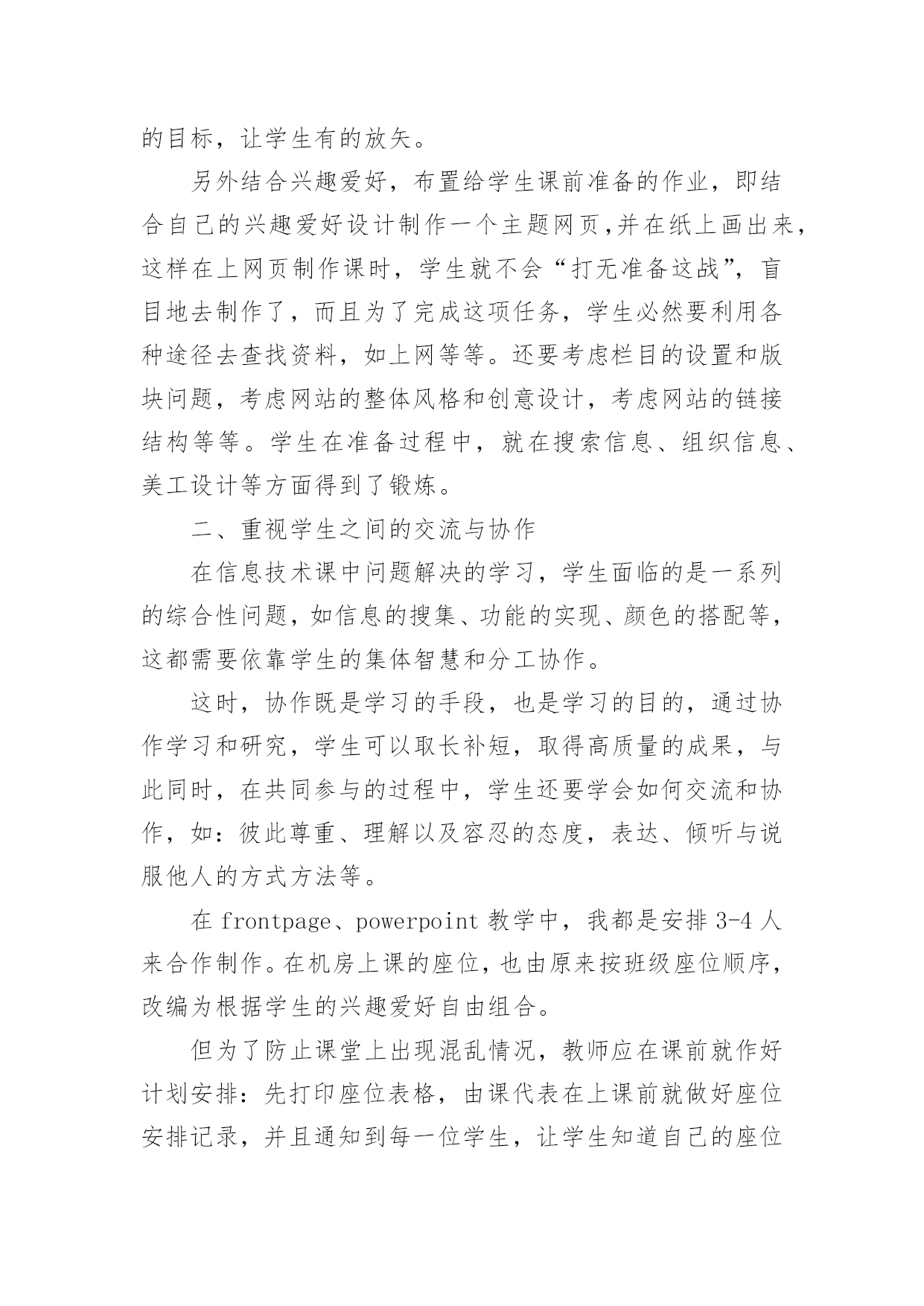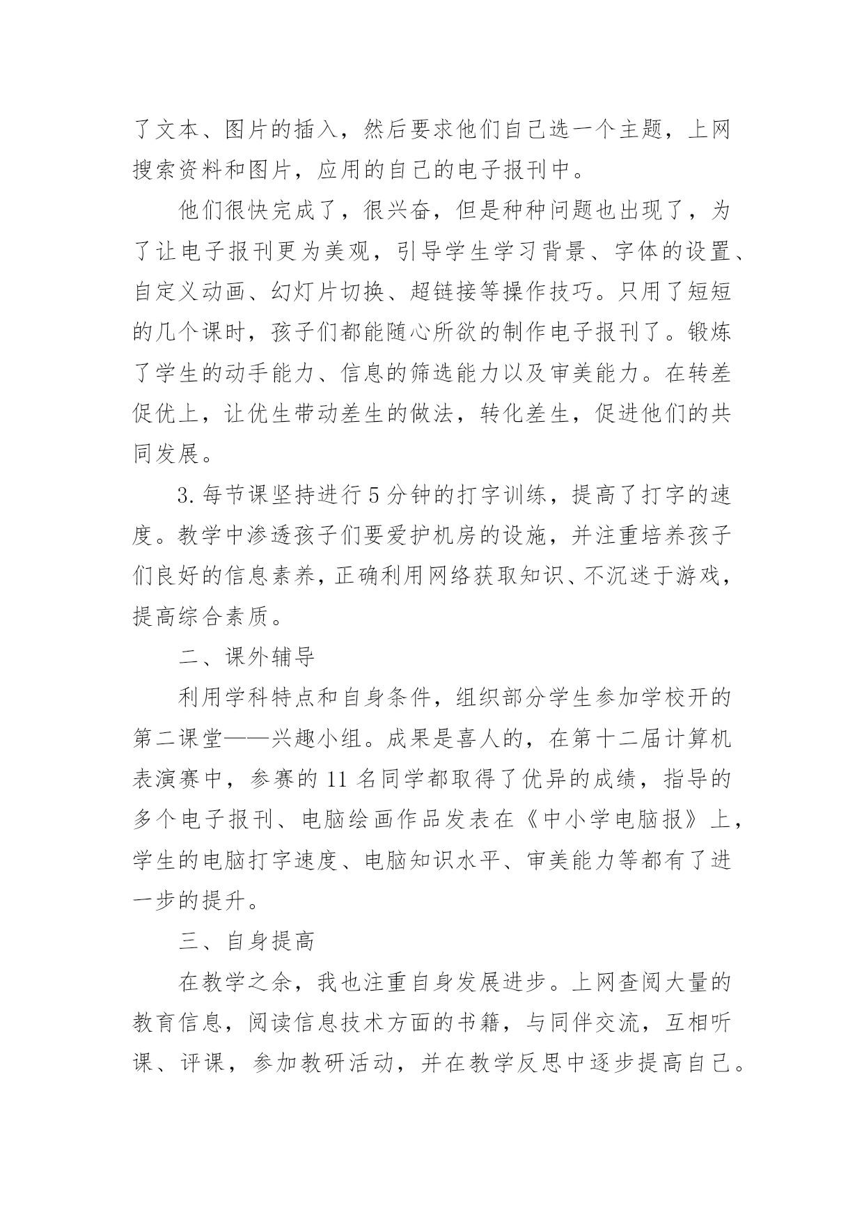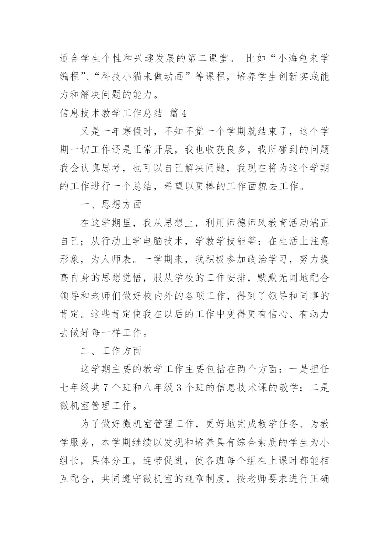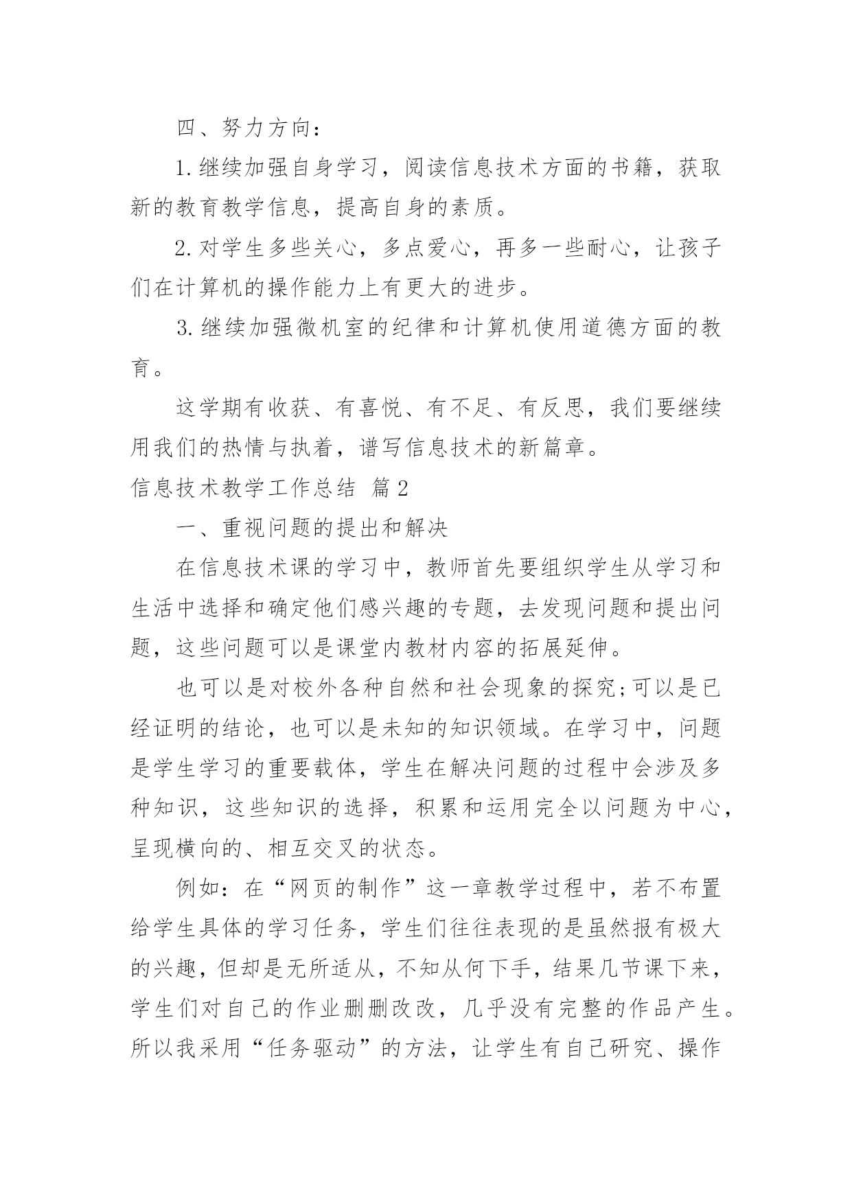信息技术教学工作总结精选信息技术教学工作总结汇编五篇总结是事后对某一阶段的学习、工作或其完成情况加以回顾和分析的一种书面材料,写总结有利于我们学习和工作能力的提高,让我们好好写一份总结吧。我们该怎么去写总结呢?下面是小编为大家收集的信息技术教学工作总结5篇,希望对大家有所帮助。信息技术教学工作总结篇1回顾本学期的信息技术教学工作,我享受到了与学生共同成长的喜悦、收获喜悦,我将把这学期的经验用于以后的工作中,并逐步提升以享受更多的喜悦。下面就本人的工作来作一个自我总结:一、教学工作学期初,我们信息技术组的老师就以“加强学生管理,提高学生学习能力,培养学生信息素养”为目标,展开了一学期的教学工作。1.本学期,我们将学生的路队管理和学校的阳光班级“挂钩”,从而锻炼了学生的自控能力,培养了学生的集体荣誉感,学生做到了路队整齐、安静。2.教学中打乱教材顺序,抽取精髓,激励同学们主动获取知识。四年级学习的powerpoint,在讲授时,首先介绍了一个用powerpoint制做的电子报刊获奖作品,展示完成时,孩子们很好奇,我就带领着孩子们具体去实现它,简单介绍了文本、图片的插入,然后要求他们自己选一个主题,上网搜索资料和图片,应用的自己的电子报刊中。他们很快完成了,很兴奋,但是种种问题也出现了,为了让电子报刊更为美观,引导学生学习背景、字体的设置、自定义动画、幻灯片切换、超链接等操作技巧。只用了短短的几个课时,孩子们都能随心所欲的制作电子报刊了。锻炼了学生的动手能力、信息的筛选能力以及审美能力。在转差促优上,让优生带动差生的做法,转化差生,促进他们的共同发展。3.每节课坚持进行5分钟的打字训练,提高了打字的速度。教学中渗透孩子们要爱护机房的设施,并注重培养孩子们良好的信息素养,正确利用网络获取知识、不沉迷于游戏,提高综合素质。二、课外辅导利用学科特点和自身条件,组织部分学生参加学校开的第二课堂——兴趣小组。成果是喜人的,在第十二届计算机表演赛中,参赛的11名同学都取得了优异的成绩,指导的多个电子报刊、电脑绘画作品发表在《中小学电脑报》上,学生的电脑打字速度、电脑知识水平、审美能力等都有了进一步的提升。三、自身提高在教学之余,我也注重自身发展进步。上网查阅大量的教育信息,阅读信息技术方面的书籍,与同伴交流,互相听课、评课,参加教研活动,并在教学反思中逐步提高自己。四、努力方向:1.继续加强自身学习,阅读信息技术方面的书籍,获取新的教育教学信息,提高自身的素质。2.对学生多些关心,多点爱心,再多一些耐心,让孩子们在计算机的操作能力上有更大的进步。3.继续加强微机室的纪律和计算机使用道德方面的教育。这学期有收获、有喜悦、有不足、有反思,我们要继续用我们的热情与执着,谱写信息技术的新篇章。信息技术教学工作总结篇2一、重视问题的提出和解决在信息技术课的学习中,教师首先要组织学生从学习和生活中选择和确定他们感兴趣的专题,去发现问题和提出问题,这些问题可以是课堂内教材内容的拓展延伸。也可以是对校外各种自然和社会现象的探究;可以是已经证明的结论,也可以是未知的知识领域。在学习中,问题是学生学习的重要载体,学生在解决问题的过程中会涉及多种知识,这些知识的选择,积累和运用完全以问题为中心,呈现横向的、相互交叉的状态。例如:在“网页的制作”这一章教学过程中,若不布置给学生具体的学习任务,学生们往往表现的是虽然报有极大的兴趣,但却是无所适从,不知从何下手,结果几节课下来,学生们对自己的作业删删改改,几乎没有完整的作品产生。所以我采用“任务驱动”的方法,让学生有自己研究、操作的目标,让学生有的放矢。另外结合兴趣爱好,布置给学生课前准备的作业,即结合自己的兴趣爱好设计制作一个主题网页,并在纸上画出来,这样在上网页制作课时,学生就不会“打无准备这战”,盲目地去制作了,而且为了完成这项任务,学生必然要利用各种途径去查找资料,如上网等等。还要考虑栏目的设置和版块问题,考虑网站的整体风格和创意设计,考虑网站的链接结构等等。学生在准备过程中,就在搜索信息、组织信息、美工设计等方面得到了锻炼。二、重视学生之间的交流与协作在信息技术课中问题解决的学习,学生面临的是一系列的综合性问题,如信息的搜集、功能的实现、颜色的搭配等,这都需要依靠学生的集体智慧和分工协作。这时,协作既是学习的手段,也是学习的目的,通过协作学习和研究,学生可以取长补短,取得高质量的成果,与此同时,在共同参与的过程中,学生还要学会如何交流和协作,如:彼此尊重、理解以及容忍的态度,表达、倾听与说服他人的方式方法等。在frontpage、powerpoint教学中,我都是安排3-4人来合作制作。在机房上课的座位,也由原来按班级座位顺序,改编为根据学生的兴趣爱好自由组合。但为了防止课堂上出现混乱情况,教师应在课前就作