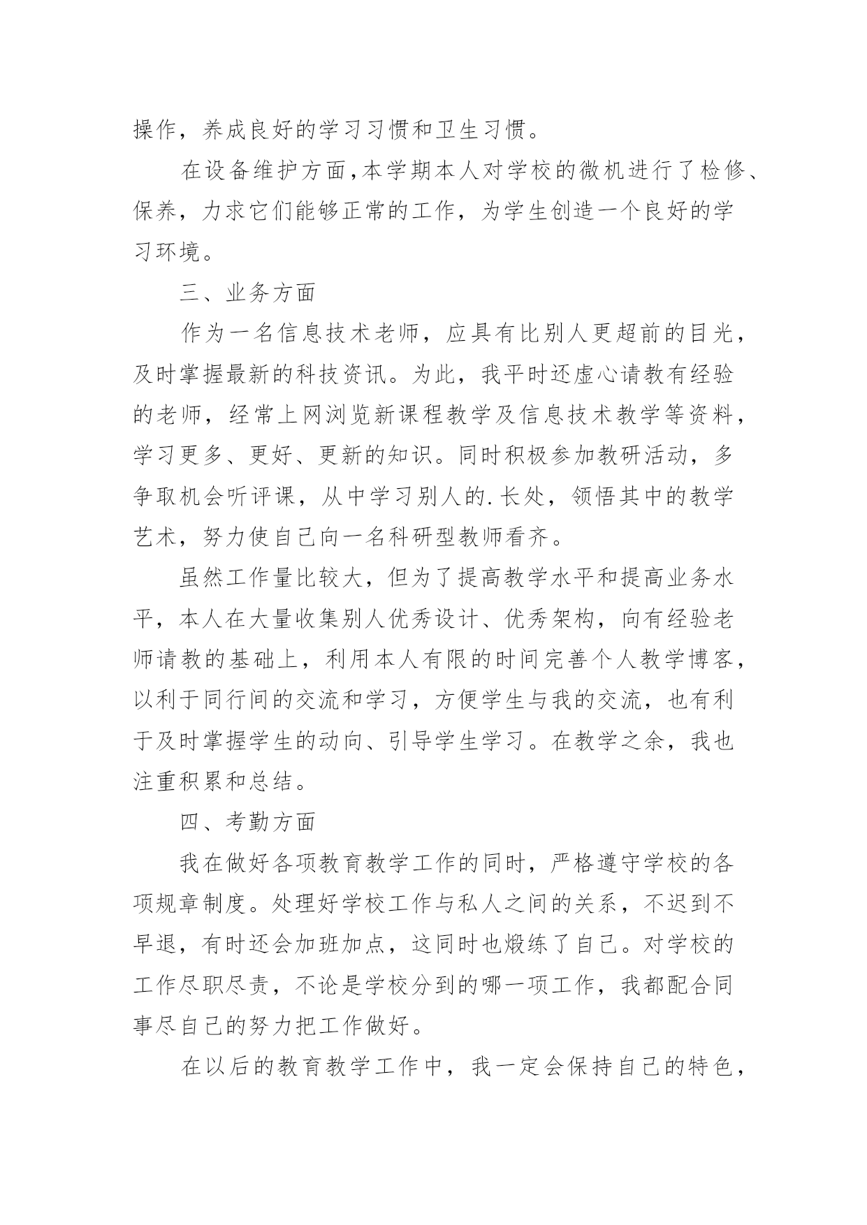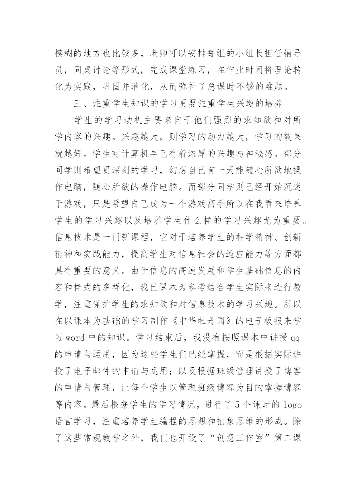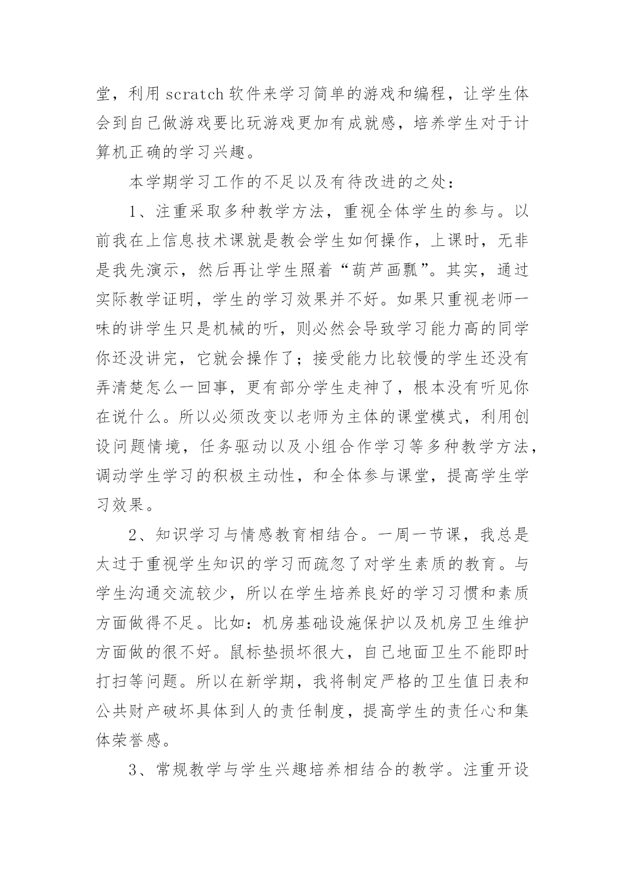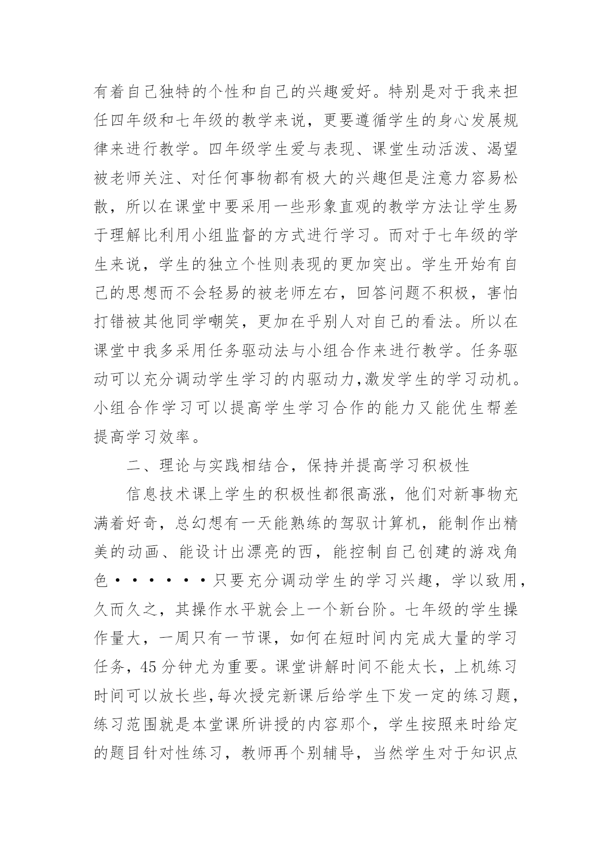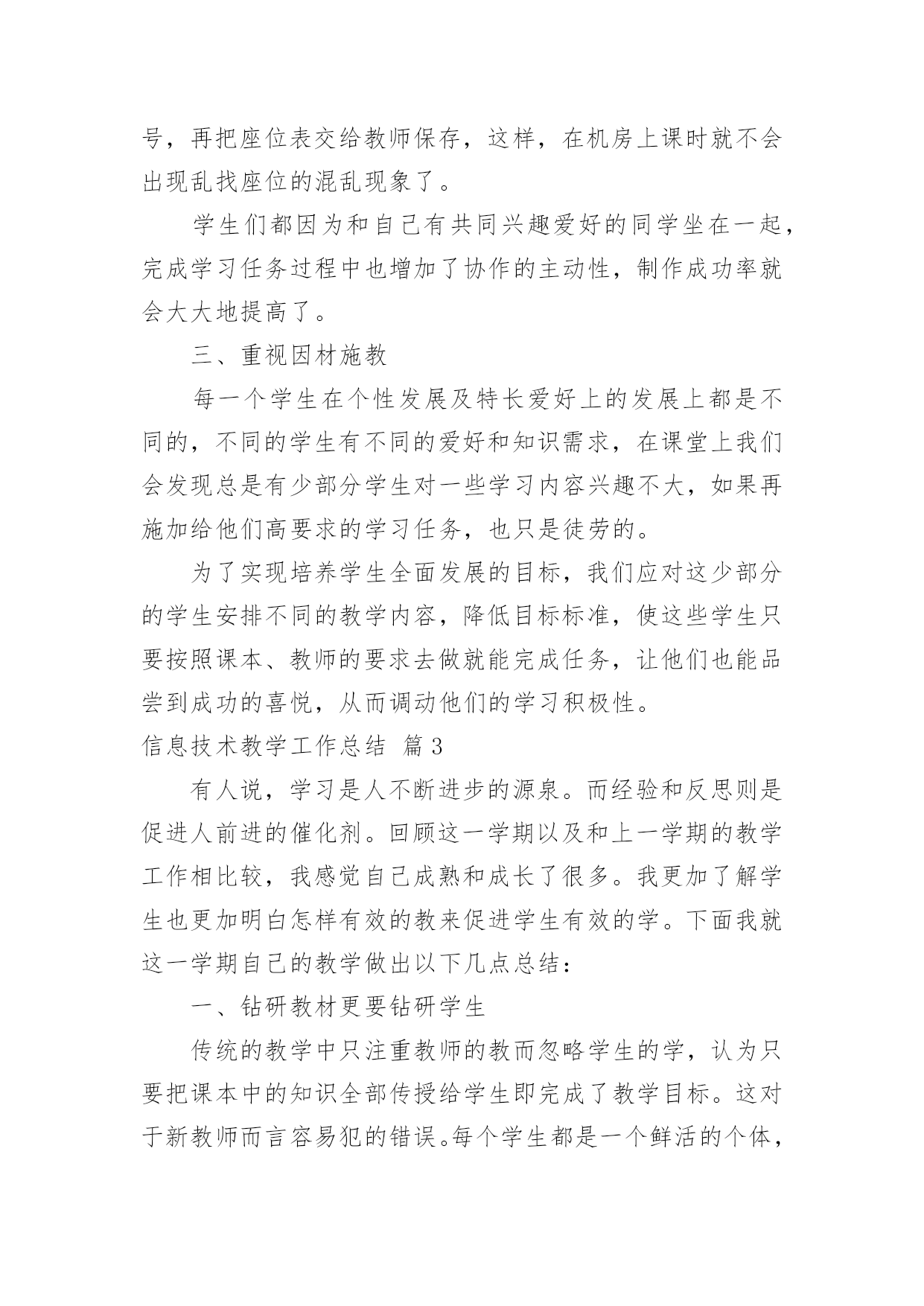 信息技术教学工作总结精选信息技术教学工作总结汇编五篇总结是事后对某一阶段的学习、工作或其完成情况加以回顾和分析的一种书面材料,写总结有利于我们学习和工作能力的提高,让我们好好写一份总结吧。我们该怎么去写总结呢?下面是小编为大家收集的信息技术教学工作总结5篇,希望对大家有所帮助。信息技术教学工作总结篇1回顾本学期的信息技术教学工作,我享受到了与学生共同成长的喜悦、收获喜悦,我将把这学期的经验用于以后的工作中,并逐步提升以享受更多的喜悦。下面就本人的工作来作一个自我总结:一、教学工作学期初,我们信息技术组的老师就以“加强学生管理,提高学生学习能力,培养学生信息素养”为目标,展开了一学期的教学工作。1.本学期,我们将学生的路队管理和学校的阳光班级“挂钩”,从而锻炼了学生的自控能力,培养了学生的集体荣誉感,学生做到了路队整齐、安静。2.教学中打乱教材顺序,抽取精髓,激励同学们主动获取知识。四年级学习的powerpoint,在讲授时,首先介绍了一个用powerpoint制做的电子报刊获奖作品,展示完成时,孩子们很好奇,我就带领着孩子们具体去实现它,简单介绍了文本、图片的插入,然后要求他们自己选一个主题,上网搜索资料和图片,应用的自己的电子报刊中。他们很快完成了,很兴奋,但是种种问题也出现了,为了让电子报刊更为美观,引导学生学习背景、字体的设置、自定义动画、幻灯片切换、超链接等操作技巧。只用了短短的几个课时,孩子们都能随心所欲的制作电子报刊了。锻炼了学生的动手能力、信息的筛选能力以及审美能力。在转差促优上,让优生带动差生的做法,转化差生,促进他们的共同发展。3.每节课坚持进行5分钟的打字训练,提高了打字的速度。教学中渗透孩子们要爱护机房的设施,并注重培养孩子们良好的信息素养,正确利用网络获取知识、不沉迷于游戏,提高综合素质。二、课外辅导利用学科特点和自身条件,组织部分学生参加学校开的第二课堂——兴趣小组。成果是喜人的,在第十二届计算机表演赛中,参赛的11名同学都取得了优异的成绩,指导的多个电子报刊、电脑绘画作品发表在《中小学电脑报》上,学生的电脑打字速度、电脑知识水平、审美能力等都有了进一步的提升。三、自身提高在教学之余,我也注重自身发展进步。上网查阅大量的教育信息,阅读信息技术方面的书籍,与同伴交流,互相听课、评课,参加教研活动,并在教学反思中逐步提高自己。四、努力方向:1.继续加强自身学习,阅读信息技术方面的书籍,获取新的教育教学信息,提高自身的素质。2.对学生多些关心,多点爱心,再多一些耐心,让孩子们在计算机的操作能力上有更大的进步。3.继续加强微机室的纪律和计算机使用道德方面的教育。这学期有收获、有喜悦、有不足、有反思,我们要继续用我们的热情与执着,谱写信息技术的新篇章。信息技术教学工作总结篇2一、重视问题的提出和解决在信息技术课的学习中,教师首先要组织学生从学习和生活中选择和确定他们感兴趣的专题,去发现问题和提出问题,这些问题可以是课堂内教材内容的拓展延伸。也可以是对校外各种自然和社会现象的探究;可以是已经证明的结论,也可以是未知的知识领域。在学习中,问题是学生学习的重要载体,学生在解决问题的过程中会涉及多种知识,这些知识的选择,积累和运用完全以问题为中心,呈现横向的、相互交叉的状态。例如:在“网页的制作”这一章教学过程中,若不布置给学生具体的学习任务,学生们往往表现的是虽然报有极大的兴趣,但却是无所适从,不知从何下手,结果几节课下来,学生们对自己的作业删删改改,几乎没有完整的作品产生。所以我采用“任务驱动”的方法,让学生有自己研究、操作的目标,让学生有的放矢。另外结合兴趣爱好,布置给学生课前准备的作业,即结合自己的兴趣爱好设计制作一个主题网页,并在纸上画出来,这样在上网页制作课时,学生就不会“打无准备这战”,盲目地去制作了,而且为了完成这项任务,学生必然要利用各种途径去查找资料,如上网等等。还要考虑栏目的设置和版块问题,考虑网站的整体风格和创意设计,考虑网站的链接结构等等。学生在准备过程中,就在搜索信息、组织信息、美工设计等方面得到了锻炼。二、重视学生之间的交流与协作在信息技术课中问题解决的学习,学生面临的是一系列的综合性问题,如信息的搜集、功能的实现、颜色的搭配等,这都需要依靠学生的集体智慧和分工协作。这时,协作既是学习的手段,也是学习的目的,通过协作学习和研究,学生可以取长补短,取得高质量的成果,与此同时,在共同参与的过程中,学生还要学会如何交流和协作,如:彼此尊重、理解以及容忍的态度,表达、倾听与说服他人的方式方法等。在frontpage、powerpoint教学中,我都是安排3-4人来合作制作。在机房上课的座位,也由原来按班级座位顺序,改编为根据学生的兴趣爱好自由组合。但为了防止课堂上出现混乱情况,教师应在课前就作