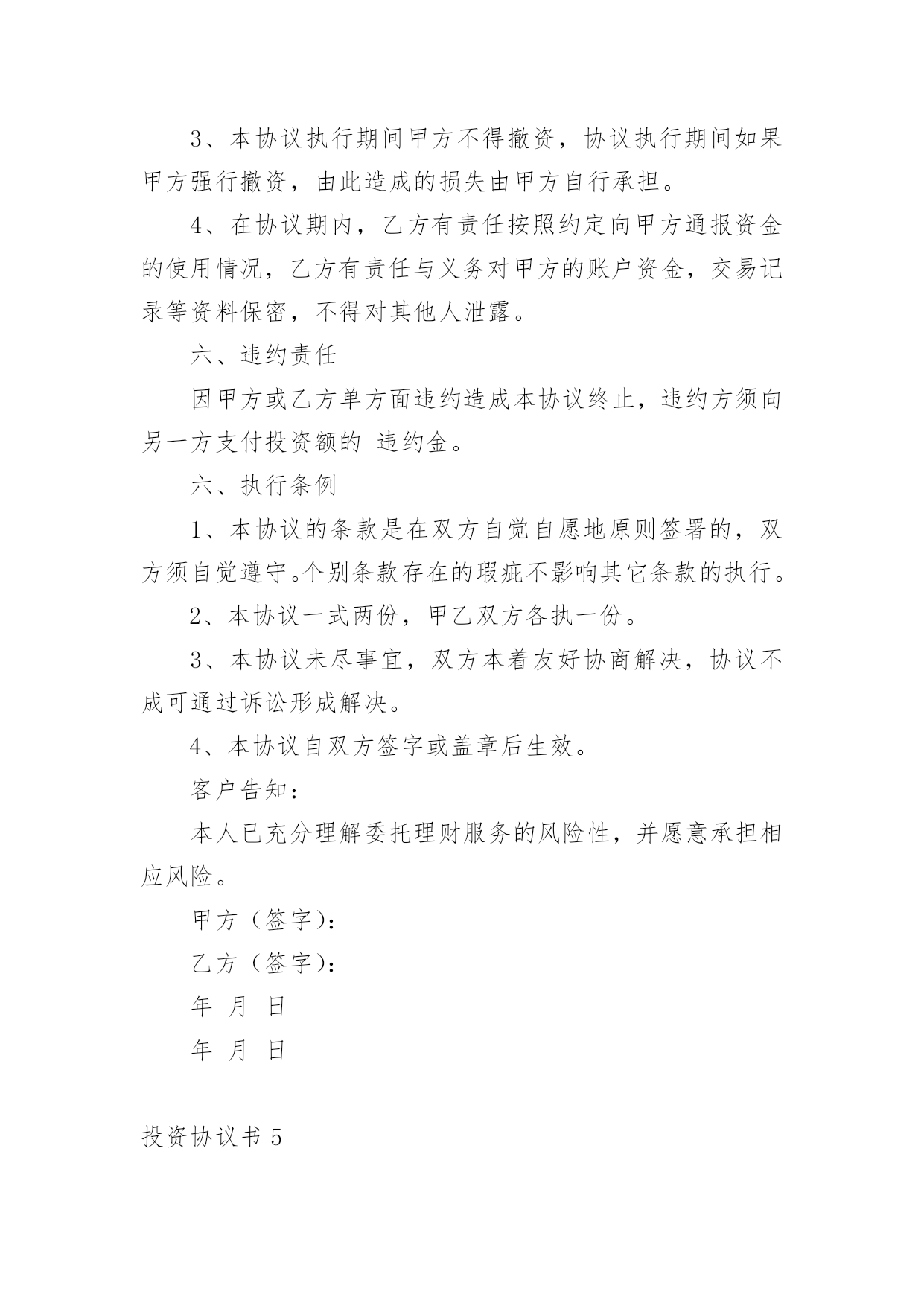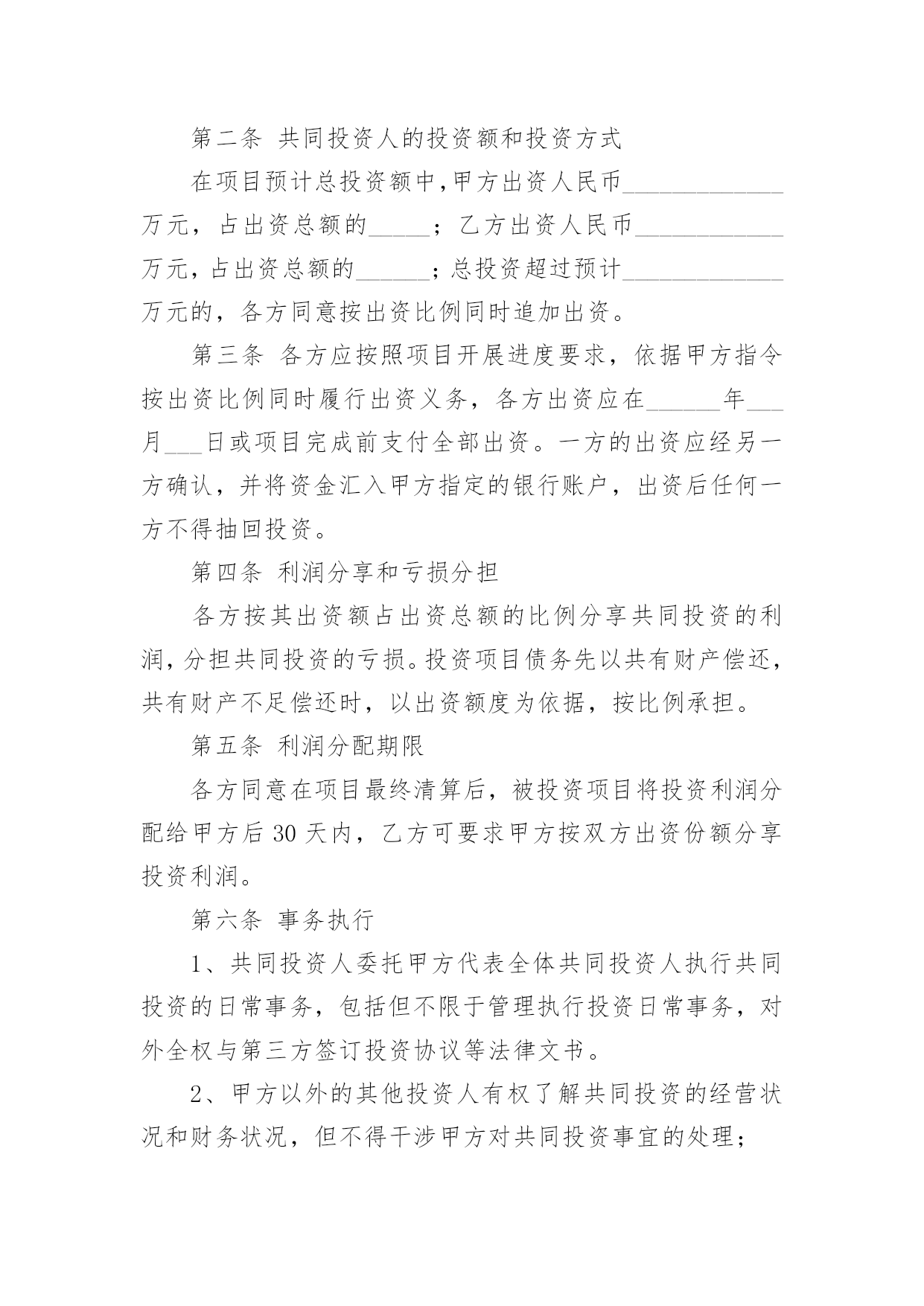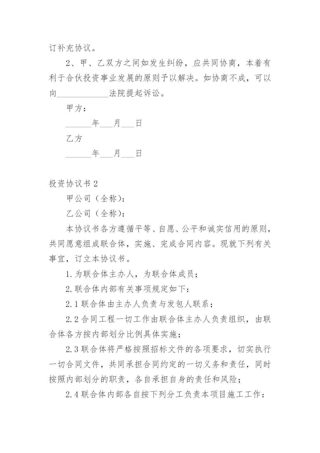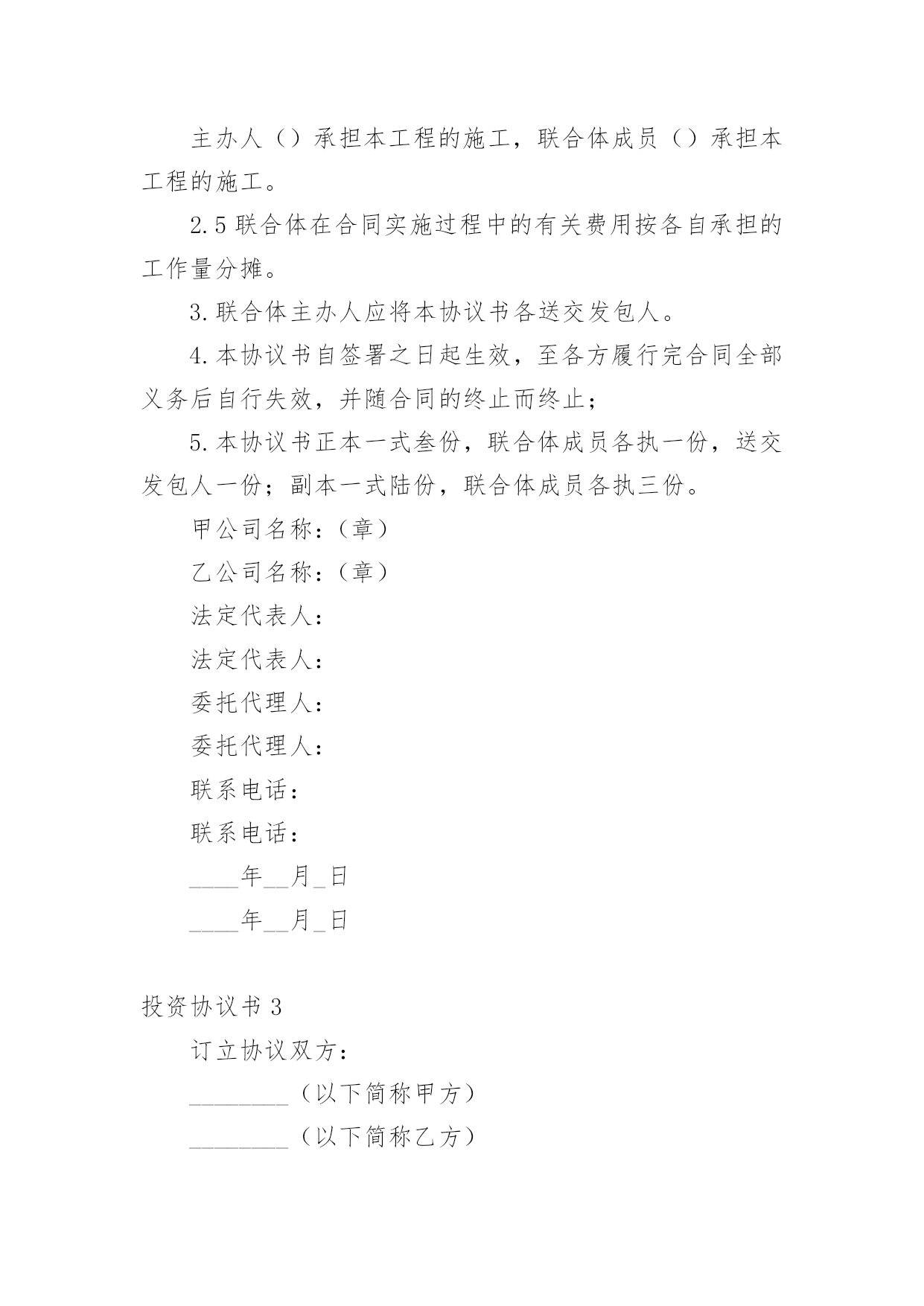 投资协议书在现在的社会生活中,男女老少都可能需要用到协议,签订了协议就有了法律依靠。那么你真正懂得怎么写好协议吗?下面是小编为大家收集的投资协议书,供大家参考借鉴,希望可以帮助到有需要的朋友。投资协议书1甲方:住所地:法定代表人:乙方:身份证号码:以上二方单称时为“本协议一方”,合称时为“本协议各方”。鉴于:甲方拟对_______________________项目进行项目投资,乙方意愿与甲方共同投资,以上各方经友好协商,根据法律法规的相关规定,本着互惠互利的原则,就甲乙各方投资份额、事务执行及利润分成等事宜达成如下协议,以共同遵守。第一条投资项目具体情况____________项目,位于__________________;项目甲方预计投资人民币____________万元,具体投资额以最终结算的投资额为准。第二条共同投资人的投资额和投资方式在项目预计总投资额中,甲方出资人民币_____________万元,占出资总额的_____;乙方出资人民币____________万元,占出资总额的______;总投资超过预计_____________万元的,各方同意按出资比例同时追加出资。第三条各方应按照项目开展进度要求,依据甲方指令按出资比例同时履行出资义务,各方出资应在______年___月___日或项目完成前支付全部出资。一方的出资应经另一方确认,并将资金汇入甲方指定的银行账户,出资后任何一方不得抽回投资。第四条利润分享和亏损分担各方按其出资额占出资总额的比例分享共同投资的利润,分担共同投资的亏损。投资项目债务先以共有财产偿还,共有财产不足偿还时,以出资额度为依据,按比例承担。第五条利润分配期限各方同意在项目最终清算后,被投资项目将投资利润分配给甲方后30天内,乙方可要求甲方按双方出资份额分享投资利润。第六条事务执行1、共同投资人委托甲方代表全体共同投资人执行共同投资的日常事务,包括但不限于管理执行投资日常事务,对外全权与第三方签订投资协议等法律文书。2、甲方以外的其他投资人有权了解共同投资的经营状况和财务状况,但不得干涉甲方对共同投资事宜的处理;3、甲方执行共同投资事务所产生的收益归全体共同投资人,所产生的亏损或者民事责任,由共同投资人承担;4、甲方在执行事务时如不遵守本协议而造成乙方损失时,甲方应承担赔偿责任;5、以下共同投资事务须由共同投资人同意即为有效:(1)投资人转让共同投资项目股份;(2)以上述股份对外出质。第七条投资的转让1、任一方均不得向共同投资人以外的人转让其在共同投资中的全部或部分出资额;2、各方之间转让在共同投资中的全部或部分投资额时,应当通知其他共同出资人,在同等条件下,其他共同投资人有优先受让的权利。第八条违约责任1、投资人未按期缴纳或缴足出资的,应当赔偿由此给其他投资人造成的损失;如果逾期十天仍未缴足出资,按退出投资项目处理。2、投资人私自以其在约定共同财产份额出质的,其行为无效或者作为退出投资项目处理,由此给其他投资人造成损失的,承担赔偿责任。按退出投资项目处理是指,将其已投入的出资额予以返还。第九条其他1、本协议未尽事宜由共同投资人协商一致后,另行签订补充协议。2、甲、乙双方之间如发生纠纷,应共同协商,本着有利于合伙投资事业发展的原则予以解决。如协商不成,可以向____________法院提起诉讼。甲方:______年___月___日乙方______年___月___日投资协议书2甲公司(全称):乙公司(全称):本协议书各方遵循平等、自愿、公平和诚实信用的原则,共同愿意组成联合体,实施、完成合同内容。现就下列有关事宜,订立本协议书。1.为联合体主办人,为联合体成员;2.联合体内部有关事项规定如下:2.1联合体由主办人负责与发包人联系;2.2合同工程一切工作由联合体主办人负责组织,由联合体各方按内部划分比例具体实施;2.3联合体将严格按照招标文件的各项要求,切实执行一切合同文件,共同承担合同约定的一切义务和责任,同时按照内部划分的职责,各自承担自身的责任和风险;2.4联合体内部各自按下列分工负责本项目施工工作:主办人()承担本工程的施工,联合体成员()承担本工程的施工。2.5联合体在合同实施过程中的有关费用按各自承担的工作量分摊。3.联合体主办人应将本协议书各送交发包人。4.本协议书自签署之日起生效,至各方履行完合同全部义务后自行失效,并随合同的终止而终止;5.本协议书正本一式叁份,联合体成员各执一份,送交发包人一份;副本一式陆份,联合体成员各执三份。甲公司名称:(章)乙公司名称:(章)法定代表人:法定代表人:委托代理人:委托代理人:联系电话:联系电话:____年__月_日____年__月_日投资协议书3订立协议双方:________(以下简称甲方)________(以下简称乙方)甲乙双方于20x