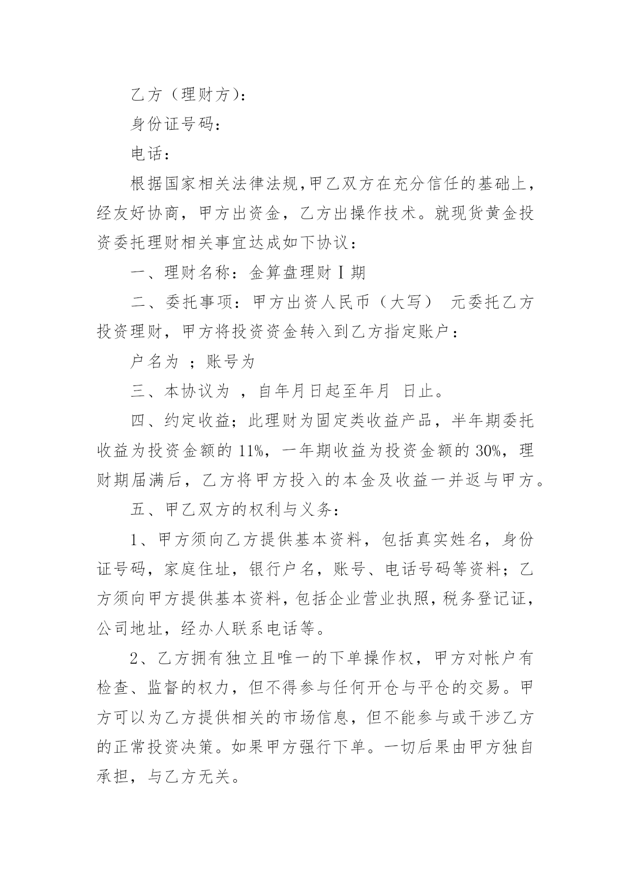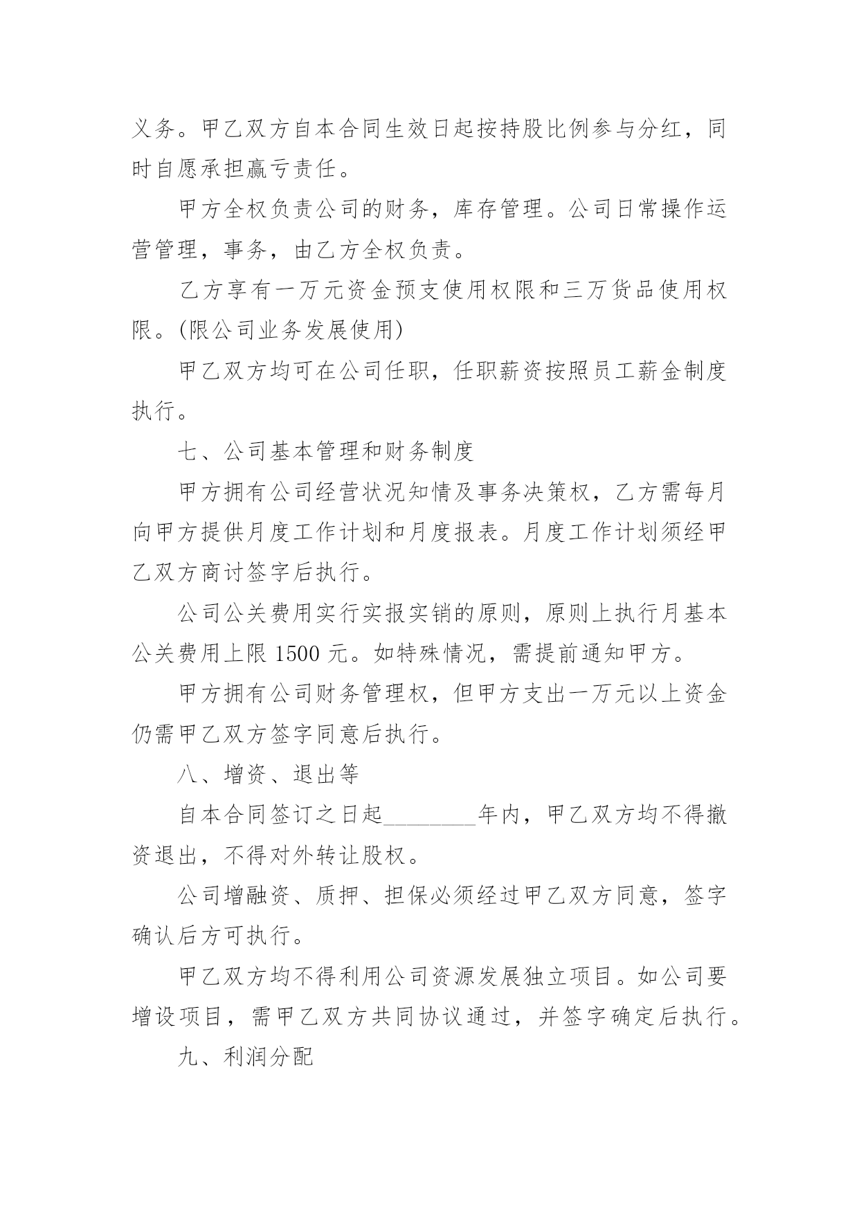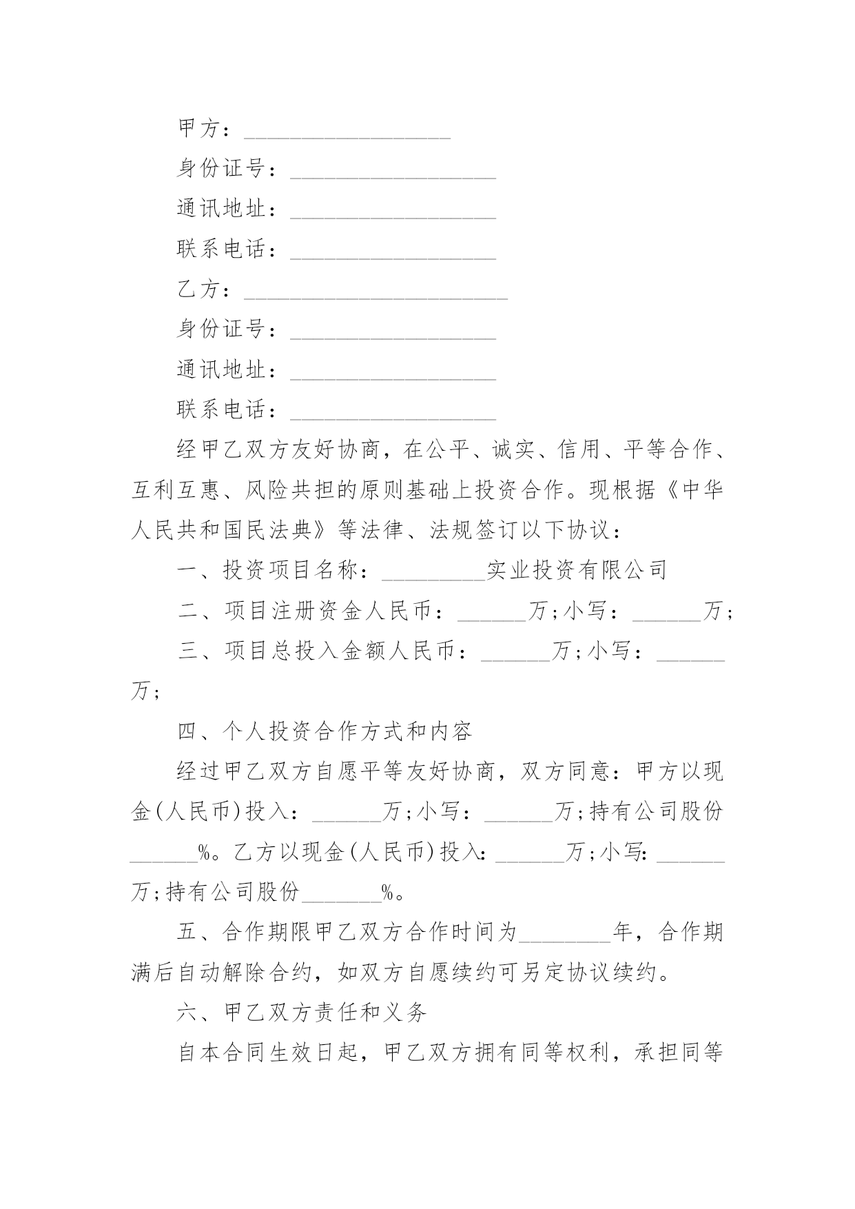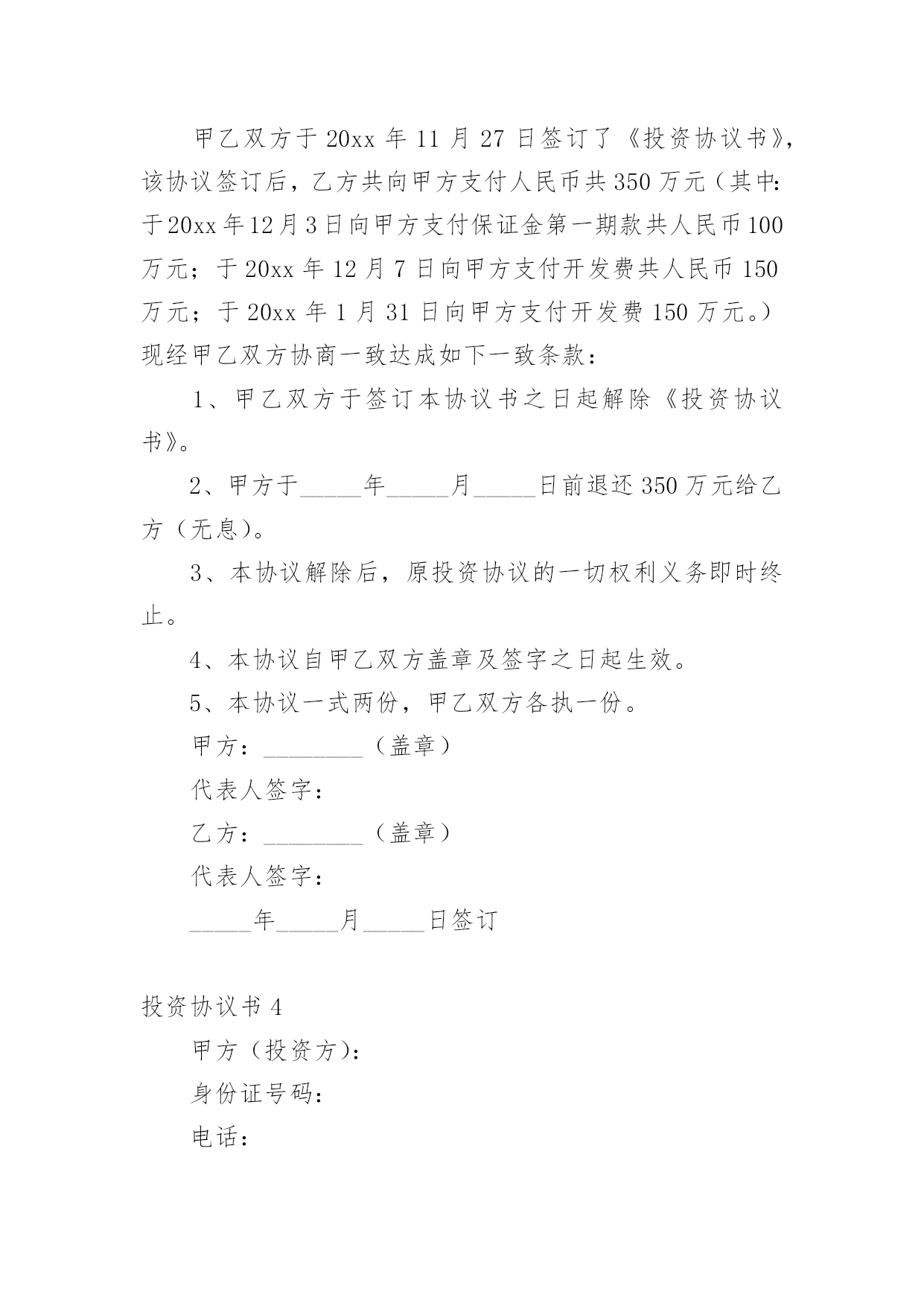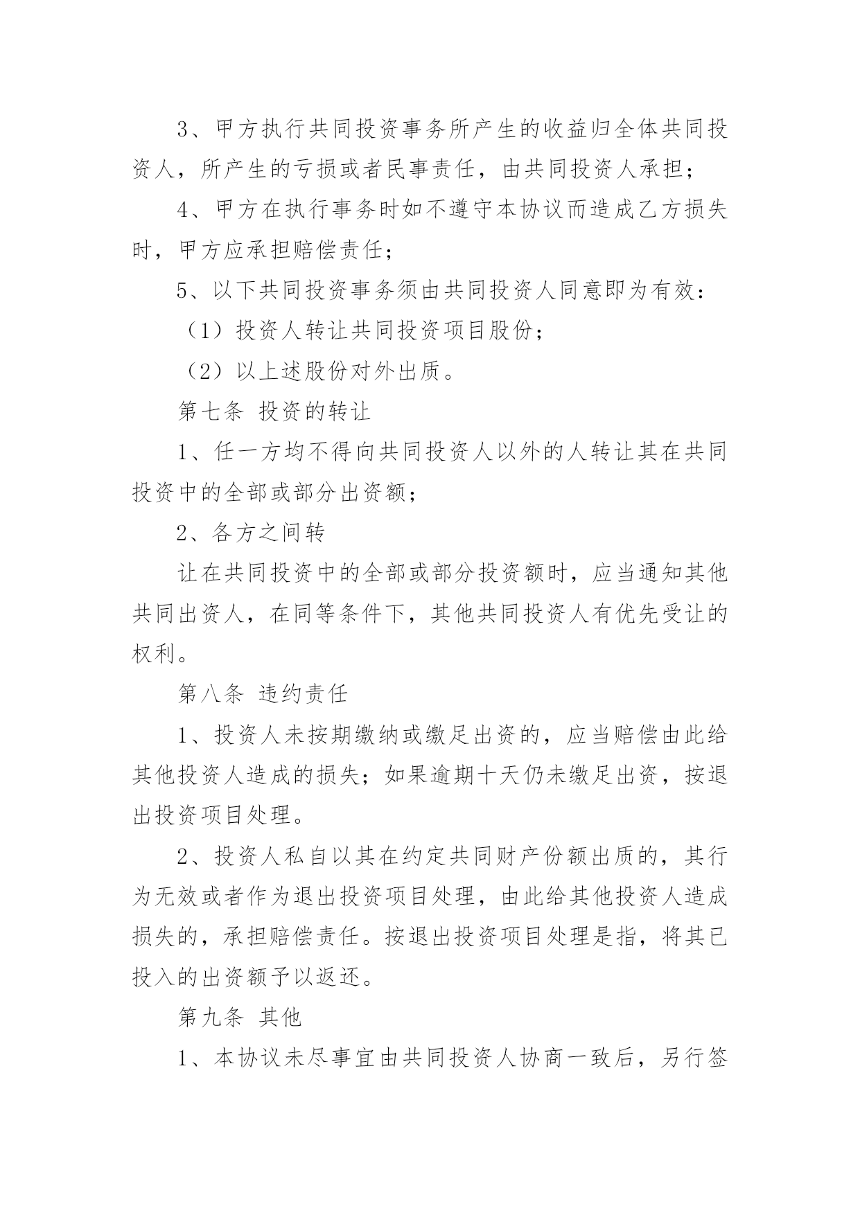 投资协议书在现在的社会生活中,男女老少都可能需要用到协议,签订了协议就有了法律依靠。那么你真正懂得怎么写好协议吗?下面是小编为大家收集的投资协议书,供大家参考借鉴,希望可以帮助到有需要的朋友。投资协议书1甲方:住所地:法定代表人:乙方:身份证号码:以上二方单称时为“本协议一方”,合称时为“本协议各方”。鉴于:甲方拟对_______________________项目进行项目投资,乙方意愿与甲方共同投资,以上各方经友好协商,根据法律法规的相关规定,本着互惠互利的原则,就甲乙各方投资份额、事务执行及利润分成等事宜达成如下协议,以共同遵守。第一条投资项目具体情况____________项目,位于__________________;项目甲方预计投资人民币____________万元,具体投资额以最终结算的投资额为准。第二条共同投资人的投资额和投资方式在项目预计总投资额中,甲方出资人民币_____________万元,占出资总额的_____;乙方出资人民币____________万元,占出资总额的______;总投资超过预计_____________万元的,各方同意按出资比例同时追加出资。第三条各方应按照项目开展进度要求,依据甲方指令按出资比例同时履行出资义务,各方出资应在______年___月___日或项目完成前支付全部出资。一方的出资应经另一方确认,并将资金汇入甲方指定的银行账户,出资后任何一方不得抽回投资。第四条利润分享和亏损分担各方按其出资额占出资总额的比例分享共同投资的利润,分担共同投资的亏损。投资项目债务先以共有财产偿还,共有财产不足偿还时,以出资额度为依据,按比例承担。第五条利润分配期限各方同意在项目最终清算后,被投资项目将投资利润分配给甲方后30天内,乙方可要求甲方按双方出资份额分享投资利润。第六条事务执行1、共同投资人委托甲方代表全体共同投资人执行共同投资的日常事务,包括但不限于管理执行投资日常事务,对外全权与第三方签订投资协议等法律文书。2、甲方以外的其他投资人有权了解共同投资的经营状况和财务状况,但不得干涉甲方对共同投资事宜的处理;3、甲方执行共同投资事务所产生的收益归全体共同投资人,所产生的亏损或者民事责任,由共同投资人承担;4、甲方在执行事务时如不遵守本协议而造成乙方损失时,甲方应承担赔偿责任;5、以下共同投资事务须由共同投资人同意即为有效:(1)投资人转让共同投资项目股份;(2)以上述股份对外出质。第七条投资的转让1、任一方均不得向共同投资人以外的人转让其在共同投资中的全部或部分出资额;2、各方之间转让在共同投资中的全部或部分投资额时,应当通知其他共同出资人,在同等条件下,其他共同投资人有优先受让的权利。第八条违约责任1、投资人未按期缴纳或缴足出资的,应当赔偿由此给其他投资人造成的损失;如果逾期十天仍未缴足出资,按退出投资项目处理。2、投资人私自以其在约定共同财产份额出质的,其行为无效或者作为退出投资项目处理,由此给其他投资人造成损失的,承担赔偿责任。按退出投资项目处理是指,将其已投入的出资额予以返还。第九条其他1、本协议未尽事宜由共同投资人协商一致后,另行签订补充协议。2、甲、乙双方之间如发生纠纷,应共同协商,本着有利于合伙投资事业发展的原则予以解决。如协商不成,可以向____________法院提起诉讼。甲方:______年___月___日乙方______年___月___日投资协议书2甲公司(全称):乙公司(全称):本协议书各方遵循平等、自愿、公平和诚实信用的原则,共同愿意组成联合体,实施、完成合同内容。现就下列有关事宜,订立本协议书。1.为联合体主办人,为联合体成员;2.联合体内部有关事项规定如下:2.1联合体由主办人负责与发包人联系;2.2合同工程一切工作由联合体主办人负责组织,由联合体各方按内部划分比例具体实施;2.3联合体将严格按照招标文件的各项要求,切实执行一切合同文件,共同承担合同约定的一切义务和责任,同时按照内部划分的职责,各自承担自身的责任和风险;2.4联合体内部各自按下列分工负责本项目施工工作:主办人()承担本工程的施工,联合体成员()承担本工程的施工。2.5联合体在合同实施过程中的有关费用按各自承担的工作量分摊。3.联合体主办人应将本协议书各送交发包人。4.本协议书自签署之日起生效,至各方履行完合同全部义务后自行失效,并随合同的终止而终止;5.本协议书正本一式叁份,联合体成员各执一份,送交发包人一份;副本一式陆份,联合体成员各执三份。甲公司名称:(章)乙公司名称:(章)法定代表人:法定代表人:委托代理人:委托代理人:联系电话:联系电话:____年__月_日____年__月_日投资协议书3订立协议双方:________(以下简称甲方)________(以下简称乙方)甲乙双方于20x