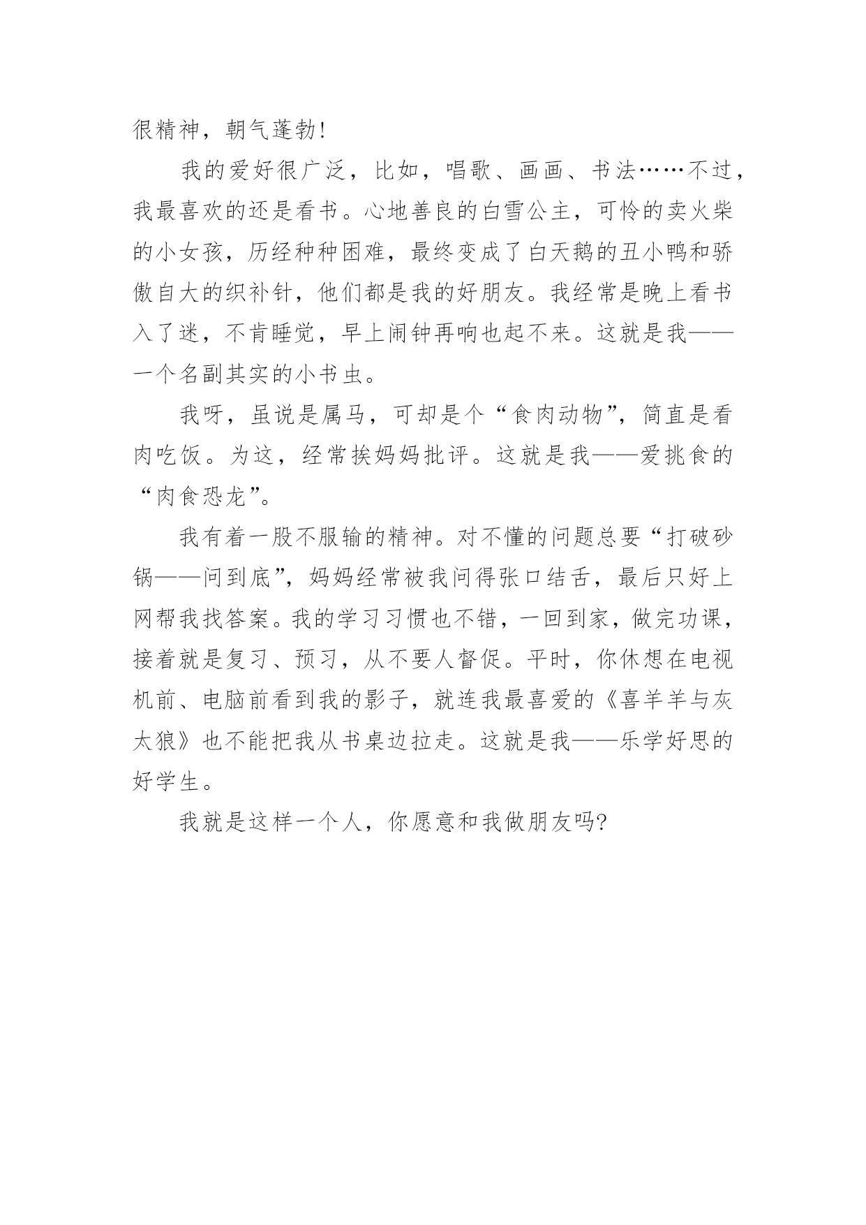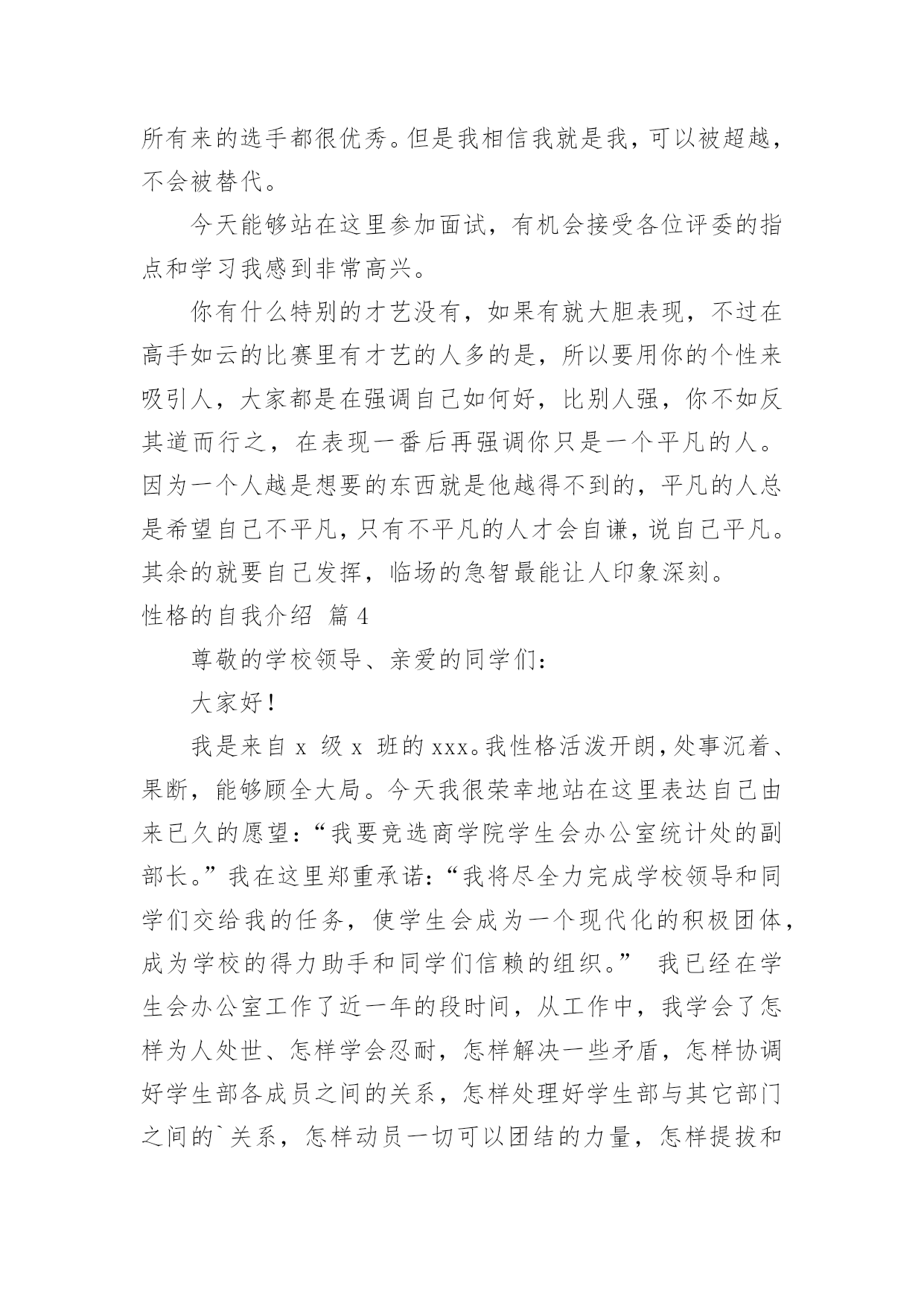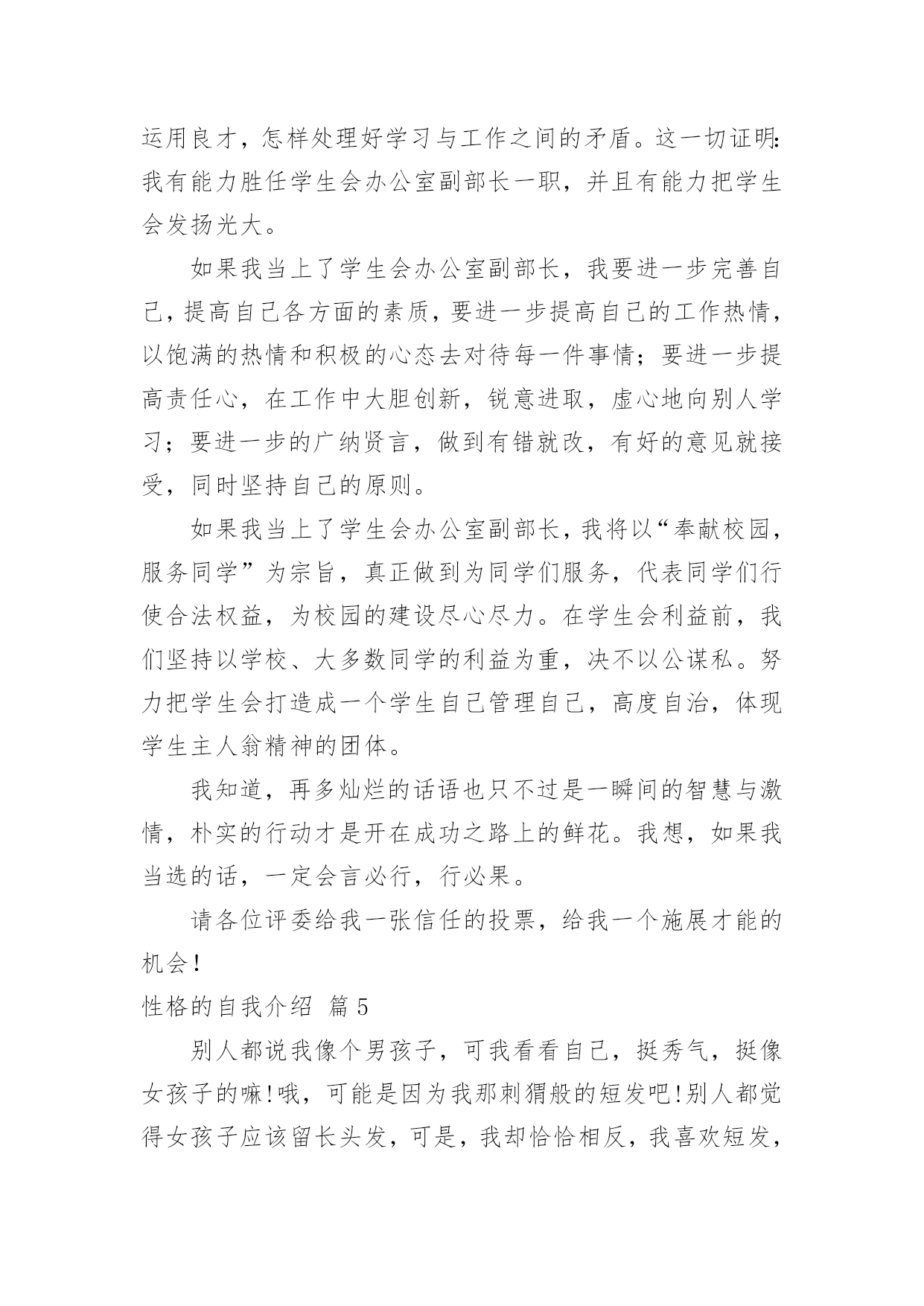 性格的自我介绍性格的自我介绍汇编5篇当碰到不熟悉的人时,我们难以避免地要作出自我介绍,自我介绍是结识新朋友的重要手段。那么自我介绍有什么格式呢?以下是小编帮大家整理的性格的自我介绍5篇,仅供参考,大家一起来看看吧。性格的自我介绍篇1性格外向,擅于同陌生人进行交流沟通,文笔流畅。具有良好的职业操守和集体荣誉意识,踏实肯干,虚心好学,有一定的抗压能力,能较快的适应环境并不断总结经验。熟悉工厂内部运作,很快处理生产生活中的突发事件。性格的自我介绍篇2我叫xx,在别人的影响中都说我冷若冰霜,缺乏幽默。多和我接触吧,你会体会到什么是冷幽默,什么是真正的幽默,而并非品位低俗的搞笑。我十分看重枝微末节,常为了小地方的完美而忽略了大局。我工作勤奋、重实际,我不仅慎重且具有乐于助人的天性,我具有服务精神,并充分享受施予的乐趣。性格的自我介绍篇3古有毛遂推荐自己。今有××自我推荐!各位评委好我叫××我平时就是个活泼开朗很爱说话的女孩同学关系处得不错,学习也蛮好,爱好也蛮多。总而言之,言而总之本·股票·颇具竞争力,可称之为·潜力股中的黑马。我知所有来的选手都很优秀。但是我相信我就是我,可以被超越,不会被替代。今天能够站在这里参加面试,有机会接受各位评委的指点和学习我感到非常高兴。你有什么特别的才艺没有,如果有就大胆表现,不过在高手如云的比赛里有才艺的人多的是,所以要用你的个性来吸引人,大家都是在强调自己如何好,比别人强,你不如反其道而行之,在表现一番后再强调你只是一个平凡的人。因为一个人越是想要的东西就是他越得不到的,平凡的人总是希望自己不平凡,只有不平凡的人才会自谦,说自己平凡。其余的就要自己发挥,临场的急智最能让人印象深刻。性格的自我介绍篇4尊敬的学校领导、亲爱的同学们:大家好!我是来自x级x班的xxx。我性格活泼开朗,处事沉着、果断,能够顾全大局。今天我很荣幸地站在这里表达自己由来已久的愿望:“我要竞选商学院学生会办公室统计处的副部长。”我在这里郑重承诺:“我将尽全力完成学校领导和同学们交给我的任务,使学生会成为一个现代化的积极团体,成为学校的得力助手和同学们信赖的组织。”我已经在学生会办公室工作了近一年的段时间,从工作中,我学会了怎样为人处世、怎样学会忍耐,怎样解决一些矛盾,怎样协调好学生部各成员之间的关系,怎样处理好学生部与其它部门之间的`关系,怎样动员一切可以团结的力量,怎样提拔和运用良才,怎样处理好学习与工作之间的矛盾。这一切证明:我有能力胜任学生会办公室副部长一职,并且有能力把学生会发扬光大。如果我当上了学生会办公室副部长,我要进一步完善自己,提高自己各方面的素质,要进一步提高自己的工作热情,以饱满的热情和积极的心态去对待每一件事情;要进一步提高责任心,在工作中大胆创新,锐意进取,虚心地向别人学习;要进一步的广纳贤言,做到有错就改,有好的意见就接受,同时坚持自己的原则。如果我当上了学生会办公室副部长,我将以“奉献校园,服务同学”为宗旨,真正做到为同学们服务,代表同学们行使合法权益,为校园的建设尽心尽力。在学生会利益前,我们坚持以学校、大多数同学的利益为重,决不以公谋私。努力把学生会打造成一个学生自己管理自己,高度自治,体现学生主人翁精神的团体。我知道,再多灿烂的话语也只不过是一瞬间的智慧与激情,朴实的行动才是开在成功之路上的鲜花。我想,如果我当选的话,一定会言必行,行必果。请各位评委给我一张信任的投票,给我一个施展才能的机会!性格的自我介绍篇5别人都说我像个男孩子,可我看看自己,挺秀气,挺像女孩子的嘛!哦,可能是因为我那刺猬般的短发吧!别人都觉得女孩子应该留长头发,可是,我却恰恰相反,我喜欢短发,很精神,朝气蓬勃!我的爱好很广泛,比如,唱歌、画画、书法……不过,我最喜欢的还是看书。心地善良的白雪公主,可怜的卖火柴的小女孩,历经种种困难,最终变成了白天鹅的丑小鸭和骄傲自大的织补针,他们都是我的好朋友。我经常是晚上看书入了迷,不肯睡觉,早上闹钟再响也起不来。这就是我——一个名副其实的小书虫。我呀,虽说是属马,可却是个“食肉动物”,简直是看肉吃饭。为这,经常挨妈妈批评。这就是我——爱挑食的“肉食恐龙”。我有着一股不服输的精神。对不懂的问题总要“打破砂锅——问到底”,妈妈经常被我问得张口结舌,最后只好上网帮我找答案。我的学习习惯也不错,一回到家,做完功课,接着就是复习、预习,从不要人督促。平时,你休想在电视机前、电脑前看到我的影子,就连我最喜爱的《喜羊羊与灰太狼》也不能把我从书桌边拉走。这就是我——乐学好思的好学生。我就是这样一个人,你愿意和我做朋友吗?