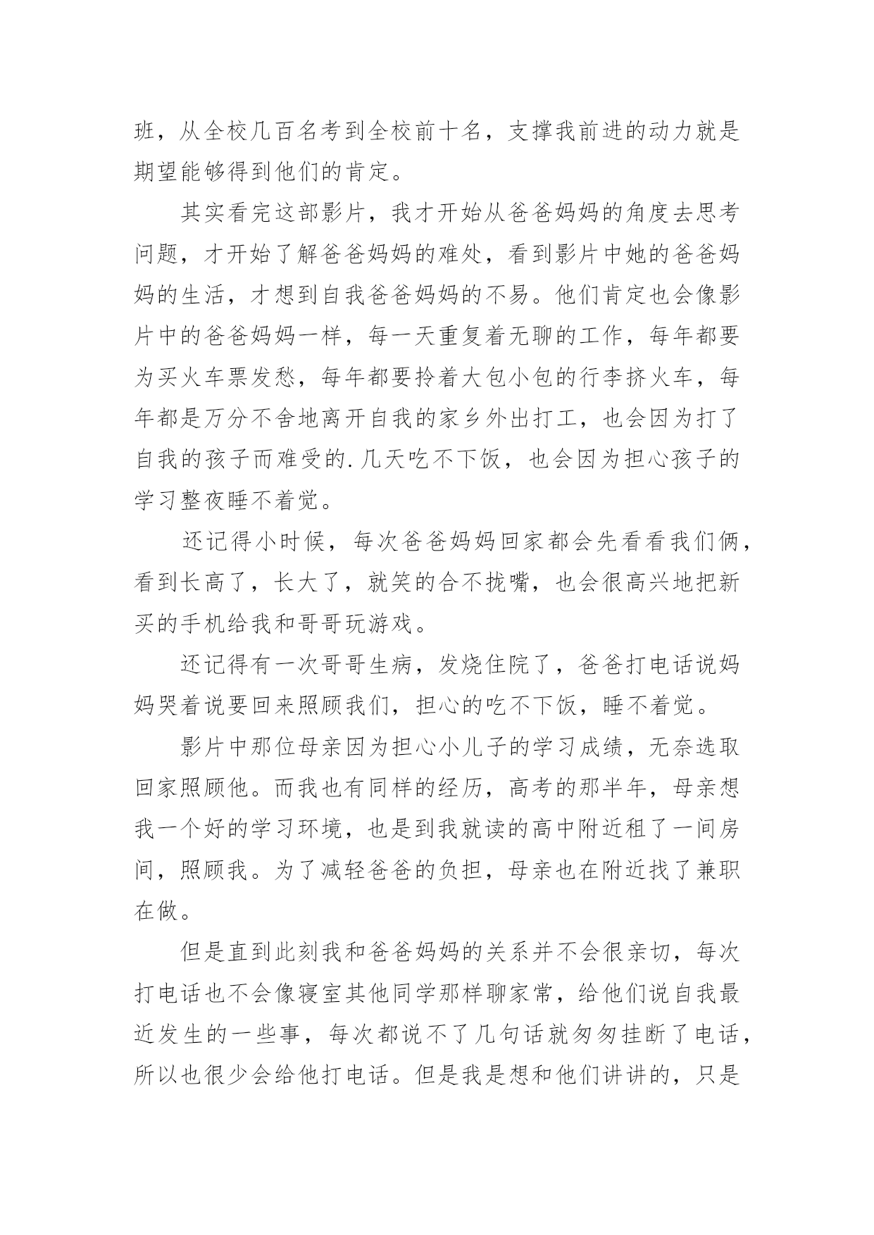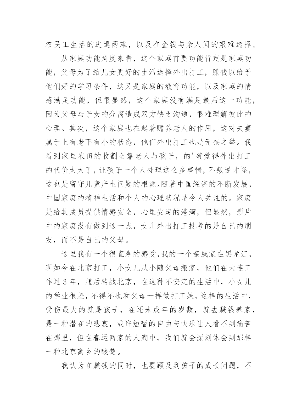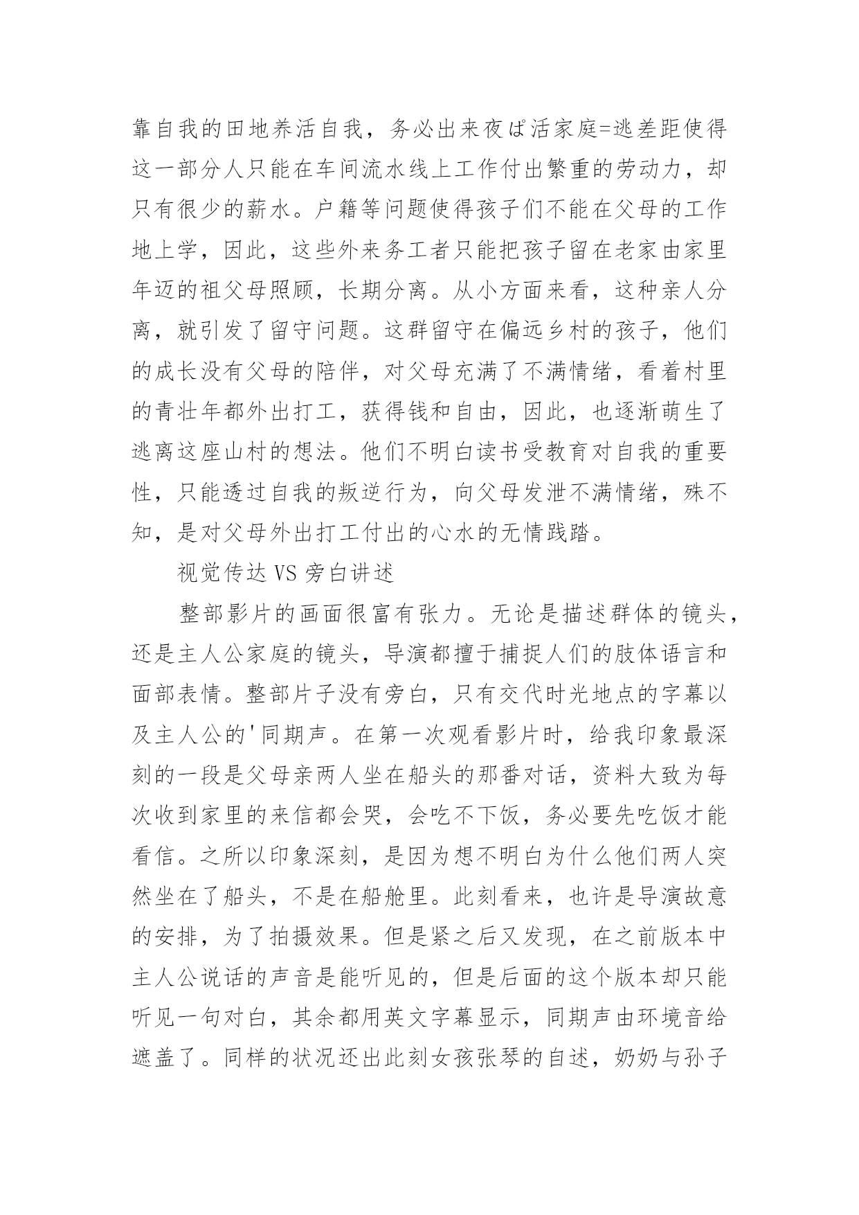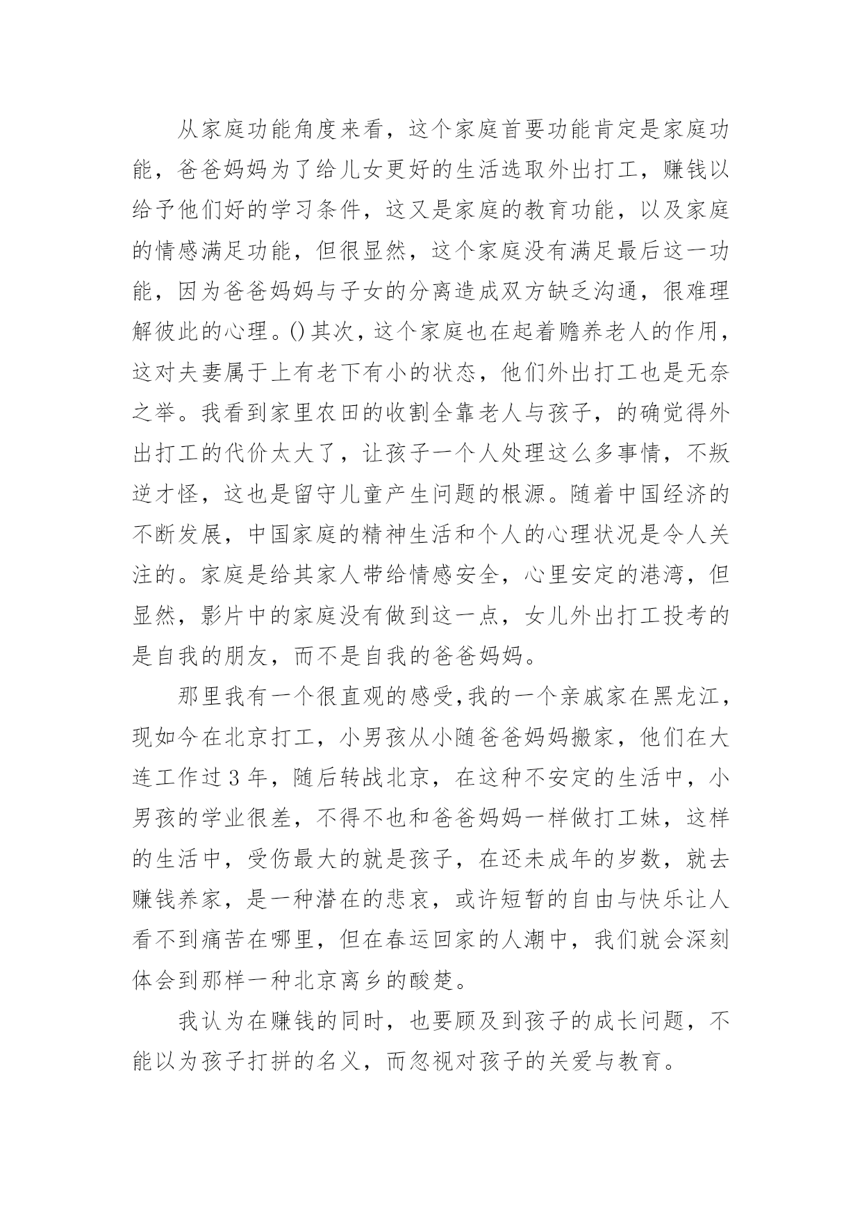 归途列车观后感归途列车观后感【优选8篇】在观看完一部作品以后,相信大家一定领会了不少东西,每个观看完影片的人都有不一样的感受与想法。那么我们如何去写观后感呢?下面是小编收集整理的归途列车观后感,欢迎阅读,希望大家能够喜欢。归途列车观后感1在看这部电影之前,我先是搜了一下简介。一下子就被吸引住了,就感觉电影里的故事背景和我家里及其的相似。从这部电影里面,我看到了自我的影子,看到了我父母的影子。或许其他同学看完这部电影之后,有的是感动和同情,而我看完之后,却是心疼和无奈。我的父亲在这二十年里是一向在外打工,我的母亲是在我上的那一年也外出打工了。直到此刻我上大三,依旧还是在外地打工。每年也就是在春节的时候回家,但是在家最多也不会超过二十天。我的爷爷在我出生的那一年就去世了,所以这么多年我和我哥哥都是和奶奶生活在一齐。说实话,我对父母也是没有太深的感情的。虽然没有像电影中的那个小女孩那样叛逆,但是在我上的时候,也在心底抱怨过,为什么别人的父母都能在自我的身边,而我没有,也就是这样,我慢慢的不喜欢和父母讲我的心事,总是一个人承受着。我想电影中的那个女孩子可能也是这样吧,从小不在父母身边,不明白怎样和父母交流,不明白如何表达自我的心事,所以一交流就会吵起来,甚至还会大打出手。我想我是理解她的,她这样闹腾也只是想让父母更加关心自我。想想我小时候,也是这样的心态,但是并没有选取像她这样的方式,我觉得只要我成绩考得好,就会得到他们的肯定,这样他们就会关心我了。所以我从初中到都一向十分努力得学习,从普通班考到竞赛班,从全校几百名考到全校前十名,支撑我前进的动力就是期望能够得到他们的肯定。其实看完这部电影,我才开始从父母的角度去思考问题,才开始了解父母的难处,看到电影中她的父母的生活,才想到自我父母的不易。他们肯定也会像电影中的父母一样,每一天重复着无聊的工作,每年都要为买火车票发愁,每年都要拎着大包小包的行李挤火车,每年都是万分不舍地离开自我的家乡外出打工,也会因为打了自我的孩子而难受的.几天吃不下饭,也会因为担心孩子的学习整夜睡不着觉。还记得小时候,每次父母回家都会先看看我们俩,看到长高了,长大了,就笑的合不拢嘴,也会很高兴地把新买的手机给我和哥哥玩游戏。还记得有一次哥哥生病,发烧住院了,爸爸打电话说妈妈哭着说要回来照顾我们,担心的吃不下饭,睡不着觉。电影中那位母亲因为担心小儿子的学习成绩,无奈选取回家照顾他。而我也有同样的经历,的那半年,母亲想我一个好的学习环境,也是到我就读的高中附近租了一间房间,照顾我。为了减轻父亲的负担,母亲也在附近找了兼职在做。但是直到此刻我和父母的关系并不会很亲切,每次打电话也不会像寝室其他同学那样聊家常,给他们说自我最近发生的一些事,每次都说不了几句话就匆匆挂断了电话,所以也很少会给他打电话。但是我是想和他们讲讲的,只是不明白从何说起。也许,这就是留守儿童的无奈吧。归途列车观后感2全片有两次出现春运大军的镜头,一段是在开头20xx年春运,一段是在中间部分20xx年春运。导演透过春运作为切入点来讲述春运背后的人和事。片子的主线是讲述一户外来务工者的家庭,透过这个家庭来表现这整批人群的特点。父母亲一代在外打工赚钱,孩子留在老家上学由祖父母带。能够看到在这群人当中,父母亲与孩子的交流是微乎极微的,他们期望自我能多赚钱让孩子继续读书有一个好的未来,但是在孩子们心中,始终认为父母是为了钱才离开他们,父母对自我的照料养育远不及祖父母。因此,片中的小女孩张琴才会有各种叛逆的举动,纠其根本就是一种向父母发泄不满情绪的方式。女孩的叛逆全过程,摄像机完完全全地纪录了下来。其叛逆情绪的高潮,也就是整个片子的高潮,在67分钟的时候,女孩顶撞父亲,父亲出手打女孩。所以,从整体来看,春运大潮只是一个现象,在这个现象背后的暴露出的各种问题才是这部片子想表达的东西。从大方面来看,有中国社会存在的贫富差距问题,农民不能依靠自我的田地养活自我,务必出来夜ぱ活家庭=逃差距使得这一部分人只能在车间流水线上工作付出繁重的劳动力,却只有很少的薪水。户籍等问题使得孩子们不能在父母的工作地上学,因此,这些外来务工者只能把孩子留在老家由家里年迈的祖父母照顾,长期分离。从小方面来看,这种亲人分离,就引发了留守问题。这群留守在偏远乡村的孩子,他们的成长没有父母的陪伴,对父母充满了不满情绪,看着村里的青壮年都外出打工,获得钱和自由,因此,也逐渐萌生了逃离这座山村的想法。他们不明白读书受教育对自我的重要性,只能透过自我的叛逆行为,向父母发泄不满情绪,殊不知,是对父母外出打工付出的心水的无情践踏。视觉传达VS旁白讲述整部影片的画面很富有张力。无论是描述群体的镜头,还是主人公家庭的镜头,导演都擅于捕捉人们的肢体语言和面部表情。整部片子没有旁白,只有交代时光地点的字幕以及主
