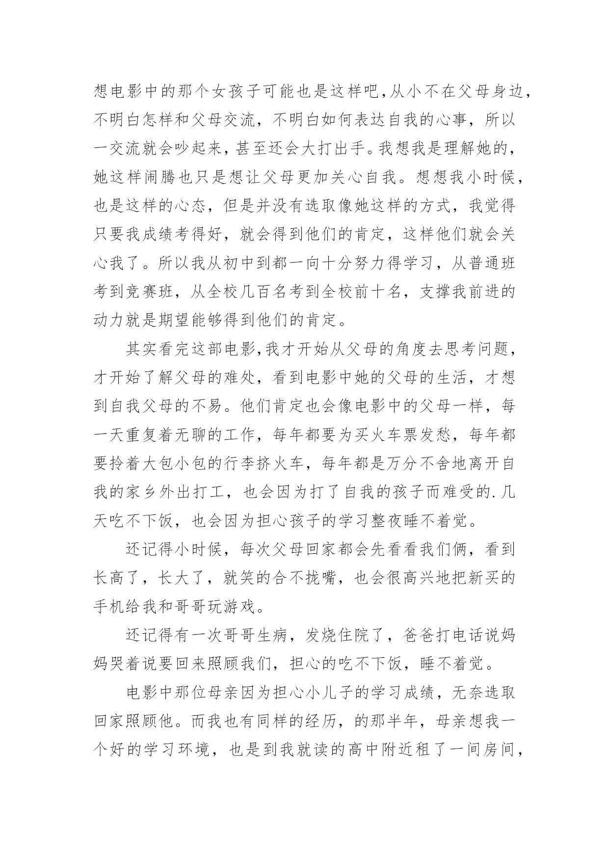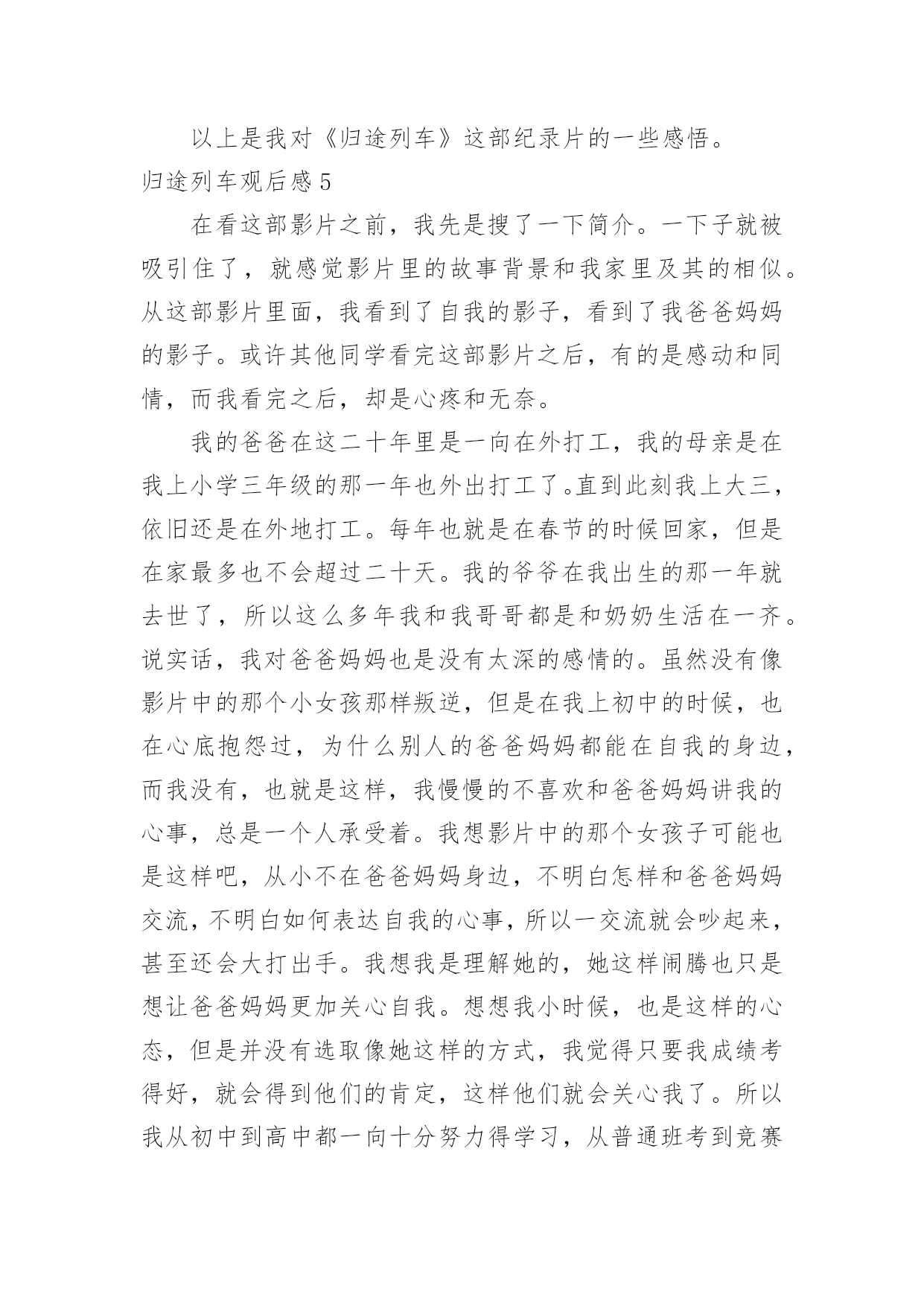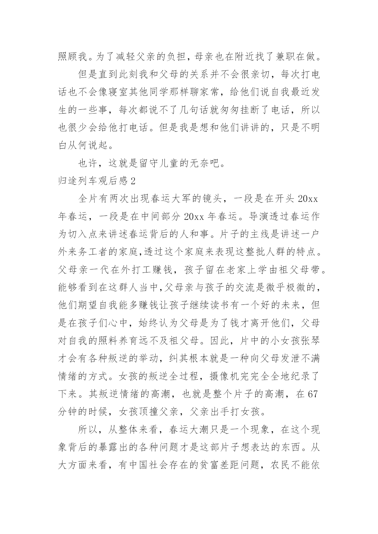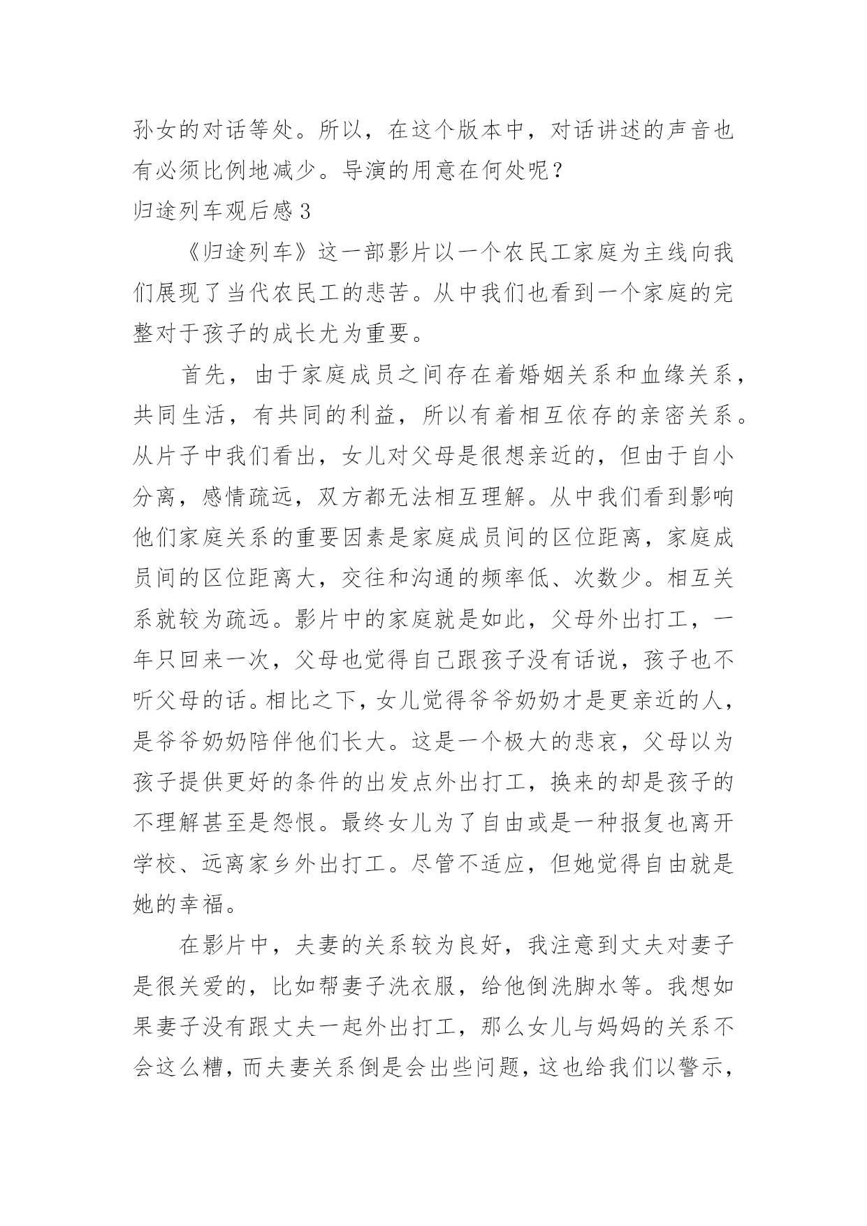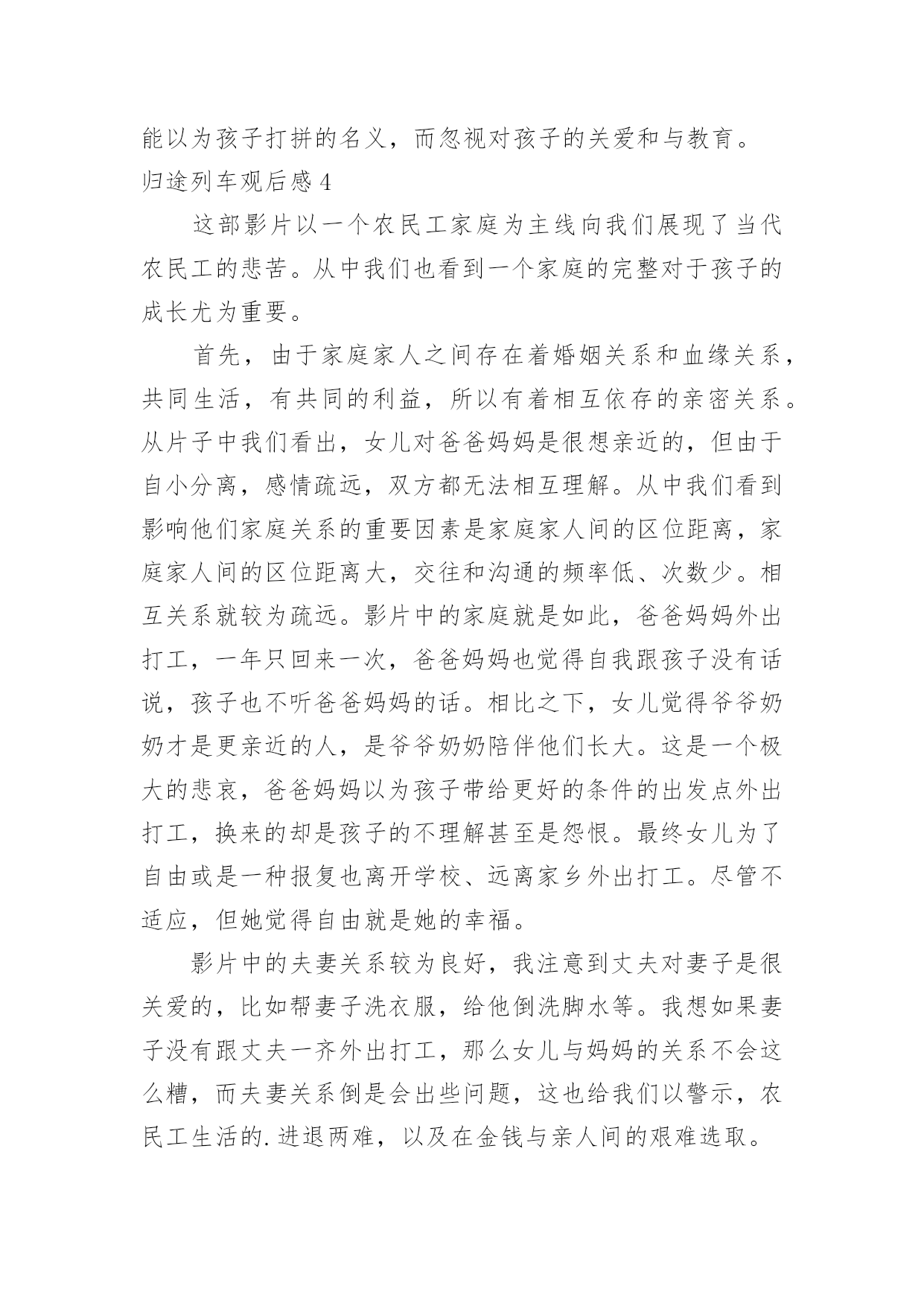 归途列车观后感归途列车观后感【优选8篇】在观看完一部作品以后,相信大家一定领会了不少东西,每个观看完影片的人都有不一样的感受与想法。那么我们如何去写观后感呢?下面是小编收集整理的归途列车观后感,欢迎阅读,希望大家能够喜欢。归途列车观后感1在看这部电影之前,我先是搜了一下简介。一下子就被吸引住了,就感觉电影里的故事背景和我家里及其的相似。从这部电影里面,我看到了自我的影子,看到了我父母的影子。或许其他同学看完这部电影之后,有的是感动和同情,而我看完之后,却是心疼和无奈。我的父亲在这二十年里是一向在外打工,我的母亲是在我上的那一年也外出打工了。直到此刻我上大三,依旧还是在外地打工。每年也就是在春节的时候回家,但是在家最多也不会超过二十天。我的爷爷在我出生的那一年就去世了,所以这么多年我和我哥哥都是和奶奶生活在一齐。说实话,我对父母也是没有太深的感情的。虽然没有像电影中的那个小女孩那样叛逆,但是在我上的时候,也在心底抱怨过,为什么别人的父母都能在自我的身边,而我没有,也就是这样,我慢慢的不喜欢和父母讲我的心事,总是一个人承受着。我想电影中的那个女孩子可能也是这样吧,从小不在父母身边,不明白怎样和父母交流,不明白如何表达自我的心事,所以一交流就会吵起来,甚至还会大打出手。我想我是理解她的,她这样闹腾也只是想让父母更加关心自我。想想我小时候,也是这样的心态,但是并没有选取像她这样的方式,我觉得只要我成绩考得好,就会得到他们的肯定,这样他们就会关心我了。所以我从初中到都一向十分努力得学习,从普通班考到竞赛班,从全校几百名考到全校前十名,支撑我前进的动力就是期望能够得到他们的肯定。其实看完这部电影,我才开始从父母的角度去思考问题,才开始了解父母的难处,看到电影中她的父母的生活,才想到自我父母的不易。他们肯定也会像电影中的父母一样,每一天重复着无聊的工作,每年都要为买火车票发愁,每年都要拎着大包小包的行李挤火车,每年都是万分不舍地离开自我的家乡外出打工,也会因为打了自我的孩子而难受的.几天吃不下饭,也会因为担心孩子的学习整夜睡不着觉。还记得小时候,每次父母回家都会先看看我们俩,看到长高了,长大了,就笑的合不拢嘴,也会很高兴地把新买的手机给我和哥哥玩游戏。还记得有一次哥哥生病,发烧住院了,爸爸打电话说妈妈哭着说要回来照顾我们,担心的吃不下饭,睡不着觉。电影中那位母亲因为担心小儿子的学习成绩,无奈选取回家照顾他。而我也有同样的经历,的那半年,母亲想我一个好的学习环境,也是到我就读的高中附近租了一间房间,照顾我。为了减轻父亲的负担,母亲也在附近找了兼职在做。但是直到此刻我和父母的关系并不会很亲切,每次打电话也不会像寝室其他同学那样聊家常,给他们说自我最近发生的一些事,每次都说不了几句话就匆匆挂断了电话,所以也很少会给他打电话。但是我是想和他们讲讲的,只是不明白从何说起。也许,这就是留守儿童的无奈吧。归途列车观后感2全片有两次出现春运大军的镜头,一段是在开头20xx年春运,一段是在中间部分20xx年春运。导演透过春运作为切入点来讲述春运背后的人和事。片子的主线是讲述一户外来务工者的家庭,透过这个家庭来表现这整批人群的特点。父母亲一代在外打工赚钱,孩子留在老家上学由祖父母带。能够看到在这群人当中,父母亲与孩子的交流是微乎极微的,他们期望自我能多赚钱让孩子继续读书有一个好的未来,但是在孩子们心中,始终认为父母是为了钱才离开他们,父母对自我的照料养育远不及祖父母。因此,片中的小女孩张琴才会有各种叛逆的举动,纠其根本就是一种向父母发泄不满情绪的方式。女孩的叛逆全过程,摄像机完完全全地纪录了下来。其叛逆情绪的高潮,也就是整个片子的高潮,在67分钟的时候,女孩顶撞父亲,父亲出手打女孩。所以,从整体来看,春运大潮只是一个现象,在这个现象背后的暴露出的各种问题才是这部片子想表达的东西。从大方面来看,有中国社会存在的贫富差距问题,农民不能依靠自我的田地养活自我,务必出来夜ぱ活家庭=逃差距使得这一部分人只能在车间流水线上工作付出繁重的劳动力,却只有很少的薪水。户籍等问题使得孩子们不能在父母的工作地上学,因此,这些外来务工者只能把孩子留在老家由家里年迈的祖父母照顾,长期分离。从小方面来看,这种亲人分离,就引发了留守问题。这群留守在偏远乡村的孩子,他们的成长没有父母的陪伴,对父母充满了不满情绪,看着村里的青壮年都外出打工,获得钱和自由,因此,也逐渐萌生了逃离这座山村的想法。他们不明白读书受教育对自我的重要性,只能透过自我的叛逆行为,向父母发泄不满情绪,殊不知,是对父母外出打工付出的心水的无情践踏。视觉传达VS旁白讲述整部影片的画面很富有张力。无论是描述群体的镜头,还是主人公家庭的镜头,导演都擅于捕捉人们的肢体语言和面部表情。整部片子没有旁白,只有交代时光地点的字幕以及主