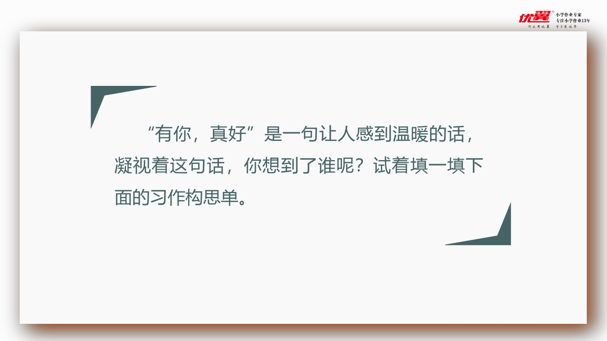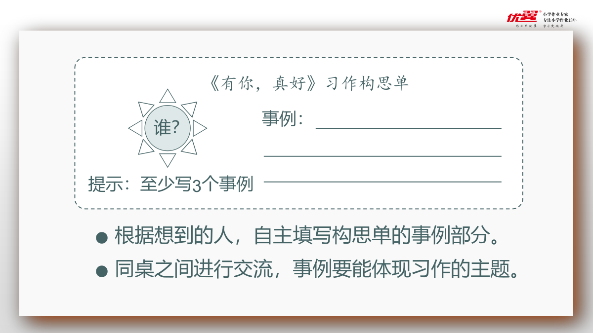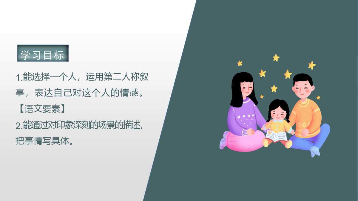 1.能选择一个人,运用第二人称叙事,表达自己对这个人的情感。【语文要素】2.能通过对印象深刻的场景的描述,把事情写具体。“有你,真好”是一句让人感到温暖的话,凝视着这句话,你想到了谁呢?试着填一填下面的习作构思单。◎在你遇到困难的时候,是()帮助了你。优化写作素材,将“好”的事例,简要地写在稿纸上。你觉得本次习作的难点是什么?你要相信,你是最棒的!来,我们一块儿改错题。”我信服地点了点头,就和你一块儿改正了错题。从此我在课堂上认真听讲,在家里抓紧时间复习。终于,功夫不负有心人。期末考试,我胜利了,考出了一