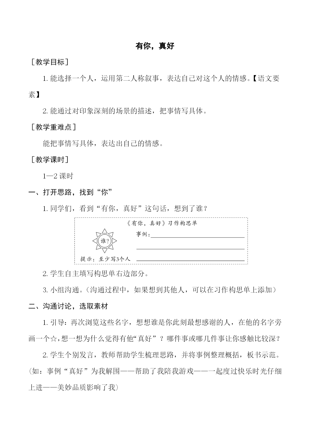 有你,真好[教学目标]1.能选择一个人,运用第二人称叙事,表达自己对这个人的情感。【语文要素】2.能通过对印象深刻的场景的描述,把事情写具体。[教学重难点]能把事情写具体,表达出自己的情感。[教学课时]1—2课时一、打开思路,找到“你”1.同学们,看到“有你,真好”这句话,想到了谁?2.学生自主填写构思单右边部分。3.小组沟通。(沟通过程中,如果想到其他人,可以在习作构思单上添加)二、沟通讨论,选取素材1.引导:再次浏览这些名字,想想谁是你此刻最想感谢的人,在他的名字旁画一个☆,想一想为什么觉得有他“真好