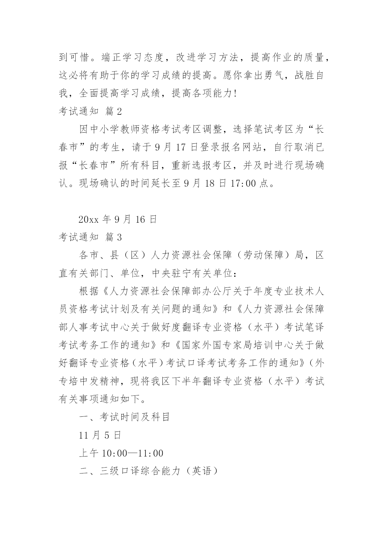 考试通知关于考试通知集合五篇在快速变化和不断变革的今天,很多地方都会使用到通知,法规性文件经有关部门制定以后,需要用通知的形式予以发布。为了让您在写通知时更加简单方便,下面是小编为大家整理的考试通知5篇,仅供参考,大家一起来看看吧。考试通知篇11.你是一个乖巧听话的孩子,尊敬老师,与同学们和睦相处;你勤学好问,爱动脑筋;你热爱班级,关心爱护集体荣誉;热心助人,坚强勇敢,爱劳动,讲卫生。老师一直为你有很强的学习积极性而高兴;当然也为你所取得的成绩感到高兴,但是你总是跌倒在同一个地方,是否自己应该多加思考,找出原因?2.你是位头脑灵活的学生,性格很坚强,用自己的行动来表明你要变成一个好学生的决心。你能合理地安排作息时间,不为各种言行左右,把精力放在学习上,让师长放心,成绩有进步,能力也有了提高,更重要的是探索出了一条适合自己的道路。继续认真努力吧,相信自己的能力和智慧。3.该生学习刻苦态度端正认真成绩优异喜欢团结同学热爱劳动平时能够严格的要求自己上课能够认真听讲听老师的话有自己的学习计划和错题本这点对于日后的高3复习是很有帮助的在高考前夕错题本是非常有利的帮手相信有了它你一定会在高考中取得良好的成绩另外希望你可以树立一个较为长远的目标有了目标学习才有动力你才会为之努力奋斗为之刻苦钻研希望你在今后的学习中再接再厉4.你本学期以来,上课能认真听讲,积极回答问题,你有非常优秀的领悟力和理解力,思路开阔,想象丰富,兴趣广泛。整洁大方,彬彬有礼,沉稳文静,有思想深度。学习成绩有进步,成为班上较多女生的学习榜样。但女生迟到的人中你出现的概率较大,老师真诚希望你时时处处能向先进同学看齐,早日成为一名品学兼优的学生。5.近来,从你的一些行为和言语中老师感觉到你有一些自卑,这使老师感到有些不安。贫穷只是暂时的,人不能穷一辈子,况且目前经济上的贫困还不足以成为你学习的障碍。然而自卑会是绊脚石,它会阻碍你的进步和你今后的发展的。老师希望你能化自卑为自信,化苦恼为动力,相信你的明天会更灿烂。6.你是一个极富钻研精神的学生,在很多方面都显示了你的聪明才智。勤恳的你每步都走得很踏实,如果能更加主动积极的探索总结规律,平衡的去统筹安排各科的学习,更加全面地发展自己,相信你会有更加出色的表现。7.一学期以来你为班级做了很多工作,辛苦了。担任班干部相对会累点,作为班主任我理解你,也感谢你。你工作主动、热情,办事利索,能出色完成老师交给的各项任务;你,俭朴的`生活作风,也令大家敬佩。你热爱班级,乐于助人,尊敬师长,团结同学……你的优点大家有目共睹。在德智体各个方面你都做得不错,在班里也能起到先锋模范作用,这是很可贵的。但你成绩不太突出,还须加把劲,继续努力,争取更大进步,要知道学习犹如逆水行舟,不进则退。希望你能再接再厉,力争更好的成绩,相信只要你坚持下去,一定会有更大的收获。8.你是个文静懂事的女孩,踏实、稳重、有礼貌;诚实、热情,尊敬师长,关心集体,学习自觉是你最突出的优点。在班里并不显眼,却时刻起着模范带头作用,给同学们作出表率。上课能专心听讲,注意力集中。你的学习目的很明确,态度也很认真。希望你今后朝着精益求精,扩大自己的知识面,讲究更有效的学习方法方向努力,争创更佳成绩!9.你为人随和,关心集体、尊重他人、善与他人合作,你的身边总有很多的朋友。你有强烈的上进心,对自己期望值很高,学习努力,理解力强,你有良好的思维能力,有思想深度。但是你缺少恒心和毅力,因而成绩不太稳定。你现在在学习上多下苦功夫,将来就会少吃些苦,开劈自己人生的道路不能借助别人的力量,要克服自身的浮躁情绪,认认真真做事,踏踏实实做人,一步一个脚印的去实现自己的人生目标。10.你平时能积极参加体育锻炼和有益的文娱活动。但容易受到不良思想的影响,要提高自身的分析辨别能力。纪律观念不够强,要求自己比较随便。学习成绩不容乐观,需努力提高学习成绩。作业拖拖拉拉、马马虎虎,老师为你感到可惜。端正学习态度,改进学习方法,提高作业的质量,这必将有助于你的学习成绩的提高。愿你拿出勇气,战胜自我,全面提高学习成绩,提高各项能力!考试通知篇2因中小学教师资格考试考区调整,选择笔试考区为“长春市”的考生,请于9月17日登录报名网站,自行取消已报“长春市”所有科目,重新选报考区,并及时进行现场确认。现场确认的时间延长至9月18日17:00点。20xx年9月16日考试通知篇3各市、县(区)人力资源社会保障(劳动保障)局,区直有关部门、单位,中央驻宁有关单位:根据《人力资源社会保障部办公厅关于年度专业技术人员资格考试计划及有关问题的通知》和《人力资源社会保障部人事考试中心关于做好度翻译专业资格(水平)考试笔译考试考务工作的通知》和《国家外国专家局培训中心关于做好翻译专业资格(水平)考试口译考试考务工作的通知》(外专培