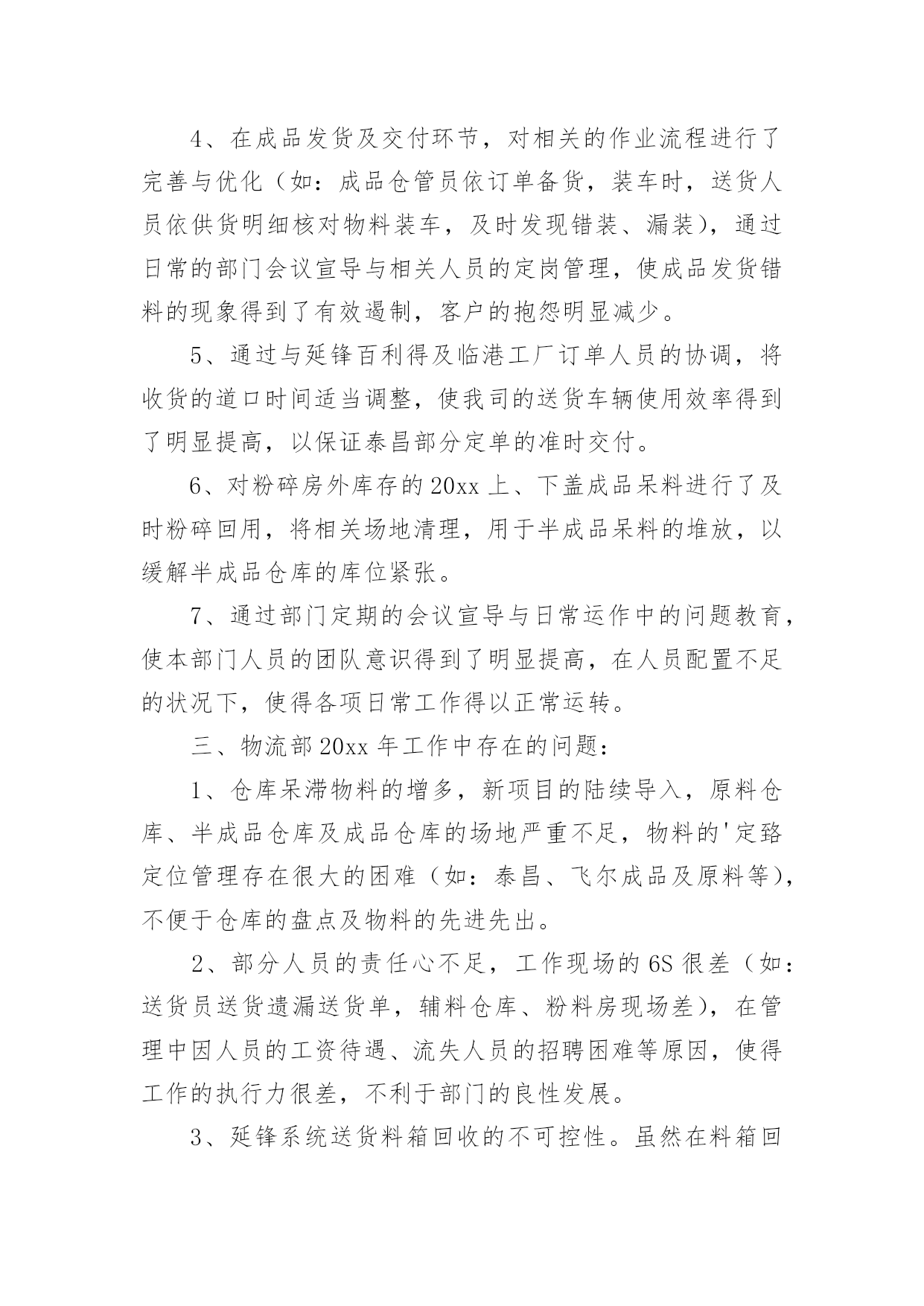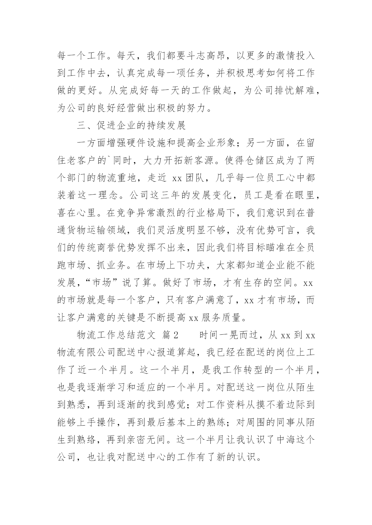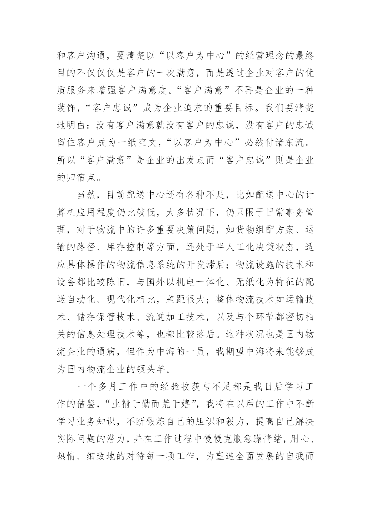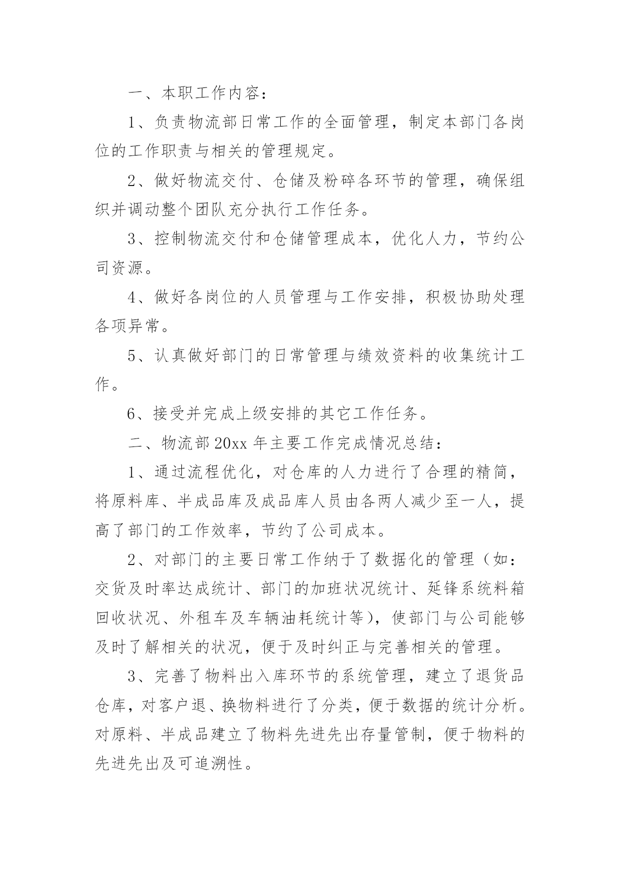 物流工作总结物流工作总结范文总结是对某一特定时间段内的学习和工作生活等表现情况加以回顾和分析的一种书面材料,它可以给我们下一阶段的学习和工作生活做指导,不妨让我们认真地完成总结吧。你所见过的总结应该是什么样的?下面是小编收集整理的物流工作总结范文,欢迎阅读,希望大家能够喜欢。物流工作总结范文篇1回首过去,xx公司以市场为中心,以仓储物流为重点,稳步拓展物流业务。面对压力,迎难而上,顺应现代物流发展,超额完成了全年经济指标。一年来,我们的主要工作总结是:一、稳步拓展物流业务一年来,我们把现代库房承租工作作为日常工作的重点,实现了出租库房的化利用,本年内始终保持满仓状态。出入库用扫码器,跟超市一样,在管理仓储这快我们又上了一个新台阶,同时拉动了以储带运的货代业务。扩大了物流作业连环节,同时运输货代业务也不断发展壮大,以存储业务带动的市内各大超市配送,国内、省内、市内的整车及零担发运。快速消费品等相关业务也成为了增收渠道,自管客户7家,托管客户14家,货品包括食品、药品、保健品、化工原料、通讯设备、轮胎等,客户不断增多。二、实现物流公司利润指标要实现利润指标,依赖的是每一名员工切切实实地做好每一个工作。每天,我们都要斗志高昂,以更多的激情投入到工作中去,认真完成每一项任务,并积极思考如何将工作做的更好。从完成好每一天的工作做起,为公司排忧解难,为公司的良好经营做出积极的努力。三、促进企业的持续发展一方面增强硬件设施和提高企业形象;另一方面,在留住老客户的`同时,大力开拓新客源。使得仓储区成为了两个部门的物流重地,走近xx团队,几乎每一位员工心中都装着这一理念。公司这三年的发展变化,员工是看在眼里,喜在心里。在竞争异常激烈的行业格局下,我们意识到在普通货物运输领域,我们灵活度明显不够,没有优势可言,我们的传统商誉优势发挥不出来,因此我们将目标瞄准在全员跑市场、抓业务。在市场上下功夫,大家都知道企业能不能发展,“市场”说了算。做好了市场,才有生存的空间。xx的市场就是每一个客户,只有客户满意了,xx才有市场,而让客户满意的关键是不断提高xx服务质量。物流工作总结范文篇2时间一晃而过,从xx到xx物流有限公司配送中心报道算起,我已经在配送的岗位上工作了近一个半月。这一个半月,是我工作转型的一个半月,也是我逐渐学习和适应的一个半月。对配送这一岗位从陌生到熟悉,再到逐渐的找到感觉;对工作资料从摸不着边际到能够上手操作,再到最后基本上的熟练;对周围的同事从陌生到熟络,再到亲密无间。这一个半月让我认识了中海这个公司,也让我对配送中心的工作有了新的认识。我在大学学的是市场营销,也修过物流管理这门课程,但学校里的学到的东西运用到实际上并不是那么容易,尤其是在接触了在配送中心的工作之后。实际工作中遇到的很多的问题,并不能完全依靠书本上的知识来进行解决。配送作业是按照用户的要求,将货物分拣出来,按时按量发送到指定地点的过程。配送作业是配送中心运作的核心资料,因而配送作业流程的合理性以及配送作业效率的高低都会影响整个物流系统的正常运行。在配送中心这段日子里,能够强烈的'感受到配送是一种强调准确的物流活动,它需要一个完整的物流信息系统,现代化的技术设备和先进的管理理念,使得配送活动能够为客户降低运作成本,在让客户满意的基础上使配送中心获利。由配送中心集中地向各客户进行多频次的配送业务,众多客户原则上能够不设或少设仓库,不设或少设运输部门,减少了流通设施的投资和日常流通运行费用。配送的存在完善了供应链的缺陷,能够说,在供应链上下游之间有了完整的配送体系,将大大提高供应链的整体竞争力。配送作业流程繁琐,环节众多,极容易出现差错。我在配送的这段时间主要从事的是出仓订舱的工作,做这份工作要个性仔细,一旦出错就可能造成重大的损失。在工作中各个部门之间进行及时的,有效的沟通是十分必要的。配送作业需要整个团队的有效配合,才能更好的提高工作效率,降低差错率。而且,物流业是服务业,在工作中我们要及时的和客户沟通,要清楚以“以客户为中心”的经营理念的最终目的不仅仅仅是客户的一次满意,而是透过企业对客户的优质服务来增强客户满意度。“客户满意”不再是企业的一种装饰,“客户忠诚”成为企业追求的重要目标。我们要清楚地明白:没有客户满意就没有客户的忠诚,没有客户的忠诚留住客户成为一纸空文,“以客户为中心”必然付诸东流。所以“客户满意”是企业的出发点而“客户忠诚”则是企业的归宿点。当然,目前配送中心还有各种不足,比如配送中心的计算机应用程度仍比较低,大多状况下,仍只限于日常事务管理,对于物流中的许多重要决策问题,如货物组配方案、运输的路径、库存控制等方面,还处于半人工化决策状态,适应具体操作的物流信息系统的开发滞后;物流设施的技术和设备都比较陈旧,与国外以机电一体化、无纸化为特征的配送