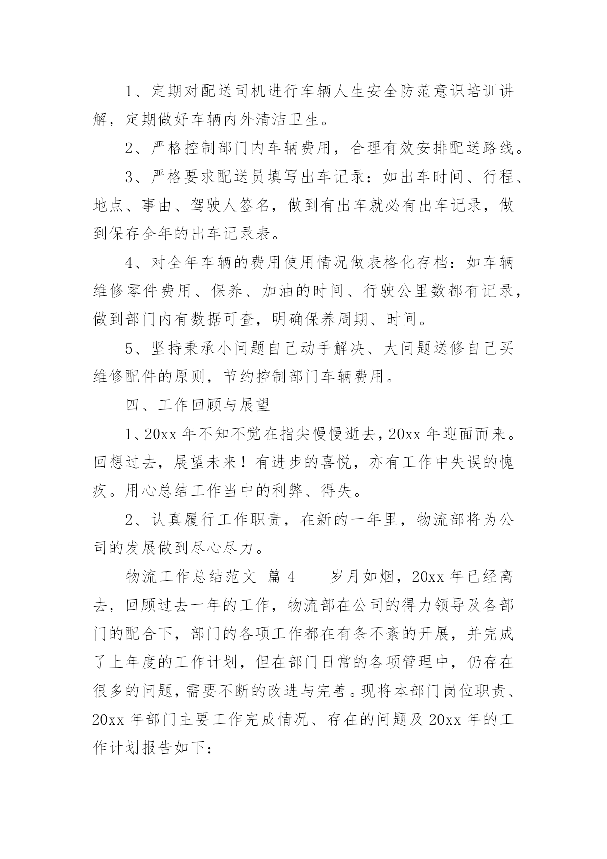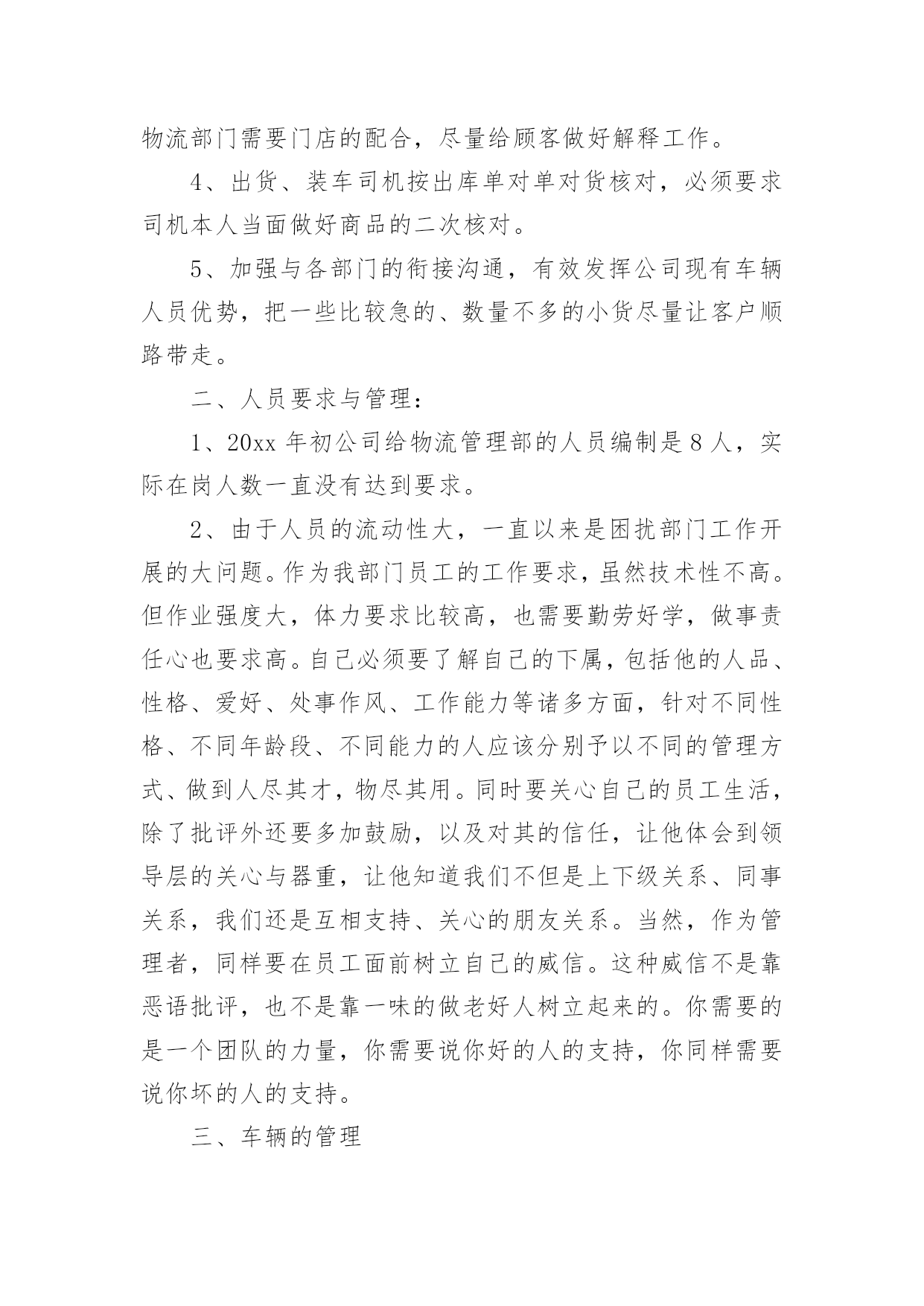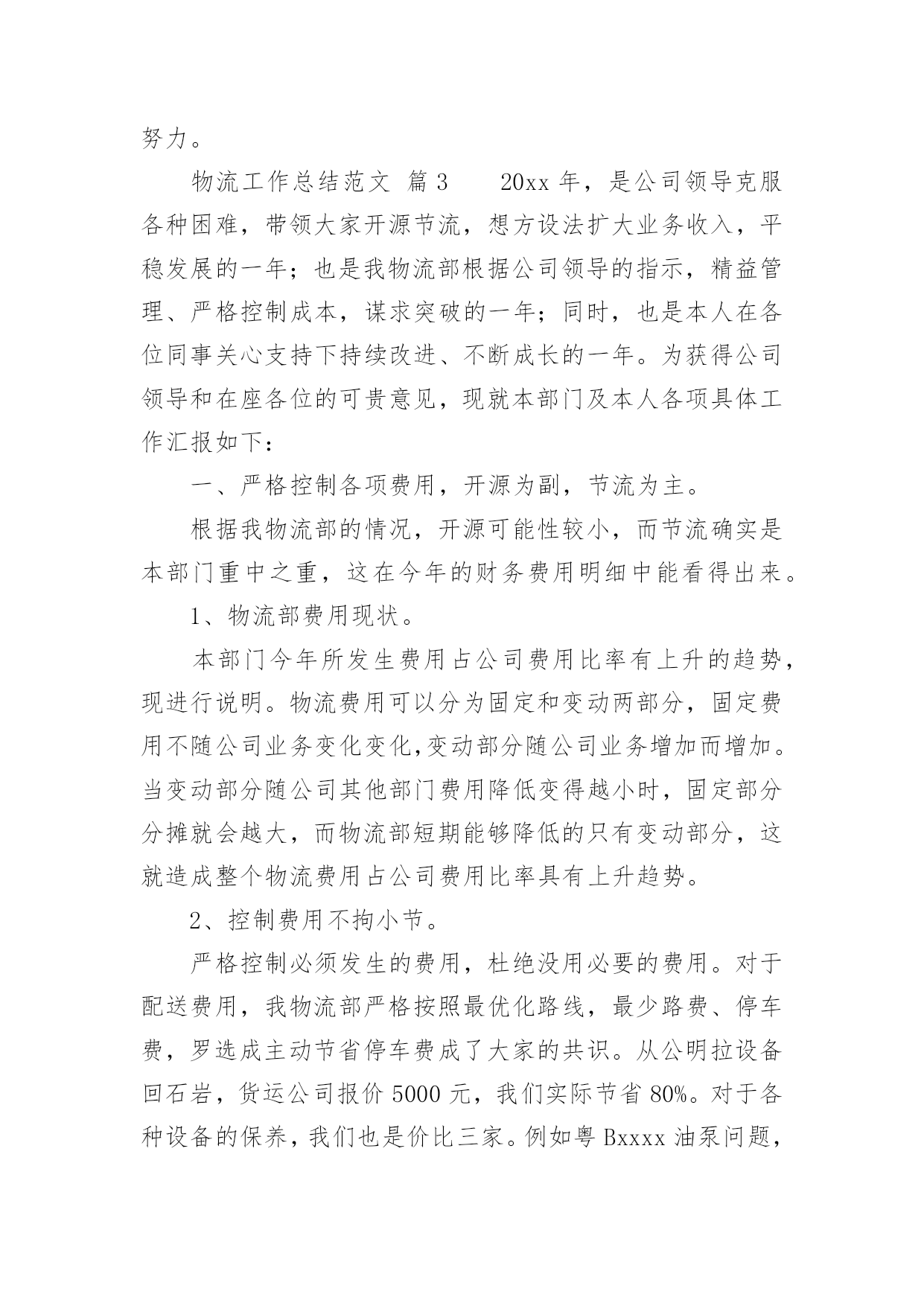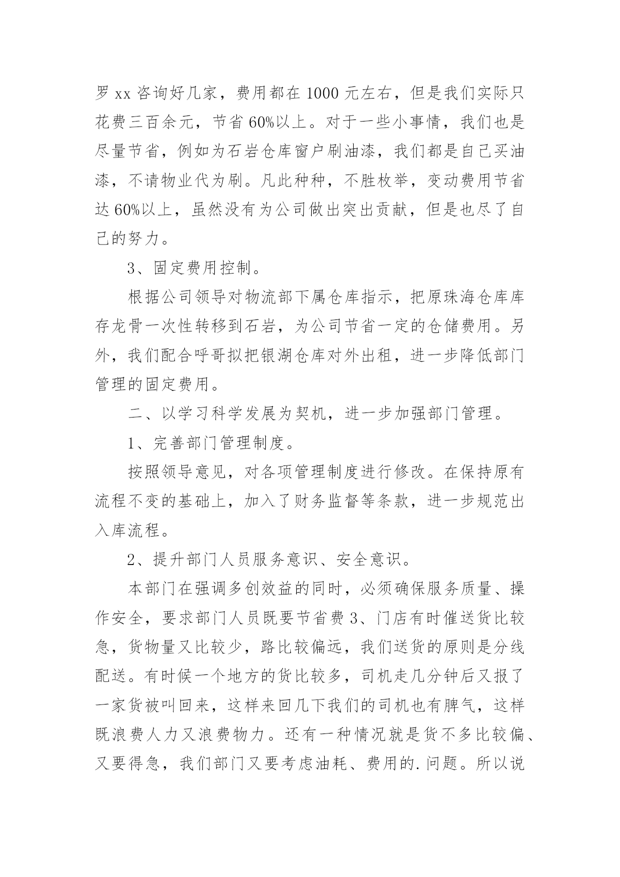 物流工作总结物流工作总结范文总结是对某一特定时间段内的学习和工作生活等表现情况加以回顾和分析的一种书面材料,它可以给我们下一阶段的学习和工作生活做指导,不妨让我们认真地完成总结吧。你所见过的总结应该是什么样的?下面是小编收集整理的物流工作总结范文,欢迎阅读,希望大家能够喜欢。物流工作总结范文篇1回首过去,xx公司以市场为中心,以仓储物流为重点,稳步拓展物流业务。面对压力,迎难而上,顺应现代物流发展,超额完成了全年经济指标。一年来,我们的主要工作总结是:一、稳步拓展物流业务一年来,我们把现代库房承租工作作为日常工作的重点,实现了出租库房的化利用,本年内始终保持满仓状态。出入库用扫码器,跟超市一样,在管理仓储这快我们又上了一个新台阶,同时拉动了以储带运的货代业务。扩大了物流作业连环节,同时运输货代业务也不断发展壮大,以存储业务带动的市内各大超市配送,国内、省内、市内的整车及零担发运。快速消费品等相关业务也成为了增收渠道,自管客户7家,托管客户14家,货品包括食品、药品、保健品、化工原料、通讯设备、轮胎等,客户不断增多。二、实现物流公司利润指标要实现利润指标,依赖的是每一名员工切切实实地做好每一个工作。每天,我们都要斗志高昂,以更多的激情投入到工作中去,认真完成每一项任务,并积极思考如何将工作做的更好。从完成好每一天的工作做起,为公司排忧解难,为公司的良好经营做出积极的努力。三、促进企业的持续发展一方面增强硬件设施和提高企业形象;另一方面,在留住老客户的`同时,大力开拓新客源。使得仓储区成为了两个部门的物流重地,走近xx团队,几乎每一位员工心中都装着这一理念。公司这三年的发展变化,员工是看在眼里,喜在心里。在竞争异常激烈的行业格局下,我们意识到在普通货物运输领域,我们灵活度明显不够,没有优势可言,我们的传统商誉优势发挥不出来,因此我们将目标瞄准在全员跑市场、抓业务。在市场上下功夫,大家都知道企业能不能发展,“市场”说了算。做好了市场,才有生存的空间。xx的市场就是每一个客户,只有客户满意了,xx才有市场,而让客户满意的关键是不断提高xx服务质量。物流工作总结范文篇2时间一晃而过,从xx到xx物流有限公司配送中心报道算起,我已经在配送的岗位上工作了近一个半月。这一个半月,是我工作转型的一个半月,也是我逐渐学习和适应的一个半月。对配送这一岗位从陌生到熟悉,再到逐渐的找到感觉;对工作资料从摸不着边际到能够上手操作,再到最后基本上的熟练;对周围的同事从陌生到熟络,再到亲密无间。这一个半月让我认识了中海这个公司,也让我对配送中心的工作有了新的认识。我在大学学的是市场营销,也修过物流管理这门课程,但学校里的学到的东西运用到实际上并不是那么容易,尤其是在接触了在配送中心的工作之后。实际工作中遇到的很多的问题,并不能完全依靠书本上的知识来进行解决。配送作业是按照用户的要求,将货物分拣出来,按时按量发送到指定地点的过程。配送作业是配送中心运作的核心资料,因而配送作业流程的合理性以及配送作业效率的高低都会影响整个物流系统的正常运行。在配送中心这段日子里,能够强烈的'感受到配送是一种强调准确的物流活动,它需要一个完整的物流信息系统,现代化的技术设备和先进的管理理念,使得配送活动能够为客户降低运作成本,在让客户满意的基础上使配送中心获利。由配送中心集中地向各客户进行多频次的配送业务,众多客户原则上能够不设或少设仓库,不设或少设运输部门,减少了流通设施的投资和日常流通运行费用。配送的存在完善了供应链的缺陷,能够说,在供应链上下游之间有了完整的配送体系,将大大提高供应链的整体竞争力。配送作业流程繁琐,环节众多,极容易出现差错。我在配送的这段时间主要从事的是出仓订舱的工作,做这份工作要个性仔细,一旦出错就可能造成重大的损失。在工作中各个部门之间进行及时的,有效的沟通是十分必要的。配送作业需要整个团队的有效配合,才能更好的提高工作效率,降低差错率。而且,物流业是服务业,在工作中我们要及时的和客户沟通,要清楚以“以客户为中心”的经营理念的最终目的不仅仅仅是客户的一次满意,而是透过企业对客户的优质服务来增强客户满意度。“客户满意”不再是企业的一种装饰,“客户忠诚”成为企业追求的重要目标。我们要清楚地明白:没有客户满意就没有客户的忠诚,没有客户的忠诚留住客户成为一纸空文,“以客户为中心”必然付诸东流。所以“客户满意”是企业的出发点而“客户忠诚”则是企业的归宿点。当然,目前配送中心还有各种不足,比如配送中心的计算机应用程度仍比较低,大多状况下,仍只限于日常事务管理,对于物流中的许多重要决策问题,如货物组配方案、运输的路径、库存控制等方面,还处于半人工化决策状态,适应具体操作的物流信息系统的开发滞后;物流设施的技术和设备都比较陈旧,与国外以机电一体化、无纸化为特征的配送