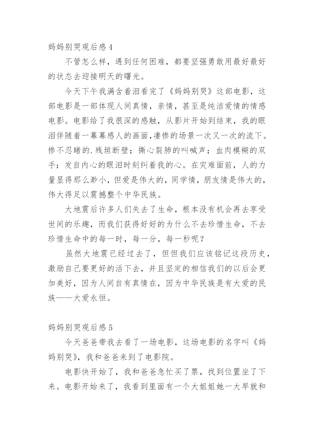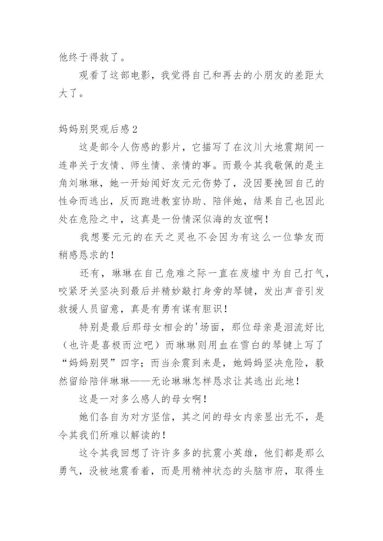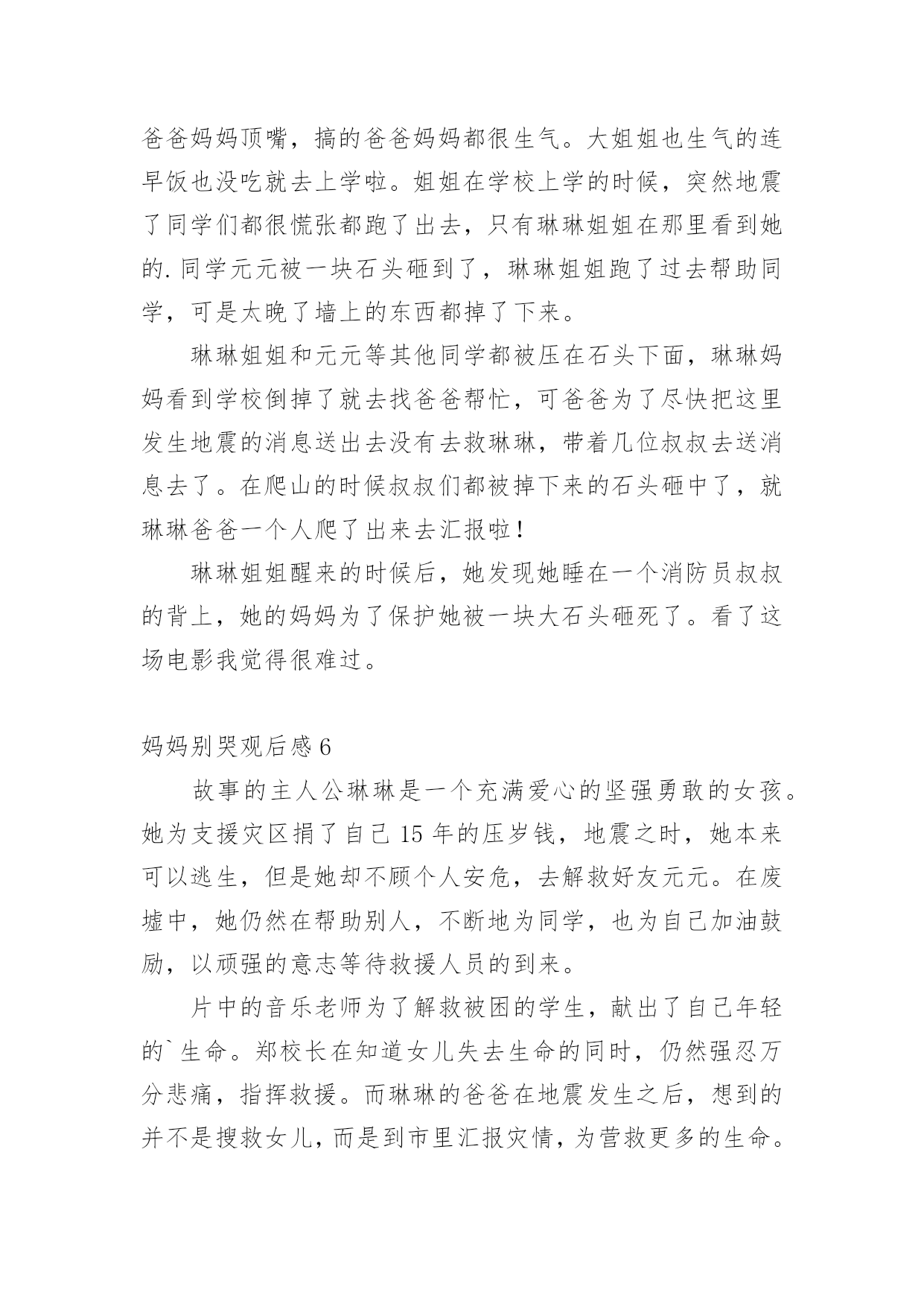 妈妈别哭观后感在看完一部作品以后,这次观看让你心中有什么感想呢?需要回过头来写一写观后感了。那么你真的懂得怎么写观后感吗?下面是小编为大家收集的妈妈别哭观后感,仅供参考,大家一起来看看吧。妈妈别哭观后感1还记得那场512汶川大地震吗,今天我们学校去电影院去看电影《妈妈别哭》作回忆。我们兴奋的来到电影院,那里人山人海,我们都安静了下来,只听一声“轰隆隆”,我们的心七上八下,一下子从座位上下下来,还有的都被吓的两条腿缩紧着,还发抖呢!电影的主题曲结束了,电影终于开始了。首先,生活还是那么快乐的。有个叫刘琳琳的小女孩总是喜欢和她的爸爸妈妈顶嘴,还不听话。一天,她去上学,他看见了他的好朋友元元,在一节音乐课上,大家在认真听课,正当这时,一场突如其来的`大地震出现,大家有的纷纷逃走了,有的先让别的同学出来,刘琳琳看见他的好友元元被压在了桌下,他不顾一切安危,冲上去救元元,可他们俩却一起被压在了废墟下,他们互相鼓励,大多半人没有撑住,刘琳琳的妈妈用手想把刘琳琳挖出来,尽管她的手上沾满了鲜血,但还是没有把她给救出来,到了零点,大家为刘琳琳唱生日歌,到了第二天早上,刘琳琳才发现自己在一个解放军叔叔背上,他终于得救了。观看了这部电影,我觉得自己和再去的小朋友的差距太大了。妈妈别哭观后感2这是部令人伤感的影片,它描写了在汶川大地震期间一连串关于友情、师生情、亲情的事。而最令其我敬佩的是主角刘琳琳,她一开始闻好友元元伤势了,没因要挽回自己的性命而逃出,反而跑进教室协助、陪伴她,结果自己也因此处在危险之中,这真是一份情深似海的友谊啊!我想要元元的在天之灵也不会因为有这么一位挚友而稍感恳求的!还有,琳琳在自己危难之际一直在废墟中为自己打气,咬紧牙关坚决到最后并精妙敲打身旁的琴键,发出声音引发救援人员留意,真是有勇有谋有胆识!特别是最后那母女相会的'场面,那位母亲是泪流好比(也许是喜极而泣吧)而琳琳则用血在雪白的琴键上写了“妈妈别哭”四字;而当余震到来是,她妈妈坚决危险,毅然留给陪伴琳琳——无论琳琳怎样恳求让其逃出此地!这是一对多么感人的母女啊!她们各自为对方坚信,其之间的母女内亲显出无不,是令其我们所难以解读的!这令其我回想了许许多多的抗震小英雄,他们都是那么勇气,没被地震看着,而是用精神状态的头脑市府,取得生子的期望。所以我们应该向他们一样面临危险,毕竟“还是死掉的感觉好啊”!妈妈别哭观后感3星期六下午五时,我去看了《妈妈别哭》这部电影。我只知道2008年汶川发生了8.0级的大地震,我无法想象当时的场面,可昨天看过这部电影后,我被深深的感动了。2008年5月12日――那是一个黑色的下午,汶川大地震发生了。我想没有几个人是亲临现场的更无法想象出当时的场面,下面就让我来为大家说说吧!在那天,主人公琳琳正在她们班弹奏钢琴,并且早上她还跟妈妈拌过嘴,只听轰的一声她们教室的`墙塌了,而琳琳本是可以逃出去的,可因为元元还在桌子底下,琳琳想让元元和自己一起逃出去,可不知怎么的,琳琳晕倒了,这时,我心中是一阵阵的痛,我想就算琳琳醒来了又会怎么样,在琳琳遇到危险时,妈妈还在焦急万分的找她,可是,结局是人无法预料的,元元死了,与琳琳一起在教室里面的同学们都死了,而在妈妈送完踢踏鞋时,妈妈也在第十九还是二十次余震时,妈妈也死了……结局是让人悲痛的,可琳琳的坚强也是我们无法想象的,在遇到灾难时,她没有自暴自弃,却一直安慰着别人安慰自己,想着各种办法。我们也要多学习各种地震后的逃生办法,不能自暴自弃。妈妈别哭观后感4不管怎么样,遇到任何困难,都要坚强勇敢用最好最好的状态去迎接明天的曙光。今天下午我满含着泪看完了《妈妈别哭》这部电影,这部电影是一部体现人间真情,亲情,甚至是纯洁爱情的情感电影。电影给了我很深的感触,从影片开始到结束,我的眼泪伴随着一幕幕感人的画面,凄惨的场景一次又一次的流下。惨不忍睹的.残垣断壁;撕心裂肺的叫喊声;血肉模糊的双手;发自内心的眼泪时刻纠着我的心。在灾难面前,人的力量显得那么渺小,但爱是伟大的,同学情,朋友情是伟大的,伟大得足以震撼整个中华民族。大地震后许多人们失去了生命,根本没有机会再去享受世间的乐趣,而我们获得好好的为什么不去珍惜生命,不去珍惜生命中的每一时,每一分,每一秒呢?虽然大地震已经过去了,但但我们应该铭记这段历史,激励自己要更好的活下去,并且坚定的相信我们的以后会更加美好,因为人间自有真情在,因为中华民族是有大爱的民族——大爱永恒。妈妈别哭观后感5今天爸爸带我去看了一场电影,这场电影的名字叫《妈妈别哭》,我和爸爸来到了电影院。电影快开始了,我和爸爸急忙买了票,找到位置坐了下来。电影开始来了,我看到里面有一个大姐姐她一大早就和爸爸妈妈顶嘴,搞的爸爸妈妈都很生气。大姐姐也生气的连早饭也没吃就去上学啦。姐姐在学校上学的时候,突然地震了同学