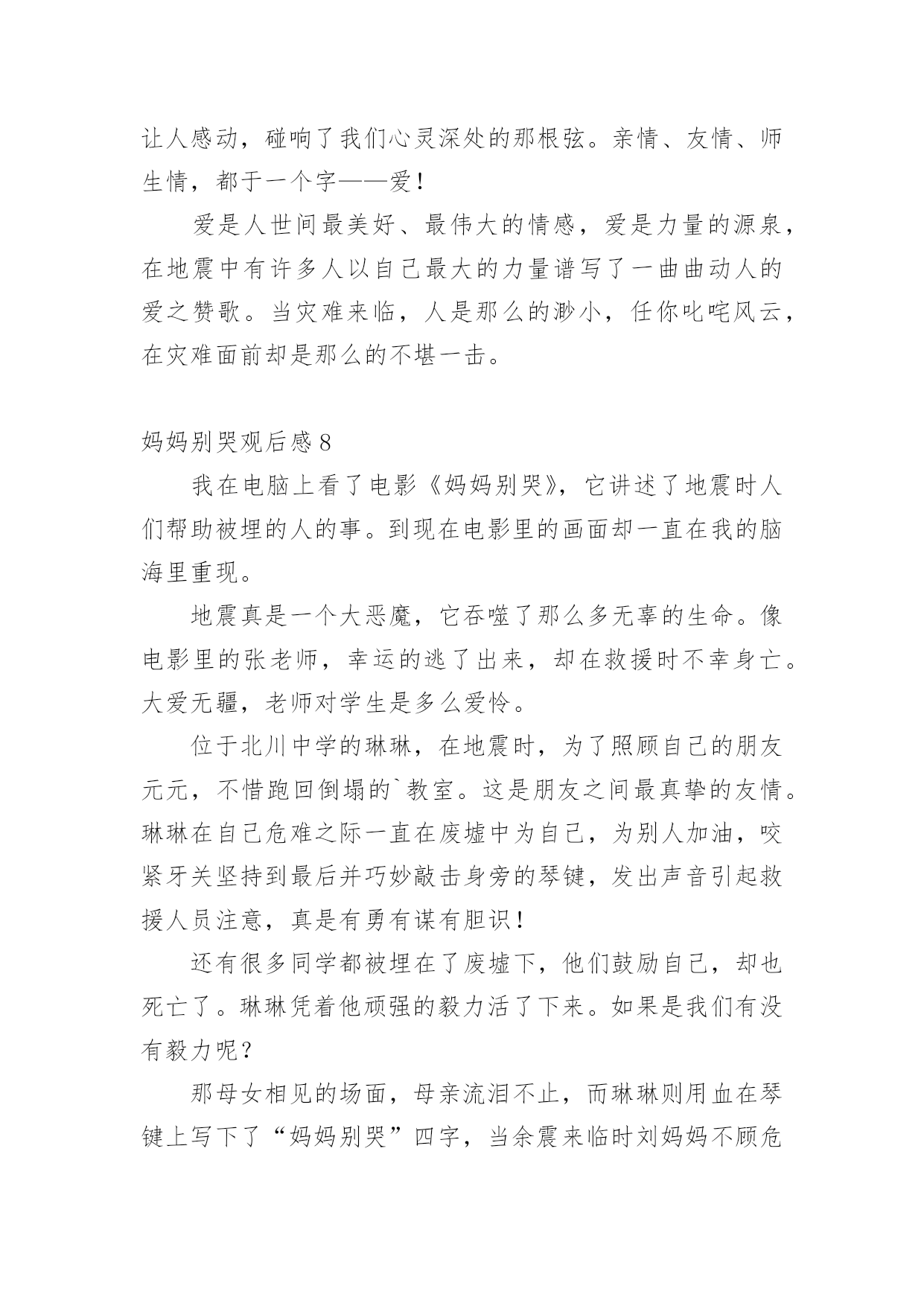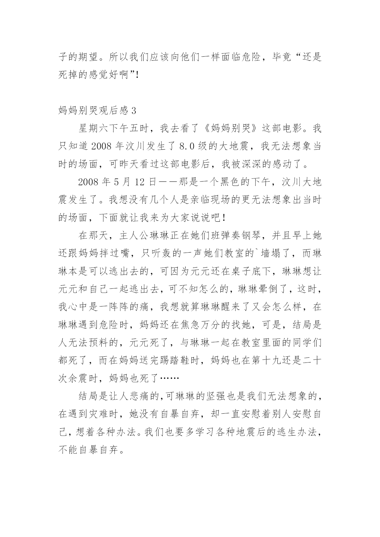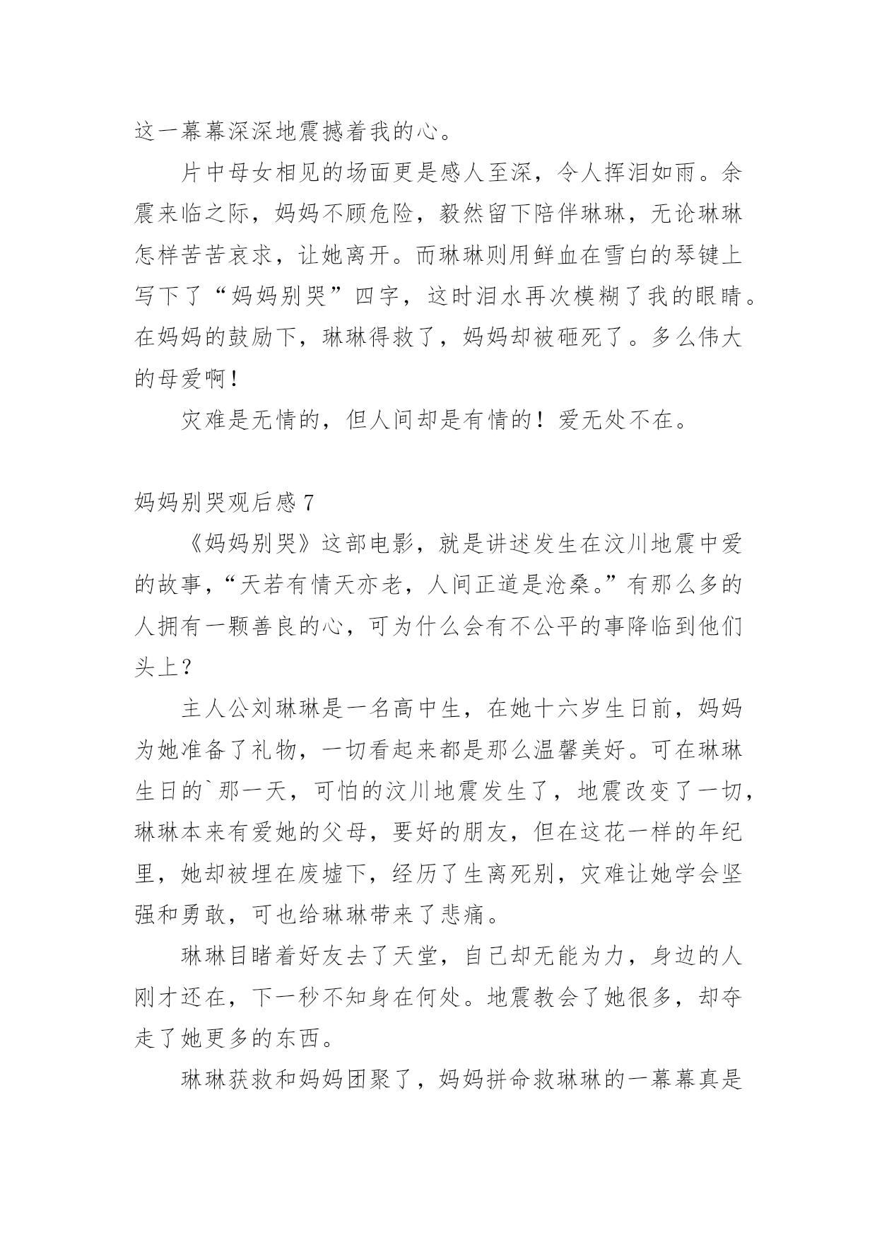 妈妈别哭观后感在看完一部作品以后,这次观看让你心中有什么感想呢?需要回过头来写一写观后感了。那么你真的懂得怎么写观后感吗?下面是小编为大家收集的妈妈别哭观后感,仅供参考,大家一起来看看吧。妈妈别哭观后感1还记得那场512汶川大地震吗,今天我们学校去电影院去看电影《妈妈别哭》作回忆。我们兴奋的来到电影院,那里人山人海,我们都安静了下来,只听一声“轰隆隆”,我们的心七上八下,一下子从座位上下下来,还有的都被吓的两条腿缩紧着,还发抖呢!电影的主题曲结束了,电影终于开始了。首先,生活还是那么快乐的。有个叫刘琳琳的小女孩总是喜欢和她的爸爸妈妈顶嘴,还不听话。一天,她去上学,他看见了他的好朋友元元,在一节音乐课上,大家在认真听课,正当这时,一场突如其来的`大地震出现,大家有的纷纷逃走了,有的先让别的同学出来,刘琳琳看见他的好友元元被压在了桌下,他不顾一切安危,冲上去救元元,可他们俩却一起被压在了废墟下,他们互相鼓励,大多半人没有撑住,刘琳琳的妈妈用手想把刘琳琳挖出来,尽管她的手上沾满了鲜血,但还是没有把她给救出来,到了零点,大家为刘琳琳唱生日歌,到了第二天早上,刘琳琳才发现自己在一个解放军叔叔背上,他终于得救了。观看了这部电影,我觉得自己和再去的小朋友的差距太大了。妈妈别哭观后感2这是部令人伤感的影片,它描写了在汶川大地震期间一连串关于友情、师生情、亲情的事。而最令其我敬佩的是主角刘琳琳,她一开始闻好友元元伤势了,没因要挽回自己的性命而逃出,反而跑进教室协助、陪伴她,结果自己也因此处在危险之中,这真是一份情深似海的友谊啊!我想要元元的在天之灵也不会因为有这么一位挚友而稍感恳求的!还有,琳琳在自己危难之际一直在废墟中为自己打气,咬紧牙关坚决到最后并精妙敲打身旁的琴键,发出声音引发救援人员留意,真是有勇有谋有胆识!特别是最后那母女相会的'场面,那位母亲是泪流好比(也许是喜极而泣吧)而琳琳则用血在雪白的琴键上写了“妈妈别哭”四字;而当余震到来是,她妈妈坚决危险,毅然留给陪伴琳琳——无论琳琳怎样恳求让其逃出此地!这是一对多么感人的母女啊!她们各自为对方坚信,其之间的母女内亲显出无不,是令其我们所难以解读的!这令其我回想了许许多多的抗震小英雄,他们都是那么勇气,没被地震看着,而是用精神状态的头脑市府,取得生子的期望。所以我们应该向他们一样面临危险,毕竟“还是死掉的感觉好啊”!妈妈别哭观后感3星期六下午五时,我去看了《妈妈别哭》这部电影。我只知道2008年汶川发生了8.0级的大地震,我无法想象当时的场面,可昨天看过这部电影后,我被深深的感动了。2008年5月12日――那是一个黑色的下午,汶川大地震发生了。我想没有几个人是亲临现场的更无法想象出当时的场面,下面就让我来为大家说说吧!在那天,主人公琳琳正在她们班弹奏钢琴,并且早上她还跟妈妈拌过嘴,只听轰的一声她们教室的`墙塌了,而琳琳本是可以逃出去的,可因为元元还在桌子底下,琳琳想让元元和自己一起逃出去,可不知怎么的,琳琳晕倒了,这时,我心中是一阵阵的痛,我想就算琳琳醒来了又会怎么样,在琳琳遇到危险时,妈妈还在焦急万分的找她,可是,结局是人无法预料的,元元死了,与琳琳一起在教室里面的同学们都死了,而在妈妈送完踢踏鞋时,妈妈也在第十九还是二十次余震时,妈妈也死了……结局是让人悲痛的,可琳琳的坚强也是我们无法想象的,在遇到灾难时,她没有自暴自弃,却一直安慰着别人安慰自己,想着各种办法。我们也要多学习各种地震后的逃生办法,不能自暴自弃。妈妈别哭观后感4不管怎么样,遇到任何困难,都要坚强勇敢用最好最好的状态去迎接明天的曙光。今天下午我满含着泪看完了《妈妈别哭》这部电影,这部电影是一部体现人间真情,亲情,甚至是纯洁爱情的情感电影。电影给了我很深的感触,从影片开始到结束,我的眼泪伴随着一幕幕感人的画面,凄惨的场景一次又一次的流下。惨不忍睹的.残垣断壁;撕心裂肺的叫喊声;血肉模糊的双手;发自内心的眼泪时刻纠着我的心。在灾难面前,人的力量显得那么渺小,但爱是伟大的,同学情,朋友情是伟大的,伟大得足以震撼整个中华民族。大地震后许多人们失去了生命,根本没有机会再去享受世间的乐趣,而我们获得好好的为什么不去珍惜生命,不去珍惜生命中的每一时,每一分,每一秒呢?虽然大地震已经过去了,但但我们应该铭记这段历史,激励自己要更好的活下去,并且坚定的相信我们的以后会更加美好,因为人间自有真情在,因为中华民族是有大爱的民族——大爱永恒。妈妈别哭观后感5今天爸爸带我去看了一场电影,这场电影的名字叫《妈妈别哭》,我和爸爸来到了电影院。电影快开始了,我和爸爸急忙买了票,找到位置坐了下来。电影开始来了,我看到里面有一个大姐姐她一大早就和爸爸妈妈顶嘴,搞的爸爸妈妈都很生气。大姐姐也生气的连早饭也没吃就去上学啦。姐姐在学校上学的时候,突然地震了同学