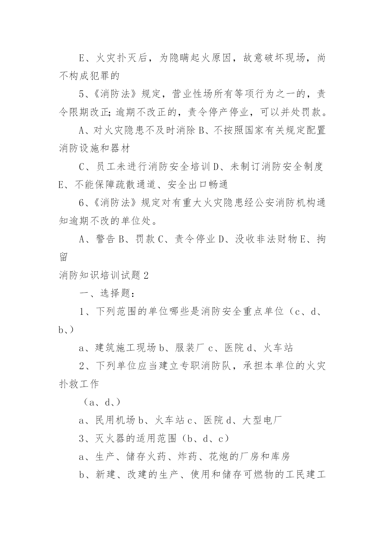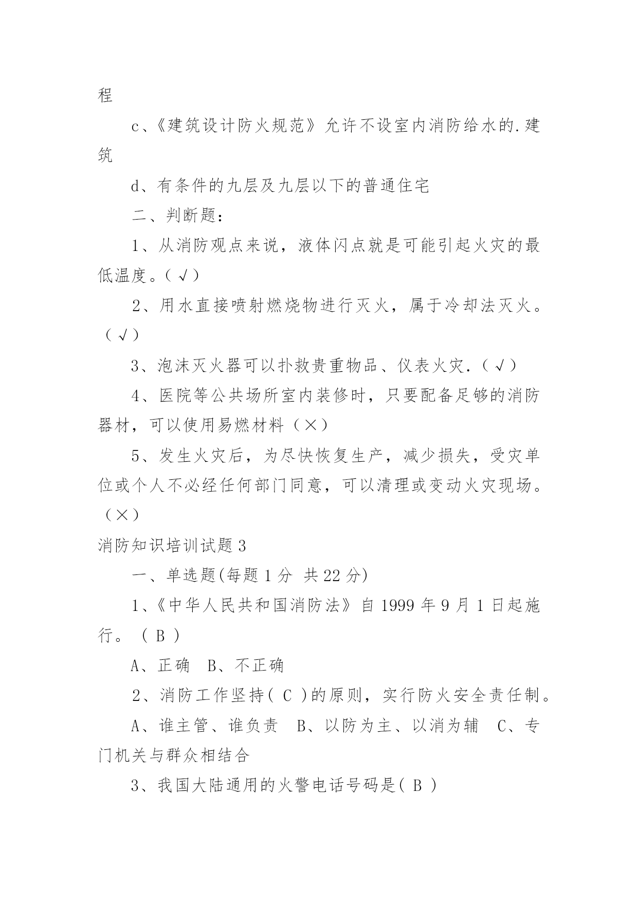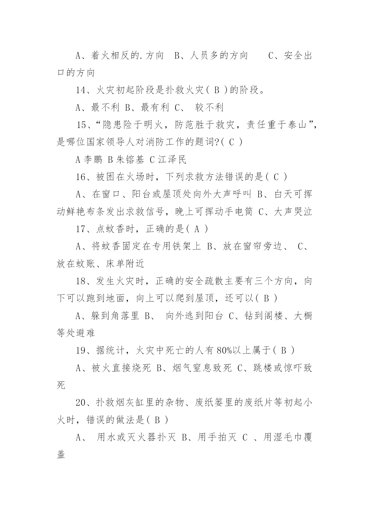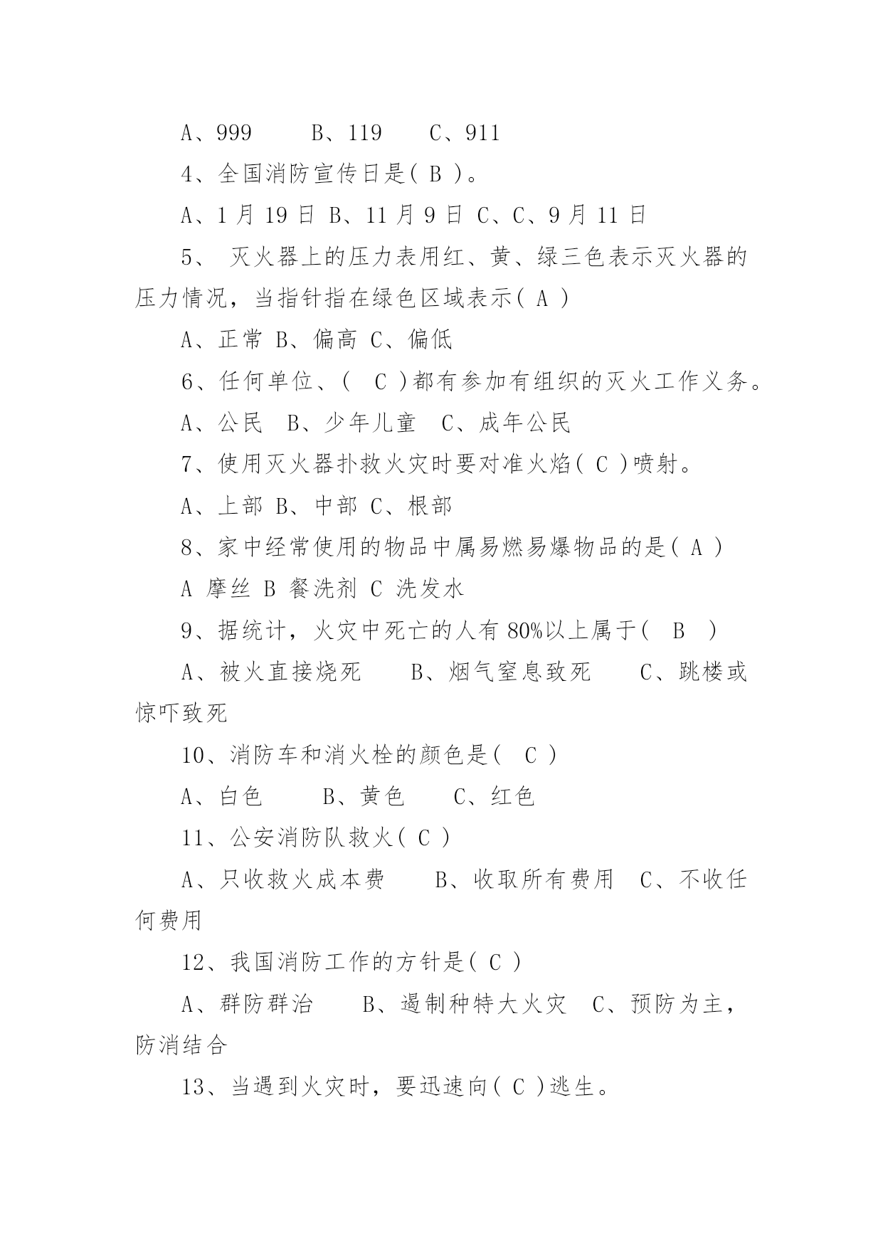 消防知识培训试题消防知识培训试题在日常学习和工作生活中,我们都要用到试题,试题是学校或各主办方考核某种知识才能的标准。大家知道什么样的试题才是规范的吗?下面是小编为大家整理的消防知识培训试题,供大家参考借鉴,希望可以帮助到有需要的朋友。消防知识培训试题1一、单选题1、我国消防工作贯彻的方针。(B)A、以防为主,防消结合B、预防为主,防消结合C、专门机关与群众相结合D、以防为主,以消为辅2、消防工作应当坚持的原则。(C)A、防火安全责任制B、预防为主,防消结合C、专门机关与群众相结合D、隐患险于明火,防范胜于救灾3、经公安消防机构审核的建筑工程消防设计需要变更的,应当报经核准。(B)A、上级消防机构B、原审核的公安消防机构C、当地公安消防机构D、主管公安机关4、禁止生产、销售或者使用未经确定的检验机构检验合格的消防产品。(D)A、各级公安机关B、各级公安消防机构C、各级人民政府D、依照产品质量法的规定5、单位违反《消防法》规定,擅自降低消防技术标准施工、使用防火性能不符合国家标准的建筑构件和建筑材料或者不合格的装修、装饰材料施工,经公安消防机构责令限期改正逾期不改正的,责令停止施工,可并处罚款,并对单位处警告或者罚款。(C)A、分管人员和责任人员B、负领导责任的人员和直接责任人员C、直接负责的主管人员和其他直接责任人员D、负主要责任的管理人员和其他责任人员6、设有车间和仓库的建筑物内设置员工集体宿舍,经公安消防机构责令限期改正逾期不改的.,责令停产停业,可以并处。(D)A、行政处分B、警告C、拘留D、罚款7、任何人发现火灾,都应当立即报警。任何单位、个人都应当为报警提供便利,不得阻拦报警。(A)A、无偿B、有偿C、自愿D、自觉8、任何单位、个人都有维护消防安全、保护、预防火灾、报告火警的。义务。(B)A、消防环境B、消防设施C、公共设施D、公共财产9、任何单位、都有参加有组织的灭火工作的义务。(A)A、成年公民B、个人C、公民D、职工10、生产、储存易燃易爆危险物品的大型企业应当建立。(B)A、民办消防队B、专职消防队C、公安消防队D、专业消防队11、《消防法》规定,在设有车间或者仓库的建筑物内,不得设置员工。(A)A、集体宿舍B、单身宿舍C、厨房D、俱乐部12、消防法规定,严禁携带进入生产、储备易燃易爆危险物品的场所。(C)A、灭火器B、危险物品C、火种D、香烟13、消防法规定,公安消防机构进行消防审核、验收等监督检查收取费用。(A)A、不得B、可以C、应当D、必须14、公安消防队除保证完成火灾扑救工作外,还应当参加其他灾害或者事故的工作。(A)A、抢险救援B、防治C、火灾救助D、调查15、公共场所发生火灾时,该公共场所的人员有组织、引导在场群众疏散的义务。(B)A、工作B、现场工作C、安全保卫D、消防安全负责人16、公共娱乐场所内严禁带入和存放物品。A、生活物品B、化学物品C、易燃易爆物品D、易燃物品17、消防安全重点单位应当按照灭火和应急疏散预案,至少每半年进行次演练,并结合实际,不断完善预案。(A)18、公共娱乐场所的疏散出口数目一般不应少于()个。A、一B、二C、三D、四19、在地下建筑内,设置公共娱乐场所只允许设在()层A、地下一层B、地下一、二层C、地下一、二、三层D、地下一、二、三、四层20、我国通用火警电话号码是()A、120B、119C、114D、11021、楼内失火应()A、从疏散通道逃离B、乘坐电梯逃离C、在现场等待救援D、去看看是什么物质着火了22、据统计,在火灾事故死亡的人中,大多数是由于()。A、被火直接烧死B、烟气窒息致死C、跳楼或惊吓致死D、人员拥挤致死23、当遇到火灾时,要迅速向()逃生。A、着火相反的方向B、人员多的方向C、安全出口的方向D、着火方向24、发生火灾时,首先要保持冷静,并用()捂住口鼻,采取匍匐前进或低头弯腰的方法迅速朝安全出口的方向逃离火灾现场。A、湿毛巾B、手C、干毛巾D、被子25、用灭火器灭火时,灭火器的喷射口应该对准火焰的()。A、上空B、上部C、中部D、根部26、烟头中心温度可达(),它超过了棉、麻、毛织物、纸张、家具等可燃物的燃点,若乱扔烟头接触到这些可燃物,容易引起燃烧,甚至酿成火灾。A、100~200℃B、200~300℃C、300~700℃D、700~800℃二、多选题1、机关、团体、企业、事业单位应当依法履行下列消防安全职责。A、制定消防安全制度B、组织防火检查C、实行防火安全责任制D、建立防火档案E、制定灭火和应急疏散方案2、《消防法》规定,必须持证上岗。A、电焊工B、气焊工C、防火负责人D、钳工E、自动消防系统的操作人员3、对于违反《消防法》规定的行为,可处以等行政处罚。A、罚款B、没收违法所得C、警告D、责令停产停业E、行政拘留4、违反《消防法》规
