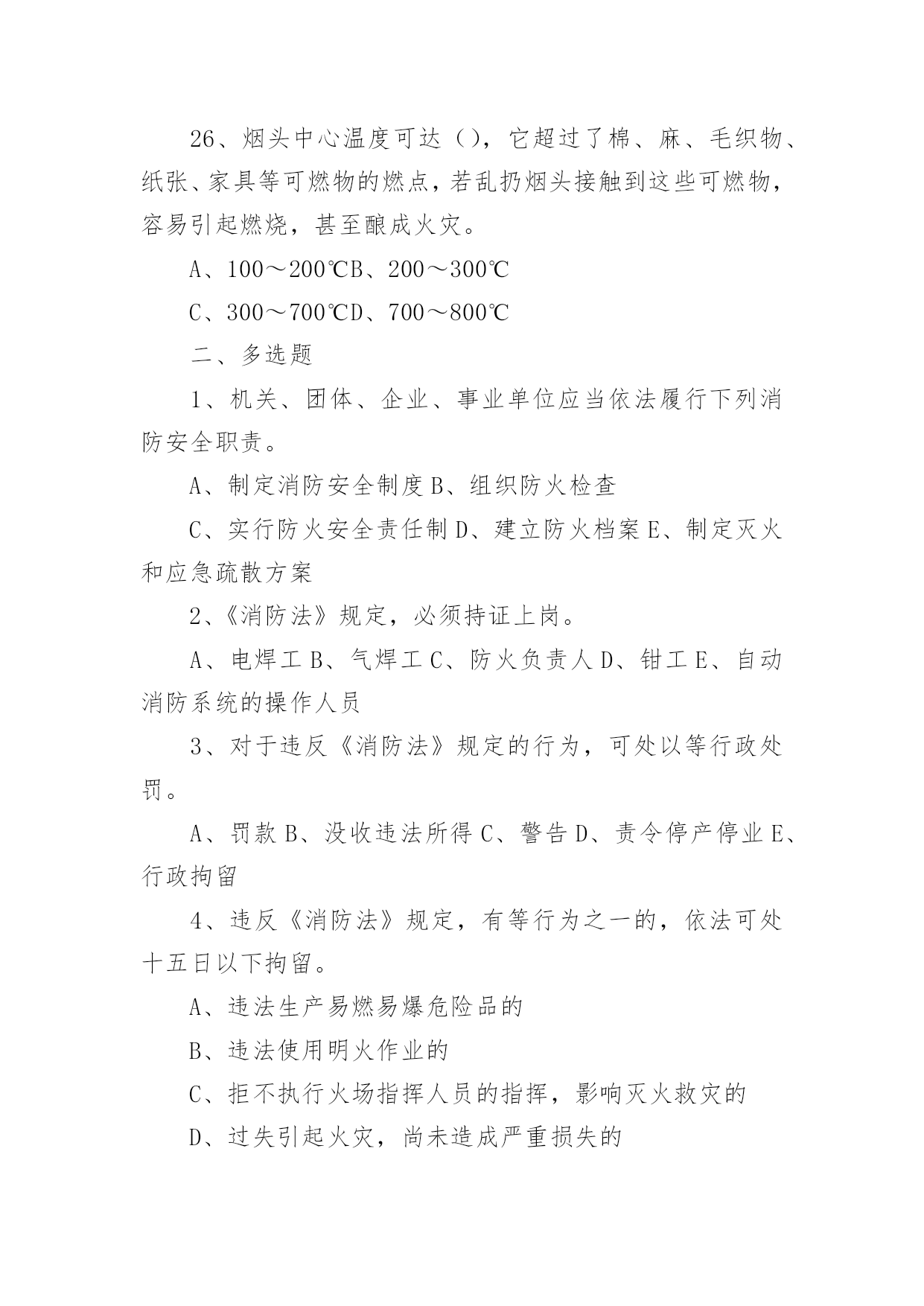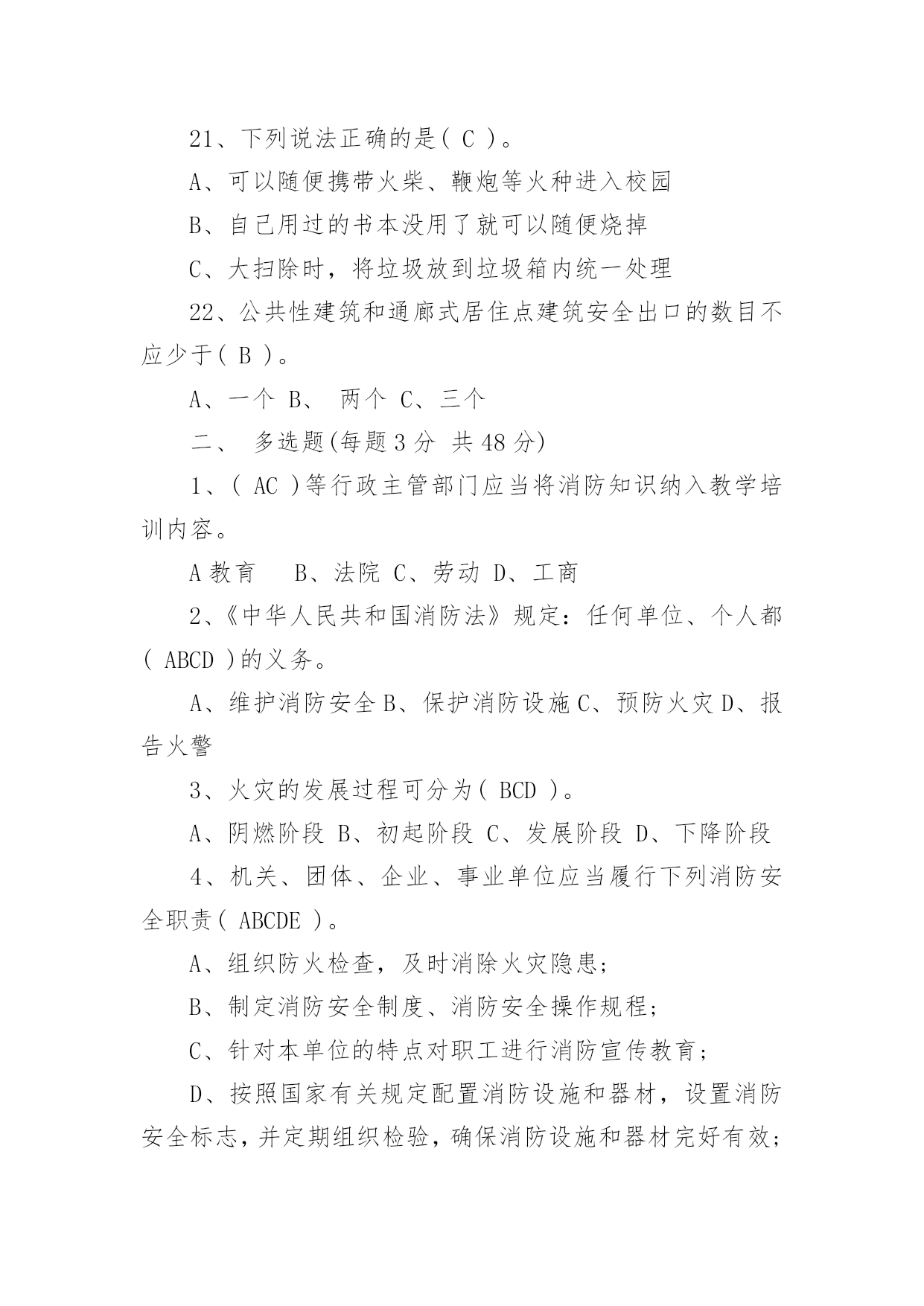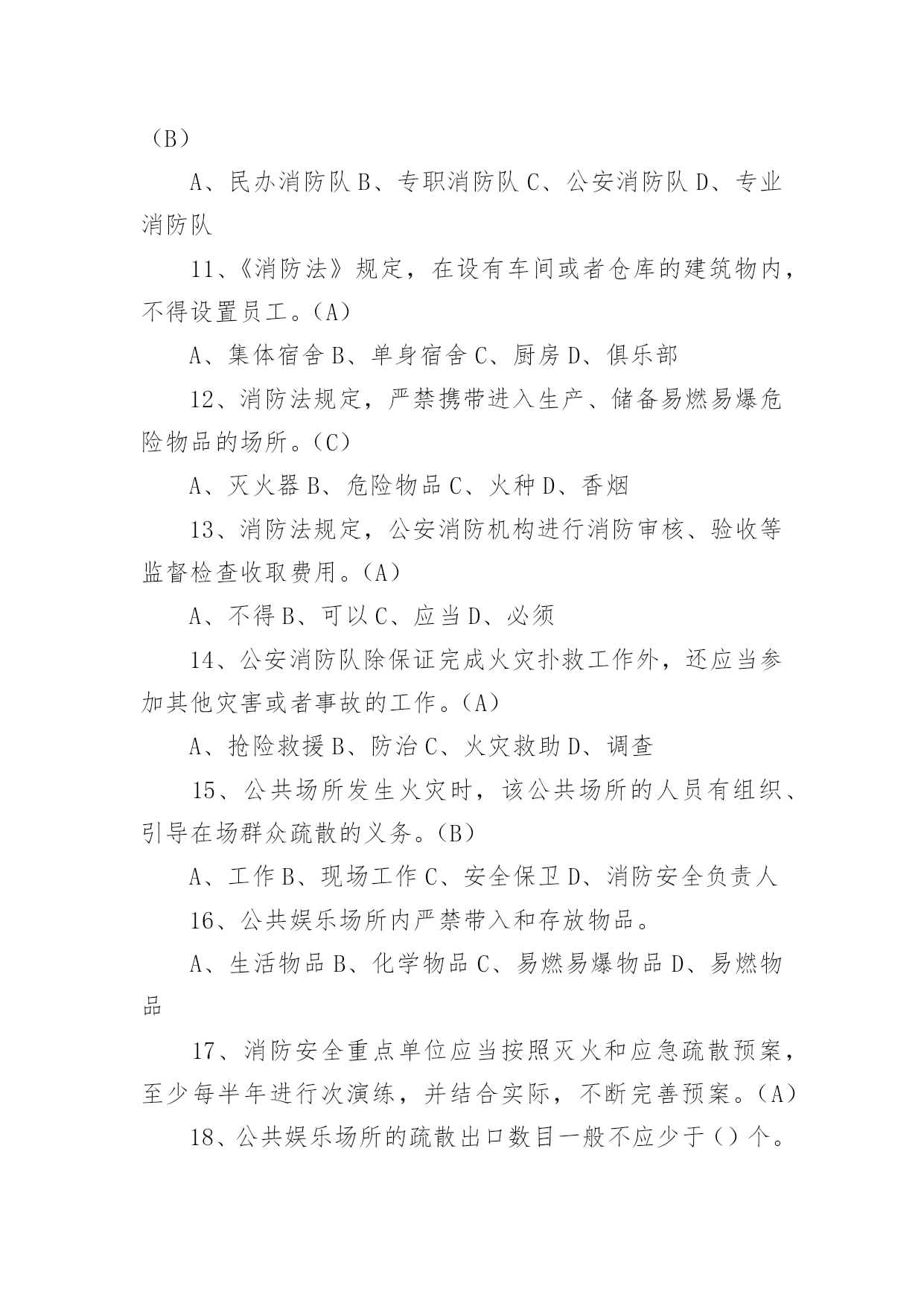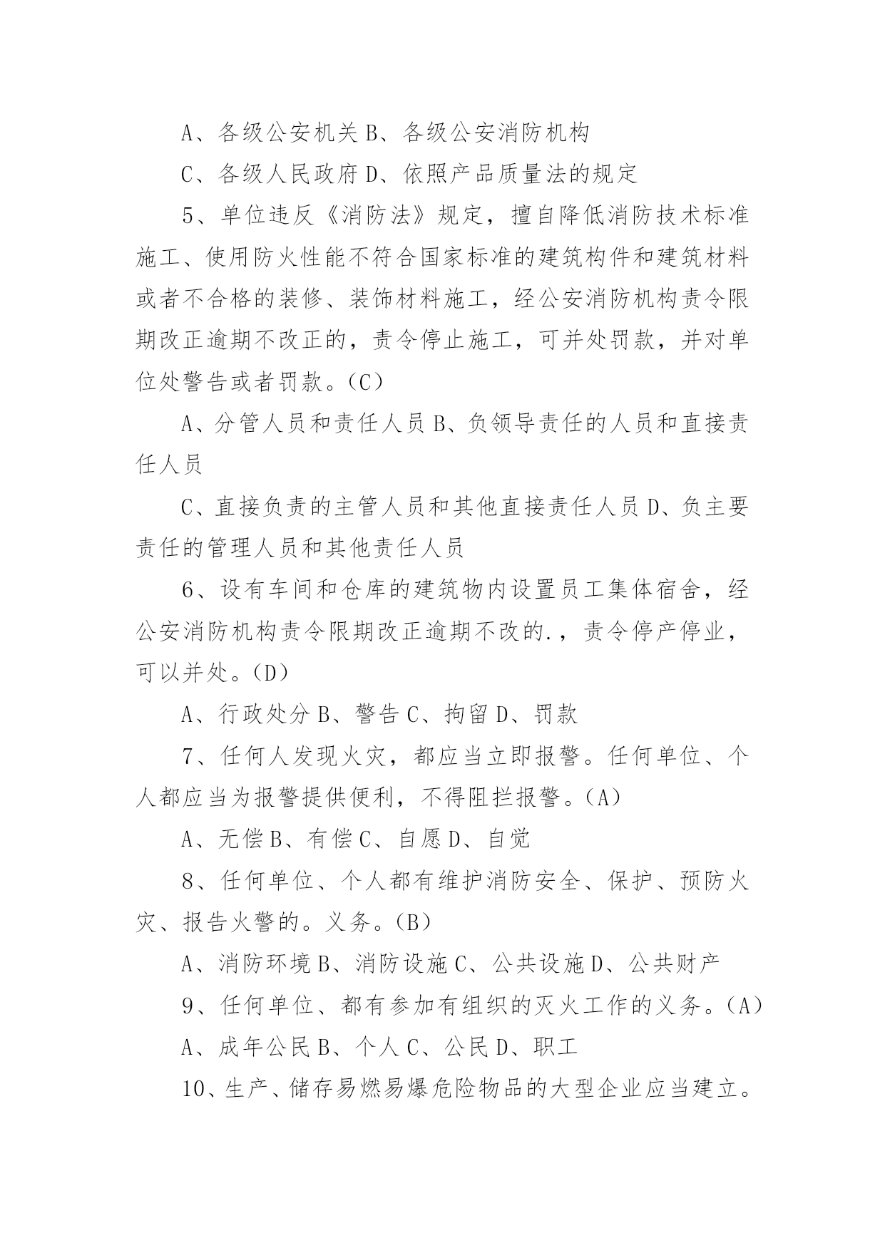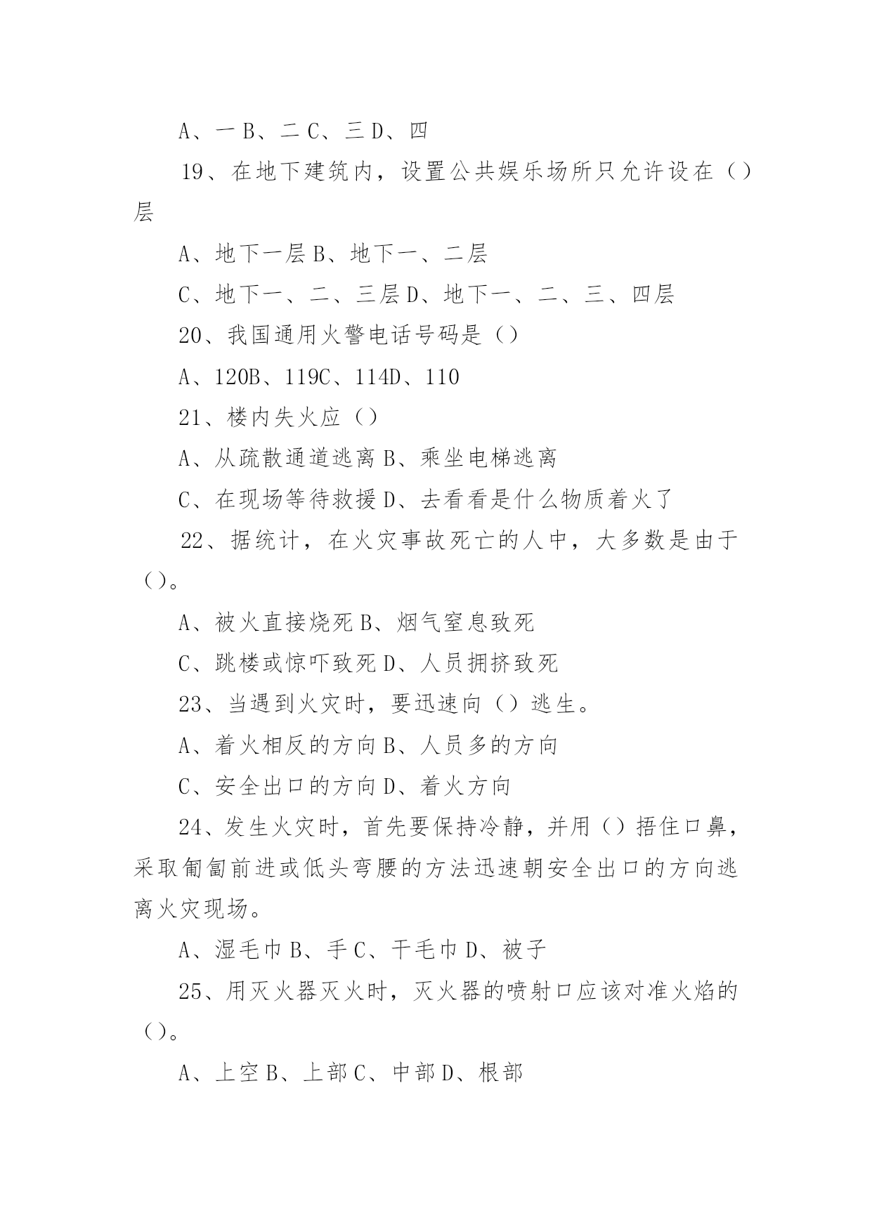 消防知识培训试题消防知识培训试题在日常学习和工作生活中,我们都要用到试题,试题是学校或各主办方考核某种知识才能的标准。大家知道什么样的试题才是规范的吗?下面是小编为大家整理的消防知识培训试题,供大家参考借鉴,希望可以帮助到有需要的朋友。消防知识培训试题1一、单选题1、我国消防工作贯彻的方针。(B)A、以防为主,防消结合B、预防为主,防消结合C、专门机关与群众相结合D、以防为主,以消为辅2、消防工作应当坚持的原则。(C)A、防火安全责任制B、预防为主,防消结合C、专门机关与群众相结合D、隐患险于明火,防范胜于救灾3、经公安消防机构审核的建筑工程消防设计需要变更的,应当报经核准。(B)A、上级消防机构B、原审核的公安消防机构C、当地公安消防机构D、主管公安机关4、禁止生产、销售或者使用未经确定的检验机构检验合格的消防产品。(D)A、各级公安机关B、各级公安消防机构C、各级人民政府D、依照产品质量法的规定5、单位违反《消防法》规定,擅自降低消防技术标准施工、使用防火性能不符合国家标准的建筑构件和建筑材料或者不合格的装修、装饰材料施工,经公安消防机构责令限期改正逾期不改正的,责令停止施工,可并处罚款,并对单位处警告或者罚款。(C)A、分管人员和责任人员B、负领导责任的人员和直接责任人员C、直接负责的主管人员和其他直接责任人员D、负主要责任的管理人员和其他责任人员6、设有车间和仓库的建筑物内设置员工集体宿舍,经公安消防机构责令限期改正逾期不改的.,责令停产停业,可以并处。(D)A、行政处分B、警告C、拘留D、罚款7、任何人发现火灾,都应当立即报警。任何单位、个人都应当为报警提供便利,不得阻拦报警。(A)A、无偿B、有偿C、自愿D、自觉8、任何单位、个人都有维护消防安全、保护、预防火灾、报告火警的。义务。(B)A、消防环境B、消防设施C、公共设施D、公共财产9、任何单位、都有参加有组织的灭火工作的义务。(A)A、成年公民B、个人C、公民D、职工10、生产、储存易燃易爆危险物品的大型企业应当建立。(B)A、民办消防队B、专职消防队C、公安消防队D、专业消防队11、《消防法》规定,在设有车间或者仓库的建筑物内,不得设置员工。(A)A、集体宿舍B、单身宿舍C、厨房D、俱乐部12、消防法规定,严禁携带进入生产、储备易燃易爆危险物品的场所。(C)A、灭火器B、危险物品C、火种D、香烟13、消防法规定,公安消防机构进行消防审核、验收等监督检查收取费用。(A)A、不得B、可以C、应当D、必须14、公安消防队除保证完成火灾扑救工作外,还应当参加其他灾害或者事故的工作。(A)A、抢险救援B、防治C、火灾救助D、调查15、公共场所发生火灾时,该公共场所的人员有组织、引导在场群众疏散的义务。(B)A、工作B、现场工作C、安全保卫D、消防安全负责人16、公共娱乐场所内严禁带入和存放物品。A、生活物品B、化学物品C、易燃易爆物品D、易燃物品17、消防安全重点单位应当按照灭火和应急疏散预案,至少每半年进行次演练,并结合实际,不断完善预案。(A)18、公共娱乐场所的疏散出口数目一般不应少于()个。A、一B、二C、三D、四19、在地下建筑内,设置公共娱乐场所只允许设在()层A、地下一层B、地下一、二层C、地下一、二、三层D、地下一、二、三、四层20、我国通用火警电话号码是()A、120B、119C、114D、11021、楼内失火应()A、从疏散通道逃离B、乘坐电梯逃离C、在现场等待救援D、去看看是什么物质着火了22、据统计,在火灾事故死亡的人中,大多数是由于()。A、被火直接烧死B、烟气窒息致死C、跳楼或惊吓致死D、人员拥挤致死23、当遇到火灾时,要迅速向()逃生。A、着火相反的方向B、人员多的方向C、安全出口的方向D、着火方向24、发生火灾时,首先要保持冷静,并用()捂住口鼻,采取匍匐前进或低头弯腰的方法迅速朝安全出口的方向逃离火灾现场。A、湿毛巾B、手C、干毛巾D、被子25、用灭火器灭火时,灭火器的喷射口应该对准火焰的()。A、上空B、上部C、中部D、根部26、烟头中心温度可达(),它超过了棉、麻、毛织物、纸张、家具等可燃物的燃点,若乱扔烟头接触到这些可燃物,容易引起燃烧,甚至酿成火灾。A、100~200℃B、200~300℃C、300~700℃D、700~800℃二、多选题1、机关、团体、企业、事业单位应当依法履行下列消防安全职责。A、制定消防安全制度B、组织防火检查C、实行防火安全责任制D、建立防火档案E、制定灭火和应急疏散方案2、《消防法》规定,必须持证上岗。A、电焊工B、气焊工C、防火负责人D、钳工E、自动消防系统的操作人员3、对于违反《消防法》规定的行为,可处以等行政处罚。A、罚款B、没收违法所得C、警告D、责令停产停业E、行政拘留4、违反《消防法》规