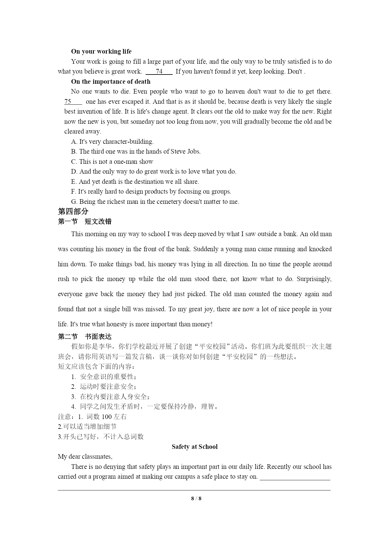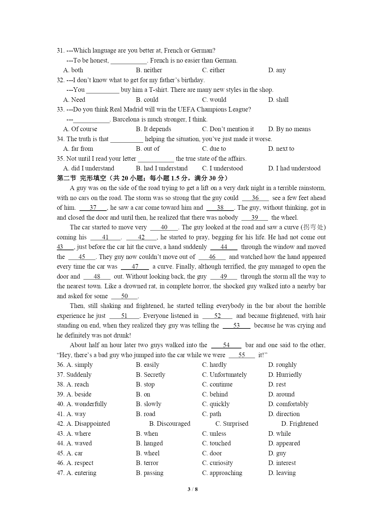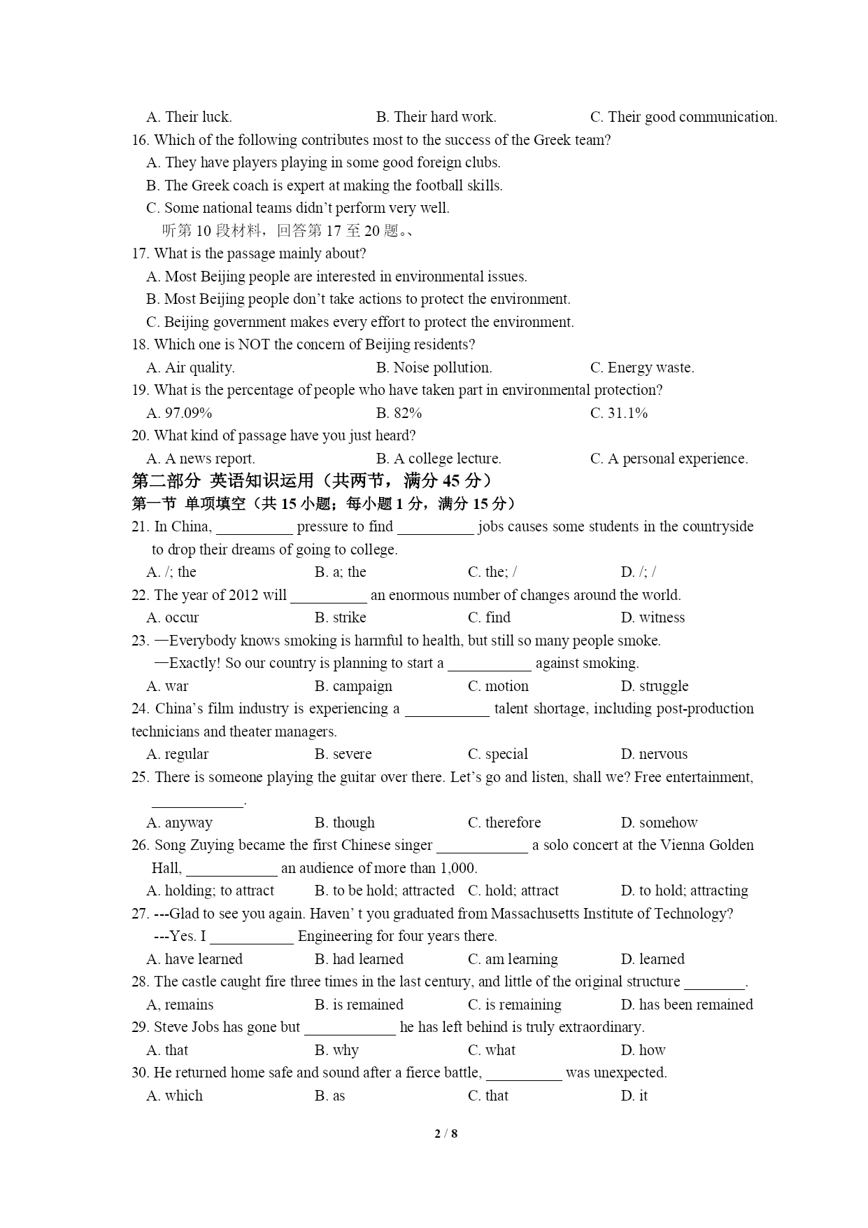 PAGE8/NUMPAGES8高三英语试题(一)第一部分听力第一节(共5小题;每小题1.5分,满分7.5分)1.Whatdoesthemanmainlydoinhissparetimenow?A.Hedoessomesports.B.Heplaysthepiano.C.Helearnsalanguage.2.Howshouldtheydotheirhomework?A.Bydoingitonthecomputer.B.Bywritingitintheirbooks.C.Bywritingitonapieceofpaper.3.Whenwillthetwospeakersmeet?A.At9:30.B.At10:00C.At10:304.Whatproblemhasthemangot?A.Hedoesn’tknowhowtousetheATM.B.Hecan’tfindaplacetohaveadrink.C.Heforgetshiscard’spassword.5.Whycan’tthewomanplayherrecords?A.Becauseshe’sbrokenthem.B.Becauseshe’slefttheminthecafé.C.Becauseshe’sforgottenwheresheputthem.第二节(共15小题;每小题1.5分,满分22.5分)听第6段材料,回答第6、7题。6.Wheredoestheconversationtakeplace?A.Inabuilding.B.Atabusstop.C.Inacafé.7.What’stheprobablerelationshipbetweenthespeakers?A.Strangers.B.FriendsC.Workmates.听第7段材料,回答第8、9题。8.Wheredoestheconversationtakeplace?A.Onthephone.B.Inarestaurant.C.Inalecturehall.9.WhenwillProfessorSmithfinishhistalk?A.Atabout1:45.B.Atabout2:15.C.Atabout2:45.听第8段材料,回答第10至12题。、10.Howmanylanguagescanthewomanspeak?A.One.B.Two.C.Three.11.Whatelsecanthewomando?A.Typing,usingacomputerandtakingshorthand.B.Typing,computerprogramminganddriving.C.Typing,doingwordprocessinganddriving.12.What’stheprobablerelationshipbetweenthemanandthewoman?A.Managerandcustomer.B.Managerandsecretary.C.Managerandjobhunter.听第9段材料,回答第13至16题。13.Whatisthewoman?A.Areporter.B.Afootballfan.C.Aclerk.14.Whatgameweretheytalkingabout?A.TheFootballWorldCupB.TheEuropeanFootballCup.C.GreekNationalCup.15.WhatdidthemanNOTmentioninthetalkfortheirsuccess?A.Theirluck.B.Theirhardwork.C.Theirgoodcommunication.16.WhichofthefollowingcontributesmosttothesuccessoftheGreekteam?A.Theyhaveplayersplayinginsomegoodforeignclubs.B.TheGreekcoachisexpertatmakingthefootballskills.C.Somenationalteamsdidn’tperformverywell.听第10段材料,回答第17至20题。、17.Whatisthepassagemainlyabout?A.MostBeijingpeopleareinter