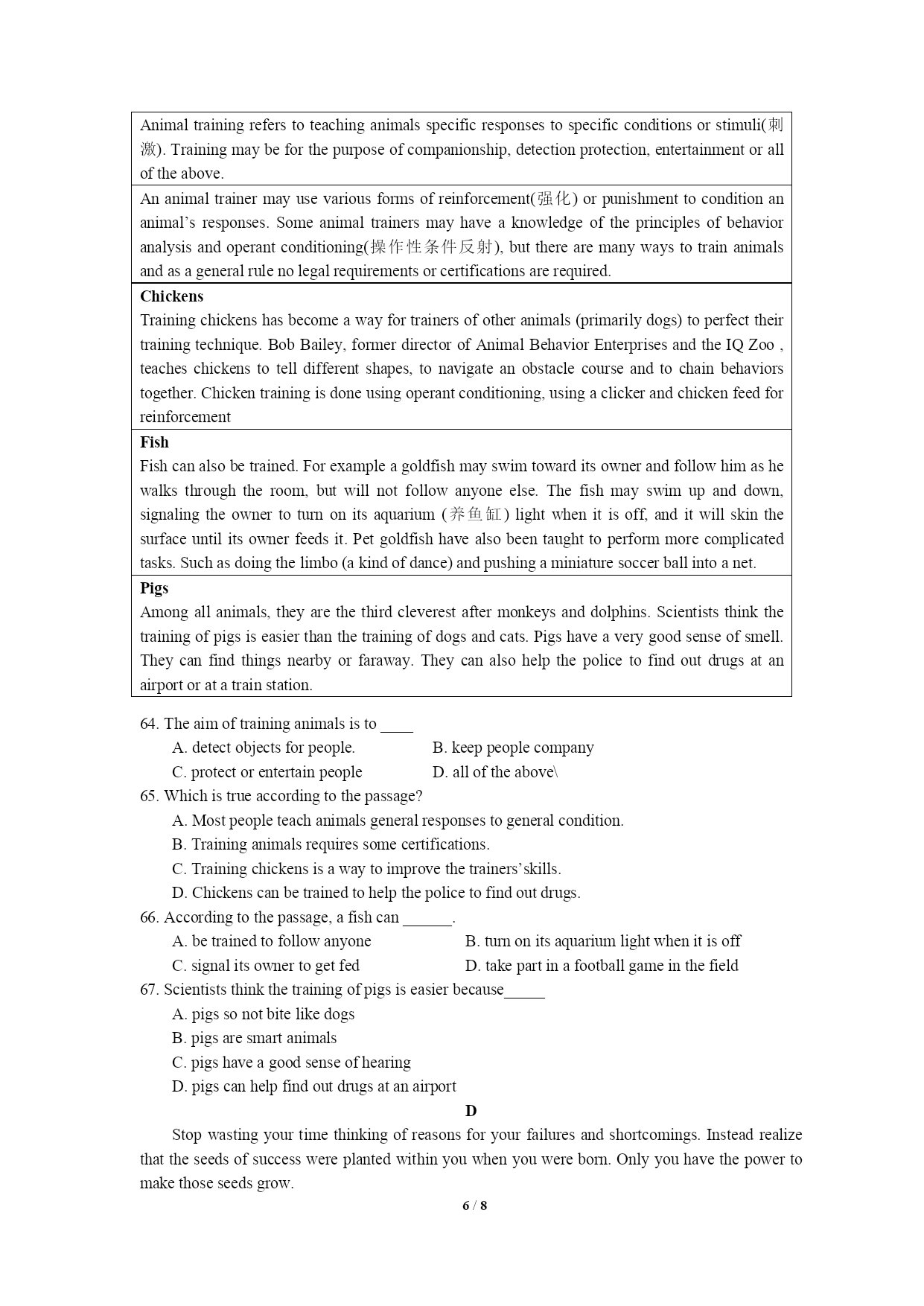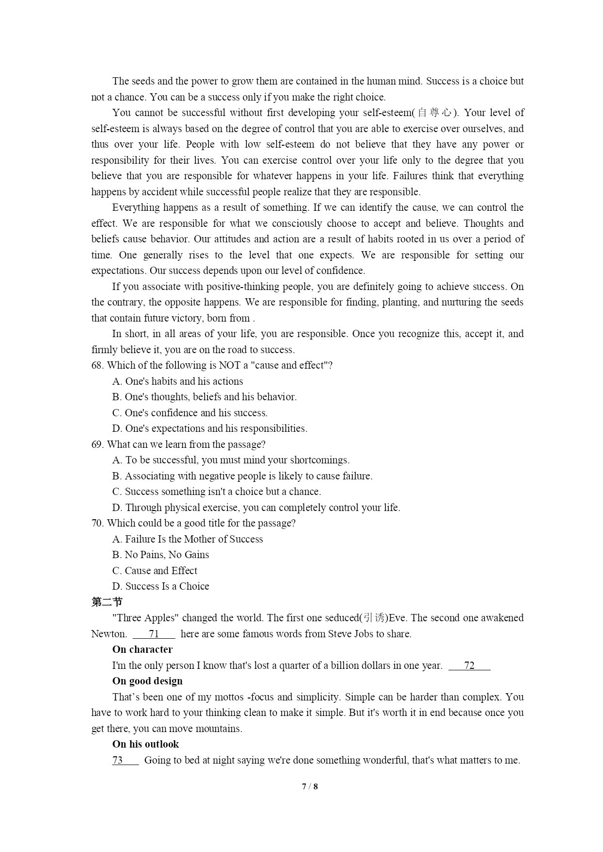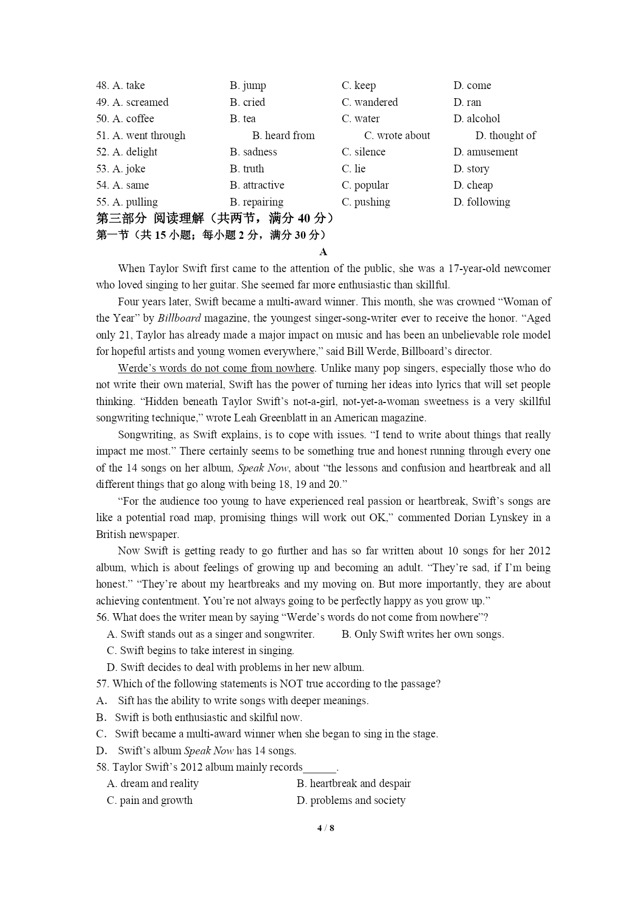 PAGE8/NUMPAGES8高三英语试题(一)第一部分听力第一节(共5小题;每小题1.5分,满分7.5分)1.Whatdoesthemanmainlydoinhissparetimenow?A.Hedoessomesports.B.Heplaysthepiano.C.Helearnsalanguage.2.Howshouldtheydotheirhomework?A.Bydoingitonthecomputer.B.Bywritingitintheirbooks.C.Bywritingitonapieceofpaper.3.Whenwillthetwospeakersmeet?A.At9:30.B.At10:00C.At10:304.Whatproblemhasthemangot?A.Hedoesn’tknowhowtousetheATM.B.Hecan’tfindaplacetohaveadrink.C.Heforgetshiscard’spassword.5.Whycan’tthewomanplayherrecords?A.Becauseshe’sbrokenthem.B.Becauseshe’slefttheminthecafé.C.Becauseshe’sforgottenwheresheputthem.第二节(共15小题;每小题1.5分,满分22.5分)听第6段材料,回答第6、7题。6.Wheredoestheconversationtakeplace?A.Inabuilding.B.Atabusstop.C.Inacafé.7.What’stheprobablerelationshipbetweenthespeakers?A.Strangers.B.FriendsC.Workmates.听第7段材料,回答第8、9题。8.Wheredoestheconversationtakeplace?A.Onthephone.B.Inarestaurant.C.Inalecturehall.9.WhenwillProfessorSmithfinishhistalk?A.Atabout1:45.B.Atabout2:15.C.Atabout2:45.听第8段材料,回答第10至12题。、10.Howmanylanguagescanthewomanspeak?A.One.B.Two.C.Three.11.Whatelsecanthewomando?A.Typing,usingacomputerandtakingshorthand.B.Typing,computerprogramminganddriving.C.Typing,doingwordprocessinganddriving.12.What’stheprobablerelationshipbetweenthemanandthewoman?A.Managerandcustomer.B.Managerandsecretary.C.Managerandjobhunter.听第9段材料,回答第13至16题。13.Whatisthewoman?A.Areporter.B.Afootballfan.C.Aclerk.14.Whatgameweretheytalkingabout?A.TheFootballWorldCupB.TheEuropeanFootballCup.C.GreekNationalCup.15.WhatdidthemanNOTmentioninthetalkfortheirsuccess?A.Theirluck.B.Theirhardwork.C.Theirgoodcommunication.16.WhichofthefollowingcontributesmosttothesuccessoftheGreekteam?A.Theyhaveplayersplayinginsomegoodforeignclubs.B.TheGreekcoachisexpertatmakingthefootballskills.C.Somenationalteamsdidn’tperformverywell.听第10段材料,回答第17至20题。、17.Whatisthepassagemainlyabout?A.MostBeijingpeopleareinter
