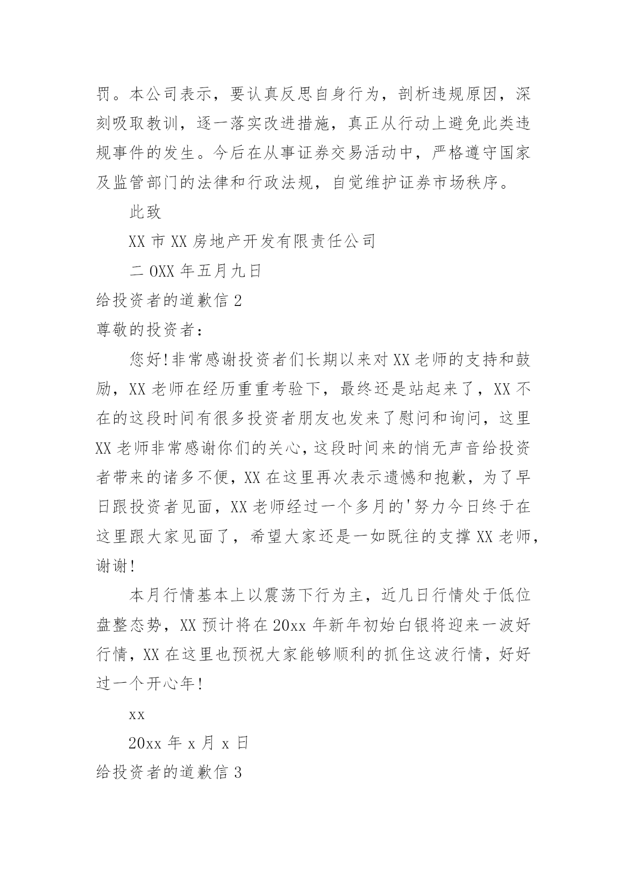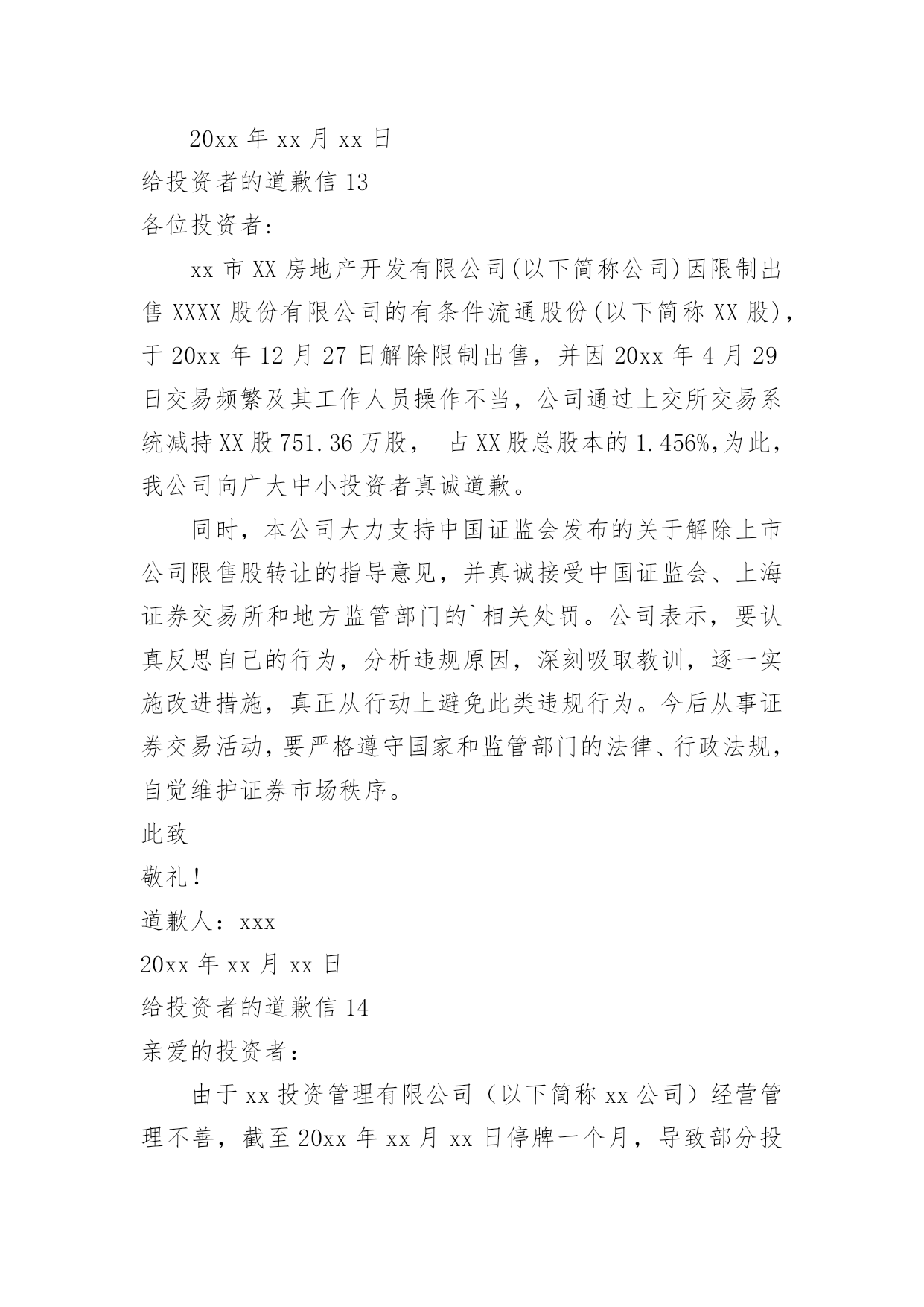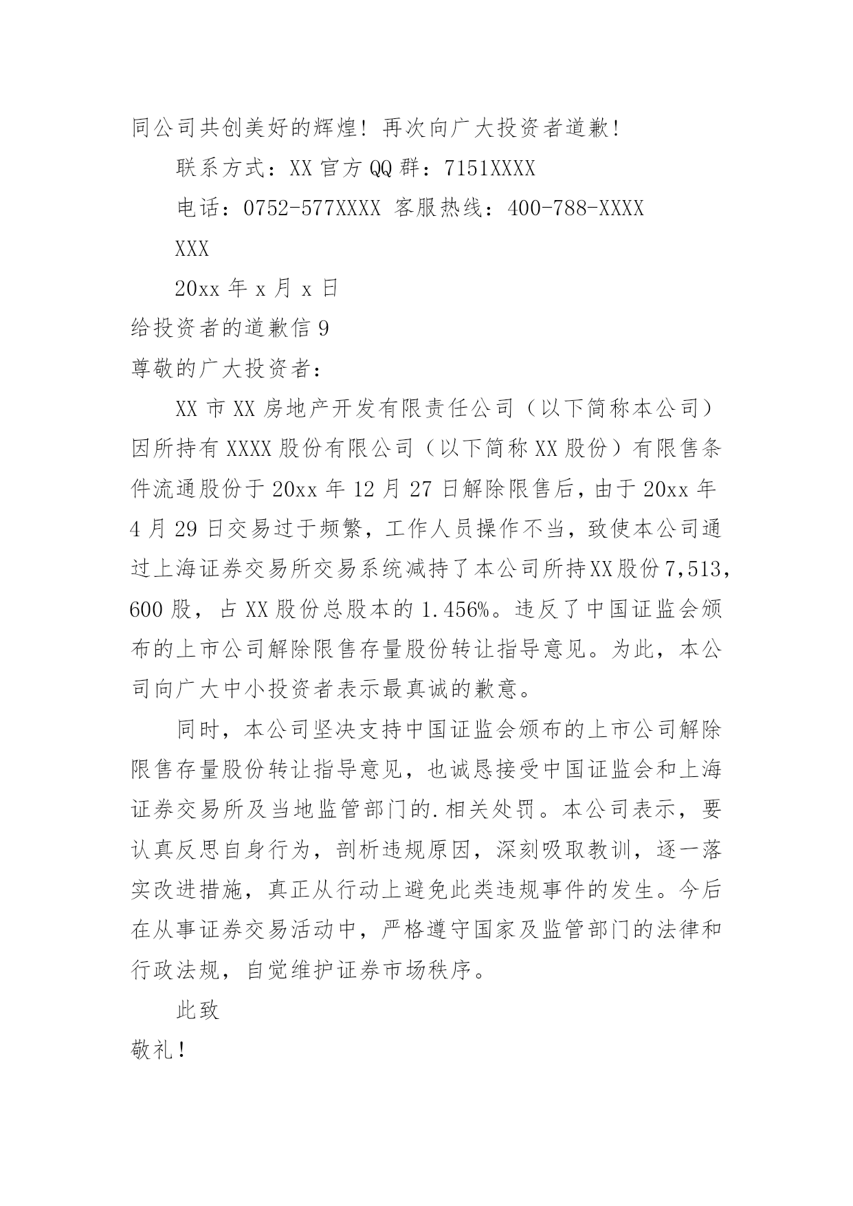 给投资者的道歉信给投资者的道歉信在日新月异的现代社会中,越来越多地方需要用到道歉信,道歉信是要向对方陈述无法答应的所请所托的原因,对不愿为的事,可声明自己的一贯主张,对不能为的请托,更应陈述理由,说明自己为什么不能为。如何写一份恰当的道歉信呢?以下是小编帮大家整理的给投资者的道歉信,仅供参考,欢迎大家阅读。给投资者的道歉信1尊敬的广大投资者XX市XX房地产开发有限责任公司(以下简称“本公司”)因所持有XXXX股份有限公司(以下简称“XX股份”)有限售条件流通股份于20xx年12月27日解除限售后,由于20xx年4月29日交易过于频繁,工作人员操作不当,致使本公司通过上海证券交易所交易系统减持了本公司所持XX股份7,513,600股,占XX股份总股本的`1。456%。违反了中国证监会颁布的>。为此,本公司向广大中小投资者表示最真诚的歉意。同时,本公司坚决支持中国证监会颁布的>,也诚恳接受中国证监会和上海证券交易所及当地监管部门的相关处罚。本公司表示,要认真反思自身行为,剖析违规原因,深刻吸取教训,逐一落实改进措施,真正从行动上避免此类违规事件的发生。今后在从事证券交易活动中,严格遵守国家及监管部门的法律和行政法规,自觉维护证券市场秩序。此致XX市XX房地产开发有限责任公司二OXX年五月九日给投资者的道歉信2尊敬的投资者:您好!非常感谢投资者们长期以来对XX老师的支持和鼓励,XX老师在经历重重考验下,最终还是站起来了,XX不在的这段时间有很多投资者朋友也发来了慰问和询问,这里XX老师非常感谢你们的关心,这段时间来的悄无声音给投资者带来的诸多不便,XX在这里再次表示遗憾和抱歉,为了早日跟投资者见面,XX老师经过一个多月的'努力今日终于在这里跟大家见面了,希望大家还是一如既往的支撑XX老师,谢谢!本月行情基本上以震荡下行为主,近几日行情处于低位盘整态势,XX预计将在20xx年新年初始白银将迎来一波好行情,XX在这里也预祝大家能够顺利的抓住这波行情,好好过一个开心年!xx20xx年x月x日给投资者的道歉信3尊敬的广大投资者:你好!XX市XX房地产开发有限责任公司(以下简称“本公司”)因所持有XXXX股份有限公司(以下简称“XX股份”)有限售条件流通股份于20xx年12月27日解除限售后,由于20xx年4月29日交易过于频繁,工作人员操作不当,致使本公司通过上海证券交易所交易系统减持了本公司所持XX股份7,513,600股,占XX股份总股本的1.456%.违反了中国证监会颁布的'《上市公司解除限售存量股份转让指导意见》。为此,本公司向广大中小投资者表示最真诚的歉意。同时,本公司坚决支持中国证监会颁布的>,也诚恳接受中国证监会和上海证券交易所及当地监管部门的相关处罚。本公司表示,要认真反思自身行为,剖析违规原因,深刻吸取教训,逐一落实改进措施,真正从行动上避免此类违规事件的发生。今后在从事证券交易活动中,严格遵守国家及监管部门的法律和行政法规,自觉维护证券市场秩序。XX市XX房地产开发有限责任公司20xx年x月x日给投资者的道歉信4各位投资者:XX市XX房地产开发有限公司(以下简称公司)因限制出售XXXX股份有限公司的有条件流通股份(以下简称XX股),于20xx年12月27日解除限制出售,并因20xx年4月29日交易频繁及其工作人员操作不当,公司通过上交所交易系统减持XX股751.36万股,占XX股总股本的1.456%,为此,我公司向广大中小投资者真诚道歉。同时,本公司大力支持中国证监会发布的关于解除上市公司限售股转让的指导意见,并真诚接受中国证监会、上海证券交易所和地方监管部门的相关处罚。公司表示,要认真反思自己的行为,分析违规原因,深入吸收培训,逐一实施改进措施,才能真正避免此类违规事件的发生。今后从事证券交易活动,要严格遵守国家和监管部门的`法律、行政法规,自觉维护证券市场秩序。我在此交流XX市XX房地产开发有限公司20xx年5月9日给投资者的道歉信5各位投资者:xx市XX房地产开发有限公司(以下简称“本公司”)于20xx年12月27日解除限售,原因是其限售XXXX有限公司的有条件流通股份(以下简称“XX股份”)。由于20xx年4月29日交易频繁,员工操作不当,公司减持xx股751.36万股,占XX股。为此,我公司向广大中小投资者真诚道歉。同时,本公司强烈支持中国证监会颁布的法规,并真诚接受中国证监会、上海证券交易所和当地监管部门的'相关处罚。公司表示,要认真反思自己的行为,分析违规原因,深刻吸取教训,逐一实施改进措施,真正从行动中避免此类违规行为。今后从事证券交易活动,要严格遵守国家和监管部门的法律、行政法规,自觉维护证券市场秩序。此致敬礼!道歉人:xxx20xx年xx月xx日给投资者的道歉信6尊敬的投资者:您好!非常感谢投资者