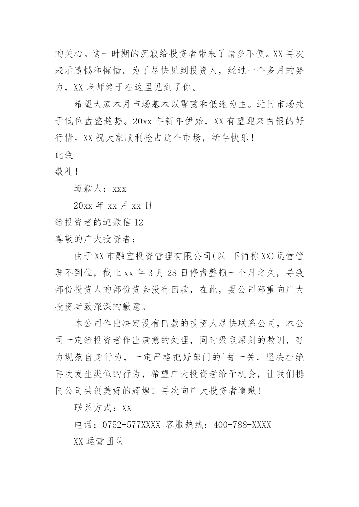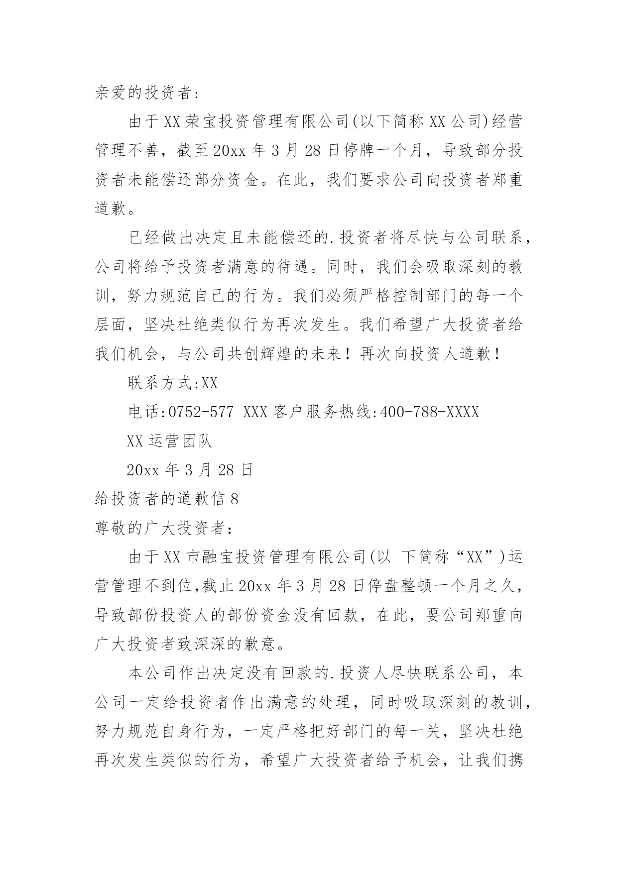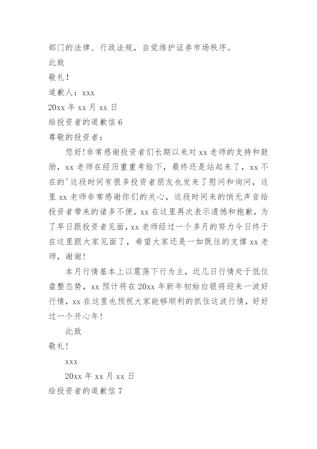 给投资者的道歉信给投资者的道歉信在日新月异的现代社会中,越来越多地方需要用到道歉信,道歉信是要向对方陈述无法答应的所请所托的原因,对不愿为的事,可声明自己的一贯主张,对不能为的请托,更应陈述理由,说明自己为什么不能为。如何写一份恰当的道歉信呢?以下是小编帮大家整理的给投资者的道歉信,仅供参考,欢迎大家阅读。给投资者的道歉信1尊敬的广大投资者XX市XX房地产开发有限责任公司(以下简称“本公司”)因所持有XXXX股份有限公司(以下简称“XX股份”)有限售条件流通股份于20xx年12月27日解除限售后,由于20xx年4月29日交易过于频繁,工作人员操作不当,致使本公司通过上海证券交易所交易系统减持了本公司所持XX股份7,513,600股,占XX股份总股本的`1。456%。违反了中国证监会颁布的>。为此,本公司向广大中小投资者表示最真诚的歉意。同时,本公司坚决支持中国证监会颁布的>,也诚恳接受中国证监会和上海证券交易所及当地监管部门的相关处罚。本公司表示,要认真反思自身行为,剖析违规原因,深刻吸取教训,逐一落实改进措施,真正从行动上避免此类违规事件的发生。今后在从事证券交易活动中,严格遵守国家及监管部门的法律和行政法规,自觉维护证券市场秩序。此致XX市XX房地产开发有限责任公司二OXX年五月九日给投资者的道歉信2尊敬的投资者:您好!非常感谢投资者们长期以来对XX老师的支持和鼓励,XX老师在经历重重考验下,最终还是站起来了,XX不在的这段时间有很多投资者朋友也发来了慰问和询问,这里XX老师非常感谢你们的关心,这段时间来的悄无声音给投资者带来的诸多不便,XX在这里再次表示遗憾和抱歉,为了早日跟投资者见面,XX老师经过一个多月的'努力今日终于在这里跟大家见面了,希望大家还是一如既往的支撑XX老师,谢谢!本月行情基本上以震荡下行为主,近几日行情处于低位盘整态势,XX预计将在20xx年新年初始白银将迎来一波好行情,XX在这里也预祝大家能够顺利的抓住这波行情,好好过一个开心年!xx20xx年x月x日给投资者的道歉信3尊敬的广大投资者:你好!XX市XX房地产开发有限责任公司(以下简称“本公司”)因所持有XXXX股份有限公司(以下简称“XX股份”)有限售条件流通股份于20xx年12月27日解除限售后,由于20xx年4月29日交易过于频繁,工作人员操作不当,致使本公司通过上海证券交易所交易系统减持了本公司所持XX股份7,513,600股,占XX股份总股本的1.456%.违反了中国证监会颁布的'《上市公司解除限售存量股份转让指导意见》。为此,本公司向广大中小投资者表示最真诚的歉意。同时,本公司坚决支持中国证监会颁布的>,也诚恳接受中国证监会和上海证券交易所及当地监管部门的相关处罚。本公司表示,要认真反思自身行为,剖析违规原因,深刻吸取教训,逐一落实改进措施,真正从行动上避免此类违规事件的发生。今后在从事证券交易活动中,严格遵守国家及监管部门的法律和行政法规,自觉维护证券市场秩序。XX市XX房地产开发有限责任公司20xx年x月x日给投资者的道歉信4各位投资者:XX市XX房地产开发有限公司(以下简称公司)因限制出售XXXX股份有限公司的有条件流通股份(以下简称XX股),于20xx年12月27日解除限制出售,并因20xx年4月29日交易频繁及其工作人员操作不当,公司通过上交所交易系统减持XX股751.36万股,占XX股总股本的1.456%,为此,我公司向广大中小投资者真诚道歉。同时,本公司大力支持中国证监会发布的关于解除上市公司限售股转让的指导意见,并真诚接受中国证监会、上海证券交易所和地方监管部门的相关处罚。公司表示,要认真反思自己的行为,分析违规原因,深入吸收培训,逐一实施改进措施,才能真正避免此类违规事件的发生。今后从事证券交易活动,要严格遵守国家和监管部门的`法律、行政法规,自觉维护证券市场秩序。我在此交流XX市XX房地产开发有限公司20xx年5月9日给投资者的道歉信5各位投资者:xx市XX房地产开发有限公司(以下简称“本公司”)于20xx年12月27日解除限售,原因是其限售XXXX有限公司的有条件流通股份(以下简称“XX股份”)。由于20xx年4月29日交易频繁,员工操作不当,公司减持xx股751.36万股,占XX股。为此,我公司向广大中小投资者真诚道歉。同时,本公司强烈支持中国证监会颁布的法规,并真诚接受中国证监会、上海证券交易所和当地监管部门的'相关处罚。公司表示,要认真反思自己的行为,分析违规原因,深刻吸取教训,逐一实施改进措施,真正从行动中避免此类违规行为。今后从事证券交易活动,要严格遵守国家和监管部门的法律、行政法规,自觉维护证券市场秩序。此致敬礼!道歉人:xxx20xx年xx月xx日给投资者的道歉信6尊敬的投资者:您好!非常感谢投资者