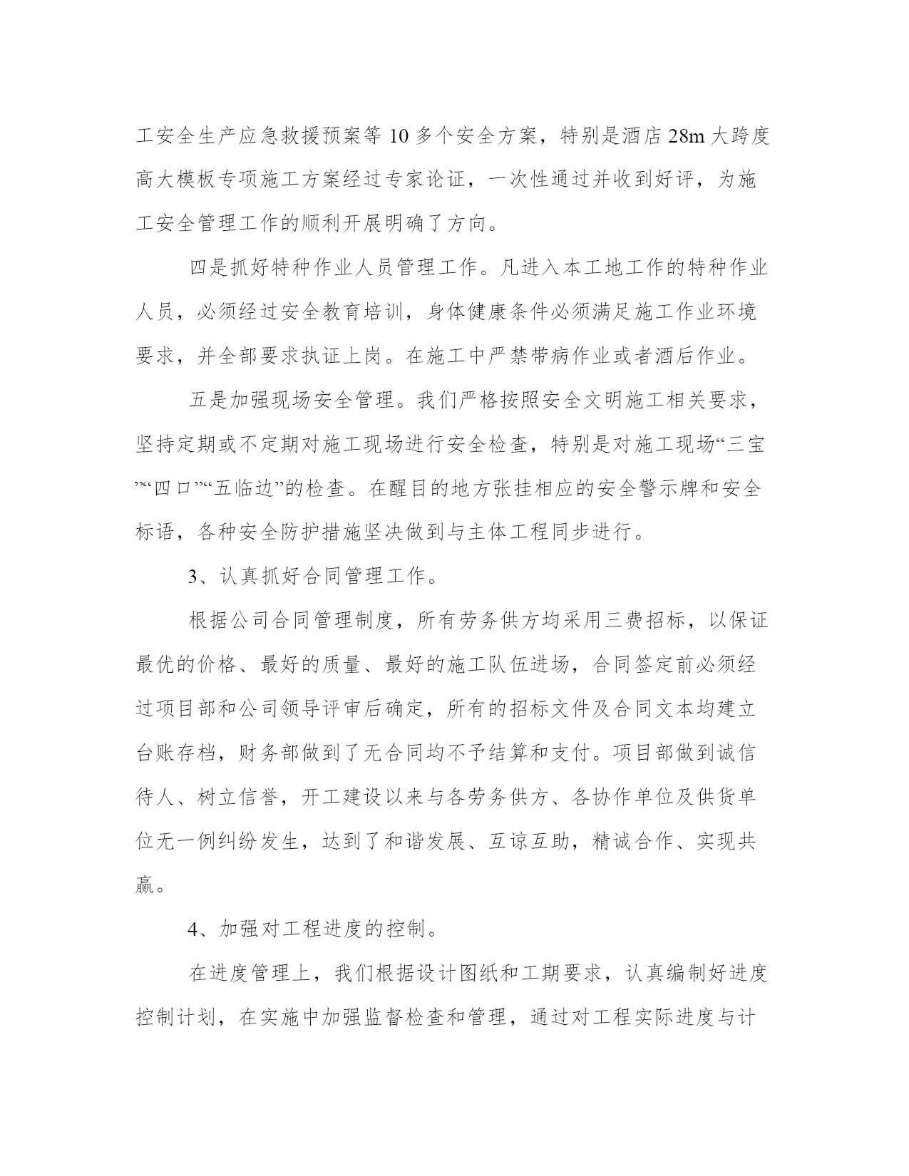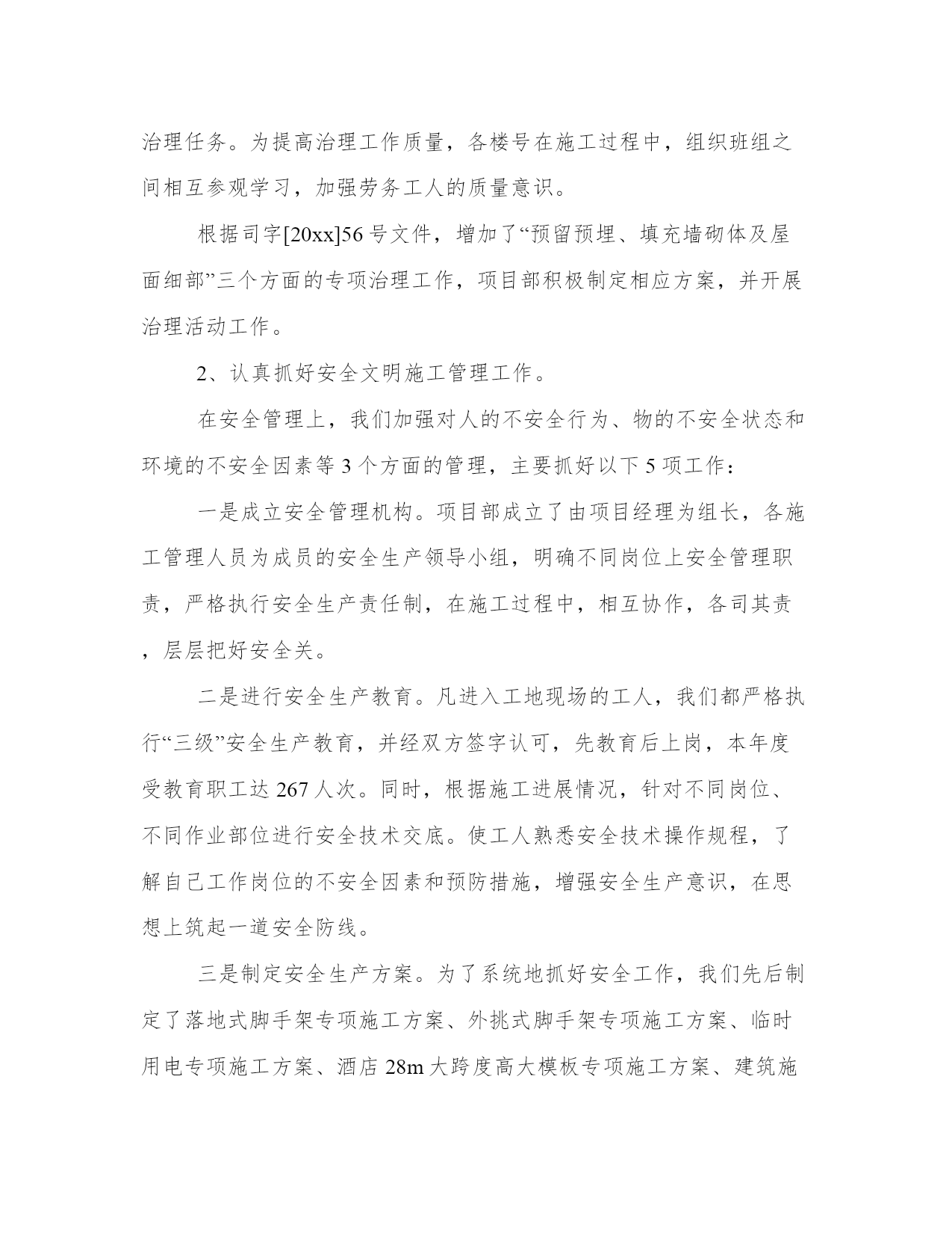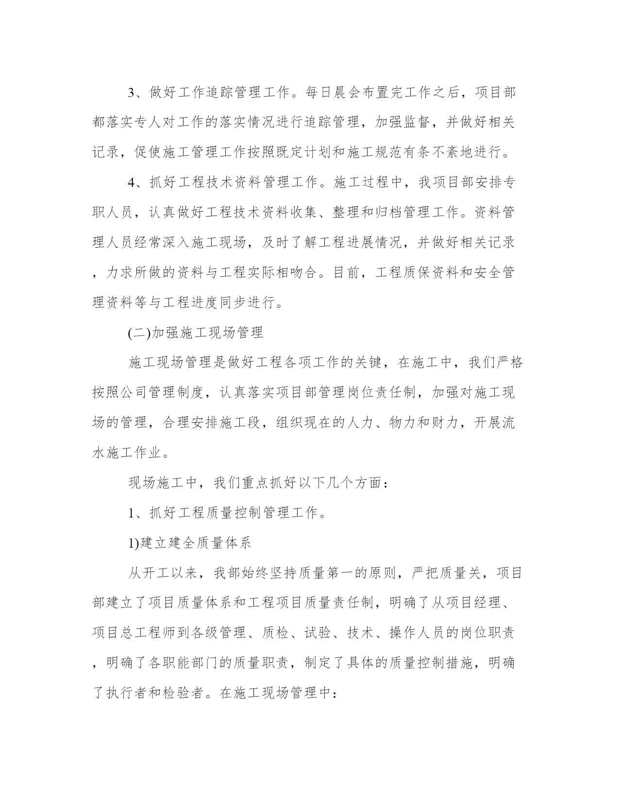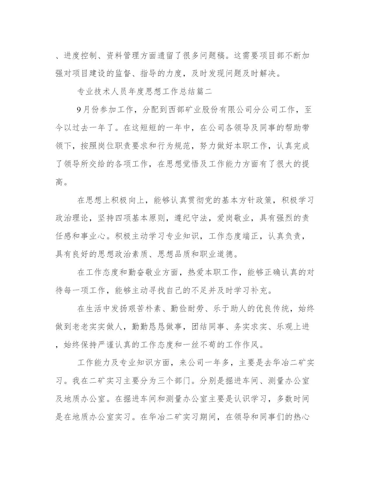 专业技术人员年度思想工作总结(9篇)总结不仅仅是总结成绩,更重要的是为了分析经验,发现做好工作的规律,也可以找出工作失误的教训。这些经验教训是非常宝贵的,对工作有很好的借鉴与指导作用,在今后工作中可以改进提高,趋利避害,避免失误。什么样的总结才是有效的呢?这里给大家分享一些最新的总结书范文,方便大家学习。专业技术人员年度思想工作总结篇一一年来,我项目部严格按照公司的工作计划部署,认真抓好项目各项管理工作,已经完成的工程质量均达到合格要求。(一)抓好项目部建设管理工作1、完善项目机构建设。为了圆满完成施工任务,我们于20xx年组建了扬中市府都花苑项目部,并在20xx调整项目班子,积极完善各项规章制度,落实工作职责,发扬企业精神,组织精兵强将全力以赴投入工程的施工,确保工程能够按计划、有步骤地进行。2、认真制定工作方案。为了使施工管理工作顺利开展,项目部根据施工总进度计划的要求,认真制定好日、周、月工作计划,并召开项目部专业会议,项目经理亲自对工作进行部署,将工作任务通过施工管理人员落实到班组,落实到人,一级抓一级,层层抓落实。3、做好工作追踪管理工作。每日晨会布置完工作之后,项目部都落实专人对工作的落实情况进行追踪管理,加强监督,并做好相关记录,促使施工管理工作按照既定计划和施工规范有条不紊地进行。4、抓好工程技术资料管理工作。施工过程中,我项目部安排专职人员,认真做好工程技术资料收集、整理和归档管理工作。资料管理人员经常深入施工现场,及时了解工程进展情况,并做好相关记录,力求所做的资料与工程实际相吻合。目前,工程质保资料和安全管理资料等与工程进度同步进行。(二)加强施工现场管理施工现场管理是做好工程各项工作的关键,在施工中,我们严格按照公司管理制度,认真落实项目部管理岗位责任制,加强对施工现场的管理,合理安排施工段,组织现在的人力、物力和财力,开展流水施工作业。现场施工中,我们重点抓好以下几个方面:1、抓好工程质量控制管理工作。1)建立建全质量体系从开工以来,我部始终坚持质量第一的原则,严把质量关,项目部建立了项目质量体系和工程项目质量责任制,明确了从项目经理、项目总工程师到各级管理、质检、试验、技术、操作人员的岗位职责,明确了各职能部门的质量职责,制定了具体的质量控制措施,明确了执行者和检验者。在施工现场管理中:①、对于重点、难点工程的施工组织设计和专项施工方案严格按程序报批,均通过监理工程师审批,并在施工过程中,严格按施工方案执行。②、对于每次进场的各种材料,严格执行材料进场取样送检制度,并建立了试验台帐。③、在施工现场管理中严格执行施工技术交底制度,且记录齐全,施工人员在施工过程中做好了施工原始记录。④、对于监理指令中提出的问题及时予以整改并经监理工程师复检验收合格同意后才进行下道工序的施工。⑤、建立了三级自检体系,从项目部到劳务公司,再到班组,分级检验。2)抓好机械的管理工作。施工机械的好坏直接影响到工程质量的又一重要方面。为了保证施工机械能够正常运转,我项目部指派专人对施工机械定期或不定期进行检修维护,发现问题,及时解决,并做好相关检测记录,尽量减少机械设备故障的发生。选择性能精良、满足施工需求的机械设备,最大限度提高机械利用率。3)开展专项治理工作工程开工后,项目部编制了工程质量专项治理方案,并成立了专项治理小组,对小组成员的职能分工进行了明确划分,确保每一项治理工作处于受控状态。根据项目进度情况,编制了专项治理计划以及治理任务。为提高治理工作质量,各楼号在施工过程中,组织班组之间相互参观学习,加强劳务工人的质量意识。根据司字[20xx]56号文件,增加了“预留预埋、填充墙砌体及屋面细部”三个方面的专项治理工作,项目部积极制定相应方案,并开展治理活动工作。2、认真抓好安全文明施工管理工作。在安全管理上,我们加强对人的不安全行为、物的不安全状态和环境的不安全因素等3个方面的管理,主要抓好以下5项工作:一是成立安全管理机构。项目部成立了由项目经理为组长,各施工管理人员为成员的安全生产领导小组,明确不同岗位上安全管理职责,严格执行安全生产责任制,在施工过程中,相互协作,各司其责,层层把好安全关。二是进行安全生产教育。凡进入工地现场的工人,我们都严格执行“三级”安全生产教育,并经双方签字认可,先教育后上岗,本年度受教育职工达267人次。同时,根据施工进展情况,针对不同岗位、不同作业部位进行安全技术交底。使工人熟悉安全技术操作规程,了解自己工作岗位的不安全因素和预防措施,增强安全生产意识,在思想上筑起一道安全防线。三是制定安全生产方案。为了系统地抓好安全工作,我们先后制定了落地式脚手架专项施工方案、外挑式脚手架专项施工方案、临时用电专项施工方案、酒店28m大跨度高大