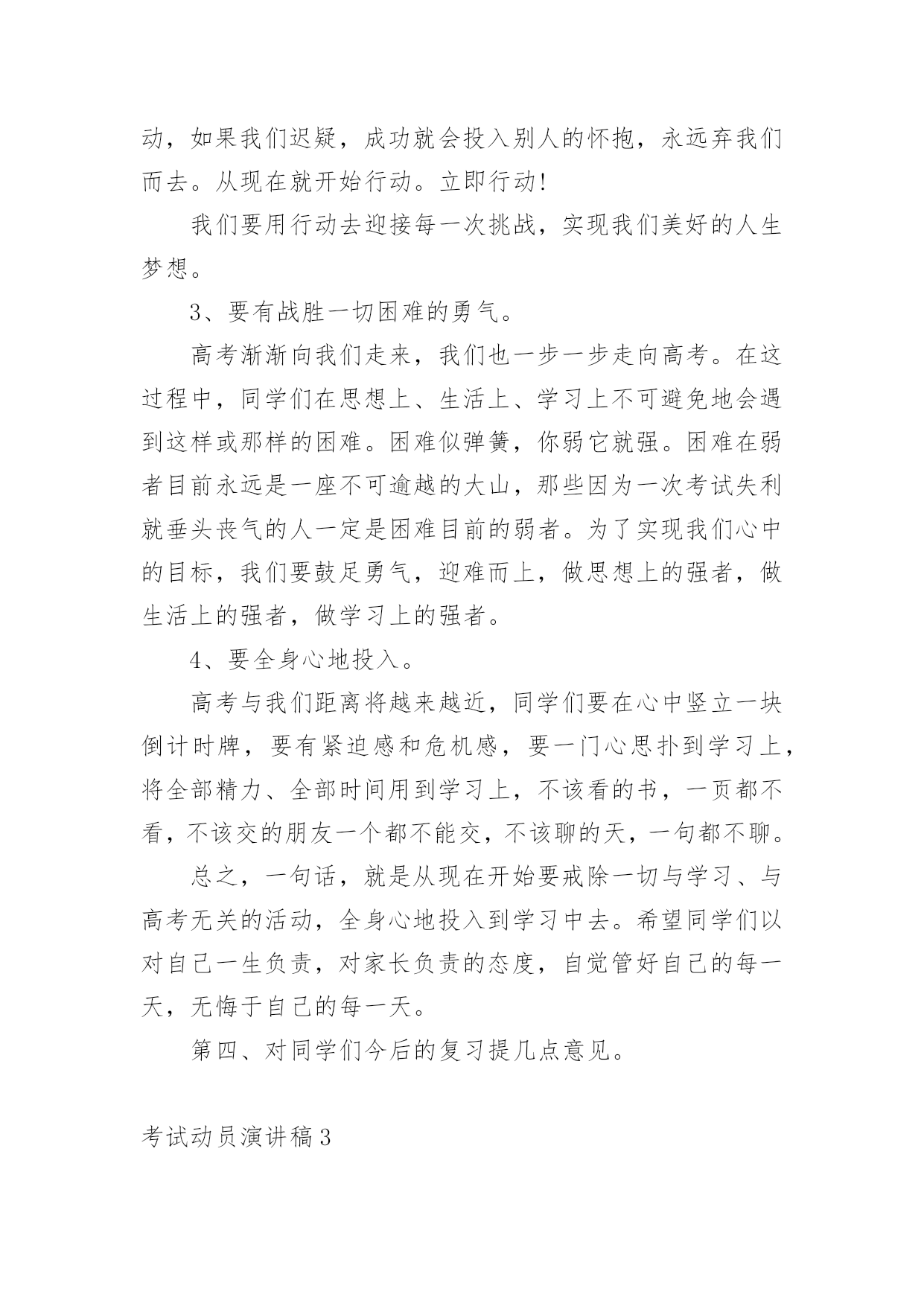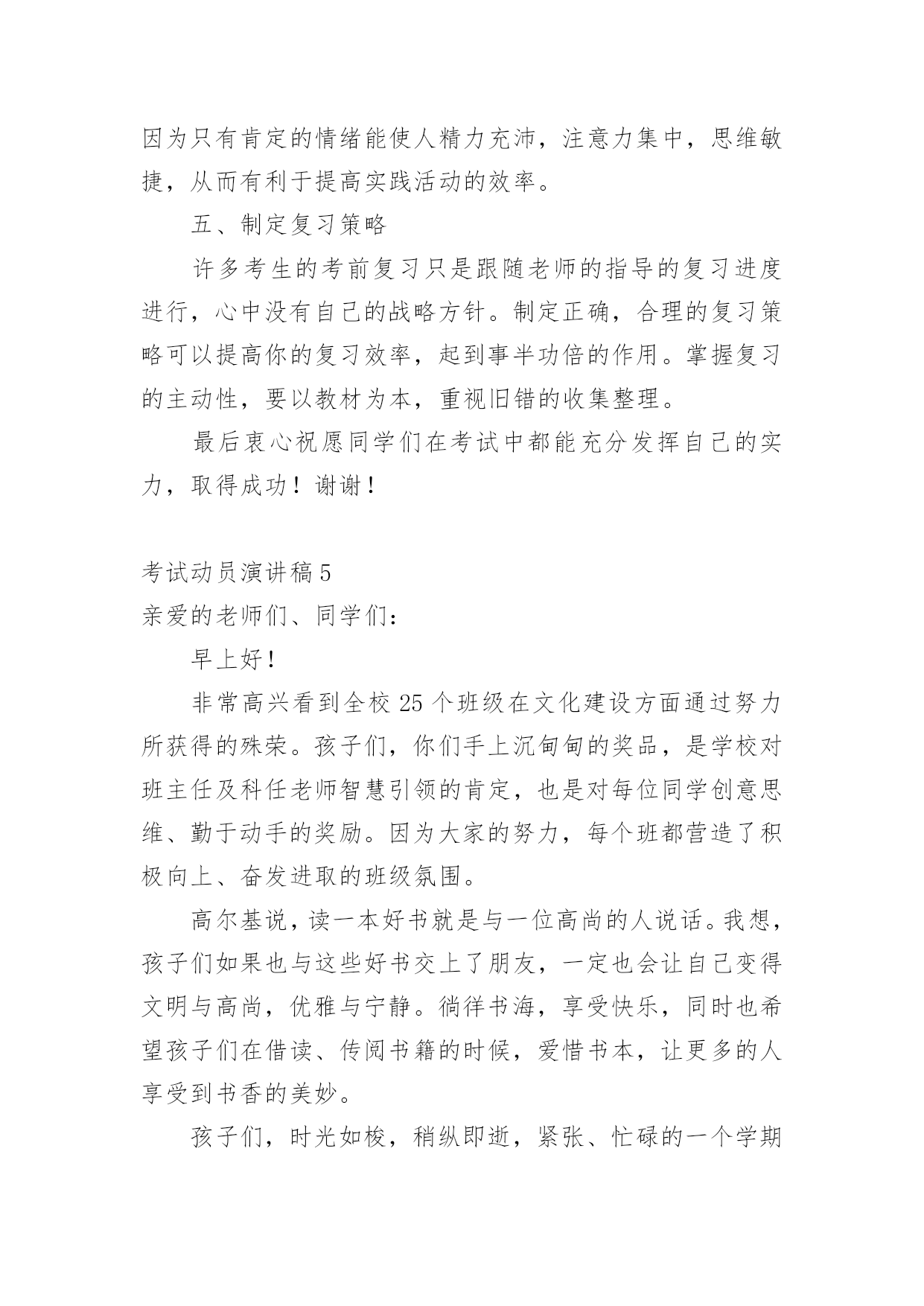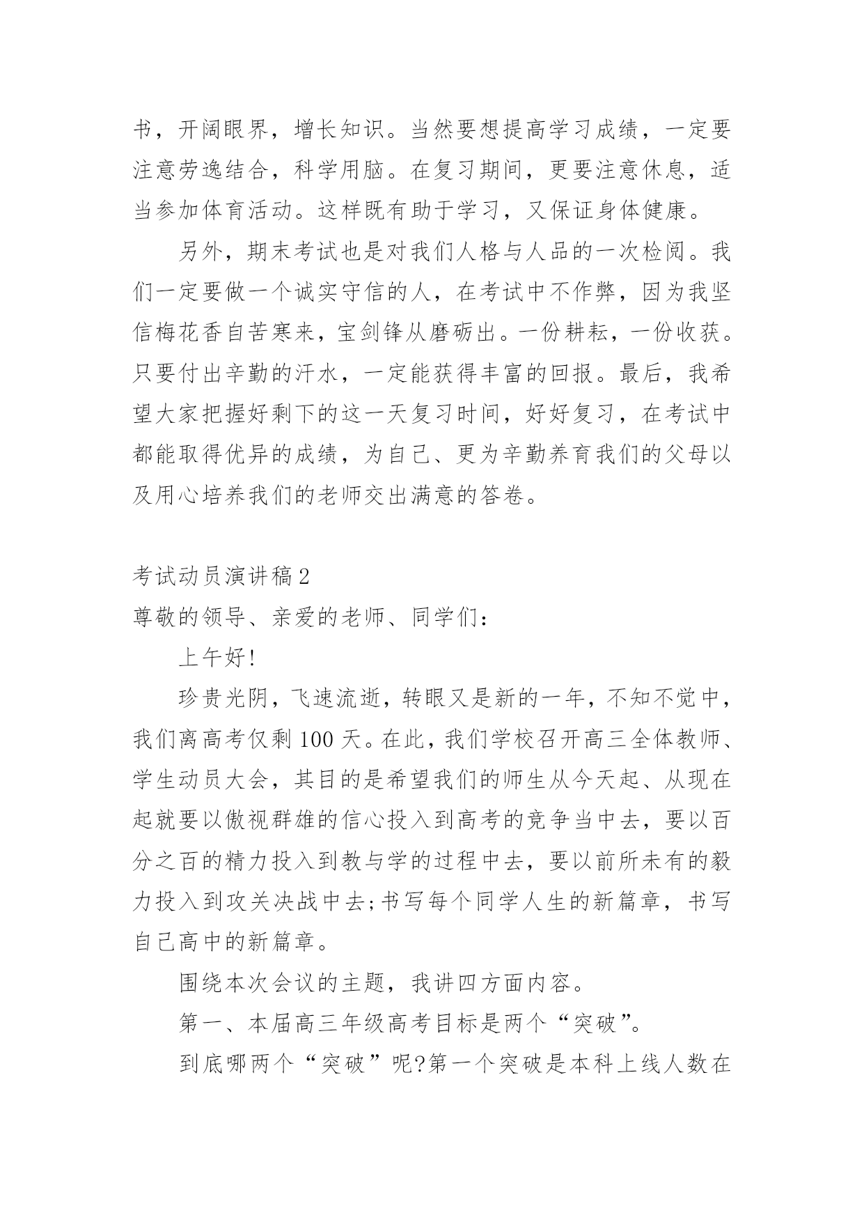 考试动员演讲稿演讲稿的内容要根据具体情境、具体场合来确定,要求情感真实,尊重观众。在我们平凡的日常里,需要使用演讲稿的事情愈发增多,大家知道演讲稿的格式吗?以下是小编帮大家整理的考试动员演讲稿,欢迎阅读与收藏。考试动员演讲稿1老师、同学们:早上好!时间过得飞快,不知不觉又到了期末,本周我们将进行期末考试。考试是检验我们一学期的学习成果,考试成绩是我们一学期学习情况的重要体现,所以我们要高度重视,不掉以轻心。那么,怎样才能发挥最佳水平,考出优异的成绩呢?我建议大家做到以下几点:首先要做到有效复习知识,查漏补缺。要全面梳理本学期所学的知识,结合平时作业、练习,找到自己知识上的漏洞,明确自己的复习重点。同时,还要养成良好的学习习惯,提高学习质量。在课堂上我们跟着老师认真复习,学会听讲,注意力集中,要敢于提问。重点的'与不理解的问题可以记在笔记本上,及时向老师、同学请教,弄懂为止。对于老师在复习期间留的作业要独立思考、认真完成。养成审题习惯,理清解题思路,学会检查,确保正确。其次要加强课外学习,弥补课堂上的不足。要培养自己读书的爱好,主动阅读课外书,开阔眼界,增长知识。当然要想提高学习成绩,一定要注意劳逸结合,科学用脑。在复习期间,更要注意休息,适当参加体育活动。这样既有助于学习,又保证身体健康。另外,期末考试也是对我们人格与人品的一次检阅。我们一定要做一个诚实守信的人,在考试中不作弊,因为我坚信梅花香自苦寒来,宝剑锋从磨砺出。一份耕耘,一份收获。只要付出辛勤的汗水,一定能获得丰富的回报。最后,我希望大家把握好剩下的这一天复习时间,好好复习,在考试中都能取得优异的成绩,为自己、更为辛勤养育我们的父母以及用心培养我们的老师交出满意的答卷。考试动员演讲稿2尊敬的领导、亲爱的老师、同学们:上午好!珍贵光阴,飞速流逝,转眼又是新的一年,不知不觉中,我们离高考仅剩100天。在此,我们学校召开高三全体教师、学生动员大会,其目的是希望我们的师生从今天起、从现在起就要以傲视群雄的信心投入到高考的竞争当中去,要以百分之百的精力投入到教与学的过程中去,要以前所未有的毅力投入到攻关决战中去;书写每个同学人生的新篇章,书写自己高中的新篇章。围绕本次会议的主题,我讲四方面内容。第一、本届高三年级高考目标是两个“突破”。到底哪两个“突破”呢?第一个突破是本科上线人数在去年的基础上有突破;第二个突破是三A上线人数有突破,以此来进一步提高我们的整体势力。第二、实现高考“双突破”目标的四大优势。本届高三年级高考“双突破”目标,不是盲目提出的,而是在综合考虑了我们学校的校内外、年级内外的具体实际提出的,是建立在实现这一目标的四大优势基础上提出的。这四大优势是:1、近几年我校高考的'成功经验、扩招、新形势、新体制,极大地激发了我们全体教职员工的工作热情和拼搏精神,这是我们实现“双突破”的目标的第一大优势。2、学校对本届高三十分重视,在教师配备、财力投入上向高三倾斜,是我们实现“双突破”的目标的第二大优势。学校始终把高三工作当作学校工作的重中之重,全力支持高三工作。学校为高三年级配备了德才兼备的教师群体,在政策与工作上,始终坚持向高三倾斜,围绕高考开展工作。这就为我们实现“双突破”的目标奠定了坚实人才基础。学校十分关注、关心高三工作,关心高三老师的工作、生活情况,关心高三学生的学习、生活情况,发现问题,及时解决。目前,高三年级秩序井然,氛围浓厚,势头看好,丰收有望。这种良好局面的形成,是学校和全体高三师生共同努力的结果,也是我们实现“双突破”的目标又一大优势。3、我们有一支德才兼备特别能战斗的教师队伍,这是我们实现“双突破”的目标的第三优势。本届高三绝大部分老师是优中选优、强中选强才留下来的,是整体素质高、人品、学识兼优的老师,他们团结协作,积极奉献,咬定教学质量不放松,用自己行动和优良的业绩赢得学生的爱戴、家长的信任和社会的赞誉。人的因素是事业成败的决定因素,优秀教师的荟萃,是我们实现“双突破”的目标的第三优势。4、本届高三学生整体发展的良好态势是第四大优势。我们这一届高三学生是一群有崇高人生理想的学生,是一群肯学、善学的学生,是一群一定会学有所成的学生,是一群一定会创造新辉煌的学生,有了你们的努力,你们的成绩,使我们在提出双突破目标时有了充足的底气。另外,从升入高三开始,为做好尖子生的培养工作,我们选拔业务能力强、责任心强的老师对尖子生进行专门的辅导,这些尖子生是我们冲击高校的主力军。同学们,有了以上四大优势,我们完全有信心实现双突破的高考目标。第三、为顺利实现“双突破”的目标,我对同学们提出几点要求。1、要有明确的个人目标。我希望同学们要尽快确立自己的高考目标,并把自己目标写下来,时时提醒自己,时时鞭策自己。2、从现在就开始行动。目标不是口头说说的动人话语,它需要