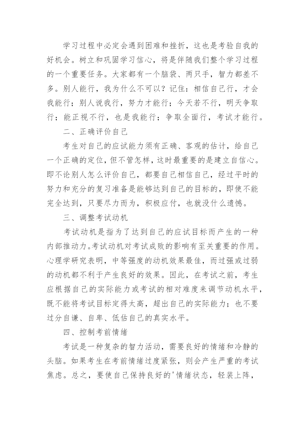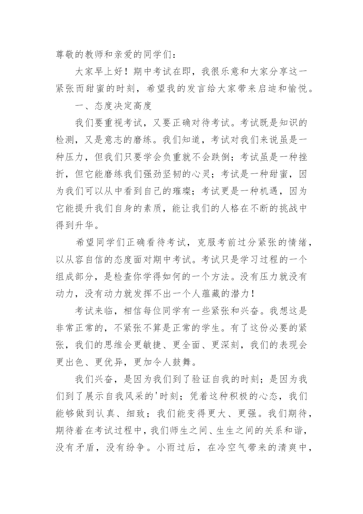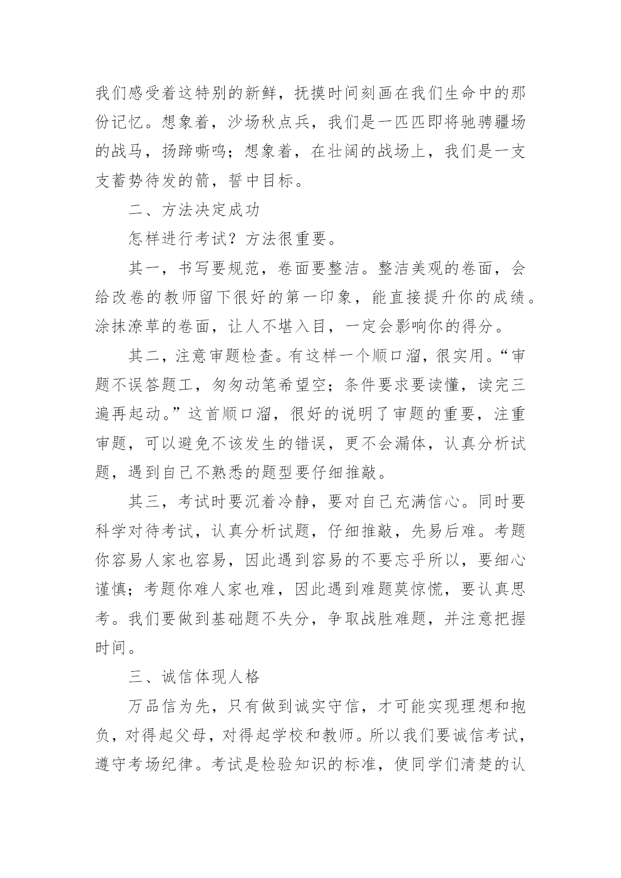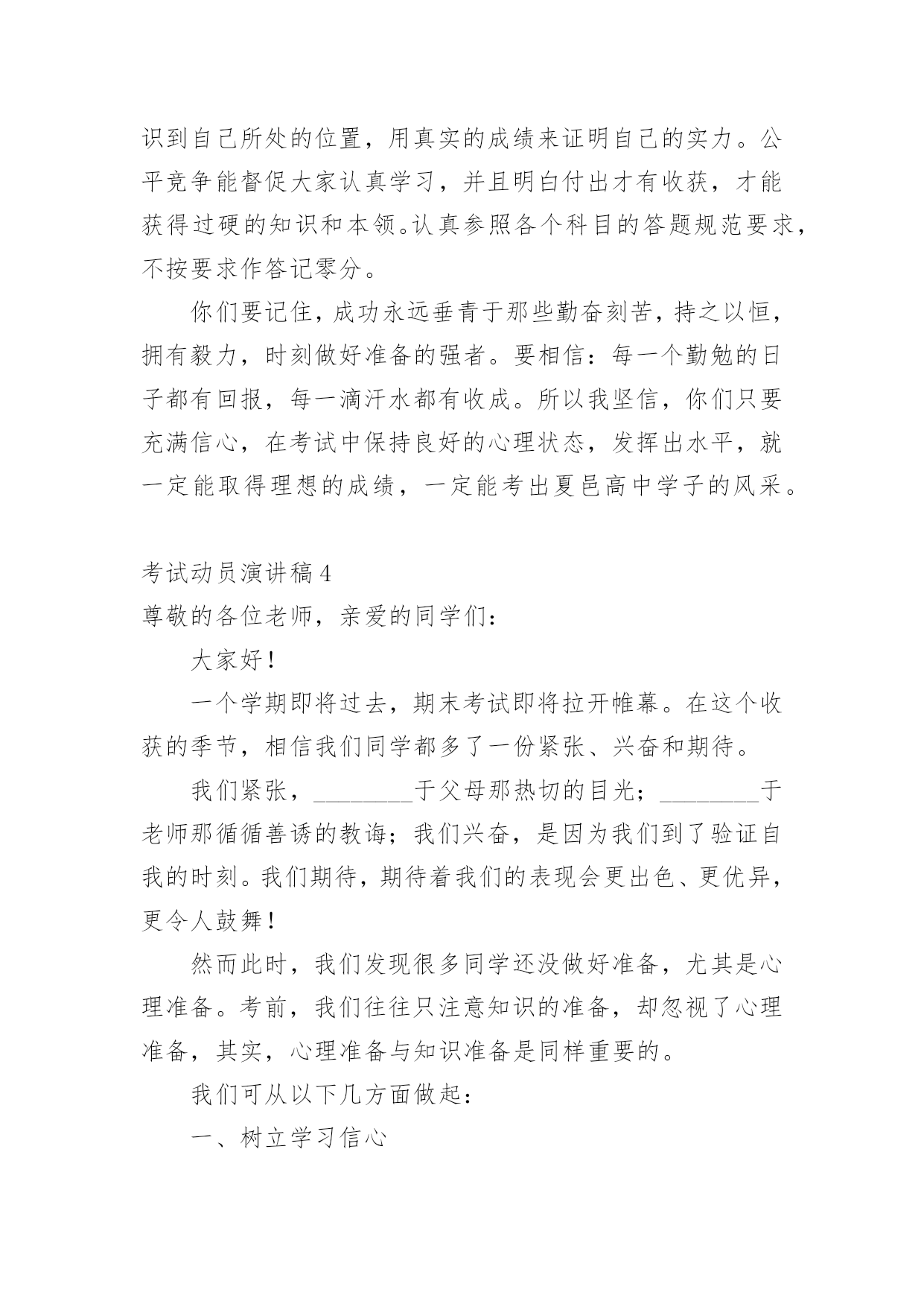 考试动员演讲稿演讲稿的内容要根据具体情境、具体场合来确定,要求情感真实,尊重观众。在我们平凡的日常里,需要使用演讲稿的事情愈发增多,大家知道演讲稿的格式吗?以下是小编帮大家整理的考试动员演讲稿,欢迎阅读与收藏。考试动员演讲稿1老师、同学们:早上好!时间过得飞快,不知不觉又到了期末,本周我们将进行期末考试。考试是检验我们一学期的学习成果,考试成绩是我们一学期学习情况的重要体现,所以我们要高度重视,不掉以轻心。那么,怎样才能发挥最佳水平,考出优异的成绩呢?我建议大家做到以下几点:首先要做到有效复习知识,查漏补缺。要全面梳理本学期所学的知识,结合平时作业、练习,找到自己知识上的漏洞,明确自己的复习重点。同时,还要养成良好的学习习惯,提高学习质量。在课堂上我们跟着老师认真复习,学会听讲,注意力集中,要敢于提问。重点的'与不理解的问题可以记在笔记本上,及时向老师、同学请教,弄懂为止。对于老师在复习期间留的作业要独立思考、认真完成。养成审题习惯,理清解题思路,学会检查,确保正确。其次要加强课外学习,弥补课堂上的不足。要培养自己读书的爱好,主动阅读课外书,开阔眼界,增长知识。当然要想提高学习成绩,一定要注意劳逸结合,科学用脑。在复习期间,更要注意休息,适当参加体育活动。这样既有助于学习,又保证身体健康。另外,期末考试也是对我们人格与人品的一次检阅。我们一定要做一个诚实守信的人,在考试中不作弊,因为我坚信梅花香自苦寒来,宝剑锋从磨砺出。一份耕耘,一份收获。只要付出辛勤的汗水,一定能获得丰富的回报。最后,我希望大家把握好剩下的这一天复习时间,好好复习,在考试中都能取得优异的成绩,为自己、更为辛勤养育我们的父母以及用心培养我们的老师交出满意的答卷。考试动员演讲稿2尊敬的领导、亲爱的老师、同学们:上午好!珍贵光阴,飞速流逝,转眼又是新的一年,不知不觉中,我们离高考仅剩100天。在此,我们学校召开高三全体教师、学生动员大会,其目的是希望我们的师生从今天起、从现在起就要以傲视群雄的信心投入到高考的竞争当中去,要以百分之百的精力投入到教与学的过程中去,要以前所未有的毅力投入到攻关决战中去;书写每个同学人生的新篇章,书写自己高中的新篇章。围绕本次会议的主题,我讲四方面内容。第一、本届高三年级高考目标是两个“突破”。到底哪两个“突破”呢?第一个突破是本科上线人数在去年的基础上有突破;第二个突破是三A上线人数有突破,以此来进一步提高我们的整体势力。第二、实现高考“双突破”目标的四大优势。本届高三年级高考“双突破”目标,不是盲目提出的,而是在综合考虑了我们学校的校内外、年级内外的具体实际提出的,是建立在实现这一目标的四大优势基础上提出的。这四大优势是:1、近几年我校高考的'成功经验、扩招、新形势、新体制,极大地激发了我们全体教职员工的工作热情和拼搏精神,这是我们实现“双突破”的目标的第一大优势。2、学校对本届高三十分重视,在教师配备、财力投入上向高三倾斜,是我们实现“双突破”的目标的第二大优势。学校始终把高三工作当作学校工作的重中之重,全力支持高三工作。学校为高三年级配备了德才兼备的教师群体,在政策与工作上,始终坚持向高三倾斜,围绕高考开展工作。这就为我们实现“双突破”的目标奠定了坚实人才基础。学校十分关注、关心高三工作,关心高三老师的工作、生活情况,关心高三学生的学习、生活情况,发现问题,及时解决。目前,高三年级秩序井然,氛围浓厚,势头看好,丰收有望。这种良好局面的形成,是学校和全体高三师生共同努力的结果,也是我们实现“双突破”的目标又一大优势。3、我们有一支德才兼备特别能战斗的教师队伍,这是我们实现“双突破”的目标的第三优势。本届高三绝大部分老师是优中选优、强中选强才留下来的,是整体素质高、人品、学识兼优的老师,他们团结协作,积极奉献,咬定教学质量不放松,用自己行动和优良的业绩赢得学生的爱戴、家长的信任和社会的赞誉。人的因素是事业成败的决定因素,优秀教师的荟萃,是我们实现“双突破”的目标的第三优势。4、本届高三学生整体发展的良好态势是第四大优势。我们这一届高三学生是一群有崇高人生理想的学生,是一群肯学、善学的学生,是一群一定会学有所成的学生,是一群一定会创造新辉煌的学生,有了你们的努力,你们的成绩,使我们在提出双突破目标时有了充足的底气。另外,从升入高三开始,为做好尖子生的培养工作,我们选拔业务能力强、责任心强的老师对尖子生进行专门的辅导,这些尖子生是我们冲击高校的主力军。同学们,有了以上四大优势,我们完全有信心实现双突破的高考目标。第三、为顺利实现“双突破”的目标,我对同学们提出几点要求。1、要有明确的个人目标。我希望同学们要尽快确立自己的高考目标,并把自己目标写下来,时时提醒自己,时时鞭策自己。2、从现在就开始行动。目标不是口头说说的动人话语,它需要
