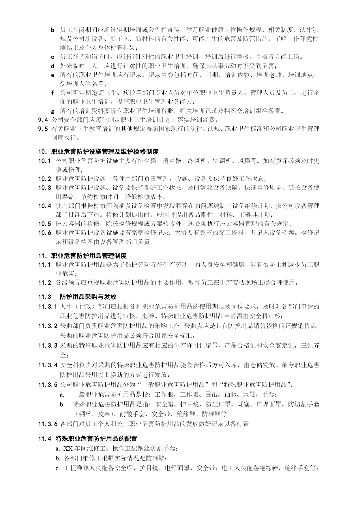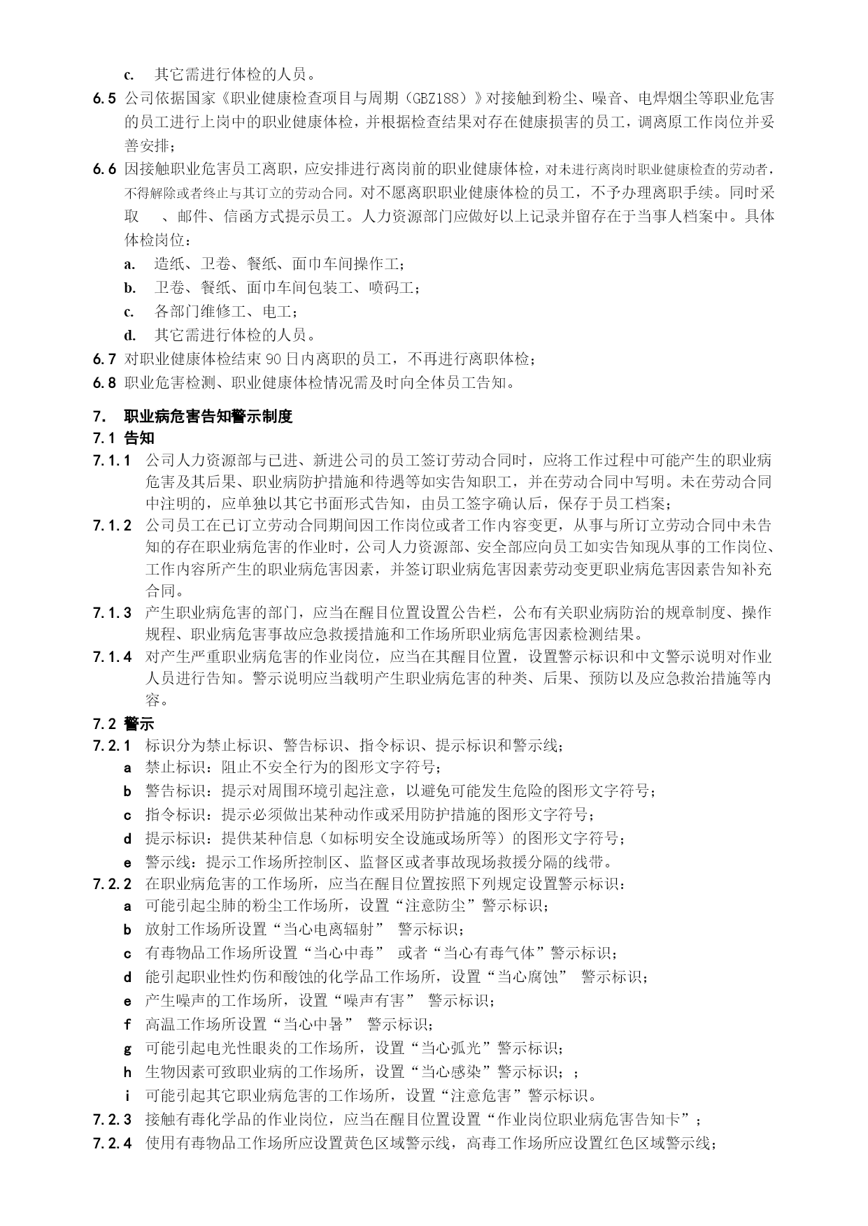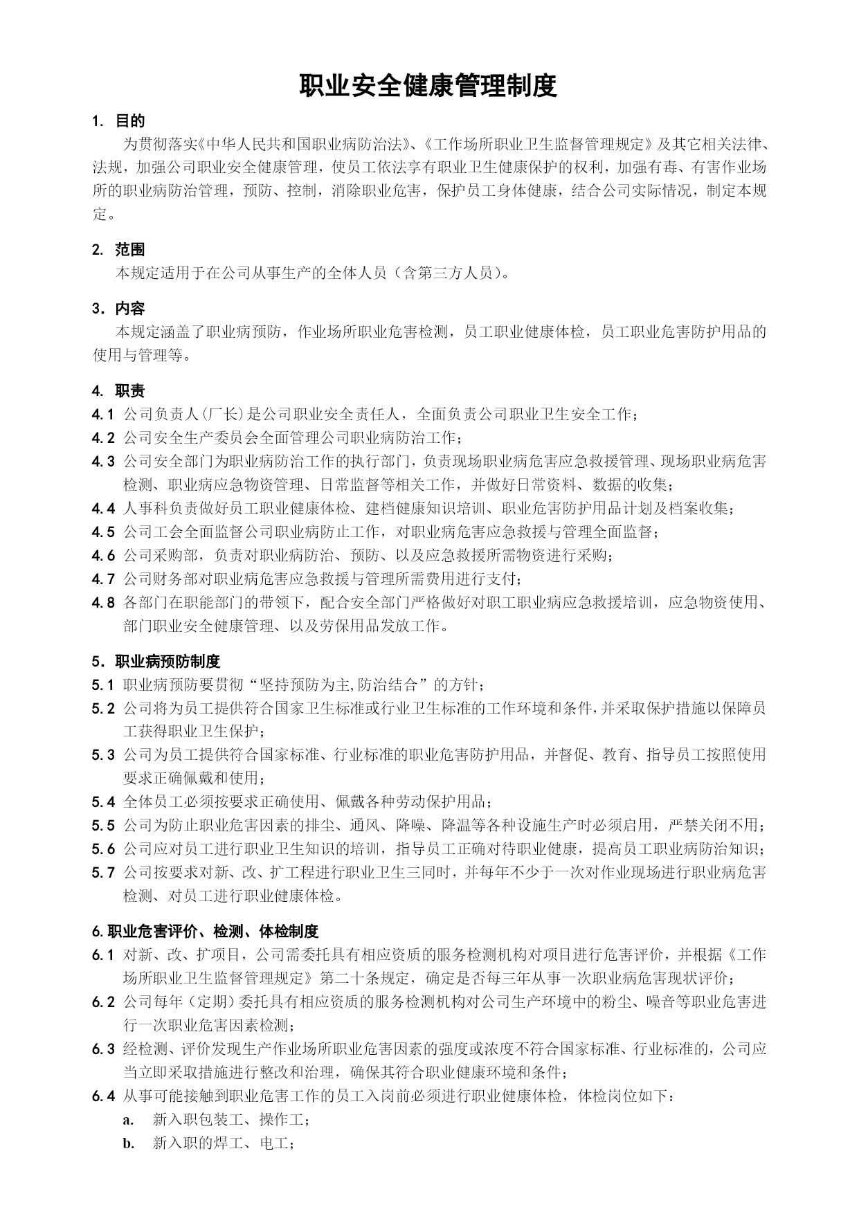 职业安全健康管理规定优质资料(可以直接使用,可编辑优质资料,欢迎下载)职业安全健康管理制度1.目的为贯彻落实《中华人民共和国职业病防治法》、《工作场所职业卫生监督管理规定》及其它相关法律、法规,加强公司职业安全健康管理,使员工依法享有职业卫生健康保护的权利,加强有毒、有害作业场所的职业病防治管理,预防、控制,消除职业危害,保护员工身体健康,结合公司实际情况,制定本规定。2.范围本规定适用于在公司从事生产的全体人员(含第三方人员)。3.内容本规定涵盖了职业病预防,作业场所职业危害检测,员工职业健康体检,员工职业危害防护用品的使用与管理等。4.职责公司负责人(厂长)是公司职业安全责任人,全面负责公司职业卫生安全工作;公司安全生产委员会全面管理公司职业病防治工作;公司安全部门为职业病防治工作的执行部门,负责现场职业病危害应急救援管理、现场职业病危害检测、职业病应急物资管理、日常监督等相关工作,并做好日常资料、数据的收集;人事科负责做好员工职业健康体检、建档健康知识培训、职业危害防护用品计划及档案收集;公司工会全面监督公司职业病防止工作,对职业病危害应急救援与管理全面监督;公司采购部,负责对职业病防治、预防、以及应急救援所需物资进行采购;公司财务部对职业病危害应急救援与管理所需费用进行支付;各部门在职能部门的带领下,配合安全部门严格做好对职工职业病应急救援培训,应急物资使用、部门职业安全健康管理、以及劳保用品发放工作。5.职业病预防制度职业病预防要贯彻“坚持预防为主,防治结合”的方针;公司将为员工提供符合国家卫生标准或行业卫生标准的工作环境和条件,并采取保护措施以保障员工获得职业卫生保护;公司为员工提供符合国家标准、行业标准的职业危害防护用品,并督促、教育、指导员工按照使用要求正确佩戴和使用;全体员工必须按要求正确使用、佩戴各种劳动保护用品;公司为防止职业危害因素的排尘、通风、降噪、降温等各种设施生产时必须启用,严禁关闭不用;公司应对员工进行职业卫生知识的培训,指导员工正确对待职业健康,提高员工职业病防治知识;公司按要求对新、改、扩工程进行职业卫生三同时,并每年不少于一次对作业现场进行职业病危害检测、对员工进行职业健康体检。6.职业危害评价、检测、体检制度对新、改、扩项目,公司需委托具有相应资质的服务检测机构对项目进行危害评价,并根据《工作场所职业卫生监督管理规定》第二十条规定,确定是否每三年从事一次职业病危害现状评价;公司每年(定期)委托具有相应资质的服务检测机构对公司生产环境中的粉尘、噪音等职业危害进行一次职业危害因素检测;经检测、评价发现生产作业场所职业危害因素的强度或浓度不符合国家标准、行业标准的,公司应当立即采取措施进行整改和治理,确保其符合职业健康环境和条件;从事可能接触到职业危害工作的员工入岗前必须进行职业健康体检,体检岗位如下:新入职包装工、操作工;新入职的焊工、电工;其它需进行体检的人员。公司依据国家《职业健康检查项目与周期(GBZ188)》对接触到粉尘、噪音、电焊烟尘等职业危害的员工进行上岗中的职业健康体检,并根据检查结果对存在健康损害的员工,调离原工作岗位并妥善安排;因接触职业危害员工离职,应安排进行离岗前的职业健康体检,对未进行离岗时职业健康检查的劳动者,不得解除或者终止与其订立的劳动合同。对不愿离职职业健康体检的员工,不予办理离职手续。同时采取、邮件、信函方式提示员工。人力资源部门应做好以上记录并留存在于当事人档案中。具体体检岗位:造纸、卫卷、餐纸、面巾车间操作工;卫卷、餐纸、面巾车间包装工、喷码工;各部门维修工、电工;其它需进行体检的人员。对职业健康体检结束90日内离职的员工,不再进行离职体检;职业危害检测、职业健康体检情况需及时向全体员工告知。职业病危害告知警示制度告知公司人力资源部与已进、新进公司的员工签订劳动合同时,应将工作过程中可能产生的职业病危害及其后果、职业病防护措施和待遇等如实告知职工,并在劳动合同中写明。未在劳动合同中注明的,应单独以其它书面形式告知,由员工签字确认后,保存于员工档案;公司员工在已订立劳动合同期间因工作岗位或者工作内容变更,从事与所订立劳动合同中未告知的存在职业病危害的作业时,公司人力资源部、安全部应向员工如实告知现从事的工作岗位、工作内容所产生的职业病危害因素,并签订职业病危害因素劳动变更职业病危害因素告知补充合同。产生职业病危害的部门,应当在醒目位置设置公告栏,公布有关职业病防治的规章制度、操作规程、职业病危害事故应急救援措施和工作场所职业病危害因素检测结果。对产生严重职业病危害的作业岗位,应当在其醒目位置,设置警示标识和中文警示说明对作业人员进行告知。警示说明应当载明产生职业病