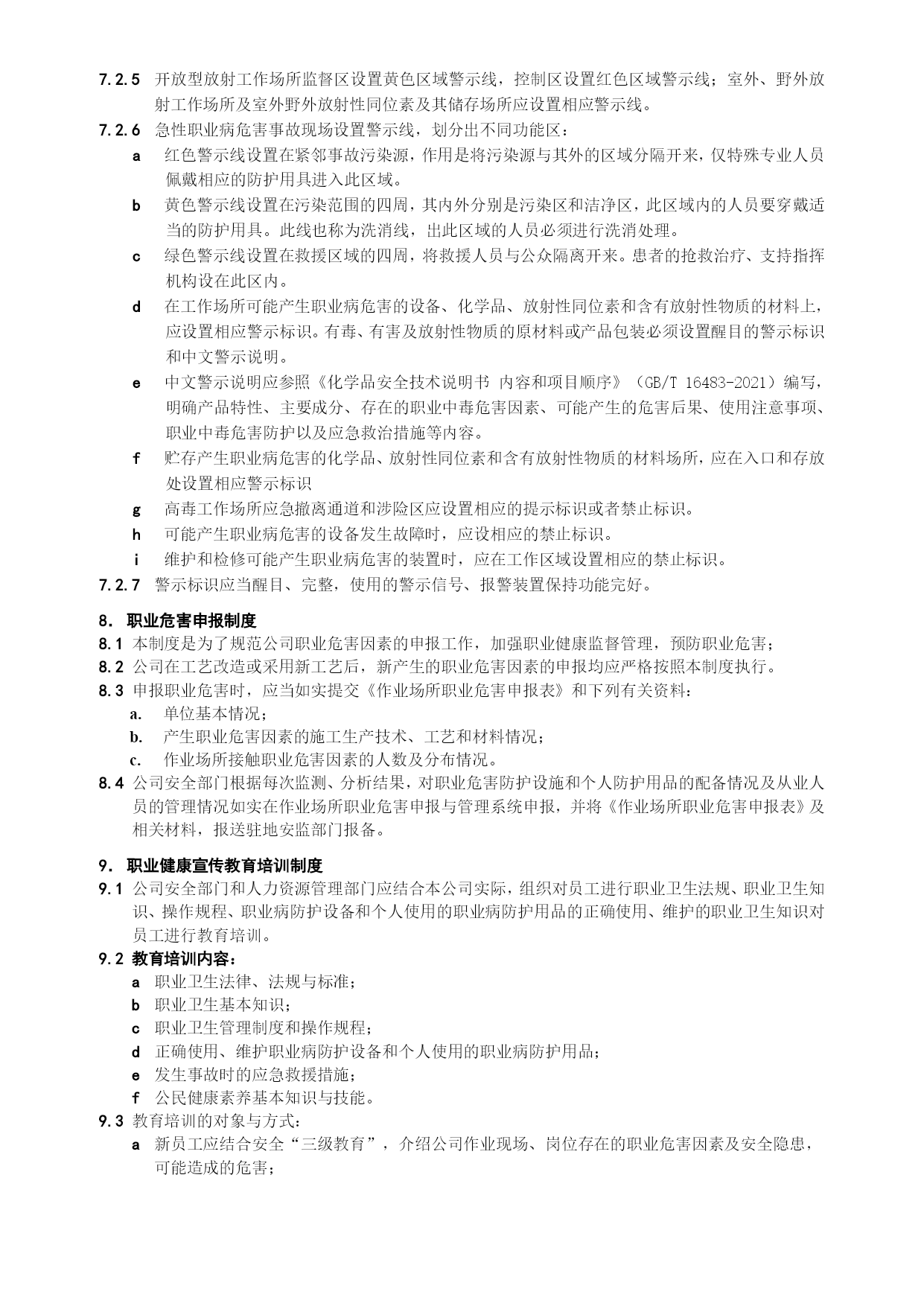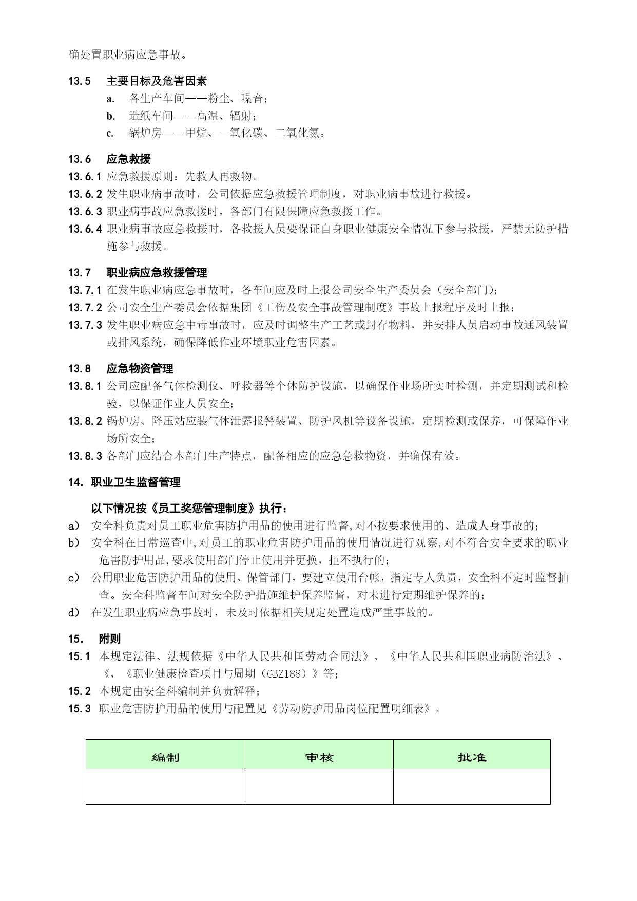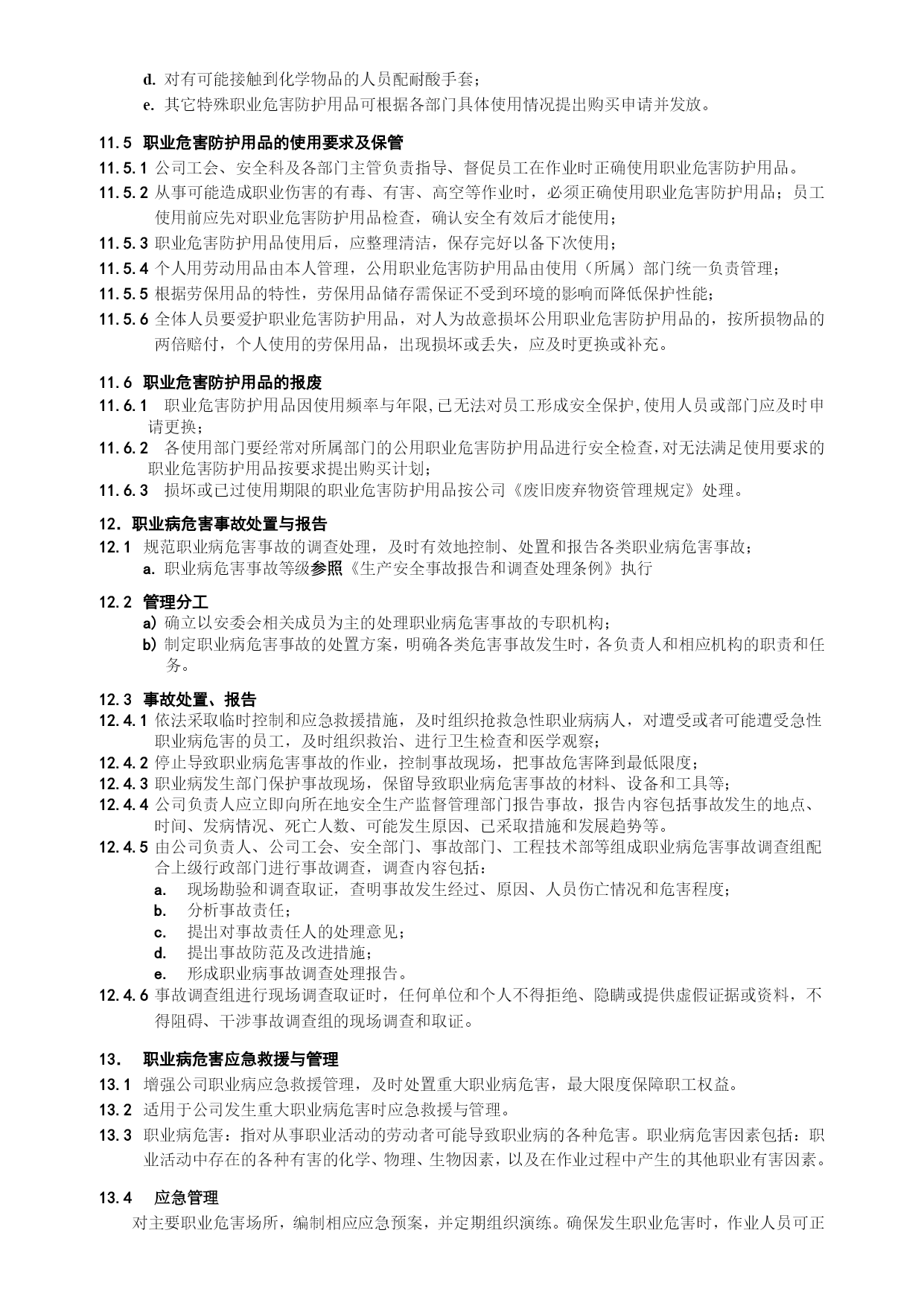 职业安全健康管理规定优质资料(可以直接使用,可编辑优质资料,欢迎下载)职业安全健康管理制度1.目的为贯彻落实《中华人民共和国职业病防治法》、《工作场所职业卫生监督管理规定》及其它相关法律、法规,加强公司职业安全健康管理,使员工依法享有职业卫生健康保护的权利,加强有毒、有害作业场所的职业病防治管理,预防、控制,消除职业危害,保护员工身体健康,结合公司实际情况,制定本规定。2.范围本规定适用于在公司从事生产的全体人员(含第三方人员)。3.内容本规定涵盖了职业病预防,作业场所职业危害检测,员工职业健康体检,员工职业危害防护用品的使用与管理等。4.职责公司负责人(厂长)是公司职业安全责任人,全面负责公司职业卫生安全工作;公司安全生产委员会全面管理公司职业病防治工作;公司安全部门为职业病防治工作的执行部门,负责现场职业病危害应急救援管理、现场职业病危害检测、职业病应急物资管理、日常监督等相关工作,并做好日常资料、数据的收集;人事科负责做好员工职业健康体检、建档健康知识培训、职业危害防护用品计划及档案收集;公司工会全面监督公司职业病防止工作,对职业病危害应急救援与管理全面监督;公司采购部,负责对职业病防治、预防、以及应急救援所需物资进行采购;公司财务部对职业病危害应急救援与管理所需费用进行支付;各部门在职能部门的带领下,配合安全部门严格做好对职工职业病应急救援培训,应急物资使用、部门职业安全健康管理、以及劳保用品发放工作。5.职业病预防制度职业病预防要贯彻“坚持预防为主,防治结合”的方针;公司将为员工提供符合国家卫生标准或行业卫生标准的工作环境和条件,并采取保护措施以保障员工获得职业卫生保护;公司为员工提供符合国家标准、行业标准的职业危害防护用品,并督促、教育、指导员工按照使用要求正确佩戴和使用;全体员工必须按要求正确使用、佩戴各种劳动保护用品;公司为防止职业危害因素的排尘、通风、降噪、降温等各种设施生产时必须启用,严禁关闭不用;公司应对员工进行职业卫生知识的培训,指导员工正确对待职业健康,提高员工职业病防治知识;公司按要求对新、改、扩工程进行职业卫生三同时,并每年不少于一次对作业现场进行职业病危害检测、对员工进行职业健康体检。6.职业危害评价、检测、体检制度对新、改、扩项目,公司需委托具有相应资质的服务检测机构对项目进行危害评价,并根据《工作场所职业卫生监督管理规定》第二十条规定,确定是否每三年从事一次职业病危害现状评价;公司每年(定期)委托具有相应资质的服务检测机构对公司生产环境中的粉尘、噪音等职业危害进行一次职业危害因素检测;经检测、评价发现生产作业场所职业危害因素的强度或浓度不符合国家标准、行业标准的,公司应当立即采取措施进行整改和治理,确保其符合职业健康环境和条件;从事可能接触到职业危害工作的员工入岗前必须进行职业健康体检,体检岗位如下:新入职包装工、操作工;新入职的焊工、电工;其它需进行体检的人员。公司依据国家《职业健康检查项目与周期(GBZ188)》对接触到粉尘、噪音、电焊烟尘等职业危害的员工进行上岗中的职业健康体检,并根据检查结果对存在健康损害的员工,调离原工作岗位并妥善安排;因接触职业危害员工离职,应安排进行离岗前的职业健康体检,对未进行离岗时职业健康检查的劳动者,不得解除或者终止与其订立的劳动合同。对不愿离职职业健康体检的员工,不予办理离职手续。同时采取、邮件、信函方式提示员工。人力资源部门应做好以上记录并留存在于当事人档案中。具体体检岗位:造纸、卫卷、餐纸、面巾车间操作工;卫卷、餐纸、面巾车间包装工、喷码工;各部门维修工、电工;其它需进行体检的人员。对职业健康体检结束90日内离职的员工,不再进行离职体检;职业危害检测、职业健康体检情况需及时向全体员工告知。职业病危害告知警示制度告知公司人力资源部与已进、新进公司的员工签订劳动合同时,应将工作过程中可能产生的职业病危害及其后果、职业病防护措施和待遇等如实告知职工,并在劳动合同中写明。未在劳动合同中注明的,应单独以其它书面形式告知,由员工签字确认后,保存于员工档案;公司员工在已订立劳动合同期间因工作岗位或者工作内容变更,从事与所订立劳动合同中未告知的存在职业病危害的作业时,公司人力资源部、安全部应向员工如实告知现从事的工作岗位、工作内容所产生的职业病危害因素,并签订职业病危害因素劳动变更职业病危害因素告知补充合同。产生职业病危害的部门,应当在醒目位置设置公告栏,公布有关职业病防治的规章制度、操作规程、职业病危害事故应急救援措施和工作场所职业病危害因素检测结果。对产生严重职业病危害的作业岗位,应当在其醒目位置,设置警示标识和中文警示说明对作业人员进行告知。警示说明应当载明产生职业病
