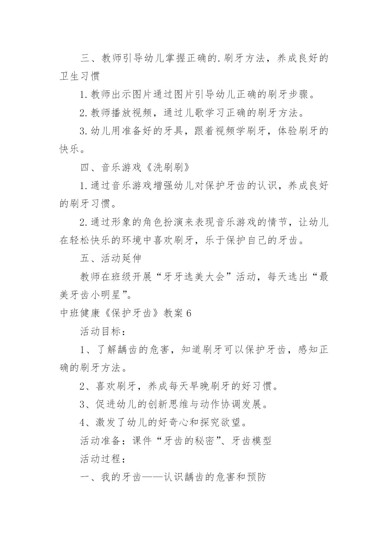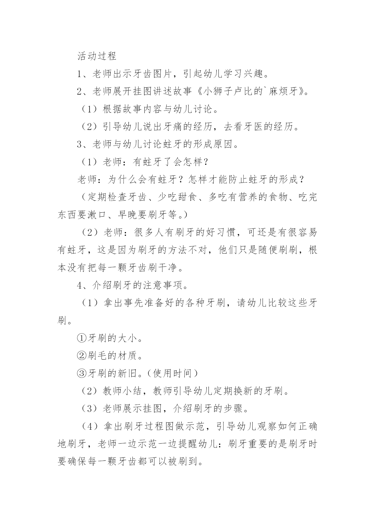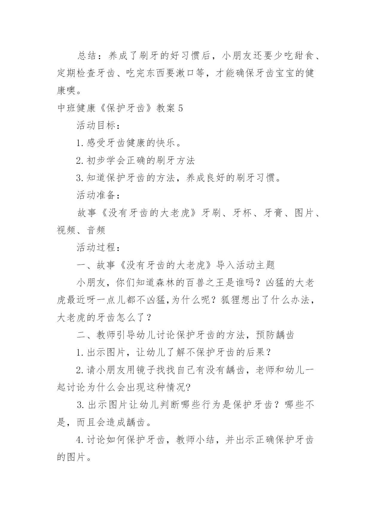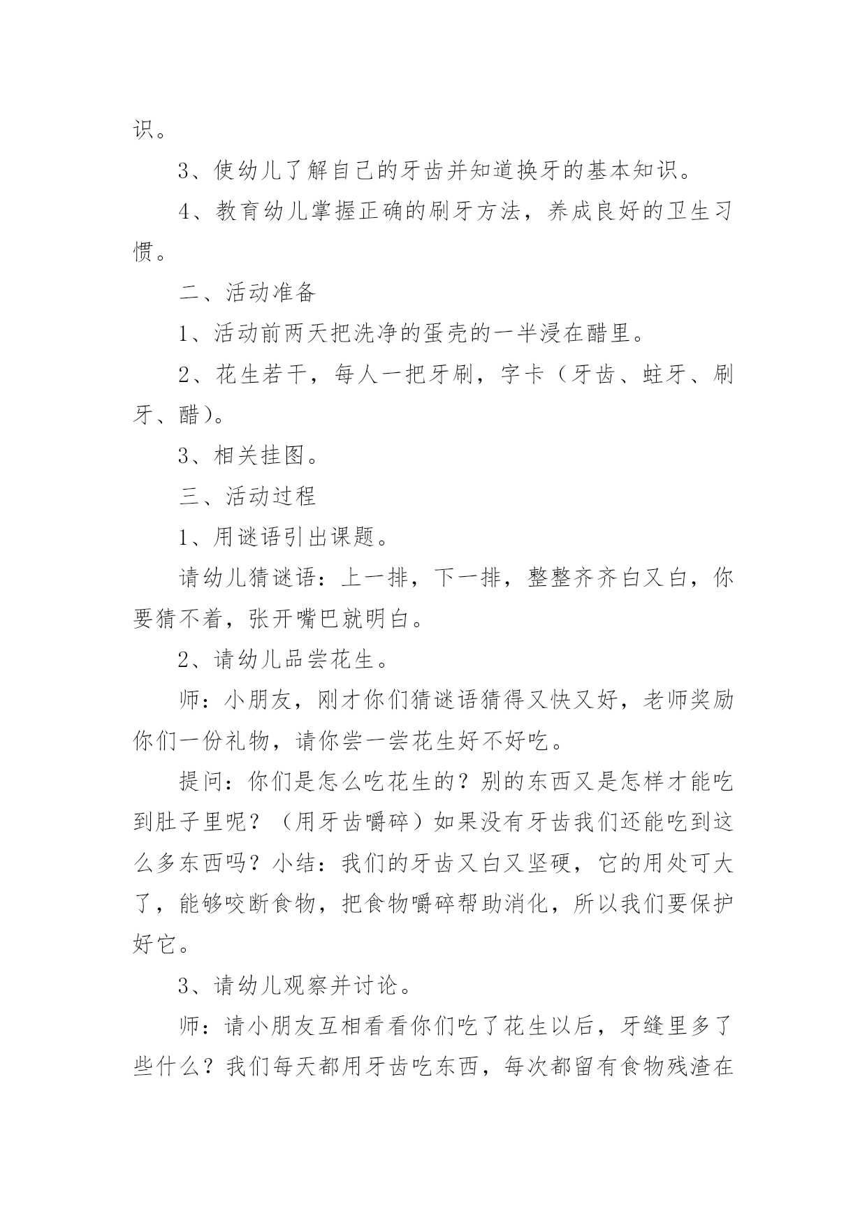中班健康《保护牙齿》教案[集合]中班健康《保护牙齿》教案15篇作为一名教学工作者,编写教案是必不可少的,教案是教学蓝图,可以有效提高教学效率。那么你有了解过教案吗?以下是小编收集整理的中班健康《保护牙齿》教案,仅供参考,大家一起来看看吧。中班健康《保护牙齿》教案1设计思路:幼儿的健康成长是家长和老师共同关注的话题。本节活动旨在让幼儿了解一些疾病的预防知识,会进行自我保护。现在的孩子甜食吃得太多,牙齿早早的就坏掉了,我想通过这节活动,让幼儿知道刷牙的好处,掌握正确的刷牙方法,养成保护牙齿的良好习惯,并能坚持早晚刷牙。活动目标:1.使幼儿初步了解龋齿形成的原因及龋齿的危害和预防龋齿的相关知识。2.教育幼儿牙齿是人体的一个重要器官,知道保护它。3.知道坚持早晚刷牙,吃完东西漱口,养成早晚刷牙的良好卫生习惯。活动准备:小牙刷、茶杯、小镜子、牙齿模型、《幼儿每日刷牙情况记录表》重点:引导幼儿掌握正确的刷牙方法,知道怎样保护牙齿。难点:了解龋齿形成的原因及龋齿的危害和预防龋齿的相关知识。活动过程:一、导入:(1)猜谜,引出课题(健康卫士穿白衣,上下两排真整齐,口中饭菜它磨碎,早晚用刷把澡洗。)(2)讲故事引出主题小朋友们都知道森林里最凶的动物是老虎吧,可是现在小朋友们都不怕它了,到底怎么回事呢?老师给大家讲一个故事《没有牙齿的老虎》小朋友肯定会奇怪,那老虎的牙齿怎么了呀?二、过程:1.听完故事后了解引起龋齿的'原因(1)爱吃甜食;(2)吃完东西不刷牙就去睡觉2.引导幼儿谈谈的龋齿的感受3.了解龋齿的危害老师告诉小朋友爱吃甜食,吃完东西就去睡觉,不爱刷牙的孩子,细菌就会在他的牙齿里住下来,把牙齿弄黑、弄坏,弄成小洞。这样就不能很好的咀嚼食物,而且还很疼,影响我们睡觉吃饭,说话也不清楚,牙齿也不好看了。4.教育幼儿如何保护牙齿(1)我们应该怎样保护我们的牙齿呢?(请幼儿自由发表意见)(2)拿出牙刷和牙齿模型教幼儿正确的刷牙的方式并教儿歌(3)告诉幼儿怎样预防龋齿牙齿对我们很重要,我们要保护牙齿。每天早上和睡觉前要刷牙,刷牙方法正确,吃完东西后要漱口,保护牙齿的清洁,还要少吃甜食,这样才能赶走龋齿。三、延伸活动为幼儿发放《幼儿每日刷牙情况记录表》,记录每天的刷牙情况,以督促幼儿养成早晚刷牙的好习惯。中班健康《保护牙齿》教案2一、活动目标1、感知关于牙齿的小常识,萌发探索牙齿秘密的兴趣。2、了解正确的刷牙及保护牙齿的方法。二、活动准备1、牙齿模具两副2、大头儿子和小头爸爸的掌偶各一个3、录音机和磁带“刷牙歌”三、活动过程1、感知牙齿师:这里有两副牙齿,看看有什么不一样?小结:人一生中共有两副牙齿。第一次长出的牙叫乳牙,第二次长出的牙叫恒牙。乳牙长齐共有20颗,恒牙长齐最多有32颗,也有长28颗。2、保护牙齿(1)欣赏故事,感知故事内容。(2)提问:a、大头哥哥为什么这么难受?(牙齿疼)b、大头哥哥为什么会牙齿疼?(吃很多糖,还不刷牙。)c、怎样让大头哥哥的牙齿不疼呢?(天天早晚刷牙,睡前不吃甜食等)3、了解正确的刷牙方法并练习。4、设疑还有哪些保护牙齿的.方法?四、活动生成及建议1、与生活领域相结合在个别化学习活动中提供牙齿的模型让幼儿练习正确的刷牙方法。2、与探索领域相结合将鸡蛋放入醋中浸没,观察醋腐蚀蛋壳使蛋壳变软的现象,引导幼儿了解龋齿蛀牙形成的原因。进一步了解保护牙齿的重要性。3、教师和家长联系,达成家园同步,让幼儿养成早晚刷牙的好习惯。中班健康《保护牙齿》教案3一、活动目标1、让幼儿知道牙齿的重要作用。2、使幼儿了解龋齿的形成原因以及预防龋齿的有关知识。3、使幼儿了解自己的牙齿并知道换牙的基本知识。4、教育幼儿掌握正确的刷牙方法,养成良好的卫生习惯。二、活动准备1、活动前两天把洗净的蛋壳的一半浸在醋里。2、花生若干,每人一把牙刷,字卡(牙齿、蛀牙、刷牙、醋)。3、相关挂图。三、活动过程1、用谜语引出课题。请幼儿猜谜语:上一排,下一排,整整齐齐白又白,你要猜不着,张开嘴巴就明白。2、请幼儿品尝花生。师:小朋友,刚才你们猜谜语猜得又快又好,老师奖励你们一份礼物,请你尝一尝花生好不好吃。提问:你们是怎么吃花生的?别的东西又是怎样才能吃到肚子里呢?(用牙齿嚼碎)如果没有牙齿我们还能吃到这么多东西吗?小结:我们的牙齿又白又坚硬,它的用处可大了,能够咬断食物,把食物嚼碎帮助消化,所以我们要保护好它。3、请幼儿观察并讨论。师:请小朋友互相看看你们吃了花生以后,牙缝里多了些什么?我们每天都用牙齿吃东西,每次都留有食物残渣在牙缝里,时间长了牙齿会怎么样呢?4、利用小实验让幼儿认识龋齿形成的原因。(1)引导幼儿观察,比较在醋里浸过和没在醋里浸过的蛋壳有什么不同?分别用牙刷柄轻轻敲一敲,感觉怎么样?(2)讨论:为什么在醋里浸过的蛋壳会变黑变软了?(醋是酸