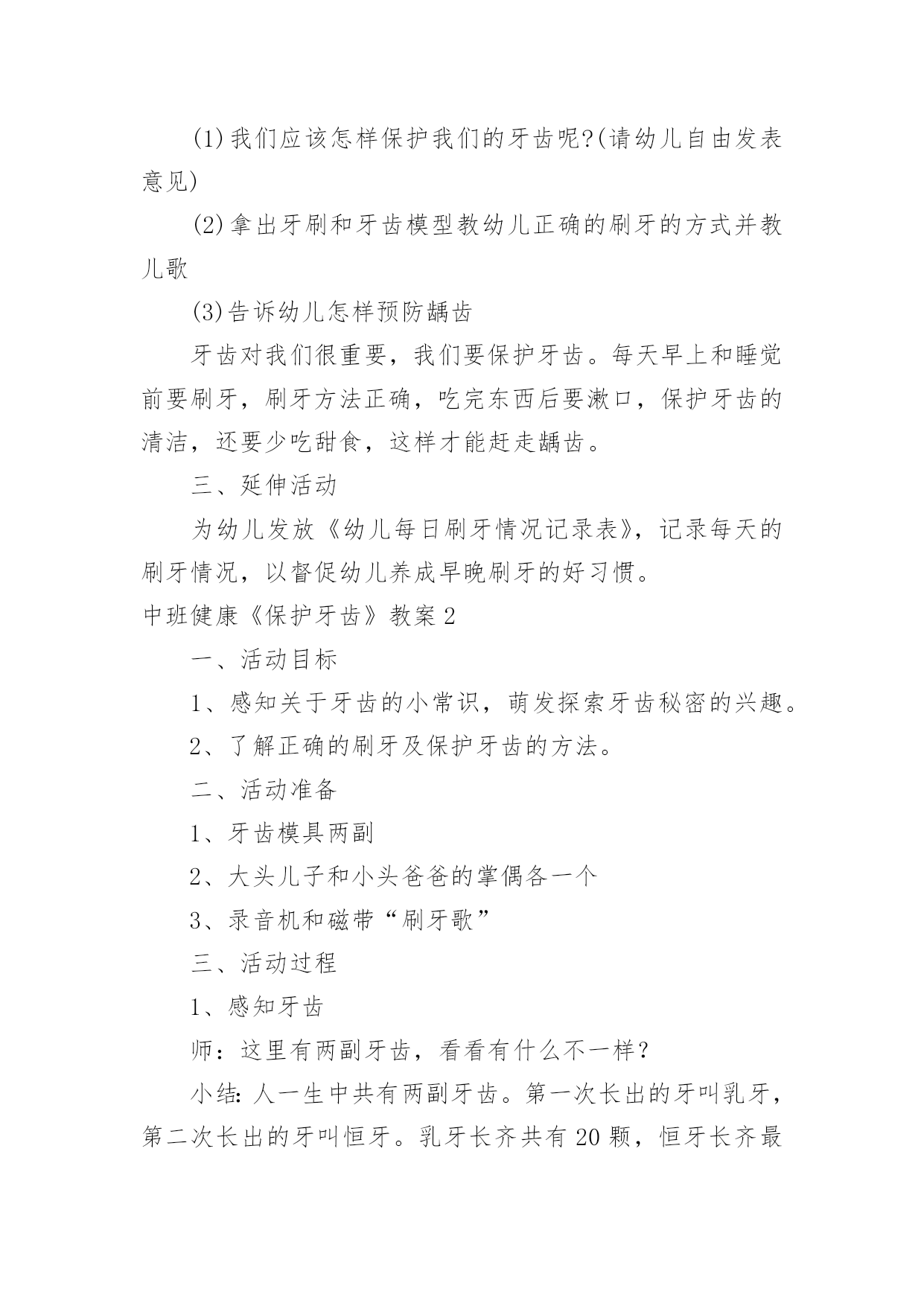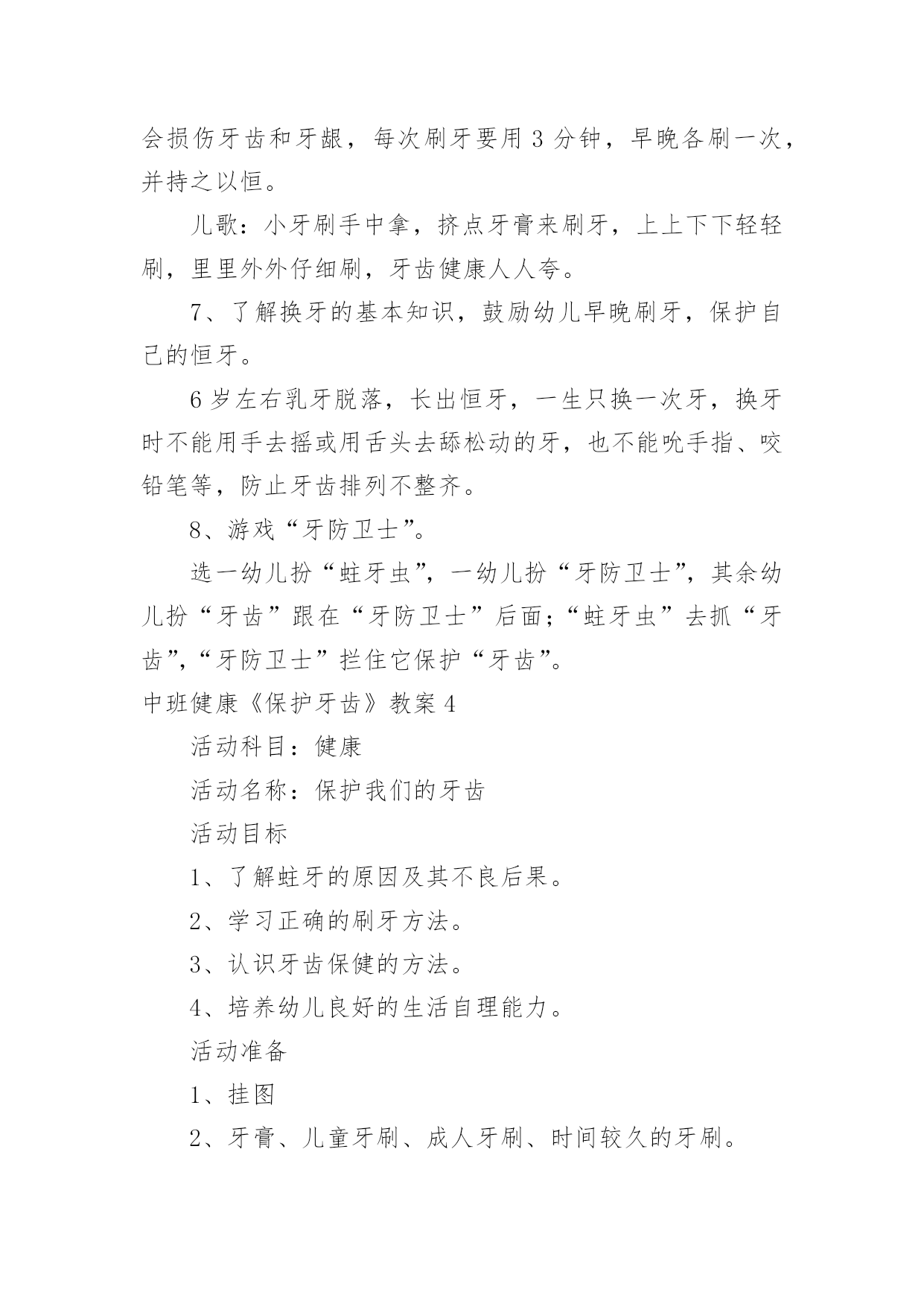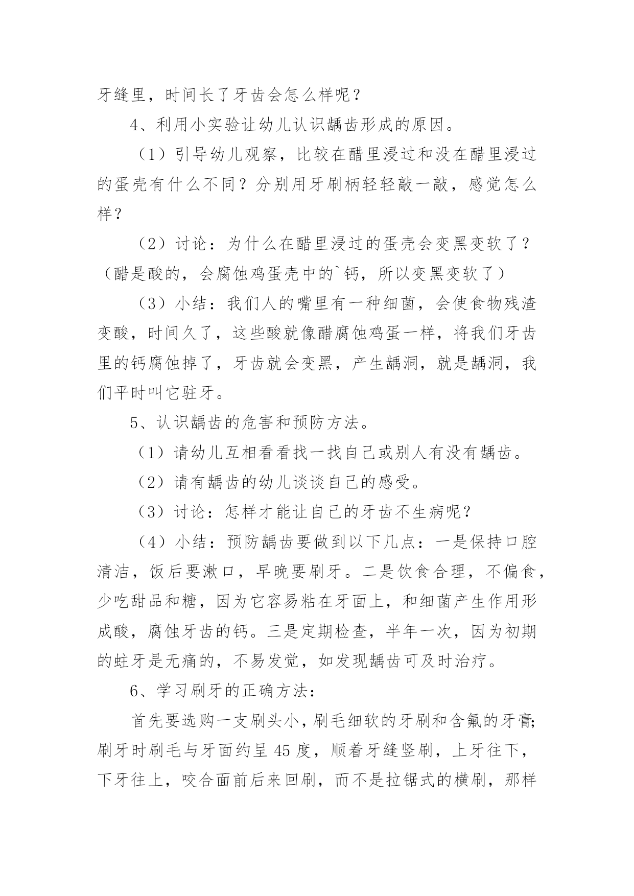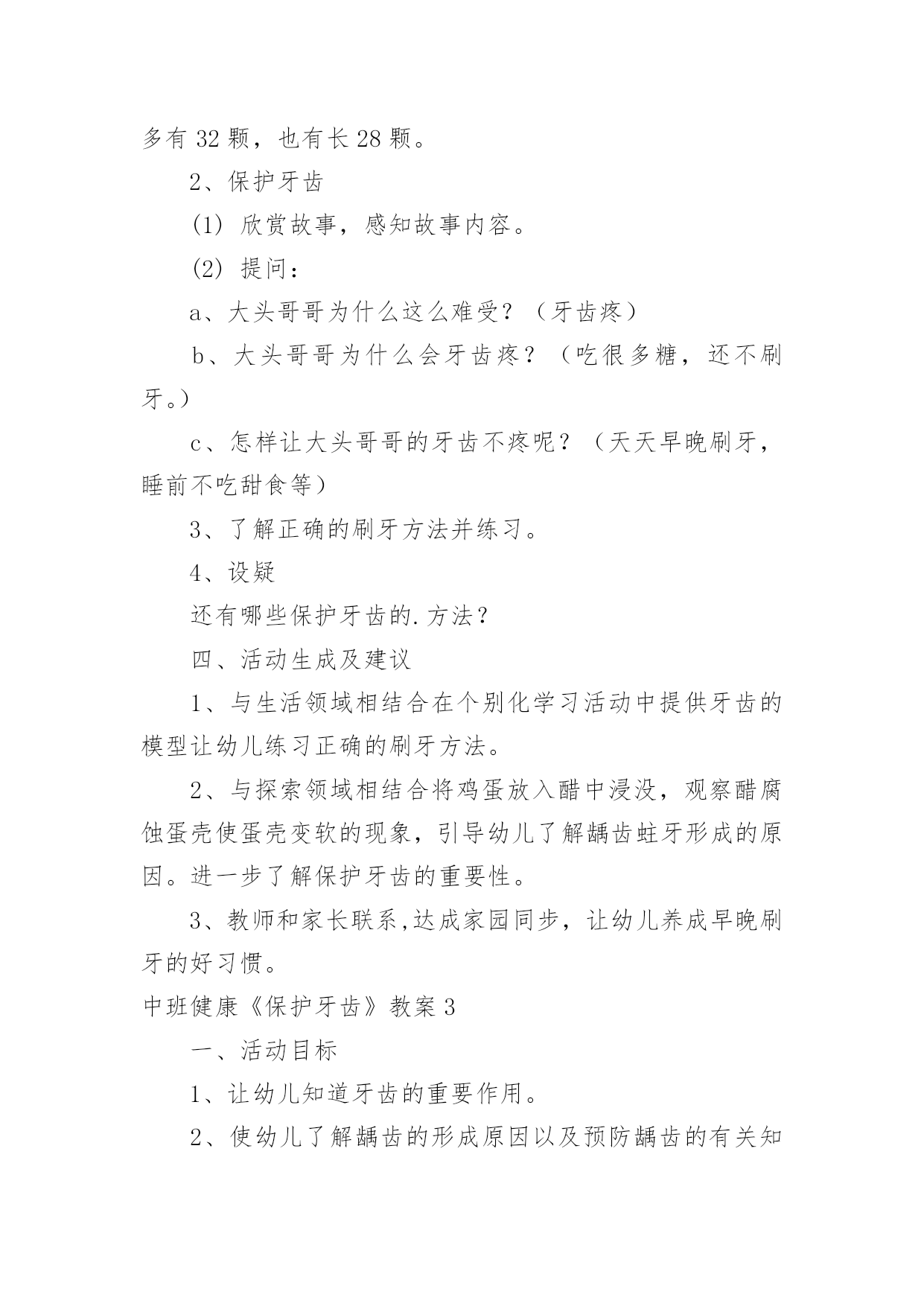 中班健康《保护牙齿》教案[集合]中班健康《保护牙齿》教案15篇作为一名教学工作者,编写教案是必不可少的,教案是教学蓝图,可以有效提高教学效率。那么你有了解过教案吗?以下是小编收集整理的中班健康《保护牙齿》教案,仅供参考,大家一起来看看吧。中班健康《保护牙齿》教案1设计思路:幼儿的健康成长是家长和老师共同关注的话题。本节活动旨在让幼儿了解一些疾病的预防知识,会进行自我保护。现在的孩子甜食吃得太多,牙齿早早的就坏掉了,我想通过这节活动,让幼儿知道刷牙的好处,掌握正确的刷牙方法,养成保护牙齿的良好习惯,并能坚持早晚刷牙。活动目标:1.使幼儿初步了解龋齿形成的原因及龋齿的危害和预防龋齿的相关知识。2.教育幼儿牙齿是人体的一个重要器官,知道保护它。3.知道坚持早晚刷牙,吃完东西漱口,养成早晚刷牙的良好卫生习惯。活动准备:小牙刷、茶杯、小镜子、牙齿模型、《幼儿每日刷牙情况记录表》重点:引导幼儿掌握正确的刷牙方法,知道怎样保护牙齿。难点:了解龋齿形成的原因及龋齿的危害和预防龋齿的相关知识。活动过程:一、导入:(1)猜谜,引出课题(健康卫士穿白衣,上下两排真整齐,口中饭菜它磨碎,早晚用刷把澡洗。)(2)讲故事引出主题小朋友们都知道森林里最凶的动物是老虎吧,可是现在小朋友们都不怕它了,到底怎么回事呢?老师给大家讲一个故事《没有牙齿的老虎》小朋友肯定会奇怪,那老虎的牙齿怎么了呀?二、过程:1.听完故事后了解引起龋齿的'原因(1)爱吃甜食;(2)吃完东西不刷牙就去睡觉2.引导幼儿谈谈的龋齿的感受3.了解龋齿的危害老师告诉小朋友爱吃甜食,吃完东西就去睡觉,不爱刷牙的孩子,细菌就会在他的牙齿里住下来,把牙齿弄黑、弄坏,弄成小洞。这样就不能很好的咀嚼食物,而且还很疼,影响我们睡觉吃饭,说话也不清楚,牙齿也不好看了。4.教育幼儿如何保护牙齿(1)我们应该怎样保护我们的牙齿呢?(请幼儿自由发表意见)(2)拿出牙刷和牙齿模型教幼儿正确的刷牙的方式并教儿歌(3)告诉幼儿怎样预防龋齿牙齿对我们很重要,我们要保护牙齿。每天早上和睡觉前要刷牙,刷牙方法正确,吃完东西后要漱口,保护牙齿的清洁,还要少吃甜食,这样才能赶走龋齿。三、延伸活动为幼儿发放《幼儿每日刷牙情况记录表》,记录每天的刷牙情况,以督促幼儿养成早晚刷牙的好习惯。中班健康《保护牙齿》教案2一、活动目标1、感知关于牙齿的小常识,萌发探索牙齿秘密的兴趣。2、了解正确的刷牙及保护牙齿的方法。二、活动准备1、牙齿模具两副2、大头儿子和小头爸爸的掌偶各一个3、录音机和磁带“刷牙歌”三、活动过程1、感知牙齿师:这里有两副牙齿,看看有什么不一样?小结:人一生中共有两副牙齿。第一次长出的牙叫乳牙,第二次长出的牙叫恒牙。乳牙长齐共有20颗,恒牙长齐最多有32颗,也有长28颗。2、保护牙齿(1)欣赏故事,感知故事内容。(2)提问:a、大头哥哥为什么这么难受?(牙齿疼)b、大头哥哥为什么会牙齿疼?(吃很多糖,还不刷牙。)c、怎样让大头哥哥的牙齿不疼呢?(天天早晚刷牙,睡前不吃甜食等)3、了解正确的刷牙方法并练习。4、设疑还有哪些保护牙齿的.方法?四、活动生成及建议1、与生活领域相结合在个别化学习活动中提供牙齿的模型让幼儿练习正确的刷牙方法。2、与探索领域相结合将鸡蛋放入醋中浸没,观察醋腐蚀蛋壳使蛋壳变软的现象,引导幼儿了解龋齿蛀牙形成的原因。进一步了解保护牙齿的重要性。3、教师和家长联系,达成家园同步,让幼儿养成早晚刷牙的好习惯。中班健康《保护牙齿》教案3一、活动目标1、让幼儿知道牙齿的重要作用。2、使幼儿了解龋齿的形成原因以及预防龋齿的有关知识。3、使幼儿了解自己的牙齿并知道换牙的基本知识。4、教育幼儿掌握正确的刷牙方法,养成良好的卫生习惯。二、活动准备1、活动前两天把洗净的蛋壳的一半浸在醋里。2、花生若干,每人一把牙刷,字卡(牙齿、蛀牙、刷牙、醋)。3、相关挂图。三、活动过程1、用谜语引出课题。请幼儿猜谜语:上一排,下一排,整整齐齐白又白,你要猜不着,张开嘴巴就明白。2、请幼儿品尝花生。师:小朋友,刚才你们猜谜语猜得又快又好,老师奖励你们一份礼物,请你尝一尝花生好不好吃。提问:你们是怎么吃花生的?别的东西又是怎样才能吃到肚子里呢?(用牙齿嚼碎)如果没有牙齿我们还能吃到这么多东西吗?小结:我们的牙齿又白又坚硬,它的用处可大了,能够咬断食物,把食物嚼碎帮助消化,所以我们要保护好它。3、请幼儿观察并讨论。师:请小朋友互相看看你们吃了花生以后,牙缝里多了些什么?我们每天都用牙齿吃东西,每次都留有食物残渣在牙缝里,时间长了牙齿会怎么样呢?4、利用小实验让幼儿认识龋齿形成的原因。(1)引导幼儿观察,比较在醋里浸过和没在醋里浸过的蛋壳有什么不同?分别用牙刷柄轻轻敲一敲,感觉怎么样?(2)讨论:为什么在醋里浸过的蛋壳会变黑变软了?(醋是酸