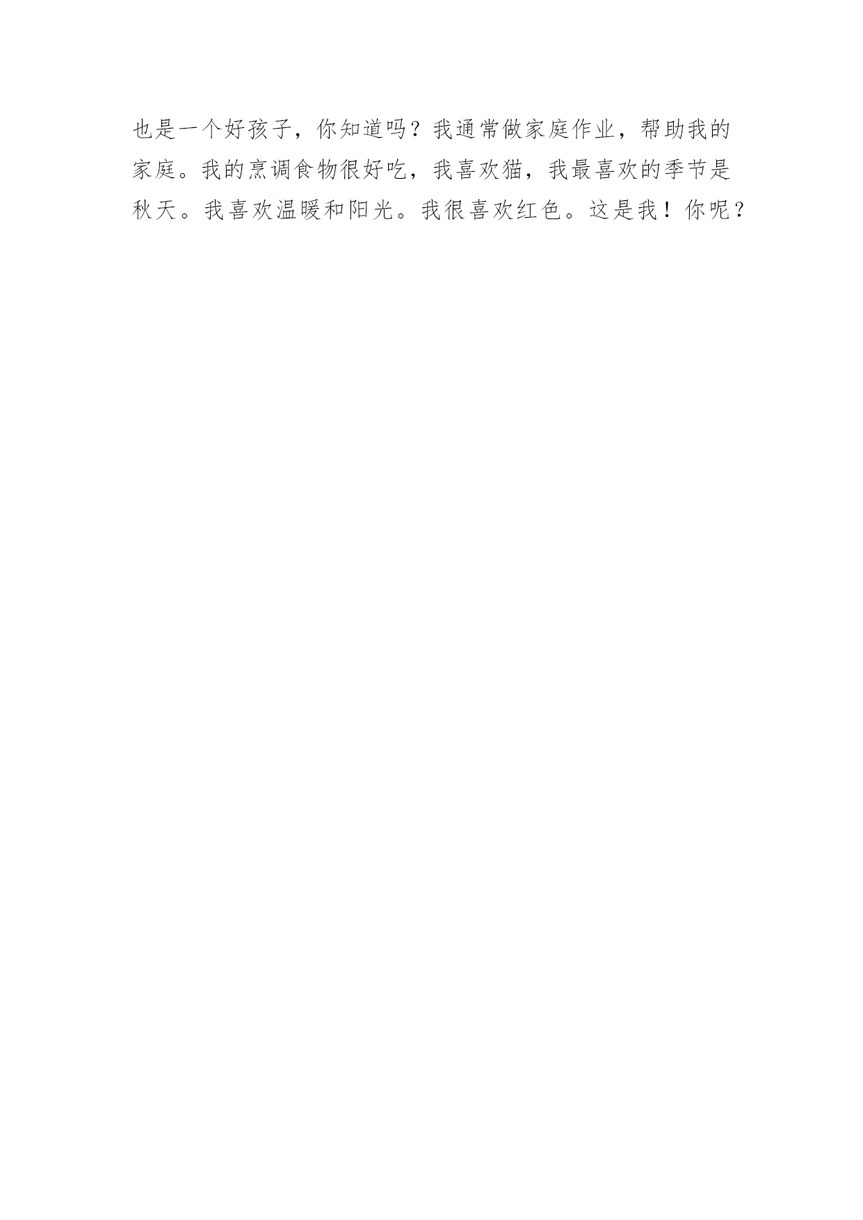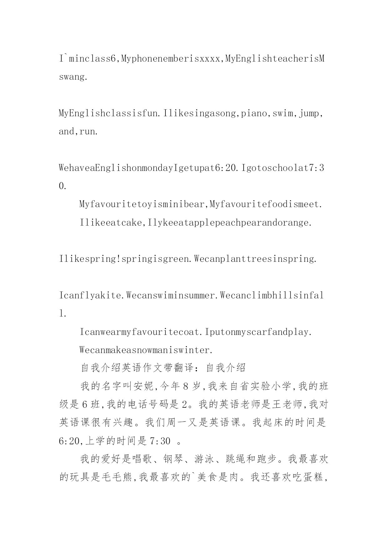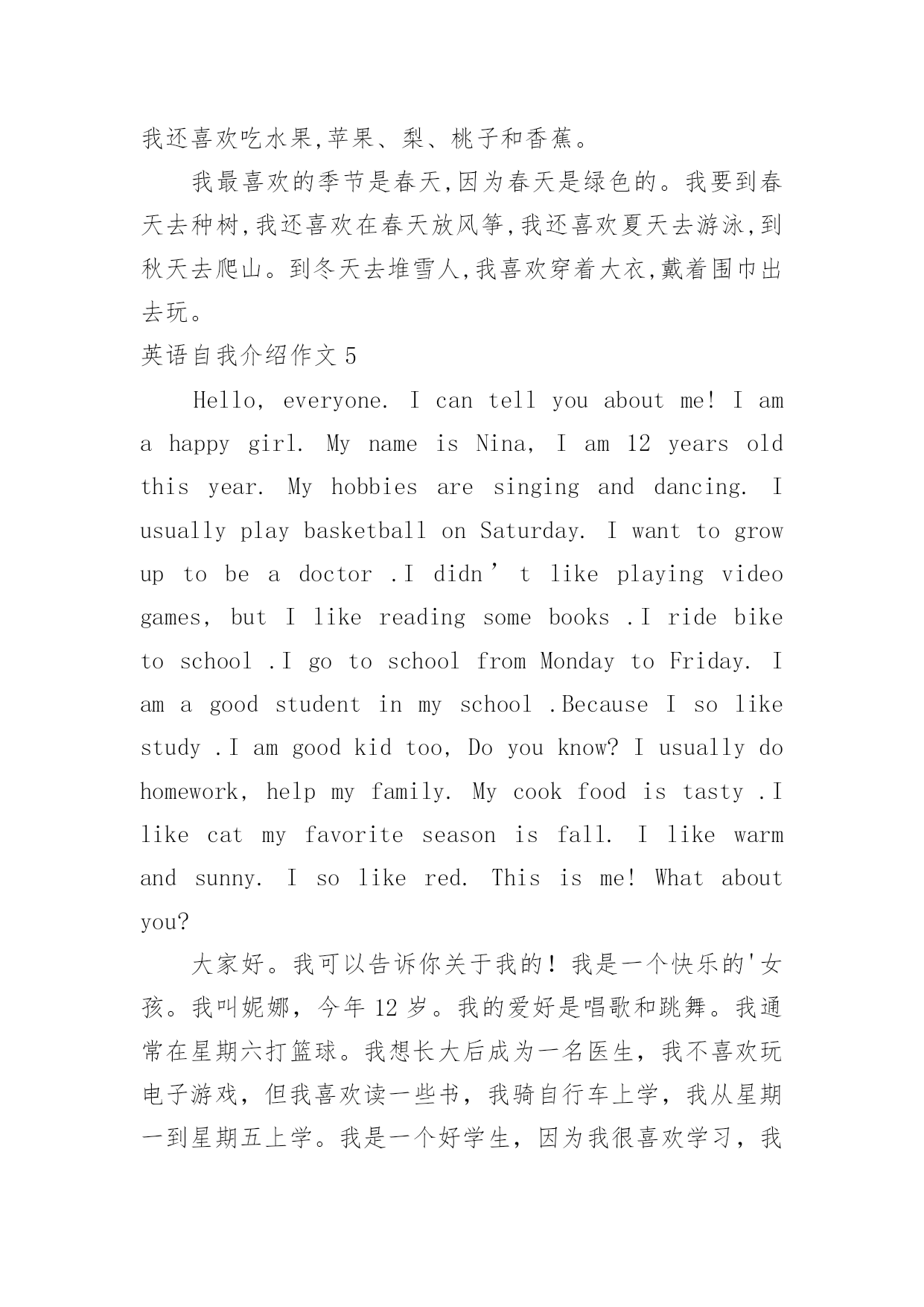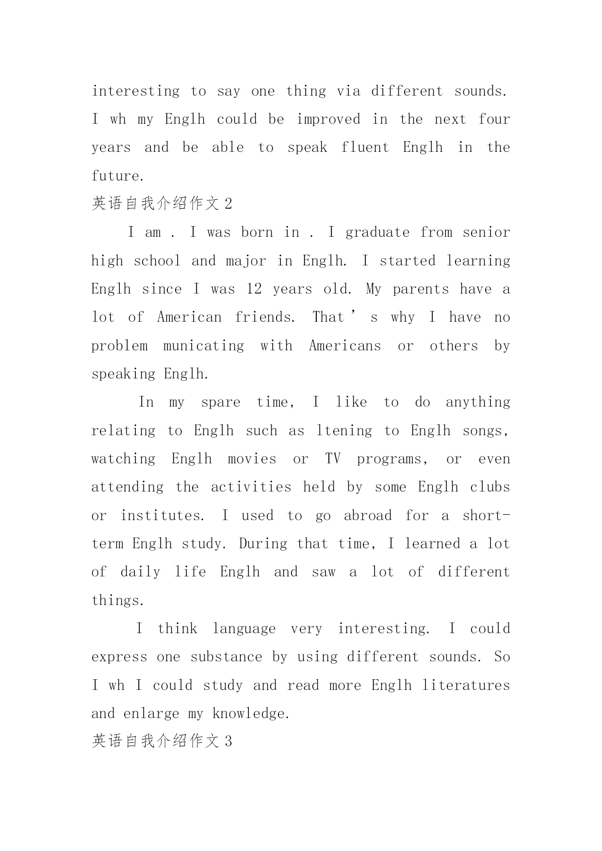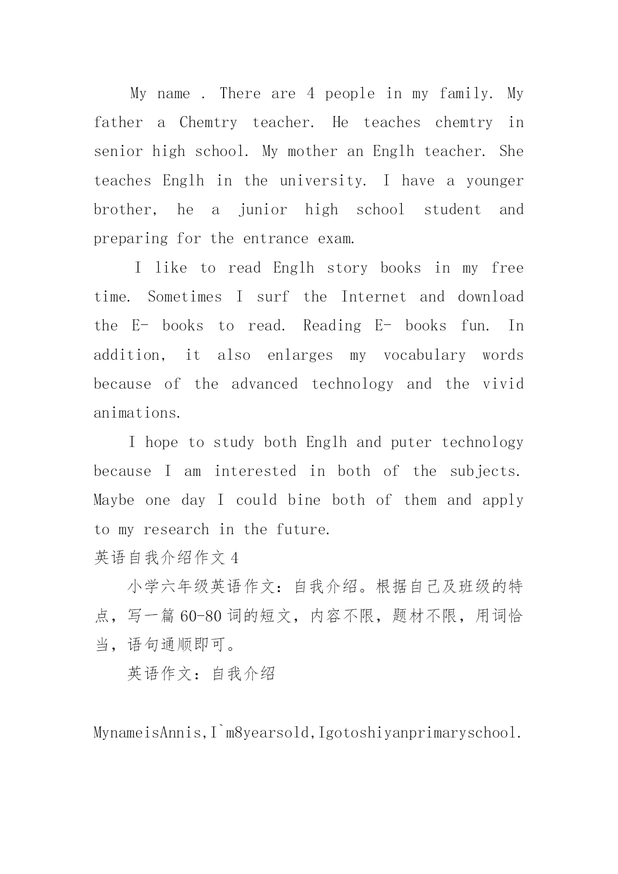 英语自我介绍作文英语自我介绍作文当我们在一个陌生场合中,我们就有可能用到自我介绍,用自我介绍往往可以让他人有一定的了解。那么我们该怎么去写自我介绍呢?下面是小编为大家收集的英语自我介绍作文,仅供参考,欢迎大家阅读。英语自我介绍作文1Mynamexxx.Iamgraduatefromxxseniorhighschoolandmajorinxxx.Therearexxpeopleinmyfamily.Myfatherworksinaputerpany.Andmymotherahousewife.Iamtheyoungestoneinmyfamily.Inmysparetime,Iliketoreadnovels.Ithinkreadingcouldenlargemyknowledge.Asfornovels,IcouldimaginewhateverIlikesuchasawell-knownscienttorakung-fumaster.Inadditiontoreading,IalsoliketoplayPCgames.AlotofgrownupsthinkplayingPCgameshindersthestudentsfromlearning.ButIthinkPCgamescouldmotivatemetolearnsomethingsuchasEnglhorJapanese.MyfavoritecourseEnglhbecauseIthinkitinterestingtosayonethingviadifferentsounds.IwhmyEnglhcouldbeimprovedinthenextfouryearsandbeabletospeakfluentEnglhinthefuture.英语自我介绍作文2Iam.Iwasbornin.IgraduatefromseniorhighschoolandmajorinEnglh.IstartedlearningEnglhsinceIwas12yearsold.MyparentshavealotofAmericanfriends.That’swhyIhavenoproblemmunicatingwithAmericansorothersbyspeakingEnglh.Inmysparetime,IliketodoanythingrelatingtoEnglhsuchaslteningtoEnglhsongs,watchingEnglhmoviesorTVprograms,orevenattendingtheactivitiesheldbysomeEnglhclubsorinstitutes.Iusedtogoabroadforashort-termEnglhstudy.Duringthattime,IlearnedalotofdailylifeEnglhandsawalotofdifferentthings.Ithinklanguageveryinteresting.Icouldexpressonesubstancebyusingdifferentsounds.SoIwhIcouldstudyandreadmoreEnglhliteraturesandenlargemyknowledge.英语自我介绍作文3Myname.Thereare4peopleinmyfamily.MyfatheraChemtryteacher.Heteacheschemtryinseniorhighschool.MymotheranEnglhteacher.SheteachesEnglhintheuniversity.Ihaveayoungerbrother,heajuniorhighschoolstudentandpreparingfortheentranceexam.IliketoreadEnglhstorybooksinmyfreetime.SometimesIsurftheInternetanddownloadtheE-bookstoread.ReadingE-booksfun.Inaddition,italsoenlargesmyvocabularywordsbecauseoftheadvancedtechnologyandthevividanimations.IhopetostudybothEnglhandputertechnologybecauseIaminterestedinbothofthesubjects.MaybeonedayIcouldbinebothofthemandapplytomyresearchinthefuture.英语自我介绍作文4小学六年级英语作文:自我介绍。