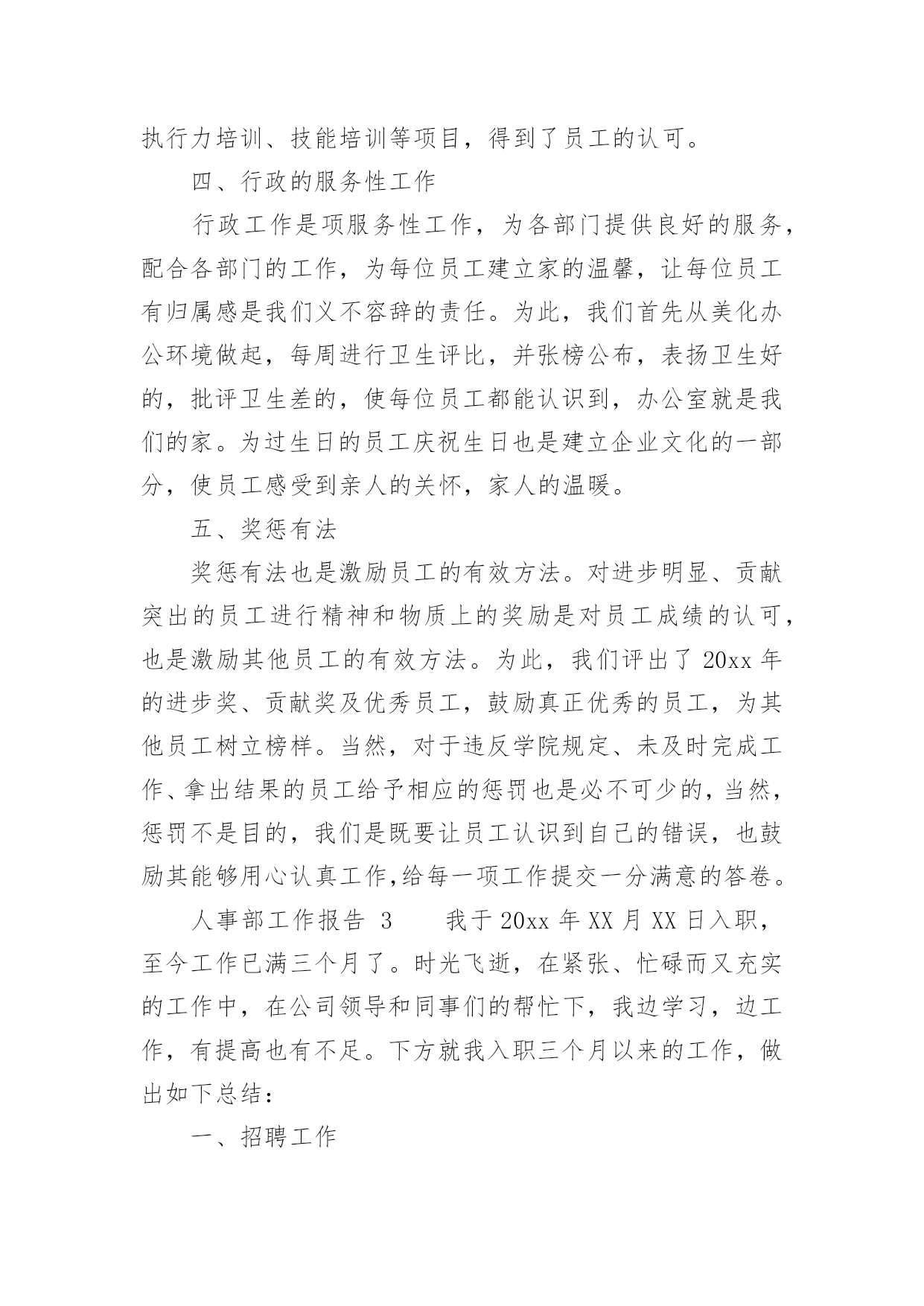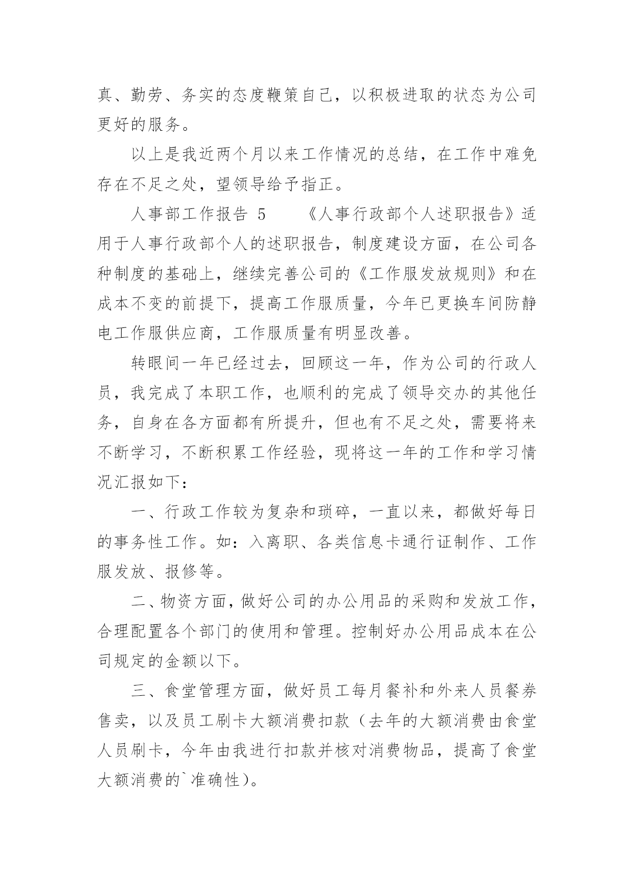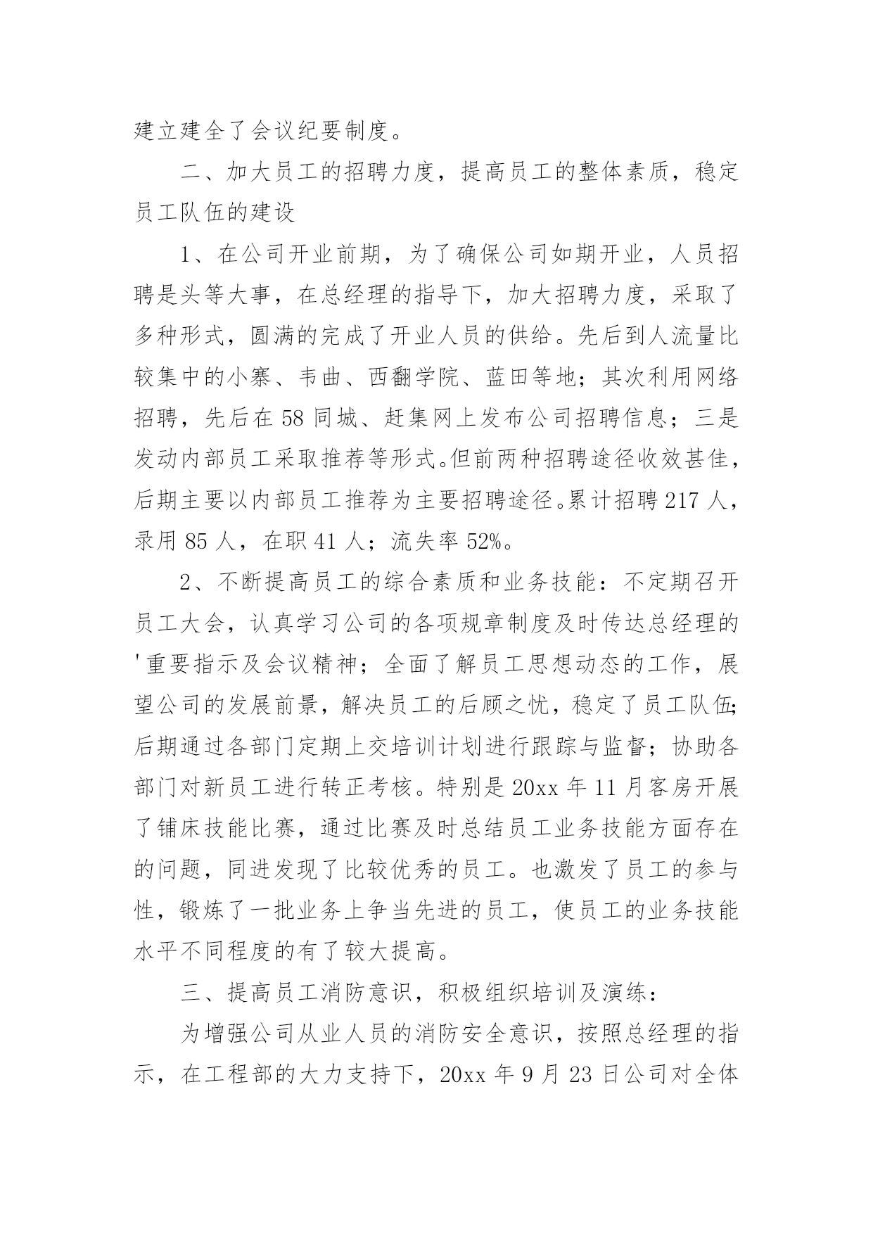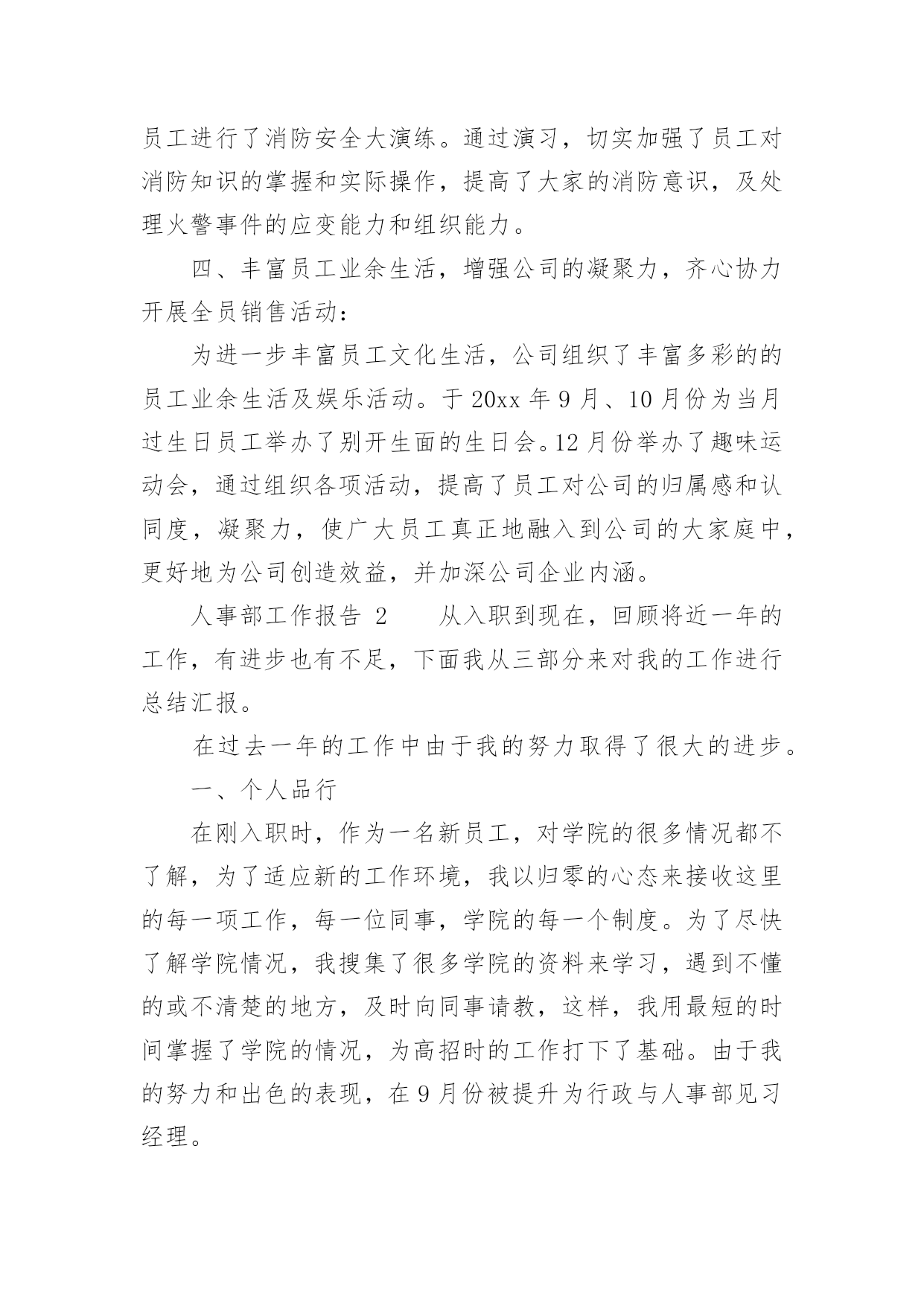 人事部工作报告人事部工作报告(通用12篇)随着个人素质的提升,报告的用途越来越大,报告具有语言陈述性的特点。那么一般报告是怎么写的呢?下面是小编为大家收集的人事部工作报告,供大家参考借鉴,希望可以帮助到有需要的朋友人事部工作报告120xx年即将过去,回顾一年來的工作,感慨万千,感谢公司领导及各部门的大力支持与配合,人事部基本完成了预期的工作,具体工作如下:一、建立健全各项规章制度,强化管理:公司坚持从基础管理抓起,加强对公司的规范管理,一是建章立制,逐步规范人事管理,为进一步完善公司人事管理,理顺管理关系,使公司人事各项工作有章可循。先后制定了:《XX工作守则》;《XX安全制度》;《XX房务部工作制度》;《XX餐饮部工作制度》;《XX中厨房工作管理制度》;《XX人事部工作制度》;《XX财务部工作制度》;《XX工程部工作制度》;《XX安全部工作制度》并上墙悬挂。开业后,结合实际工作情况,制定出台了《员工宿舍、更衣室、浴室的管理规定》、《员工餐厅用餐标准、用餐时间等管理规定》等;二是,在各部门的大力配合下由人事部牵头,草拟了《XX各部门的工作运营手册》;三是,加强内部管理,提高执行力,通过完善XX员工请销假、考勤管理规定、员工职务晋升管理规定等规章制度,有效提高了工作效率和管理水平;四是,建立建全了会议纪要制度。二、加大员工的招聘力度,提高员工的整体素质,稳定员工队伍的建设1、在公司开业前期,为了确保公司如期开业,人员招聘是头等大事,在总经理的指导下,加大招聘力度,采取了多种形式,圆满的完成了开业人员的供给。先后到人流量比较集中的小寨、韦曲、西翻学院、蓝田等地;其次利用网络招聘,先后在58同城、赶集网上发布公司招聘信息;三是发动内部员工采取推荐等形式。但前两种招聘途径收效甚佳,后期主要以内部员工推荐为主要招聘途径。累计招聘217人,录用85人,在职41人;流失率52%。2、不断提高员工的综合素质和业务技能:不定期召开员工大会,认真学习公司的各项规章制度及时传达总经理的'重要指示及会议精神;全面了解员工思想动态的工作,展望公司的发展前景,解决员工的后顾之忧,稳定了员工队伍;后期通过各部门定期上交培训计划进行跟踪与监督;协助各部门对新员工进行转正考核。特别是20xx年11月客房开展了铺床技能比赛,通过比赛及时总结员工业务技能方面存在的问题,同进发现了比较优秀的员工。也激发了员工的参与性,锻炼了一批业务上争当先进的员工,使员工的业务技能水平不同程度的有了较大提高。三、提高员工消防意识,积极组织培训及演练:为增强公司从业人员的消防安全意识,按照总经理的指示,在工程部的大力支持下,20xx年9月23日公司对全体员工进行了消防安全大演练。通过演习,切实加强了员工对消防知识的掌握和实际操作,提高了大家的消防意识,及处理火警事件的应变能力和组织能力。四、丰富员工业余生活,增强公司的凝聚力,齐心协力开展全员销售活动:为进一步丰富员工文化生活,公司组织了丰富多彩的的员工业余生活及娱乐活动。于20xx年9月、10月份为当月过生日员工举办了别开生面的生日会。12月份举办了趣味运动会,通过组织各项活动,提高了员工对公司的归属感和认同度,凝聚力,使广大员工真正地融入到公司的大家庭中,更好地为公司创造效益,并加深公司企业内涵。人事部工作报告2从入职到现在,回顾将近一年的工作,有进步也有不足,下面我从三部分来对我的工作进行总结汇报。在过去一年的工作中由于我的努力取得了很大的进步。一、个人品行在刚入职时,作为一名新员工,对学院的很多情况都不了解,为了适应新的工作环境,我以归零的心态来接收这里的每一项工作,每一位同事,学院的每一个制度。为了尽快了解学院情况,我搜集了很多学院的资料来学习,遇到不懂的或不清楚的地方,及时向同事请教,这样,我用最短的时间掌握了学院的情况,为高招时的工作打下了基础。由于我的努力和出色的表现,在9月份被提升为行政与人事部见习经理。在任行政与人事部经理期间,我兢兢业业,坚持原则,做好每一项工作。为人正直,原则性强,这也是从事人力资源工作必须具备的职业素养,行政人事部本身就是调节企业和员工利益的平衡杠杆,为人正直,正是确保了处理事务的公平、公正。例如:在做员工考勤考核时坚持考核制度,不因任何人的个人原因而放宽条件;在组织召开会议,参加培训等方面严格遵守学院制度,以此作为标杆,在员工行为不符合制度要求时,严格执行制度所规定的行为,对其违规行为进行处罚。二、管理思维我欣赏王石在“全球通”宣传里的'一句话:“每个人,都是一座山,世界上最难攀越的山其实是自已。努力向上,即便前进一小步也有新高度”。按我的理解,高度不同,视野就不同,思考问题的角度也不同,那么就要求自己站在领导的位置、学院的角度上去思考问题,掌握全局观念,只有这样,我们提供的方案和建议才