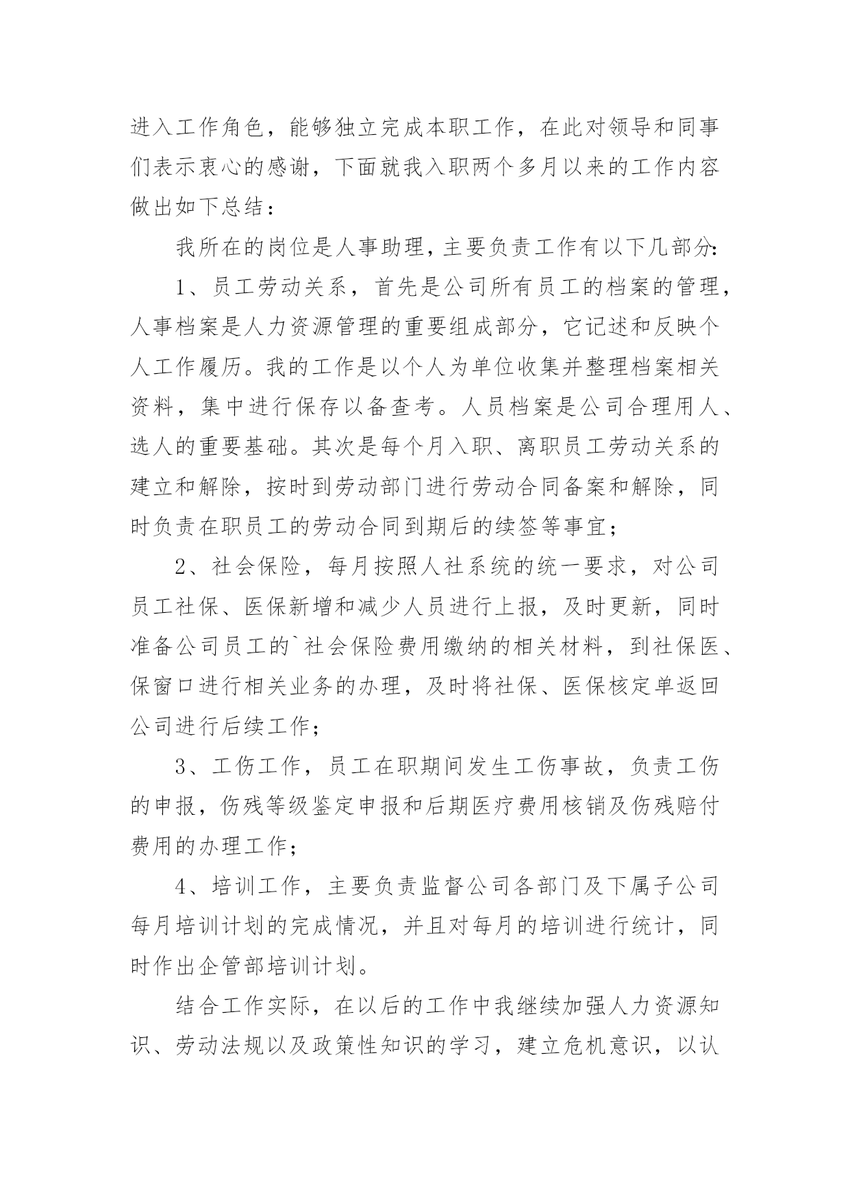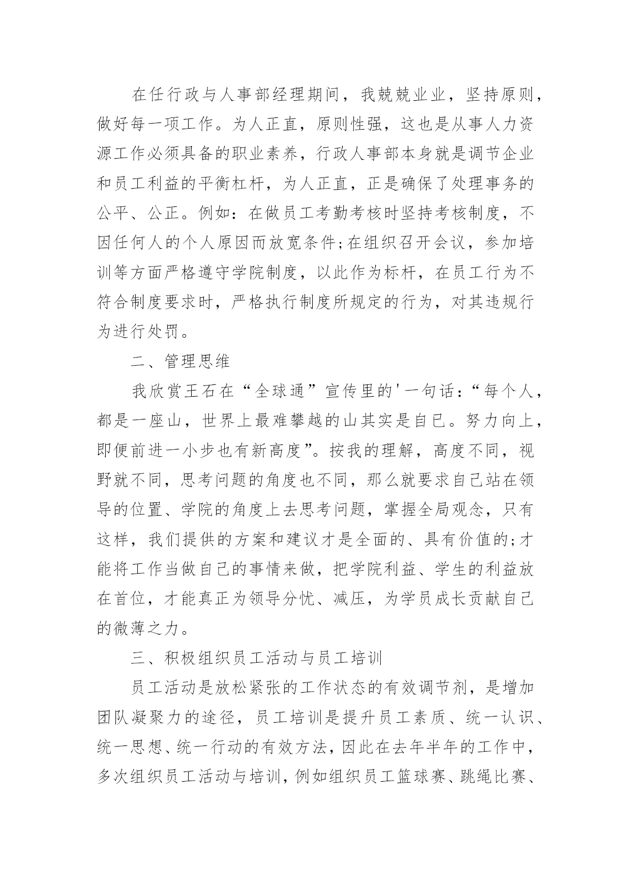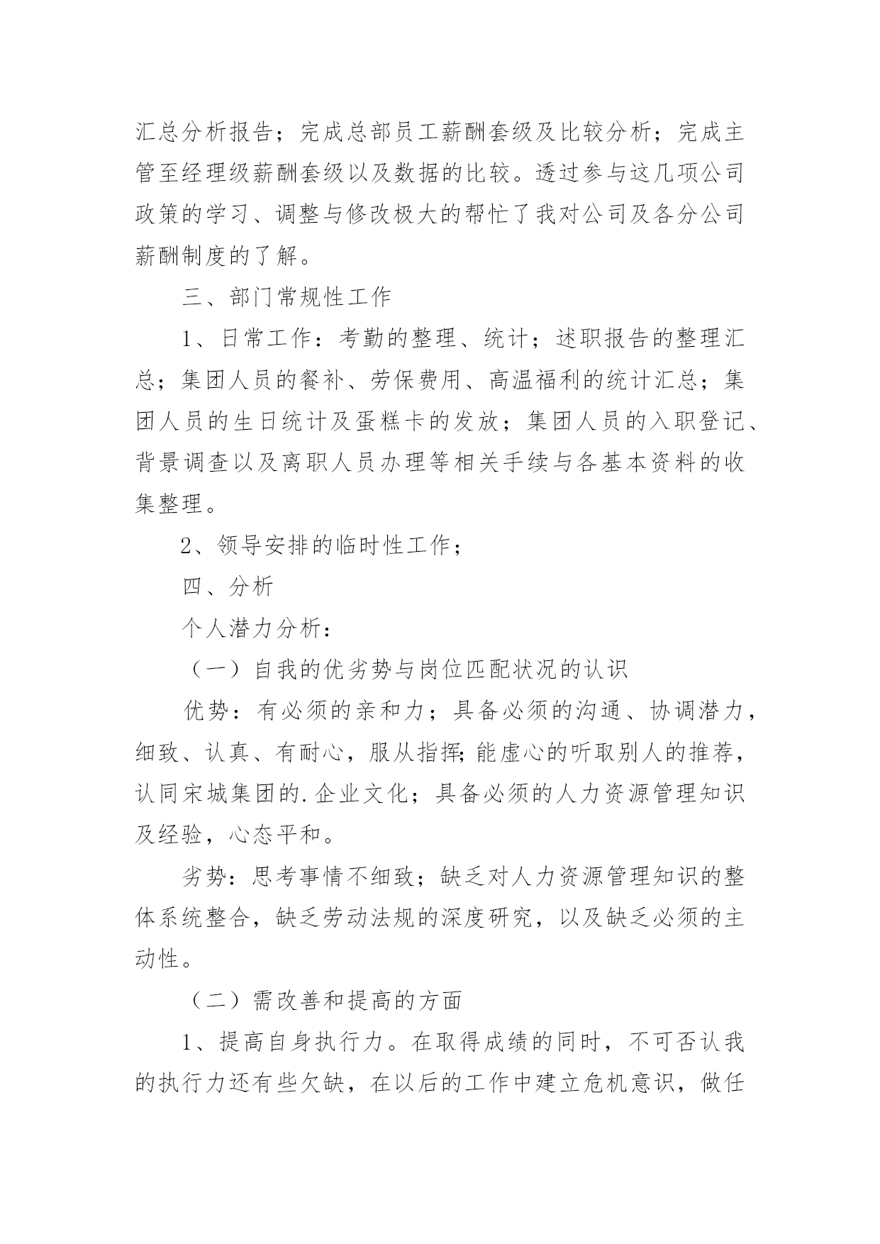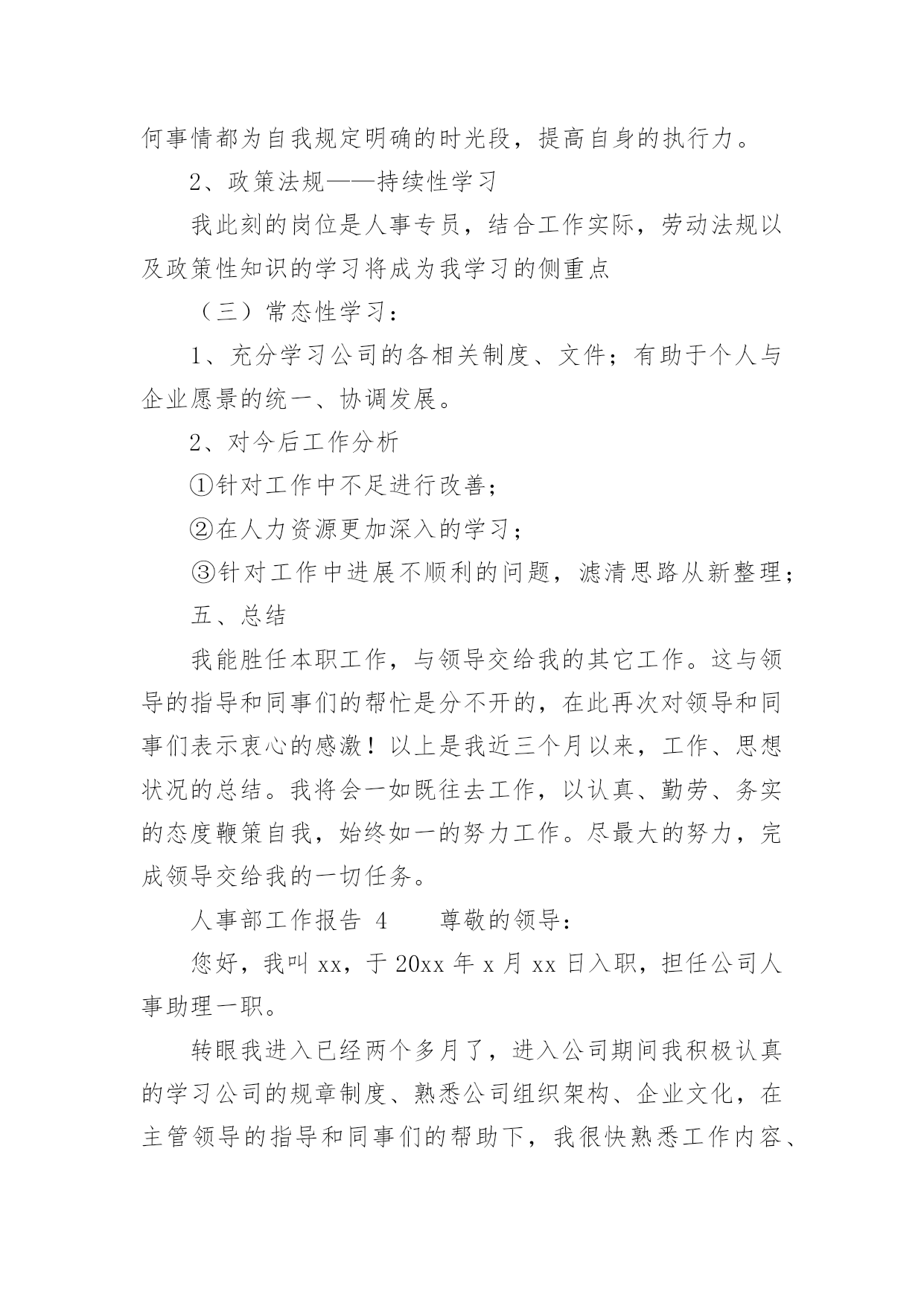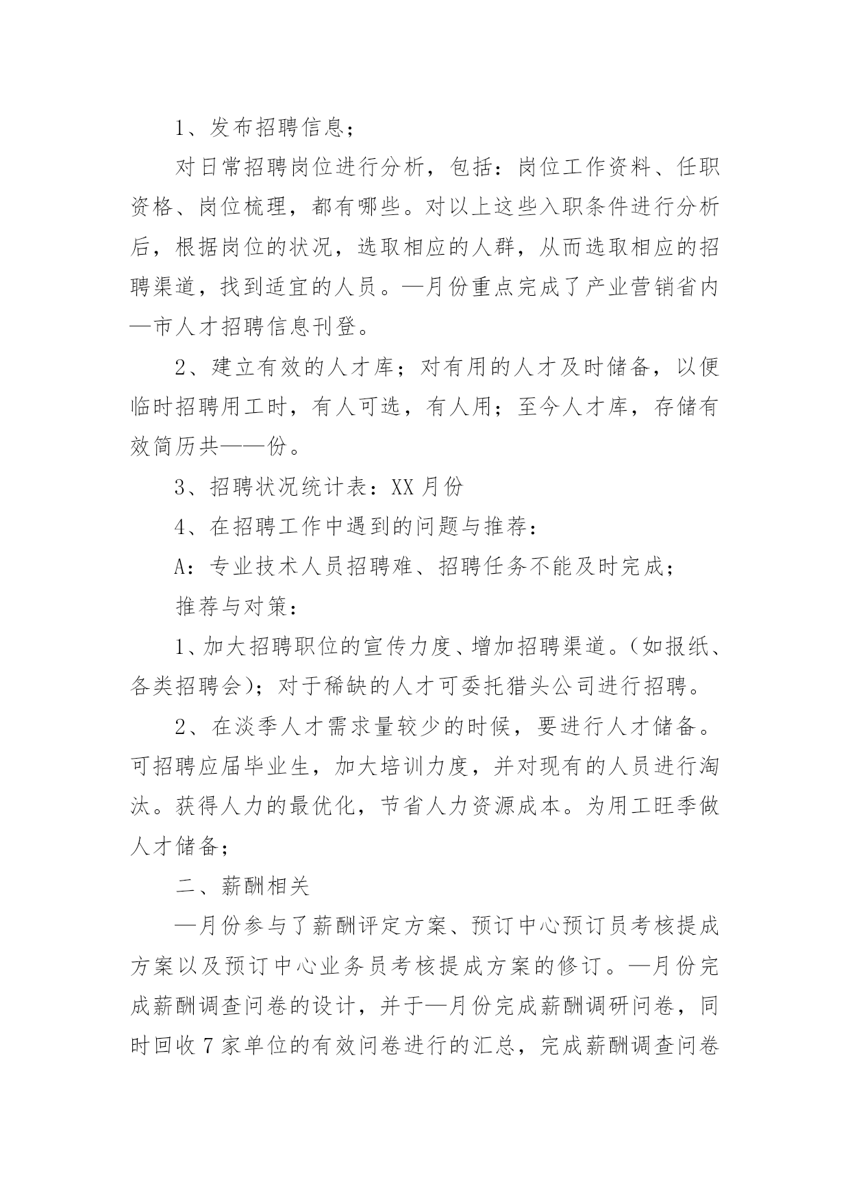 人事部工作报告人事部工作报告(通用12篇)随着个人素质的提升,报告的用途越来越大,报告具有语言陈述性的特点。那么一般报告是怎么写的呢?下面是小编为大家收集的人事部工作报告,供大家参考借鉴,希望可以帮助到有需要的朋友人事部工作报告120xx年即将过去,回顾一年來的工作,感慨万千,感谢公司领导及各部门的大力支持与配合,人事部基本完成了预期的工作,具体工作如下:一、建立健全各项规章制度,强化管理:公司坚持从基础管理抓起,加强对公司的规范管理,一是建章立制,逐步规范人事管理,为进一步完善公司人事管理,理顺管理关系,使公司人事各项工作有章可循。先后制定了:《XX工作守则》;《XX安全制度》;《XX房务部工作制度》;《XX餐饮部工作制度》;《XX中厨房工作管理制度》;《XX人事部工作制度》;《XX财务部工作制度》;《XX工程部工作制度》;《XX安全部工作制度》并上墙悬挂。开业后,结合实际工作情况,制定出台了《员工宿舍、更衣室、浴室的管理规定》、《员工餐厅用餐标准、用餐时间等管理规定》等;二是,在各部门的大力配合下由人事部牵头,草拟了《XX各部门的工作运营手册》;三是,加强内部管理,提高执行力,通过完善XX员工请销假、考勤管理规定、员工职务晋升管理规定等规章制度,有效提高了工作效率和管理水平;四是,建立建全了会议纪要制度。二、加大员工的招聘力度,提高员工的整体素质,稳定员工队伍的建设1、在公司开业前期,为了确保公司如期开业,人员招聘是头等大事,在总经理的指导下,加大招聘力度,采取了多种形式,圆满的完成了开业人员的供给。先后到人流量比较集中的小寨、韦曲、西翻学院、蓝田等地;其次利用网络招聘,先后在58同城、赶集网上发布公司招聘信息;三是发动内部员工采取推荐等形式。但前两种招聘途径收效甚佳,后期主要以内部员工推荐为主要招聘途径。累计招聘217人,录用85人,在职41人;流失率52%。2、不断提高员工的综合素质和业务技能:不定期召开员工大会,认真学习公司的各项规章制度及时传达总经理的'重要指示及会议精神;全面了解员工思想动态的工作,展望公司的发展前景,解决员工的后顾之忧,稳定了员工队伍;后期通过各部门定期上交培训计划进行跟踪与监督;协助各部门对新员工进行转正考核。特别是20xx年11月客房开展了铺床技能比赛,通过比赛及时总结员工业务技能方面存在的问题,同进发现了比较优秀的员工。也激发了员工的参与性,锻炼了一批业务上争当先进的员工,使员工的业务技能水平不同程度的有了较大提高。三、提高员工消防意识,积极组织培训及演练:为增强公司从业人员的消防安全意识,按照总经理的指示,在工程部的大力支持下,20xx年9月23日公司对全体员工进行了消防安全大演练。通过演习,切实加强了员工对消防知识的掌握和实际操作,提高了大家的消防意识,及处理火警事件的应变能力和组织能力。四、丰富员工业余生活,增强公司的凝聚力,齐心协力开展全员销售活动:为进一步丰富员工文化生活,公司组织了丰富多彩的的员工业余生活及娱乐活动。于20xx年9月、10月份为当月过生日员工举办了别开生面的生日会。12月份举办了趣味运动会,通过组织各项活动,提高了员工对公司的归属感和认同度,凝聚力,使广大员工真正地融入到公司的大家庭中,更好地为公司创造效益,并加深公司企业内涵。人事部工作报告2从入职到现在,回顾将近一年的工作,有进步也有不足,下面我从三部分来对我的工作进行总结汇报。在过去一年的工作中由于我的努力取得了很大的进步。一、个人品行在刚入职时,作为一名新员工,对学院的很多情况都不了解,为了适应新的工作环境,我以归零的心态来接收这里的每一项工作,每一位同事,学院的每一个制度。为了尽快了解学院情况,我搜集了很多学院的资料来学习,遇到不懂的或不清楚的地方,及时向同事请教,这样,我用最短的时间掌握了学院的情况,为高招时的工作打下了基础。由于我的努力和出色的表现,在9月份被提升为行政与人事部见习经理。在任行政与人事部经理期间,我兢兢业业,坚持原则,做好每一项工作。为人正直,原则性强,这也是从事人力资源工作必须具备的职业素养,行政人事部本身就是调节企业和员工利益的平衡杠杆,为人正直,正是确保了处理事务的公平、公正。例如:在做员工考勤考核时坚持考核制度,不因任何人的个人原因而放宽条件;在组织召开会议,参加培训等方面严格遵守学院制度,以此作为标杆,在员工行为不符合制度要求时,严格执行制度所规定的行为,对其违规行为进行处罚。二、管理思维我欣赏王石在“全球通”宣传里的'一句话:“每个人,都是一座山,世界上最难攀越的山其实是自已。努力向上,即便前进一小步也有新高度”。按我的理解,高度不同,视野就不同,思考问题的角度也不同,那么就要求自己站在领导的位置、学院的角度上去思考问题,掌握全局观念,只有这样,我们提供的方案和建议才